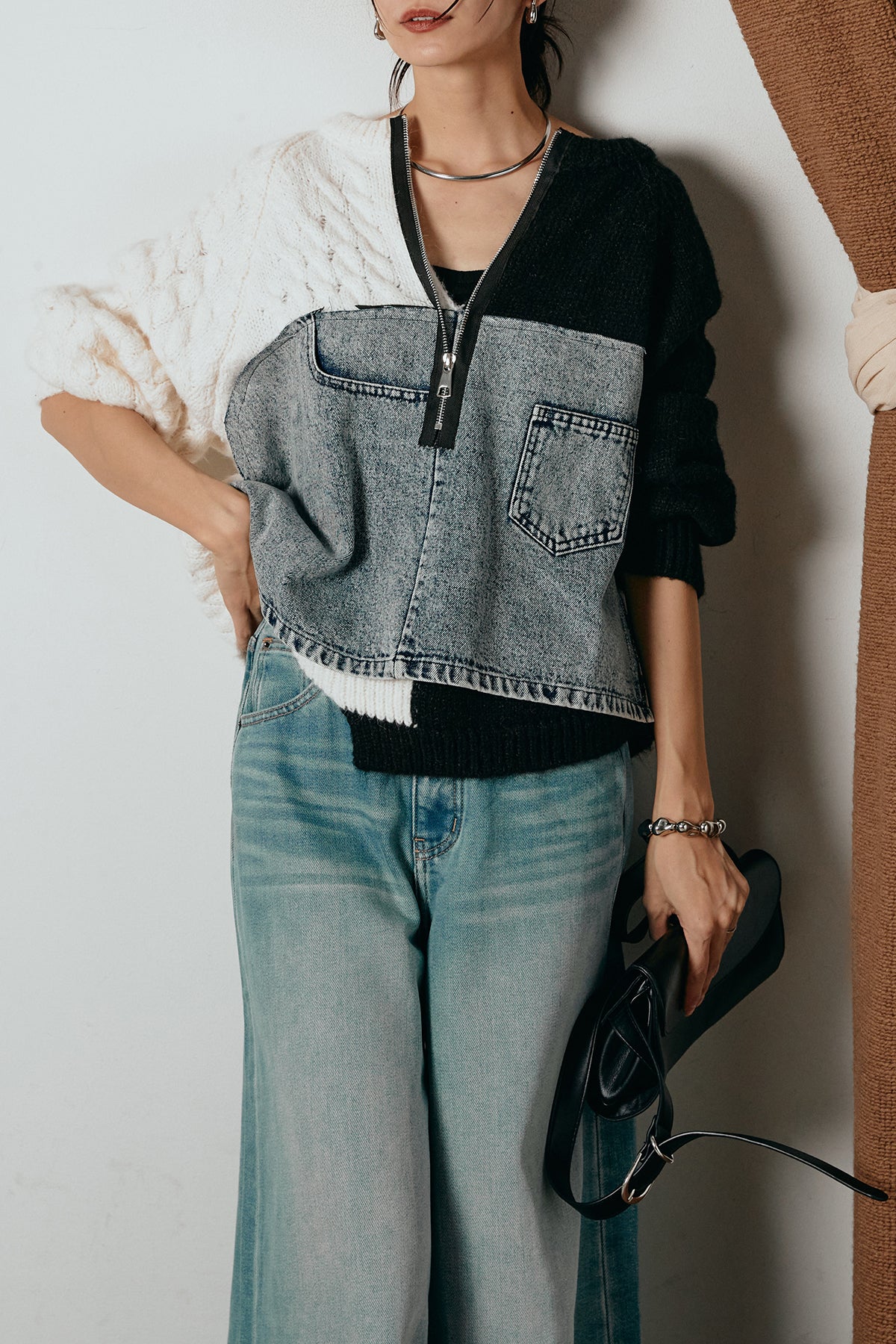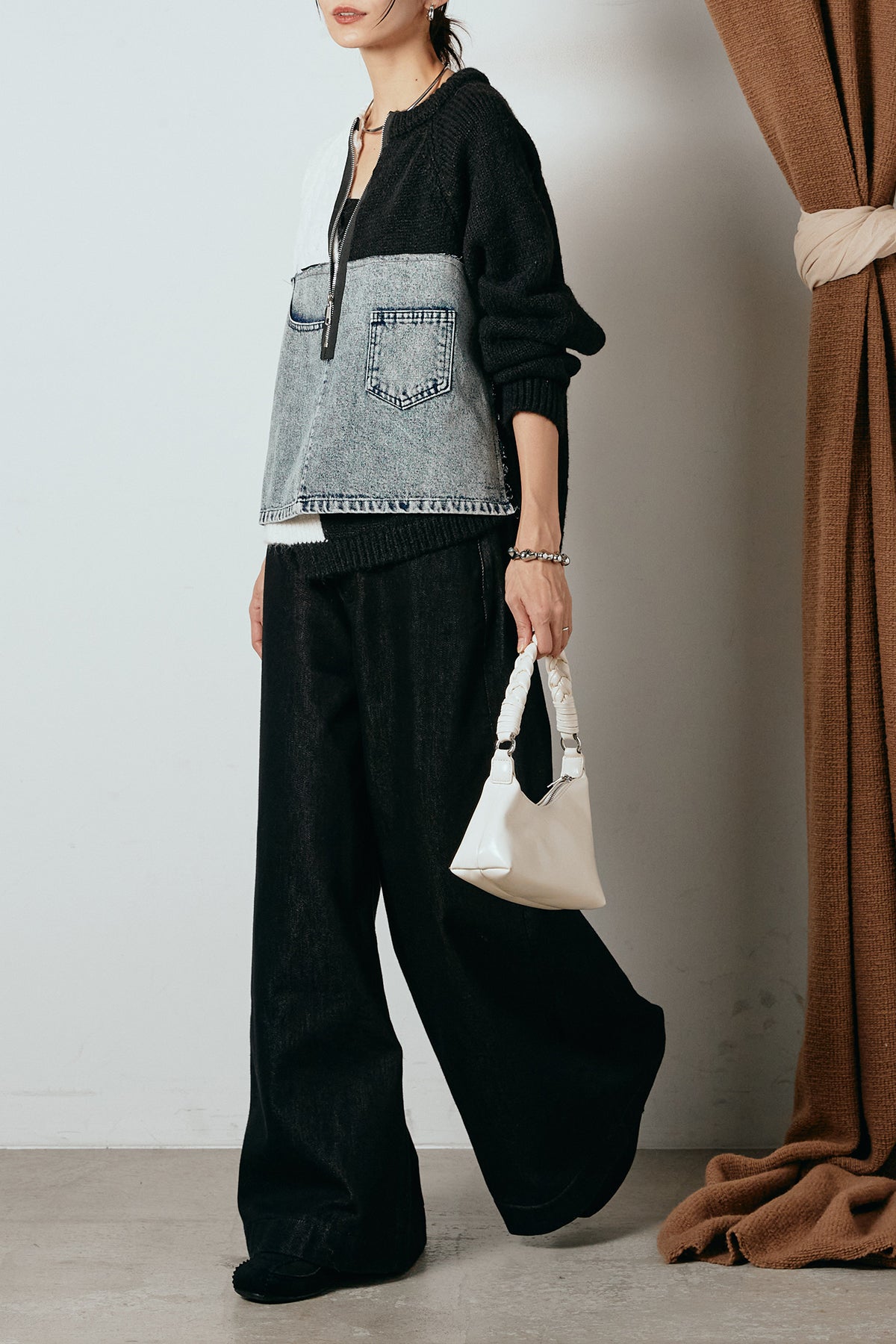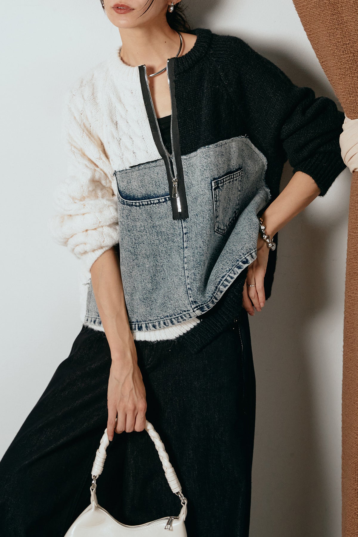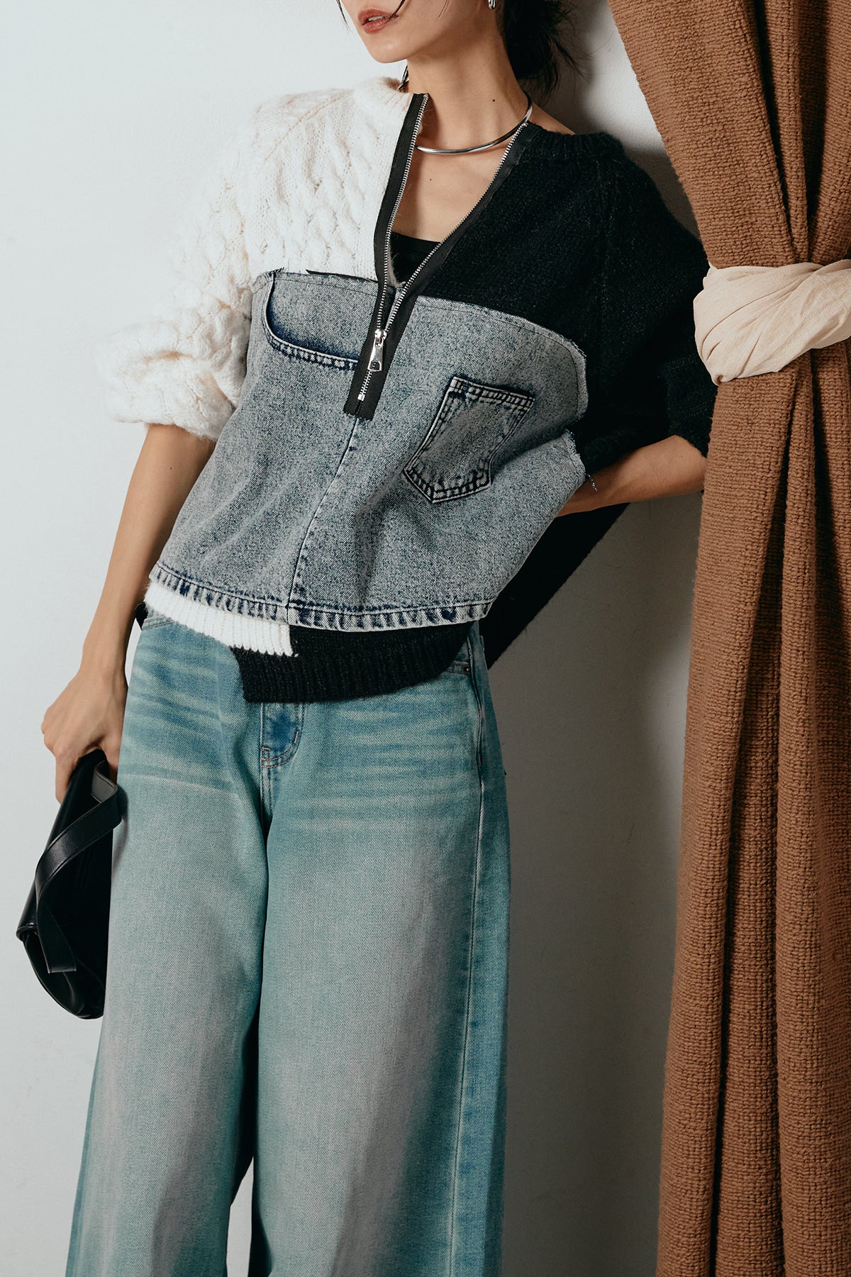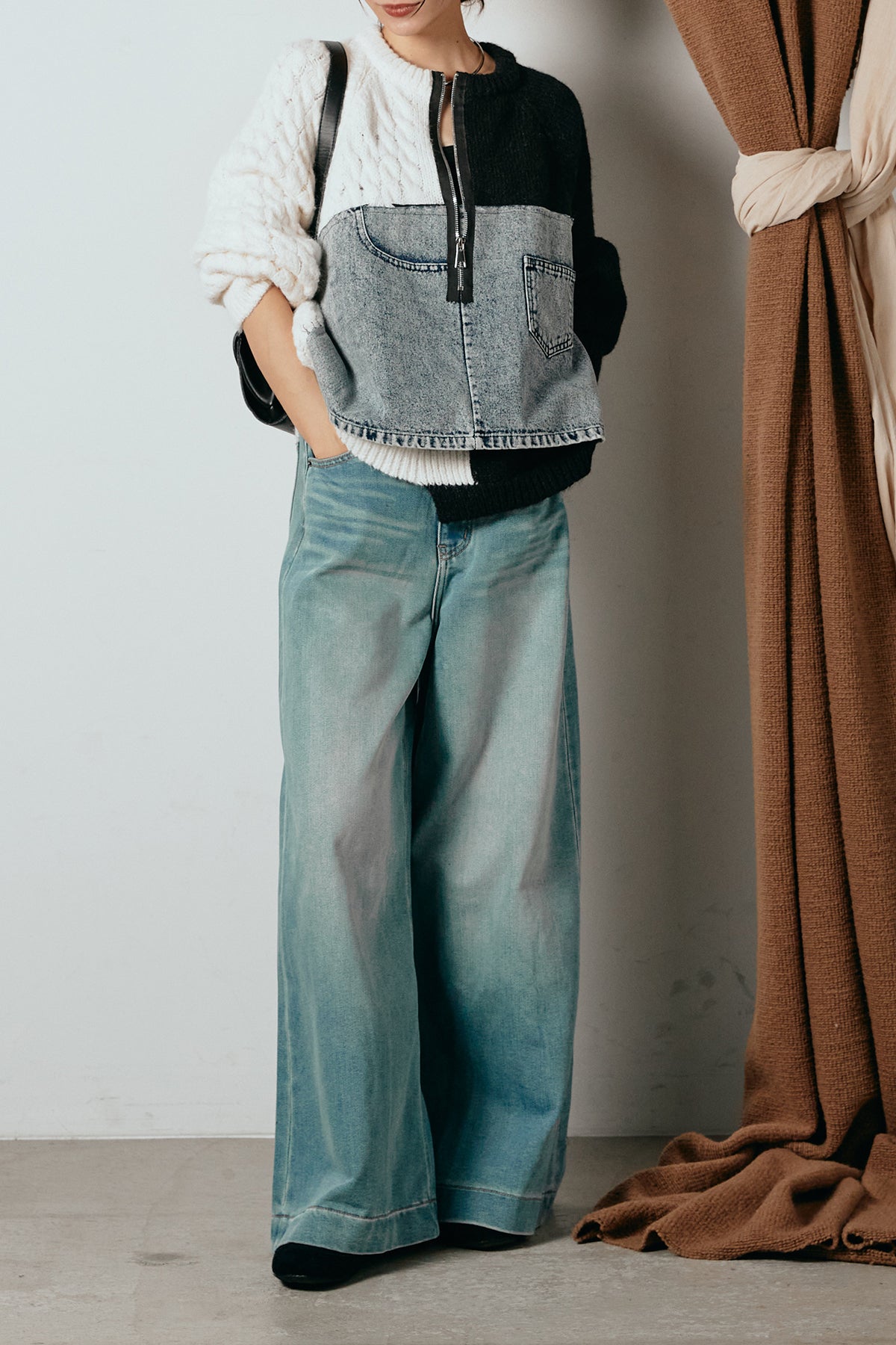 異素材を組み合わせた存在感のあるドッキングデザイン。ざっくりとしたニットにデニムパネルをミックスし、ラフさとモード感をバランスよく取り入れたトップスです。ハーフジップ仕様で抜け感の調整がしやすく、レイヤードやアクセ合わせも楽しめるデザイン。ゆるめのシルエットがこなれた印象をつくり、デニムやワイドパンツと合わせるだけで印象的なスタイリングに仕上がります。