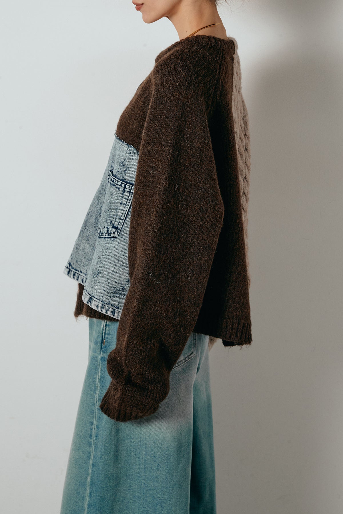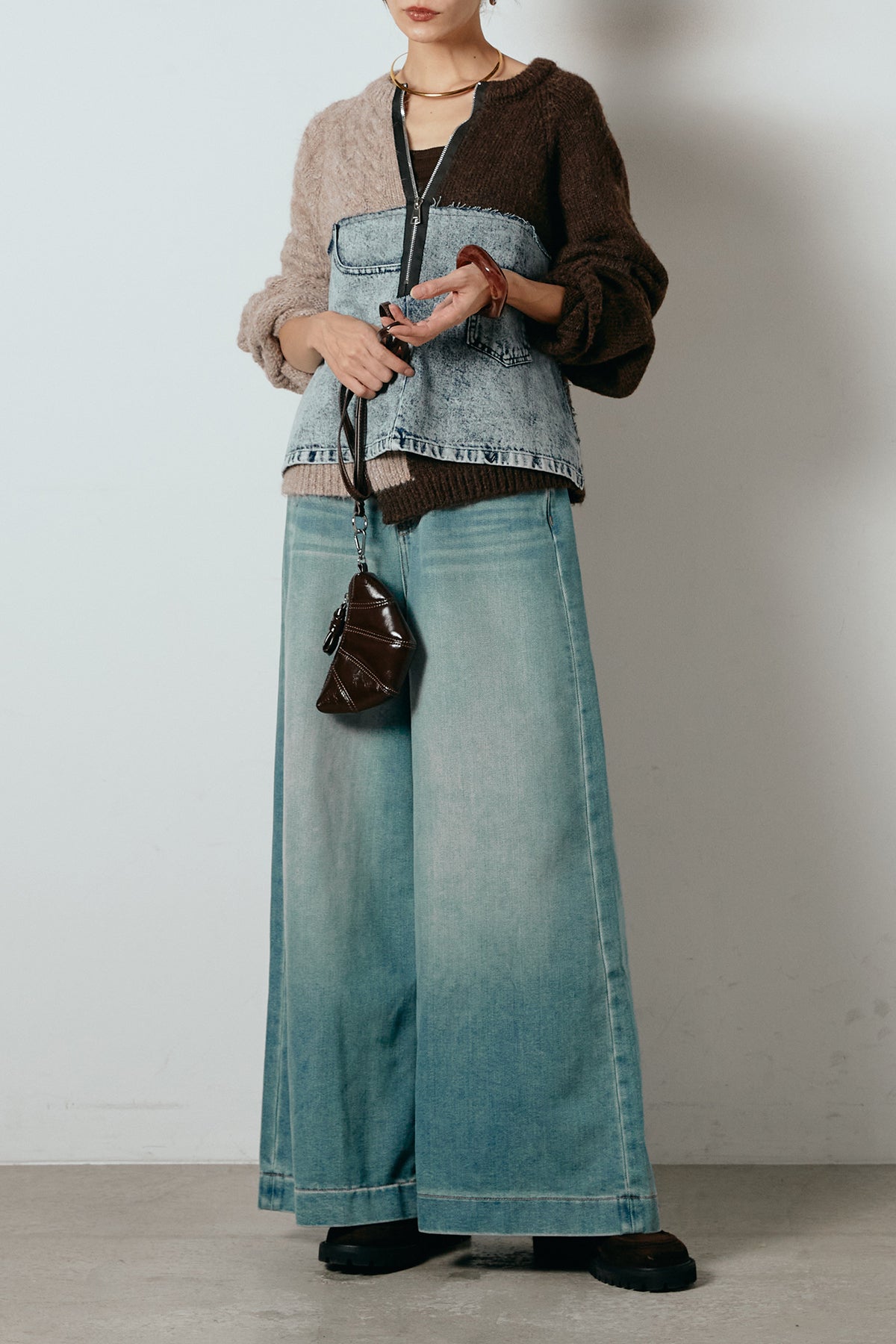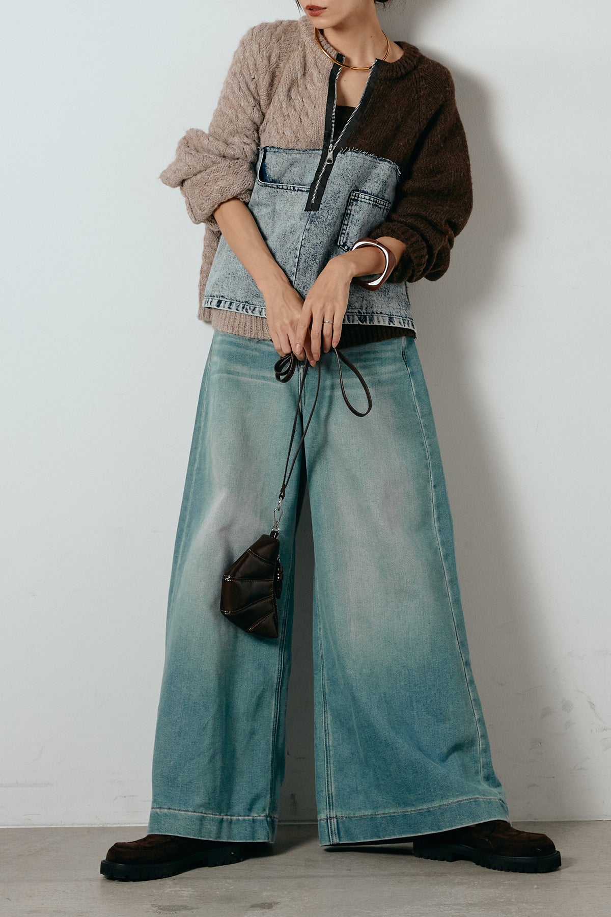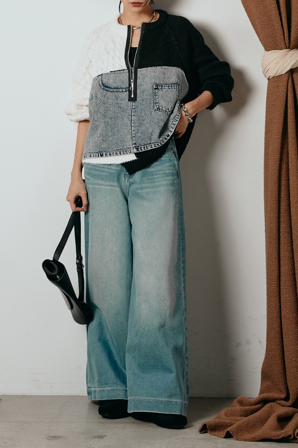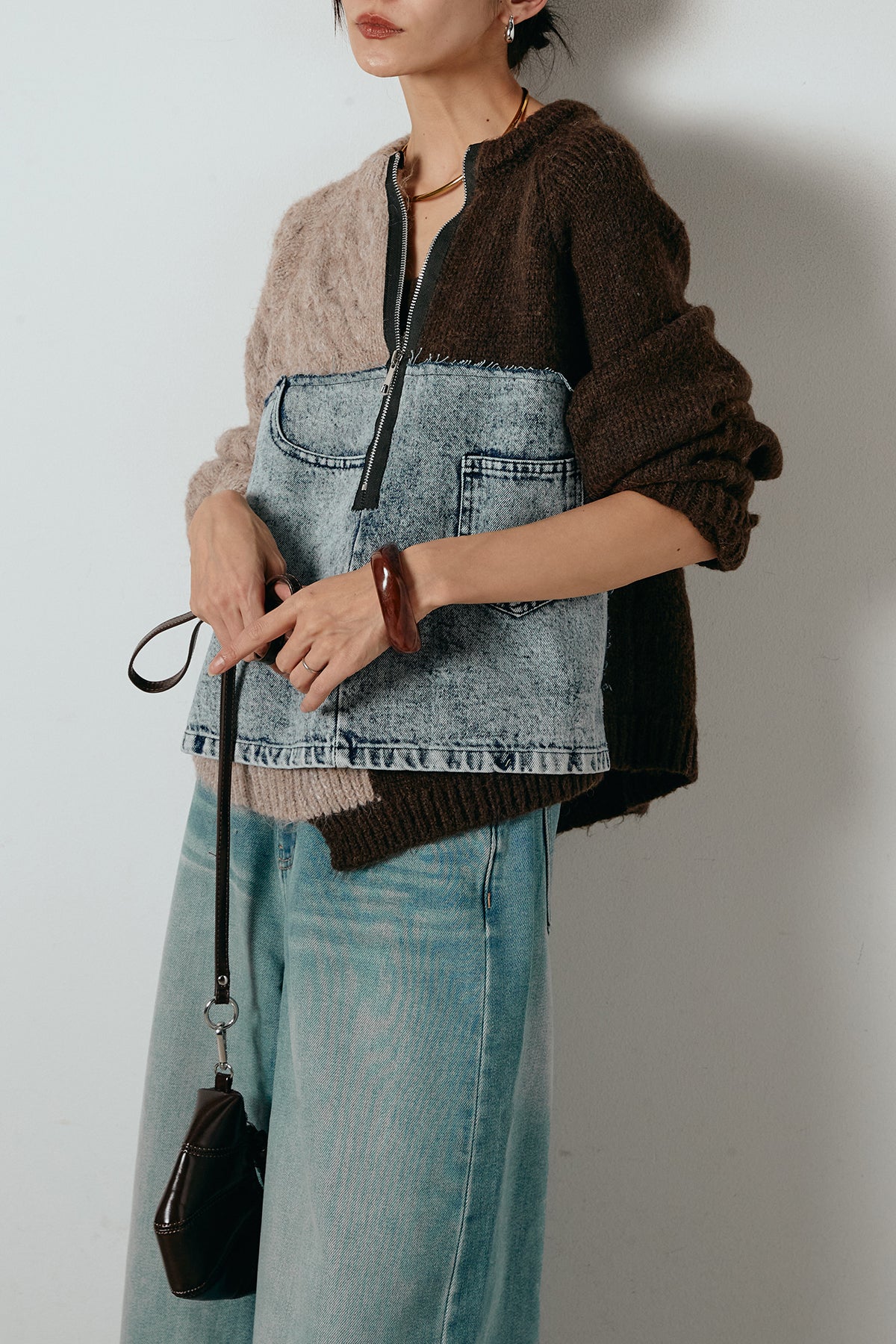 異素材を組み合わせた存在感のあるドッキングデザイン。ざっくりとしたニットにデニムパネルをミックスし、ラフさとモード感をバランスよく取り入れたトップスです。ハーフジップ仕様で抜け感の調整がしやすく、レイヤードやアクセ合わせも楽しめるデザイン。ゆるめのシルエットがこなれた印象をつくり、デニムやワイドパンツと合わせるだけで印象的なスタイリングに仕上がります。