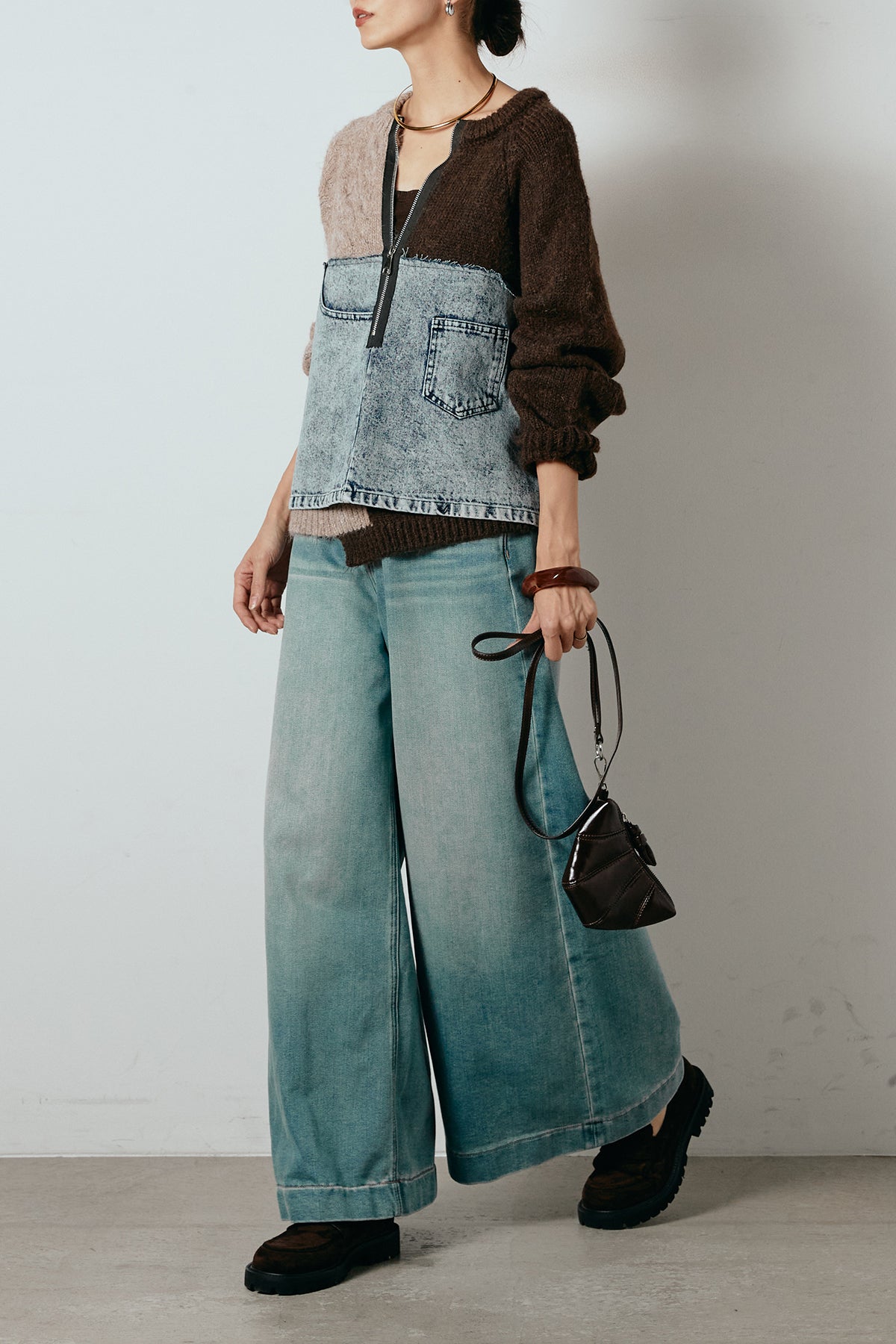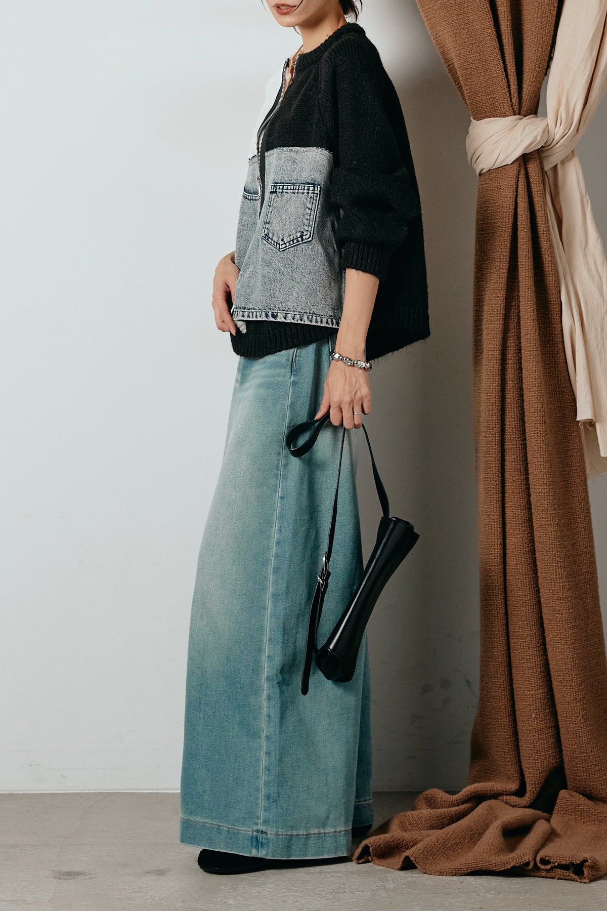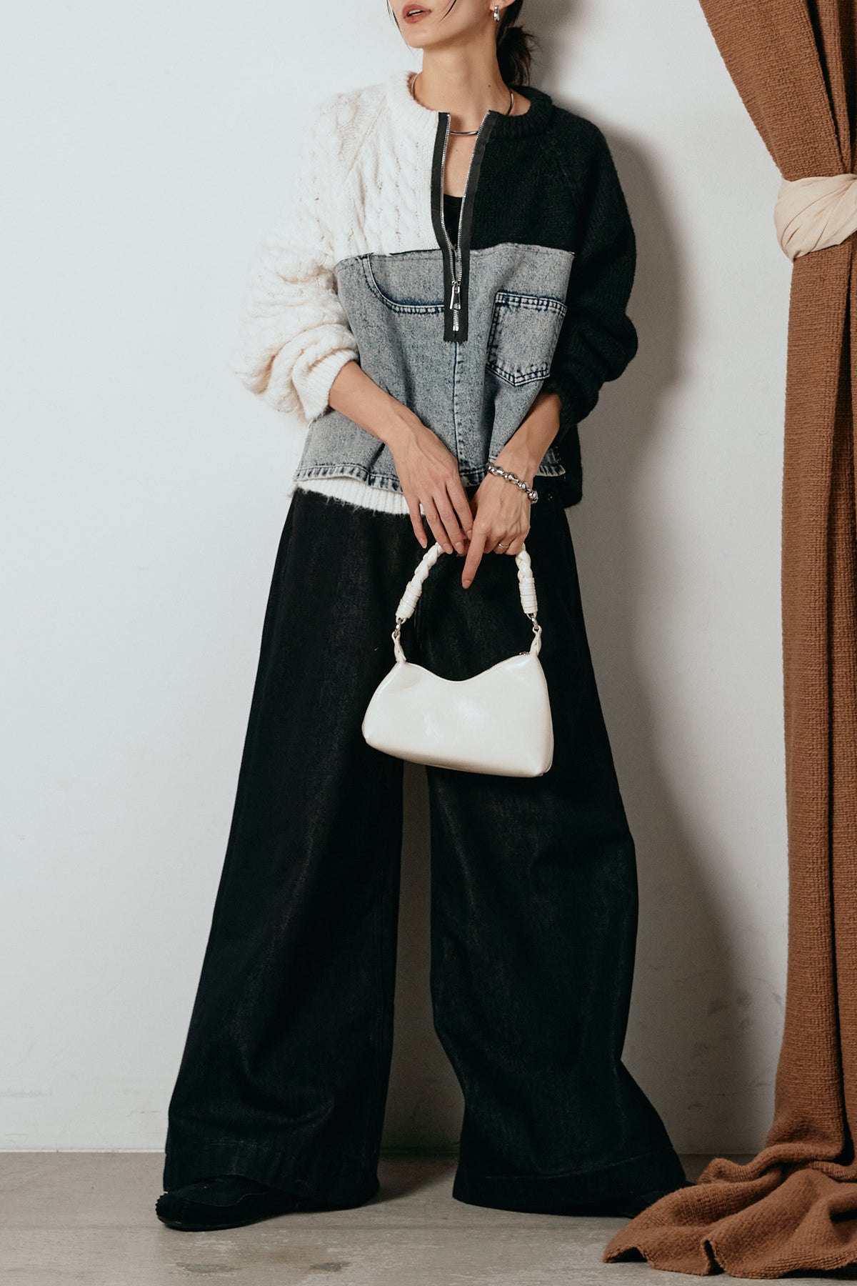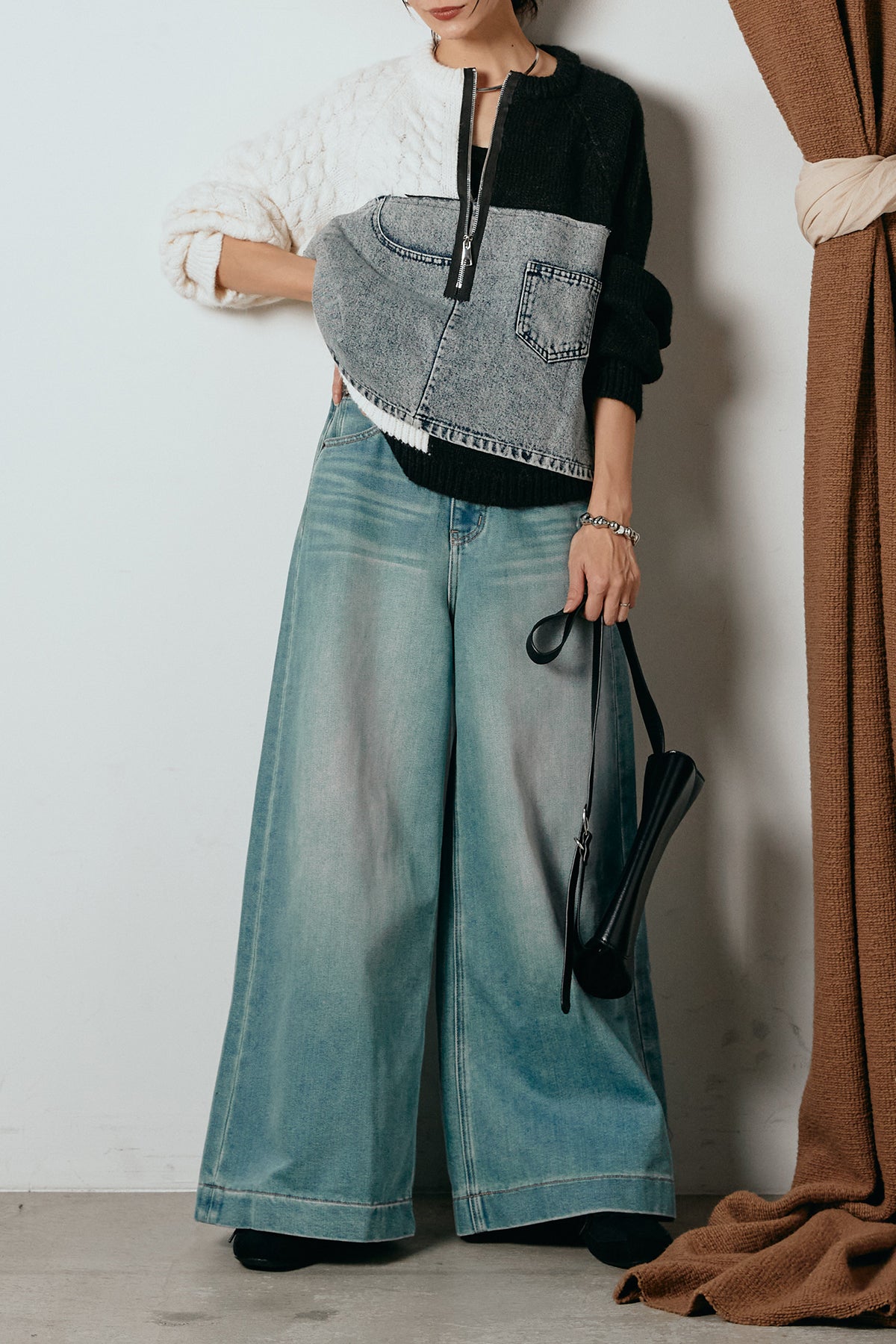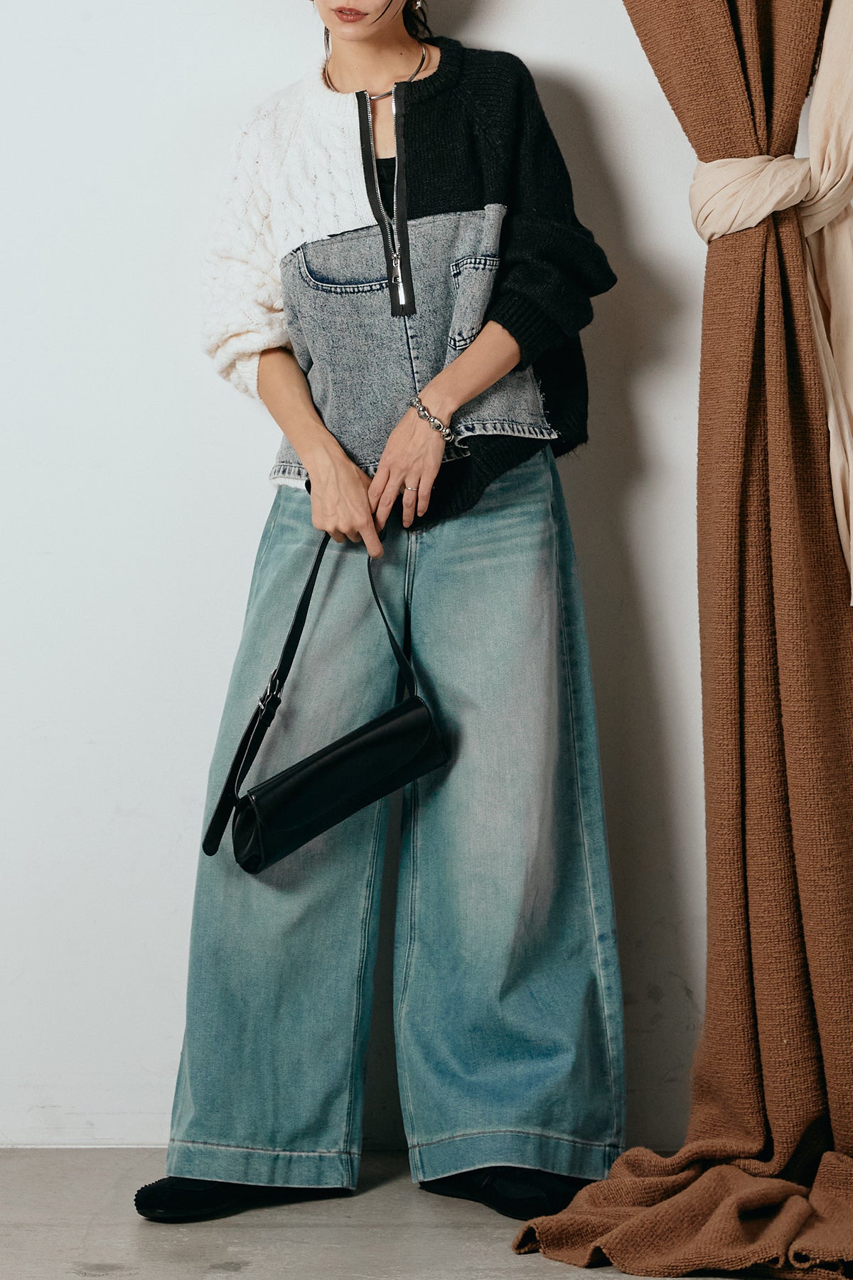 異素材を組み合わせた存在感のあるドッキングデザイン。ざっくりとしたニットにデニムパネルをミックスし、ラフさとモード感をバランスよく取り入れたトップスです。ハーフジップ仕様で抜け感の調整がしやすく、レイヤードやアクセ合わせも楽しめるデザイン。ゆるめのシルエットがこなれた印象をつくり、デニムやワイドパンツと合わせるだけで印象的なスタイリングに仕上がります。