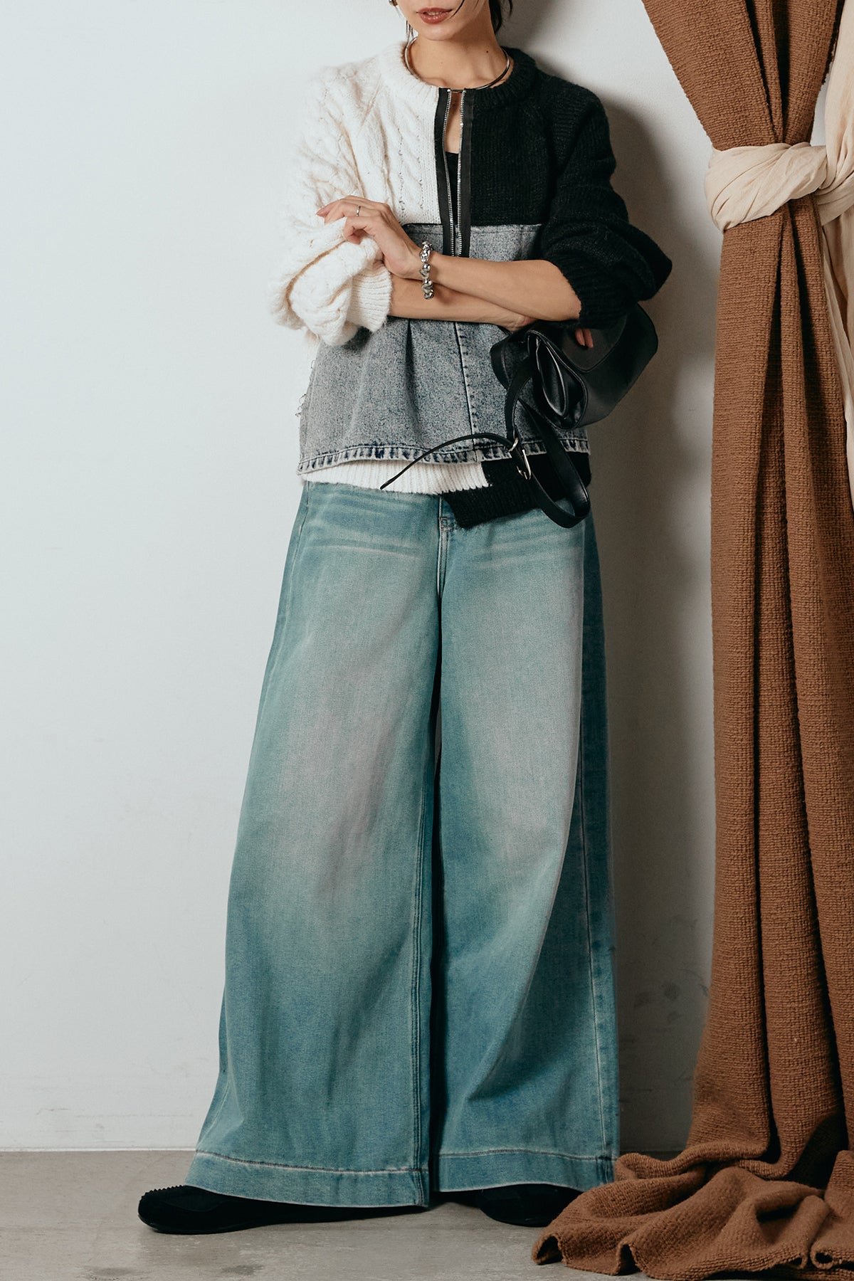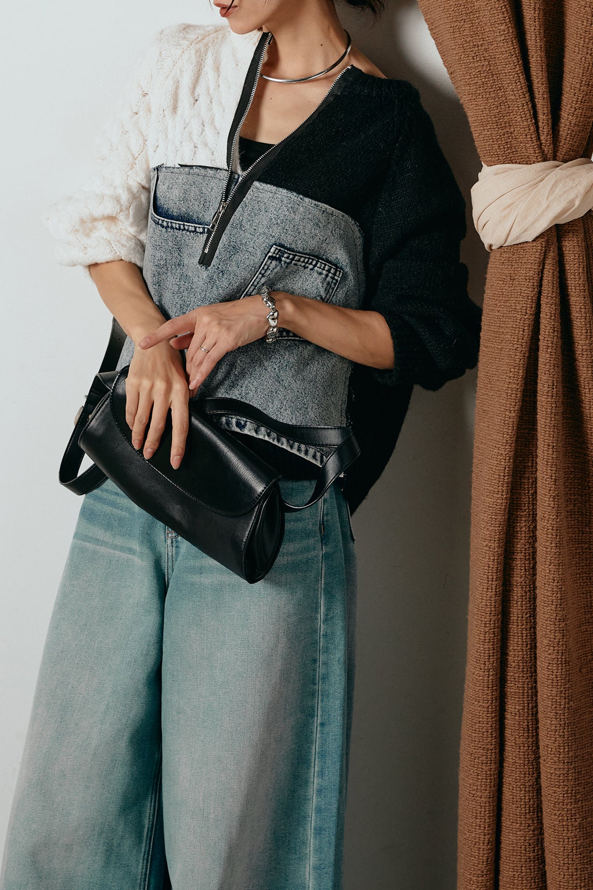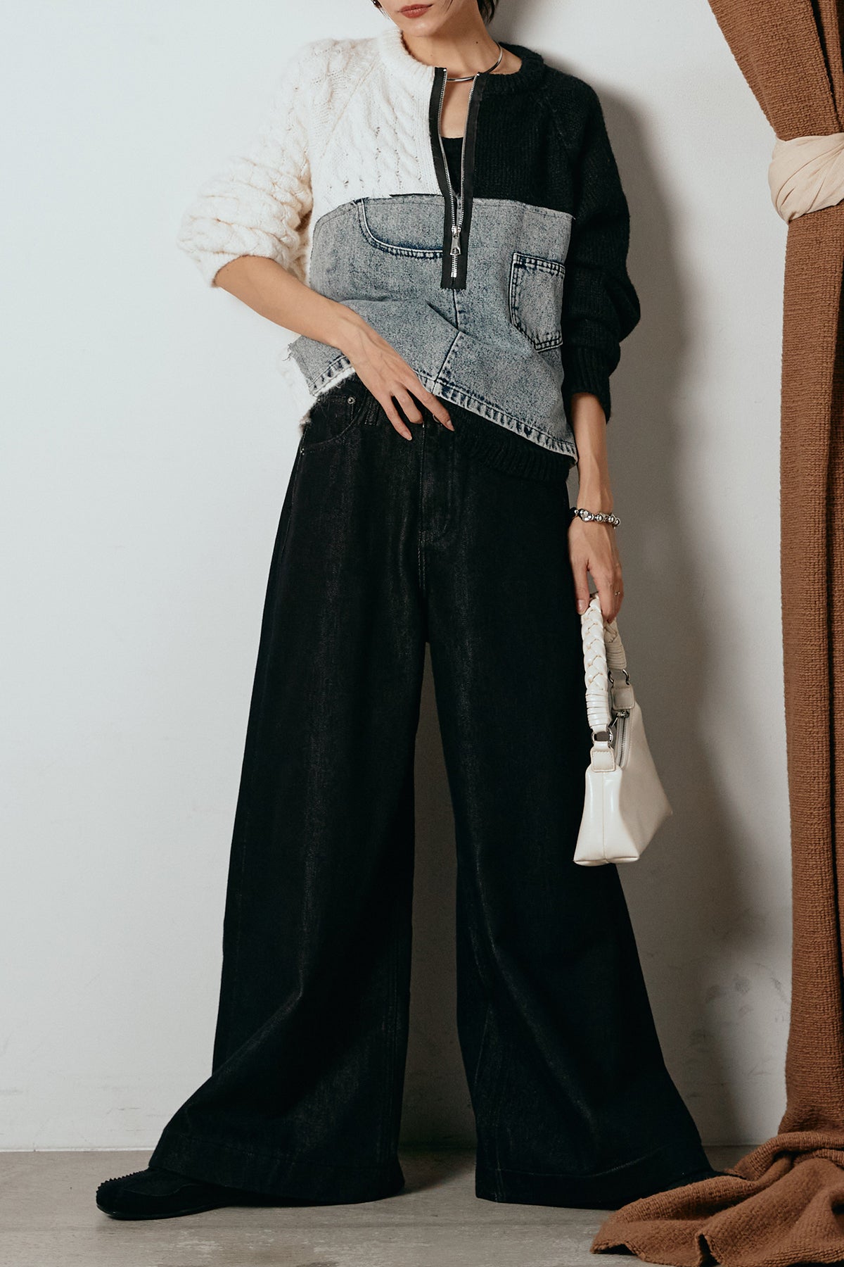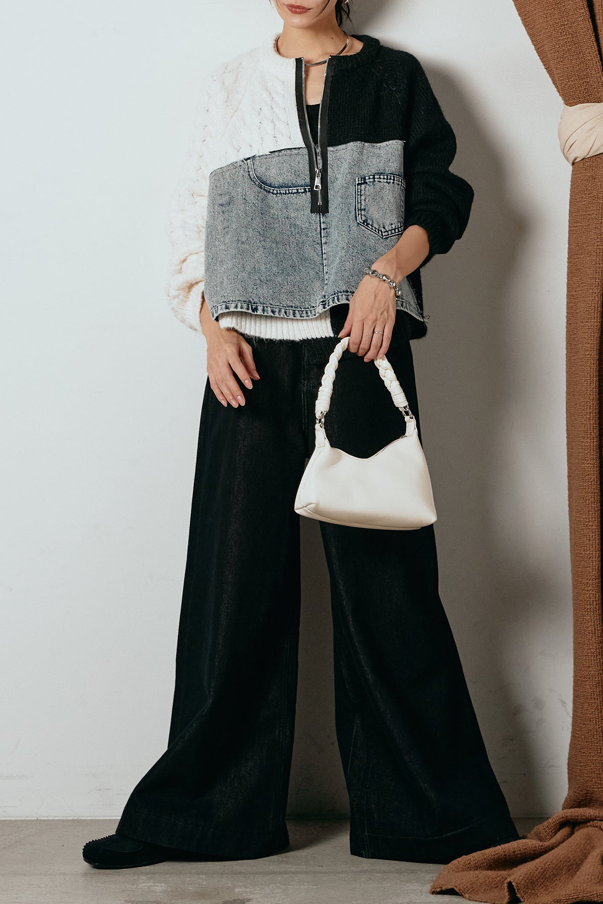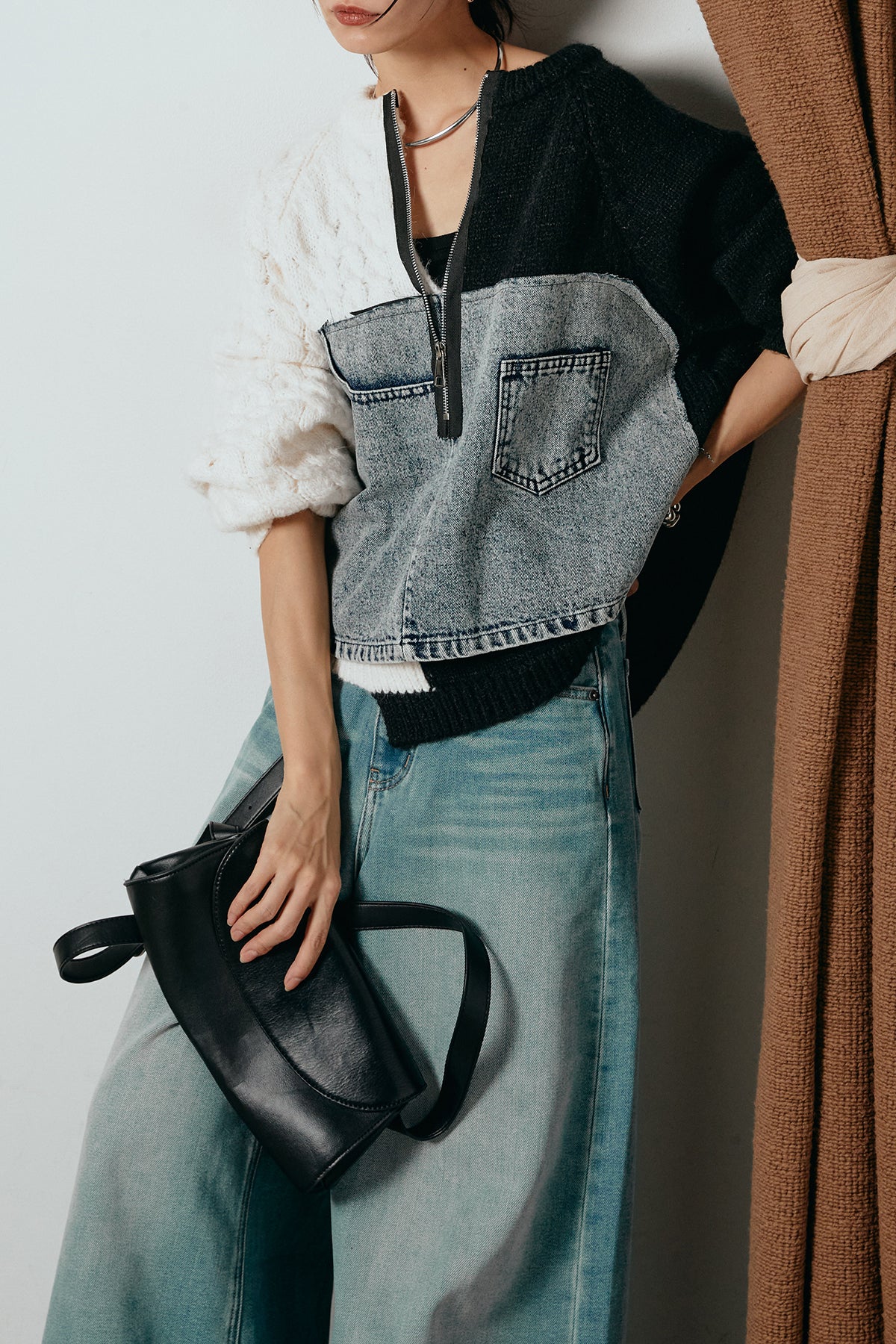 異素材を組み合わせた存在感のあるドッキングデザイン。ざっくりとしたニットにデニムパネルをミックスし、ラフさとモード感をバランスよく取り入れたトップスです。ハーフジップ仕様で抜け感の調整がしやすく、レイヤードやアクセ合わせも楽しめるデザイン。ゆるめのシルエットがこなれた印象をつくり、デニムやワイドパンツと合わせるだけで印象的なスタイリングに仕上がります。