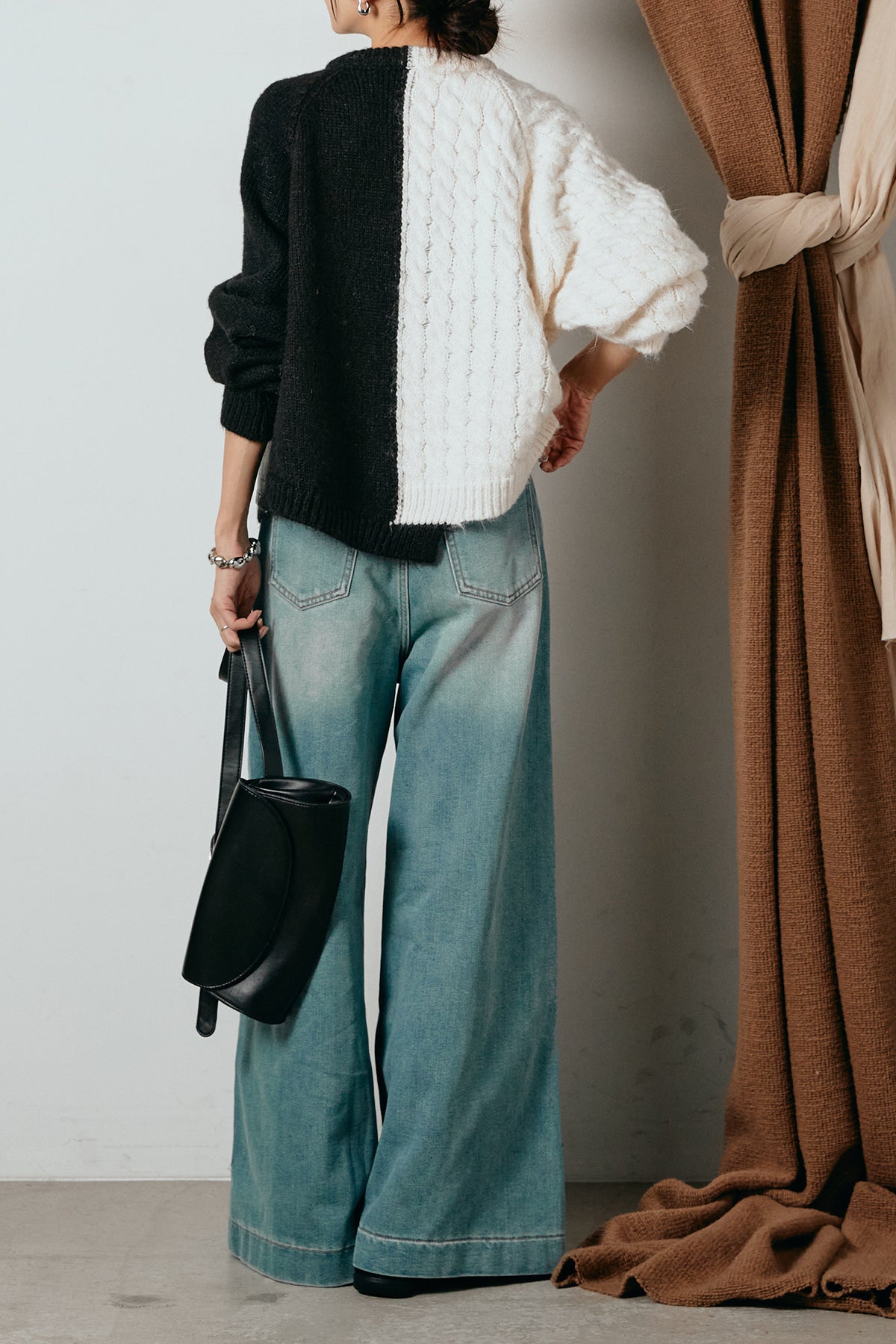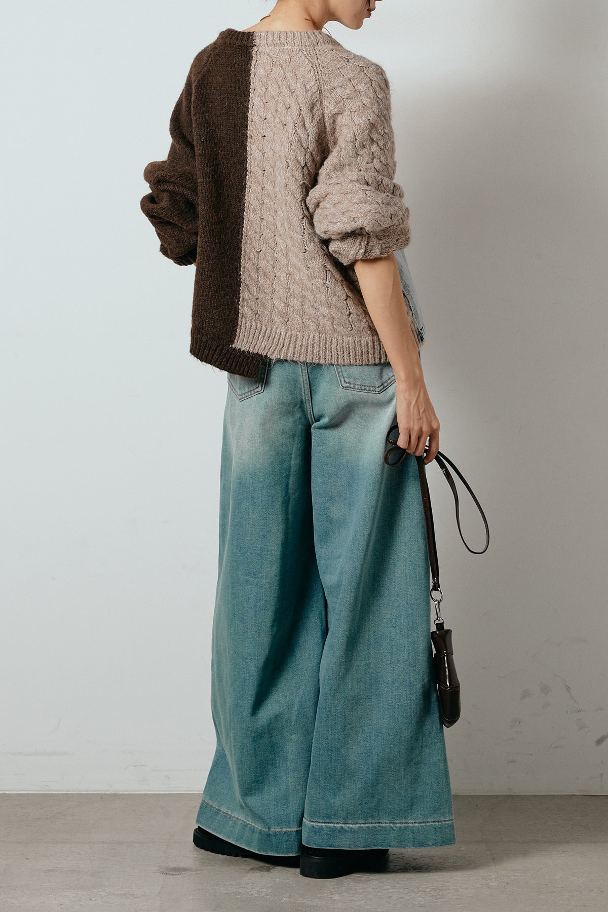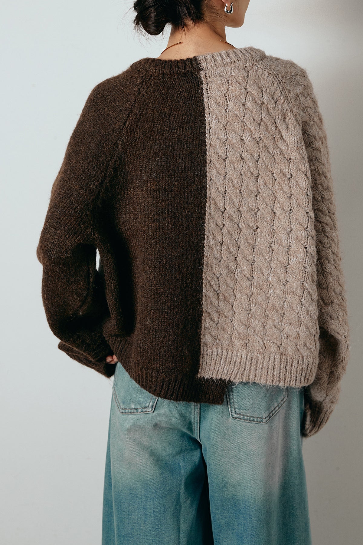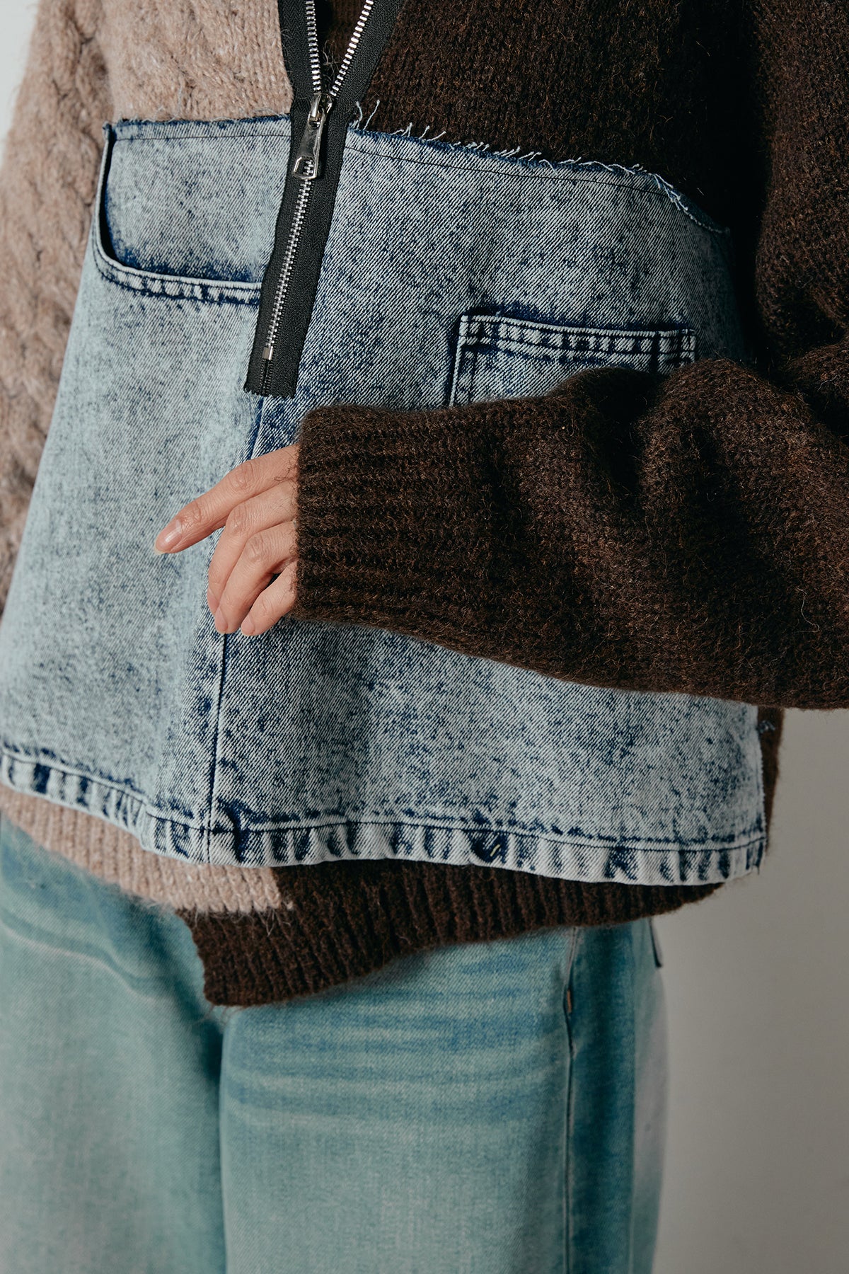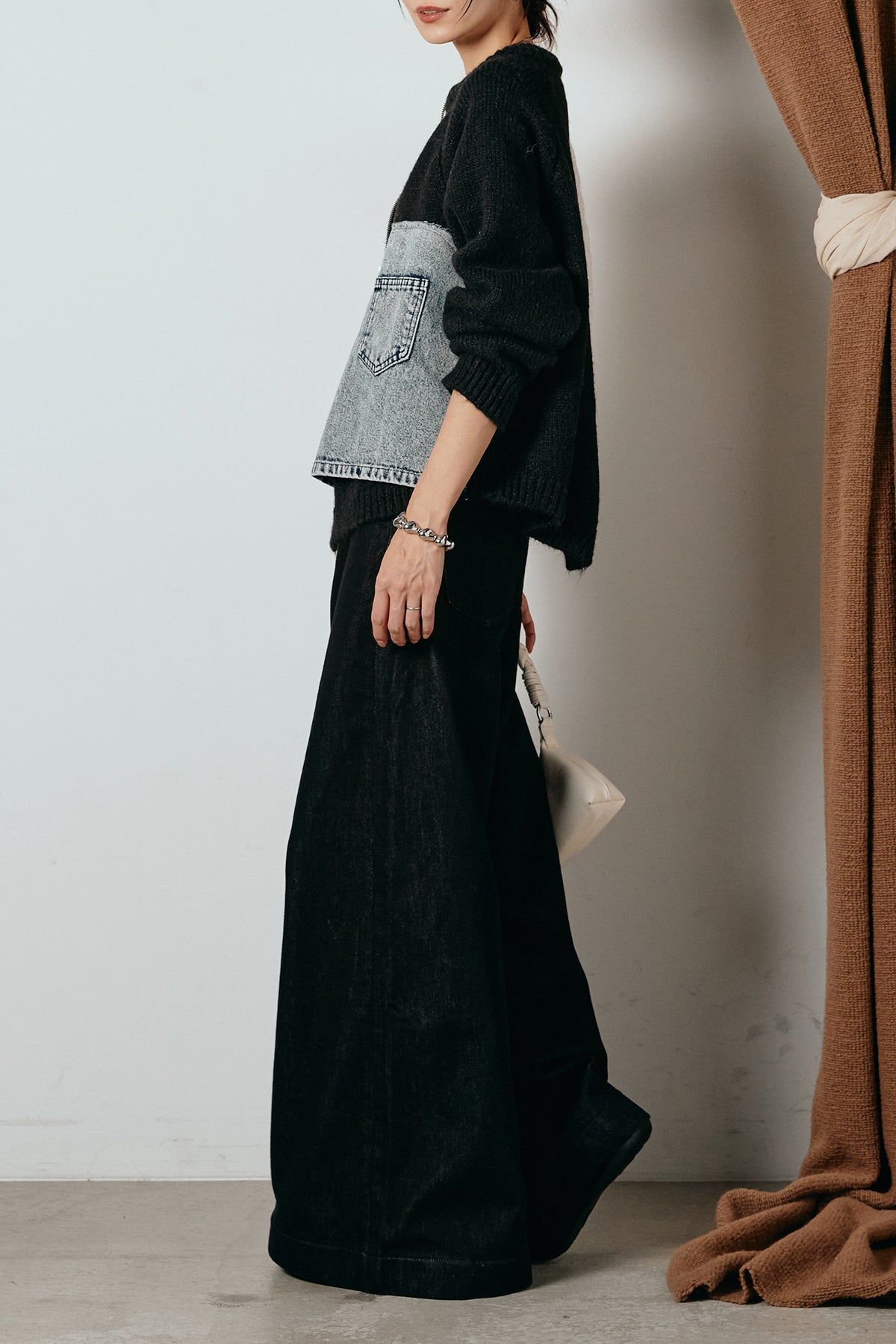 異素材を組み合わせた存在感のあるドッキングデザイン。ざっくりとしたニットにデニムパネルをミックスし、ラフさとモード感をバランスよく取り入れたトップスです。ハーフジップ仕様で抜け感の調整がしやすく、レイヤードやアクセ合わせも楽しめるデザイン。ゆるめのシルエットがこなれた印象をつくり、デニムやワイドパンツと合わせるだけで印象的なスタイリングに仕上がります。