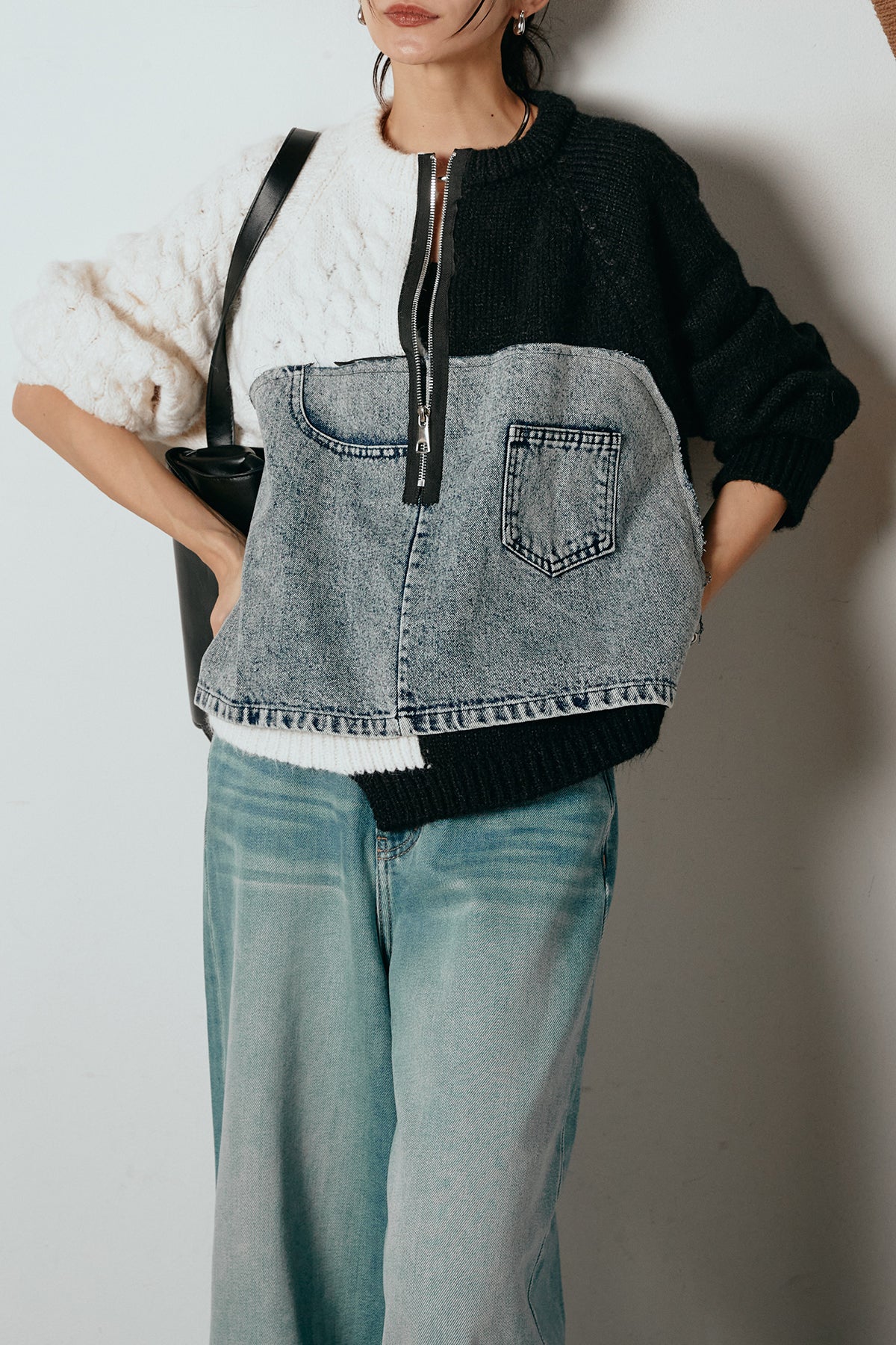 ハーフジップニットデニムドッキングトップス