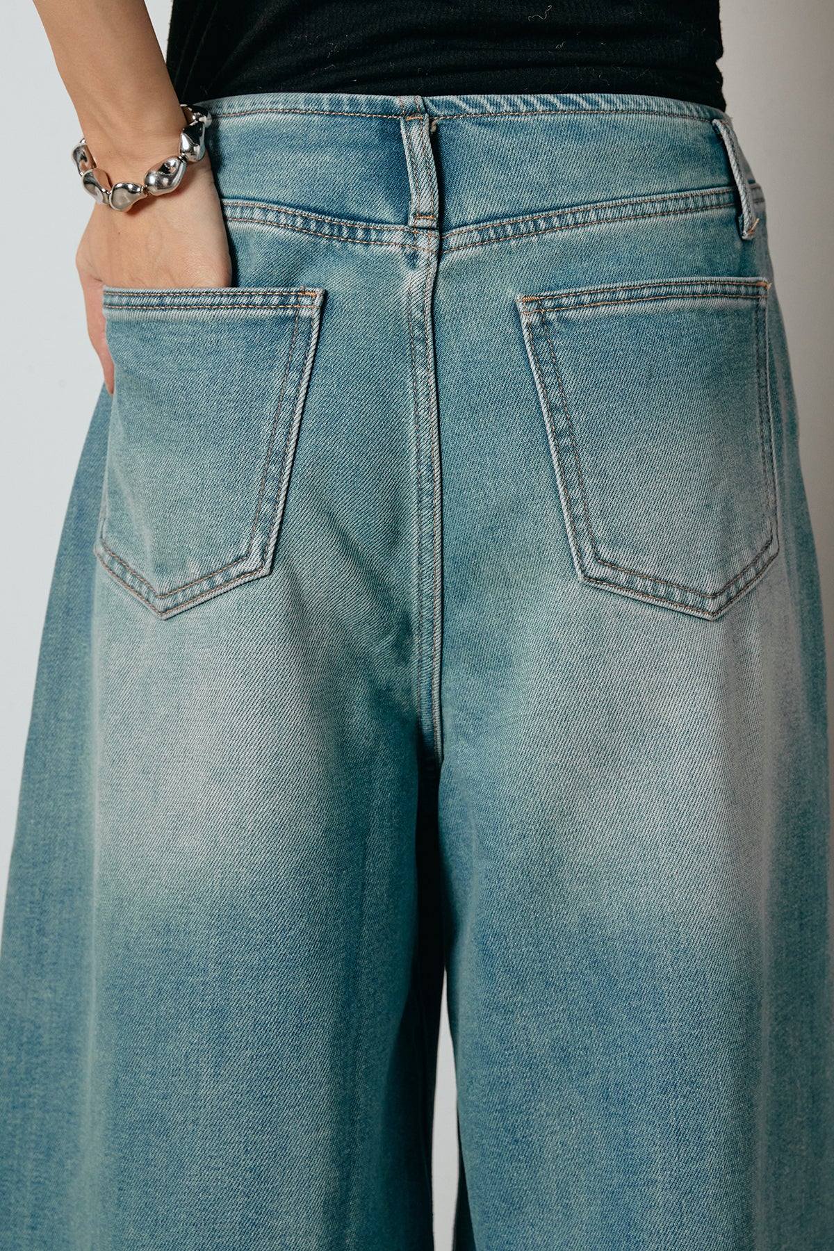 ゆったりと広がるシルエットが存在感を放つワイドデニム。ウエストのダブルボタンがアクセントになり、トップスインの着こなしにも映えるデザインです。柔らかな加工感が抜けをつくり、カジュアルにもモードにも馴染む一本。ニットやシャツとのバランスが取りやすく、普段のボトムをアップデートできるアイテムです。