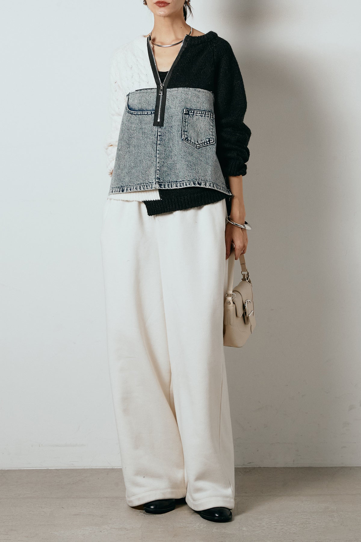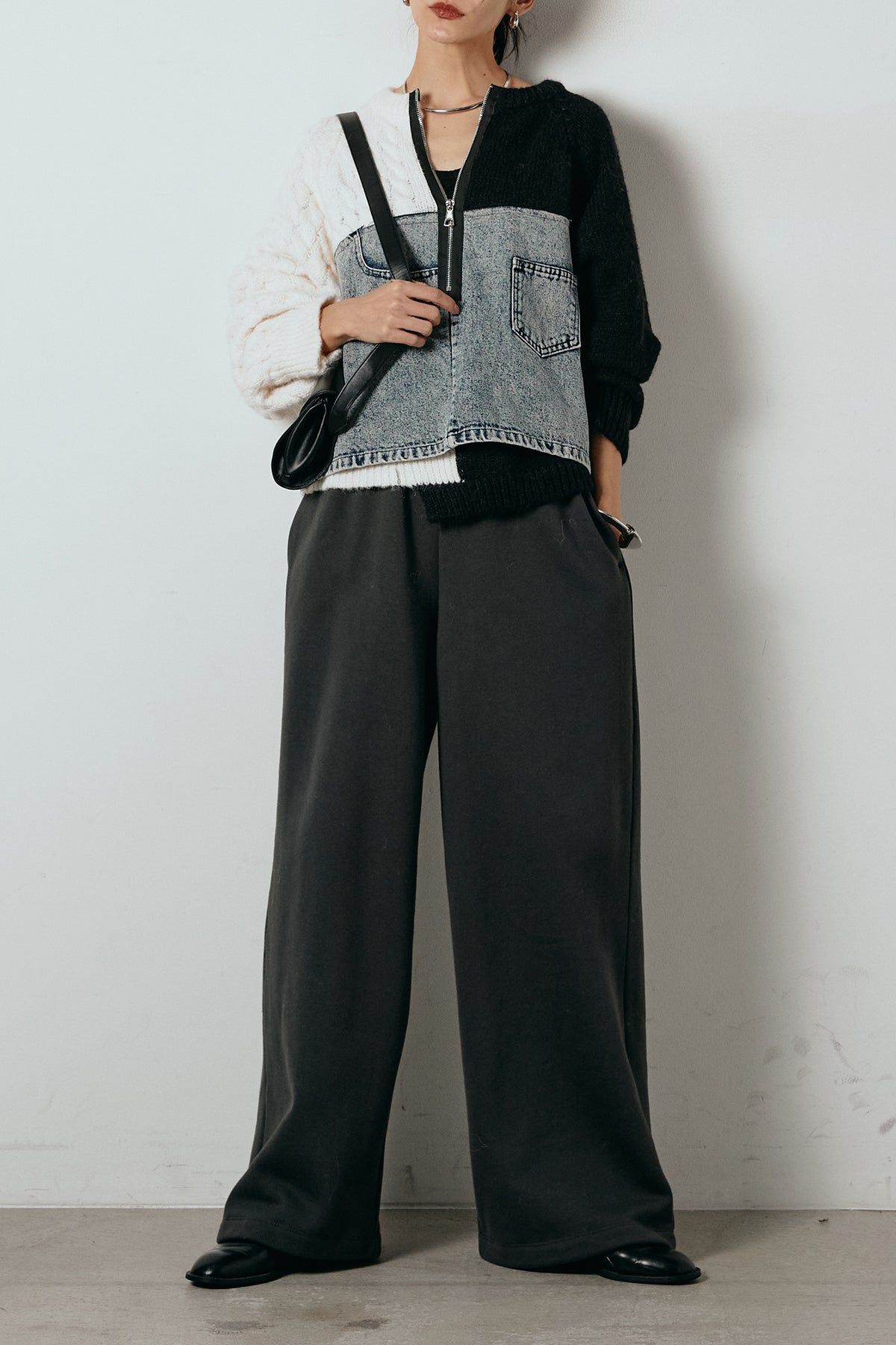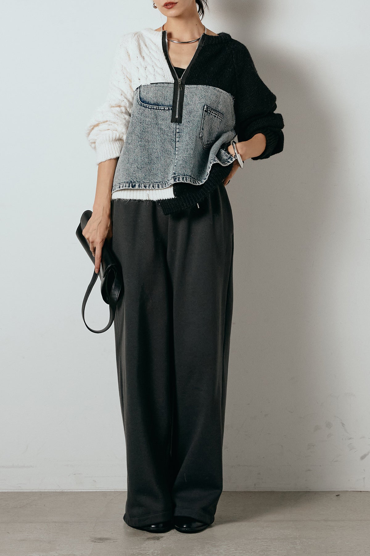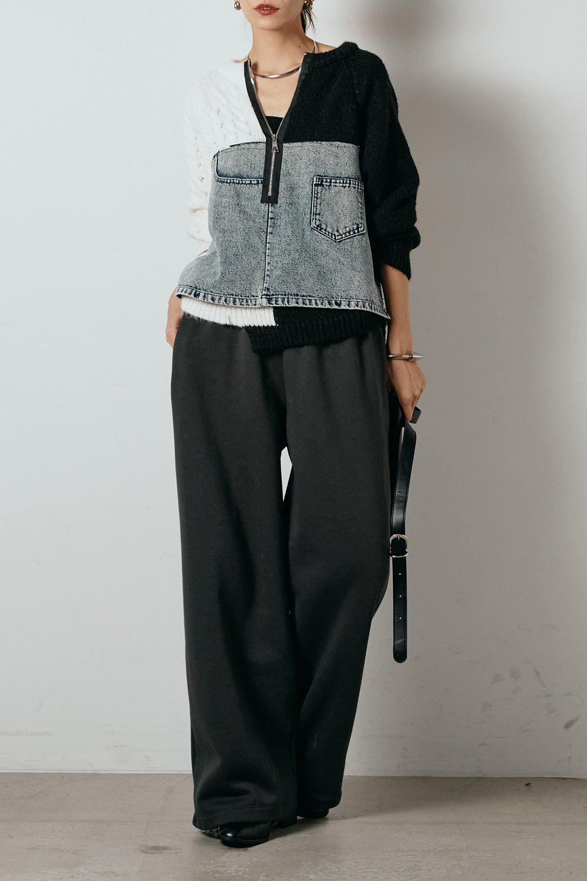 [SET]ハーフジップニットデニムドッキングトップス+裏起毛スウェットワイドパンツ(2set)