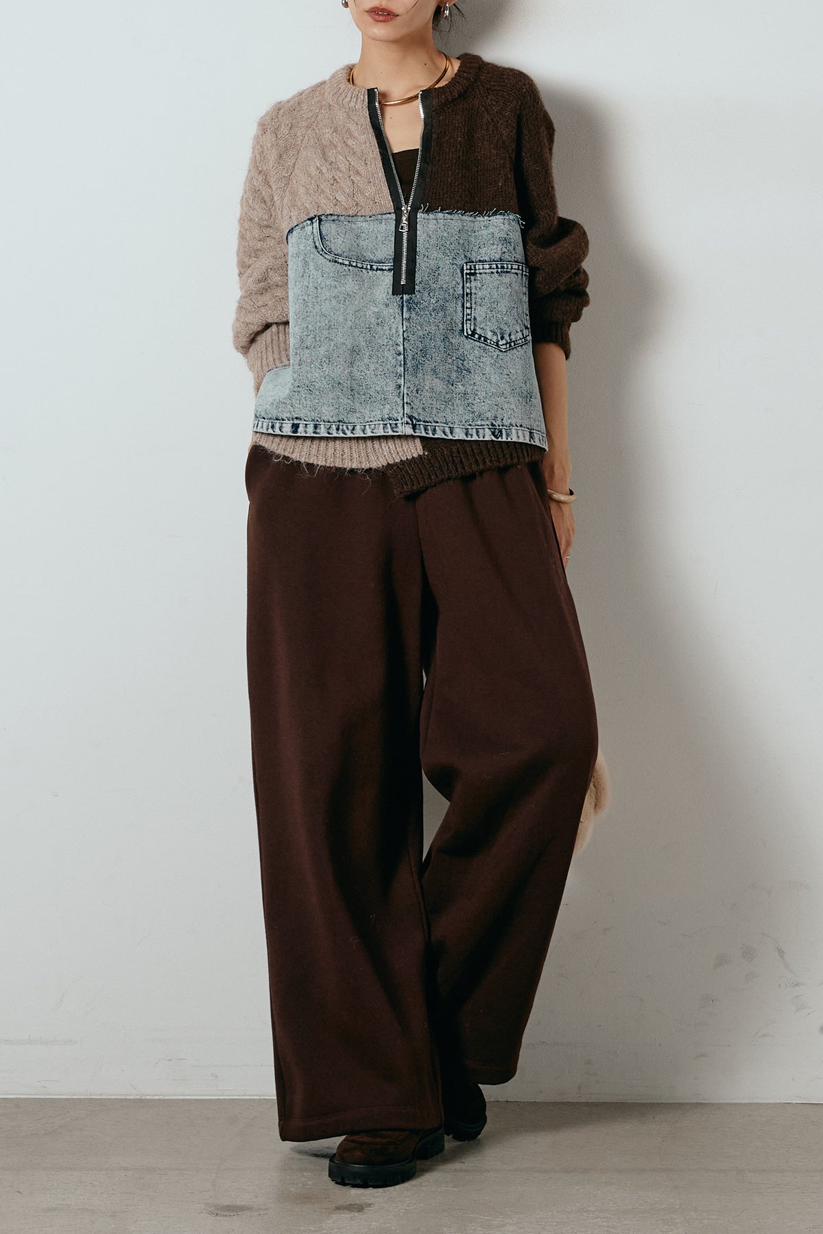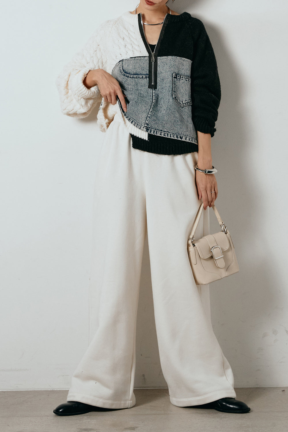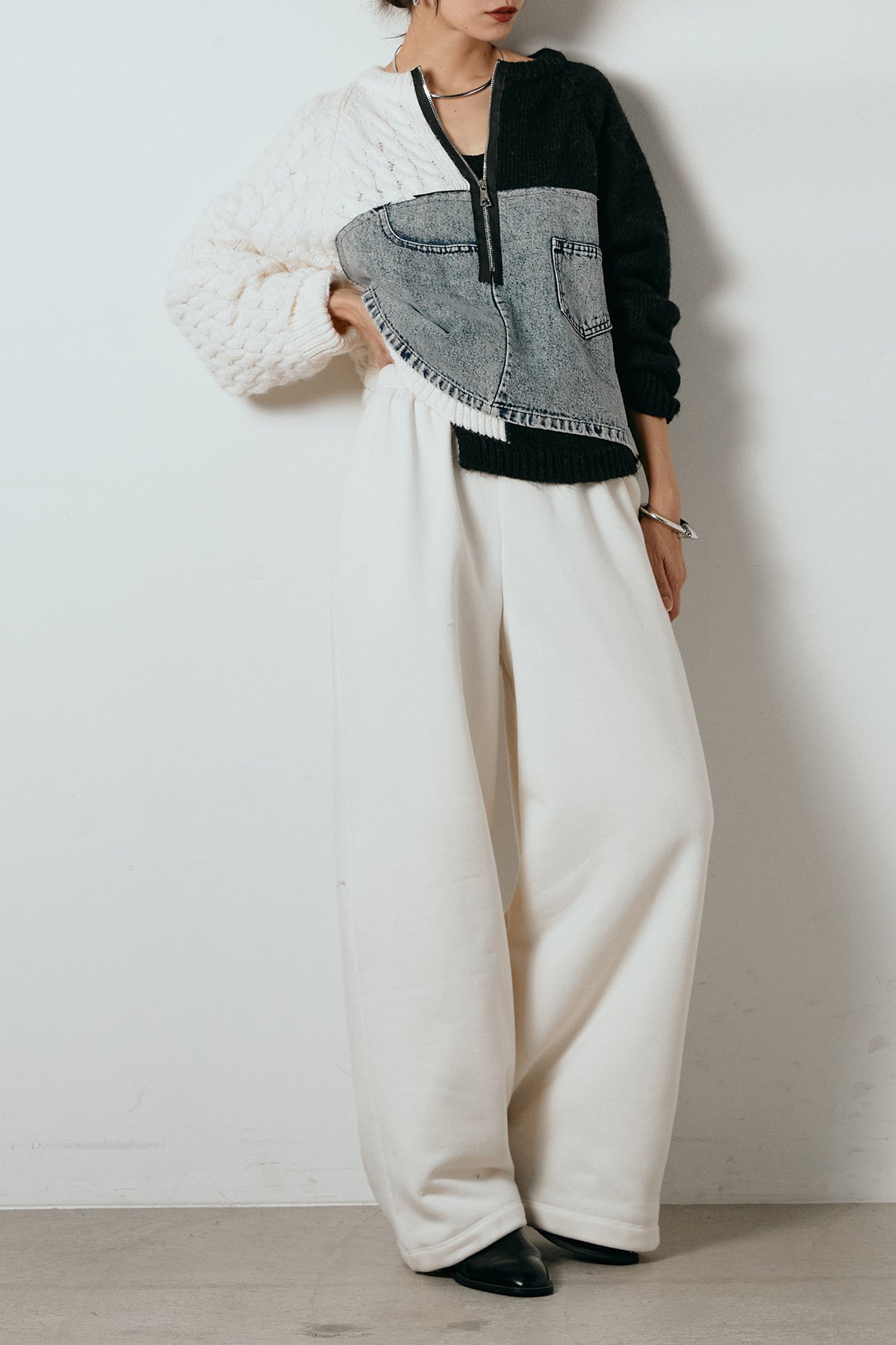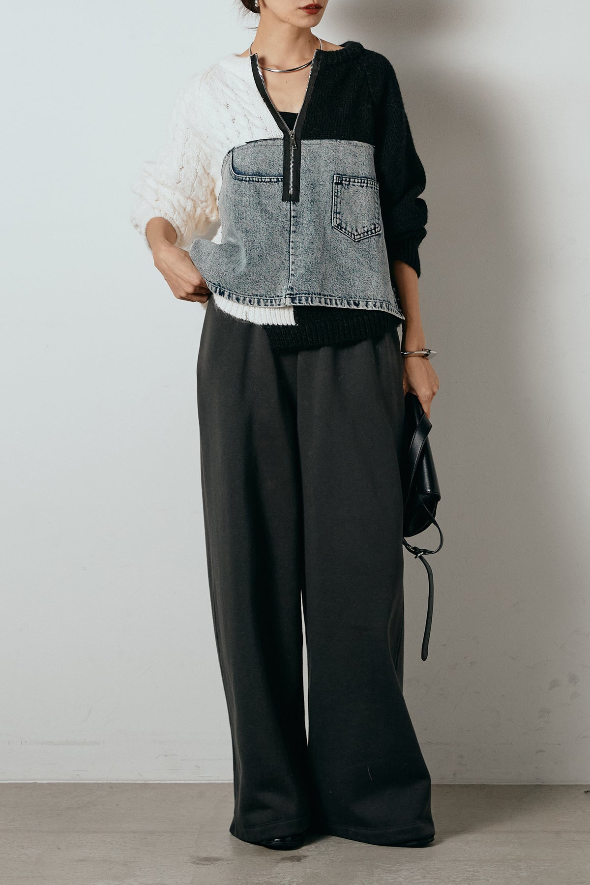 [SET]ハーフジップニットデニムドッキングトップス+裏起毛スウェットワイドパンツ(2set)