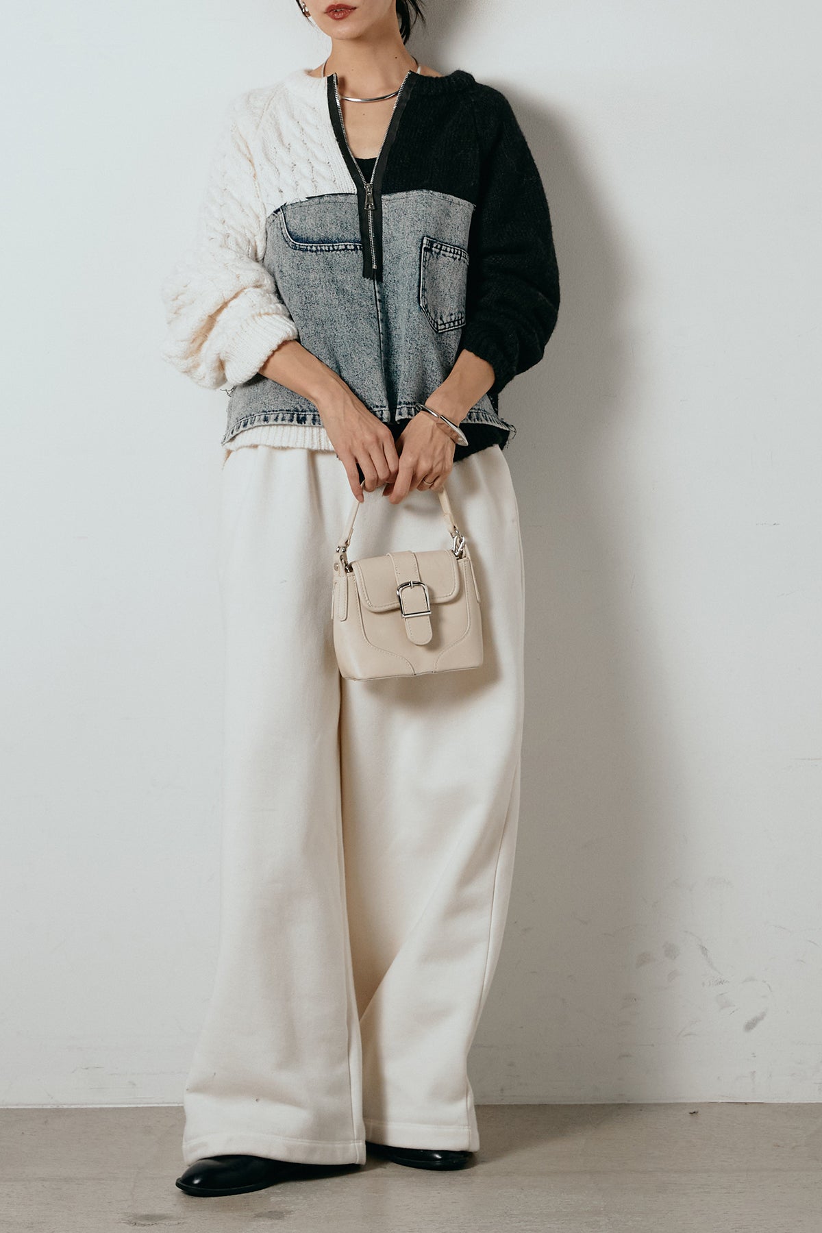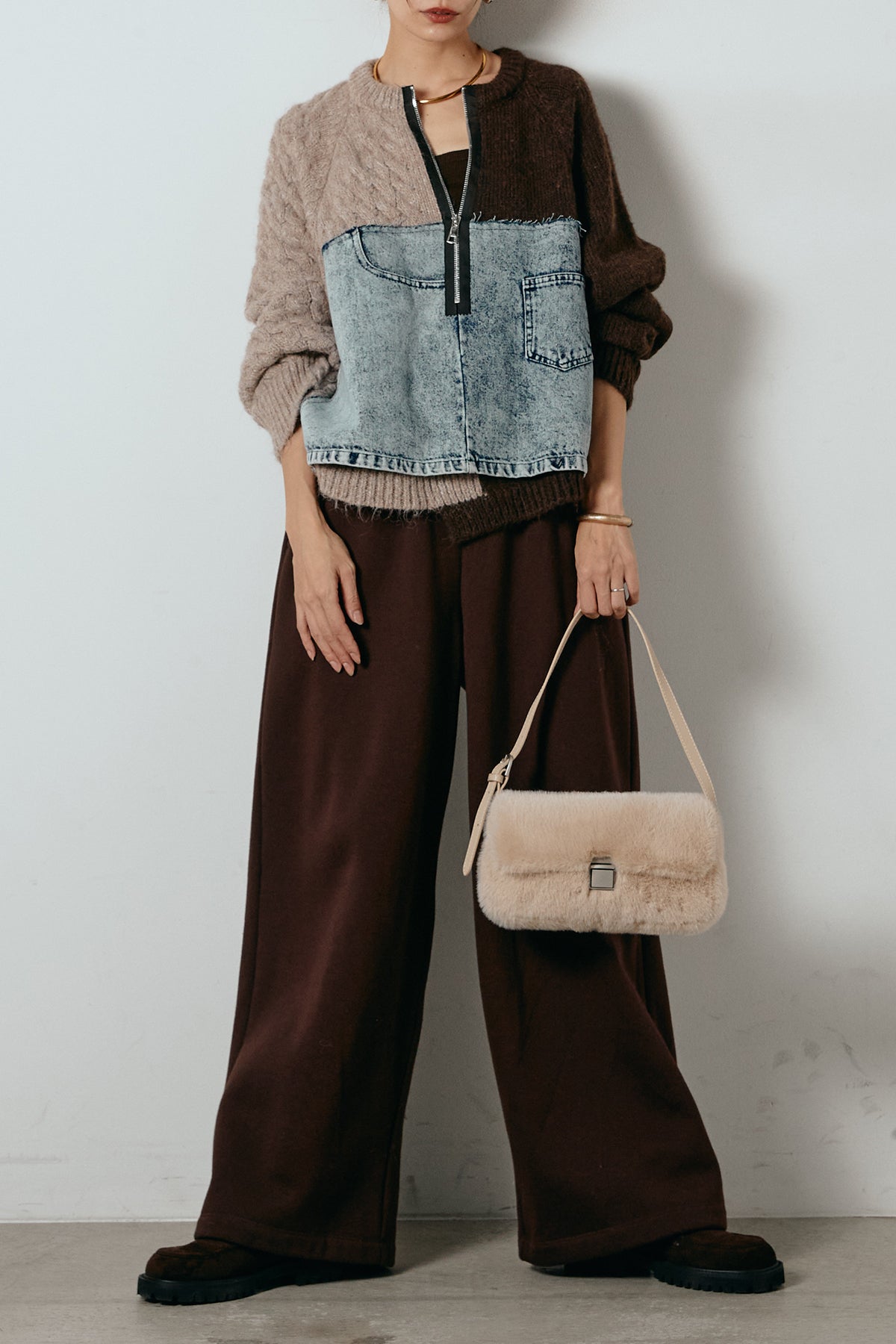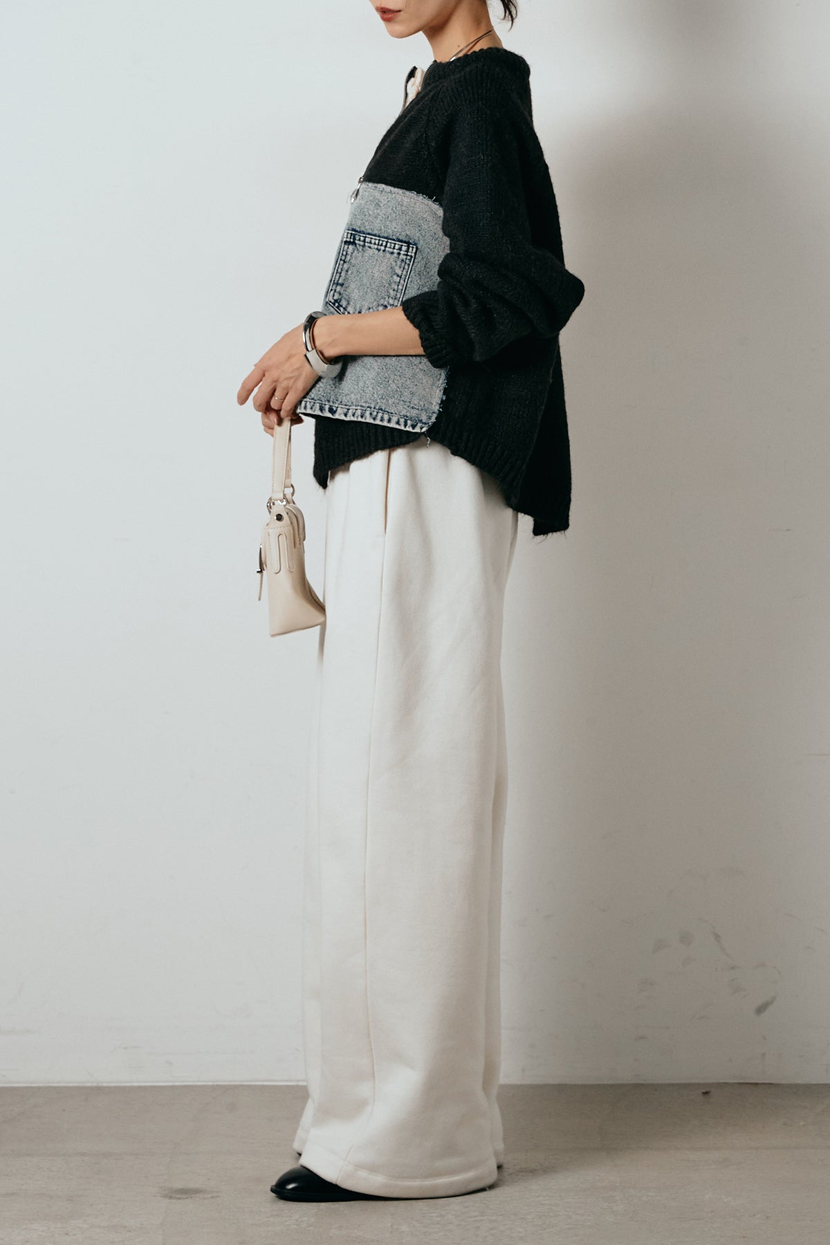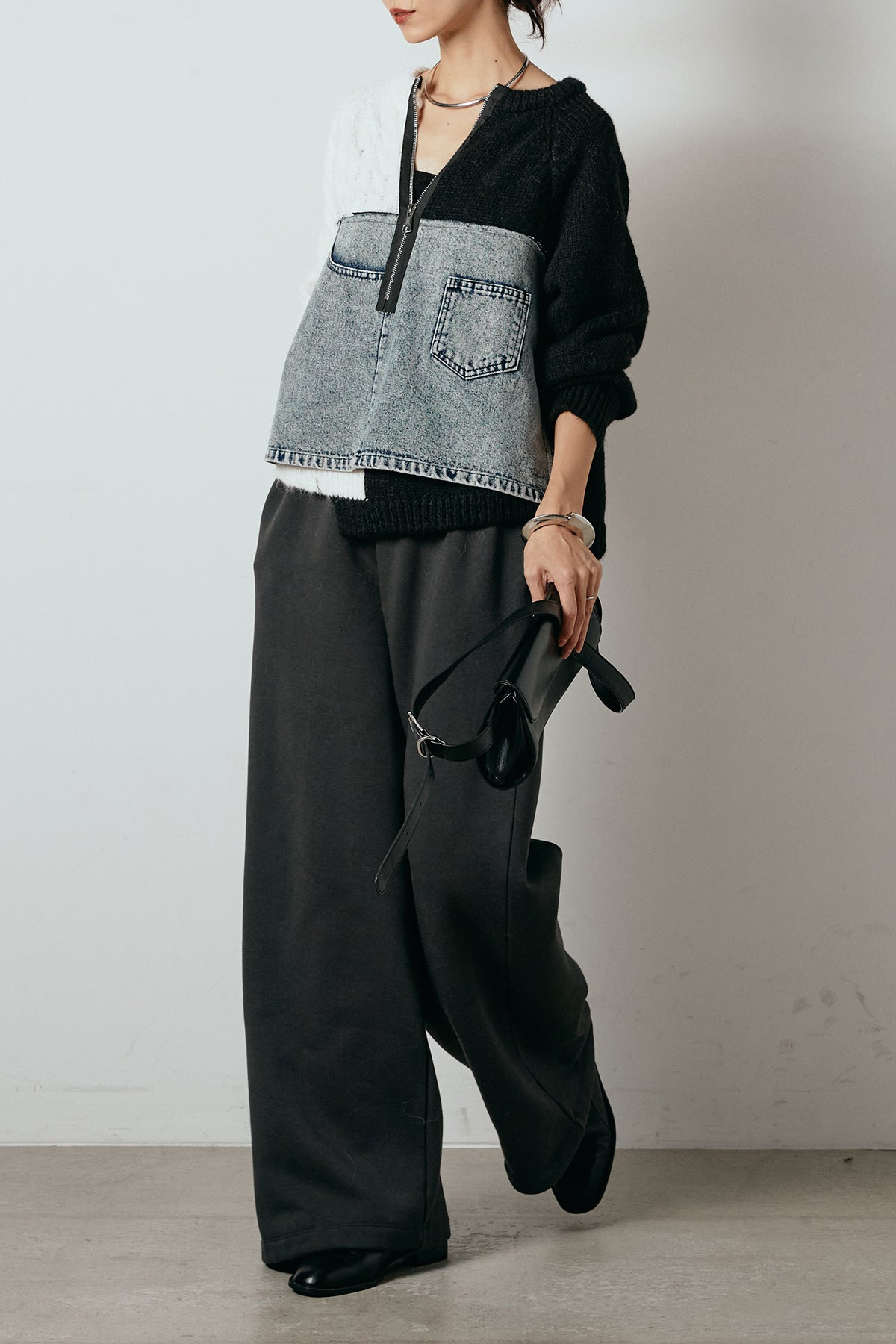 [SET]ハーフジップニットデニムドッキングトップス+裏起毛スウェットワイドパンツ(2set)