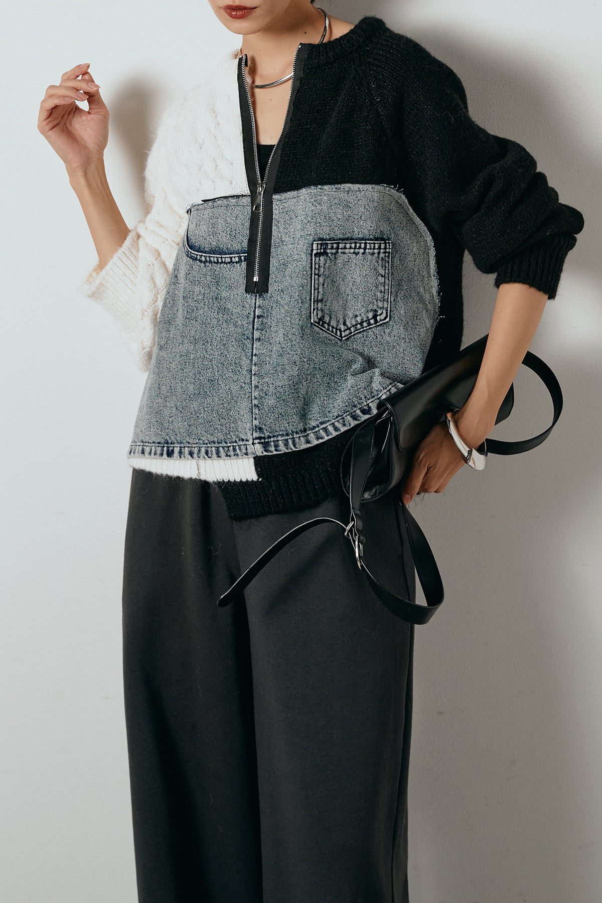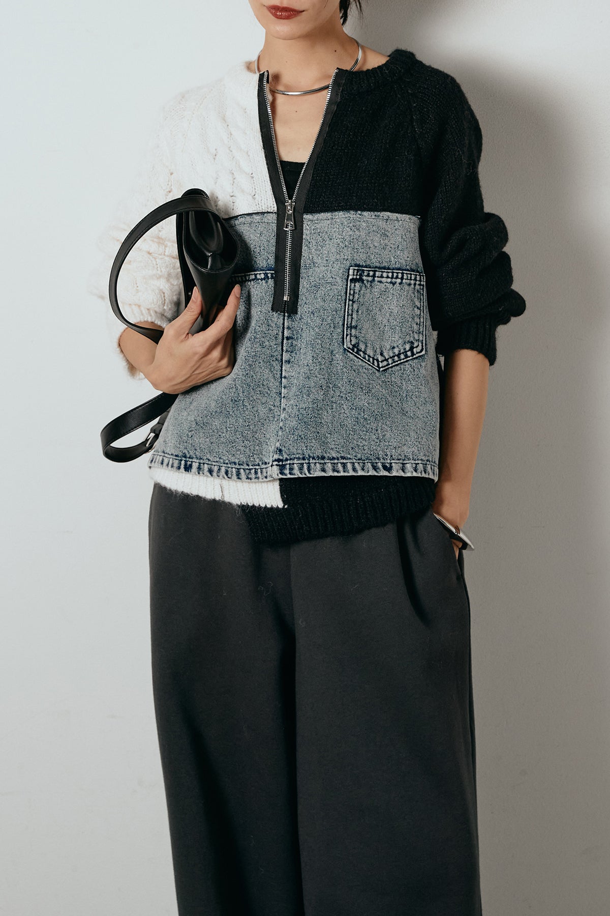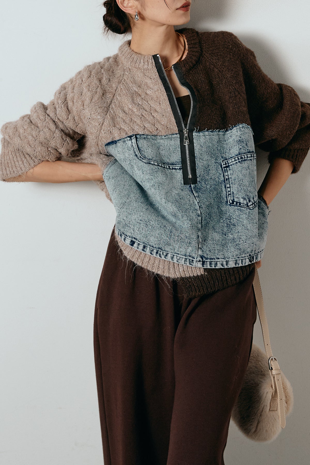 異素材を組み合わせた存在感のあるドッキングデザイン。ざっくりとしたニットにデニムパネルをミックスし、ラフさとモード感をバランスよく取り入れたトップスです。ハーフジップ仕様で抜け感の調整がしやすく、レイヤードやアクセ合わせも楽しめるデザイン。ゆるめのシルエットがこなれた印象をつくり、デニムやワイドパンツと合わせるだけで印象的なスタイリングに仕上がります。