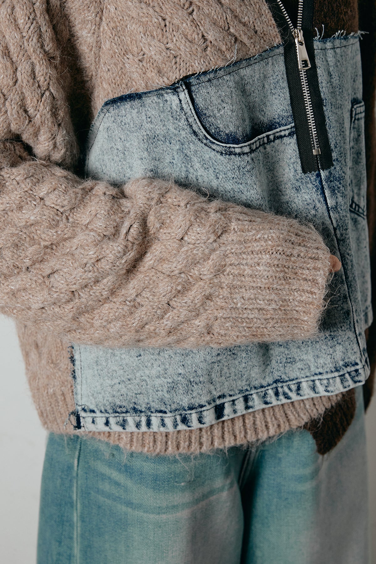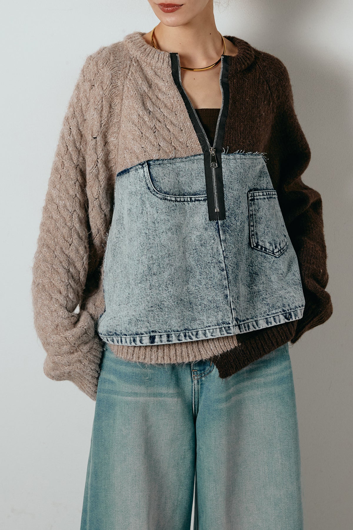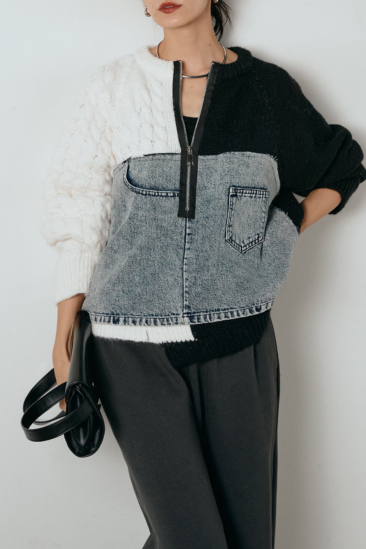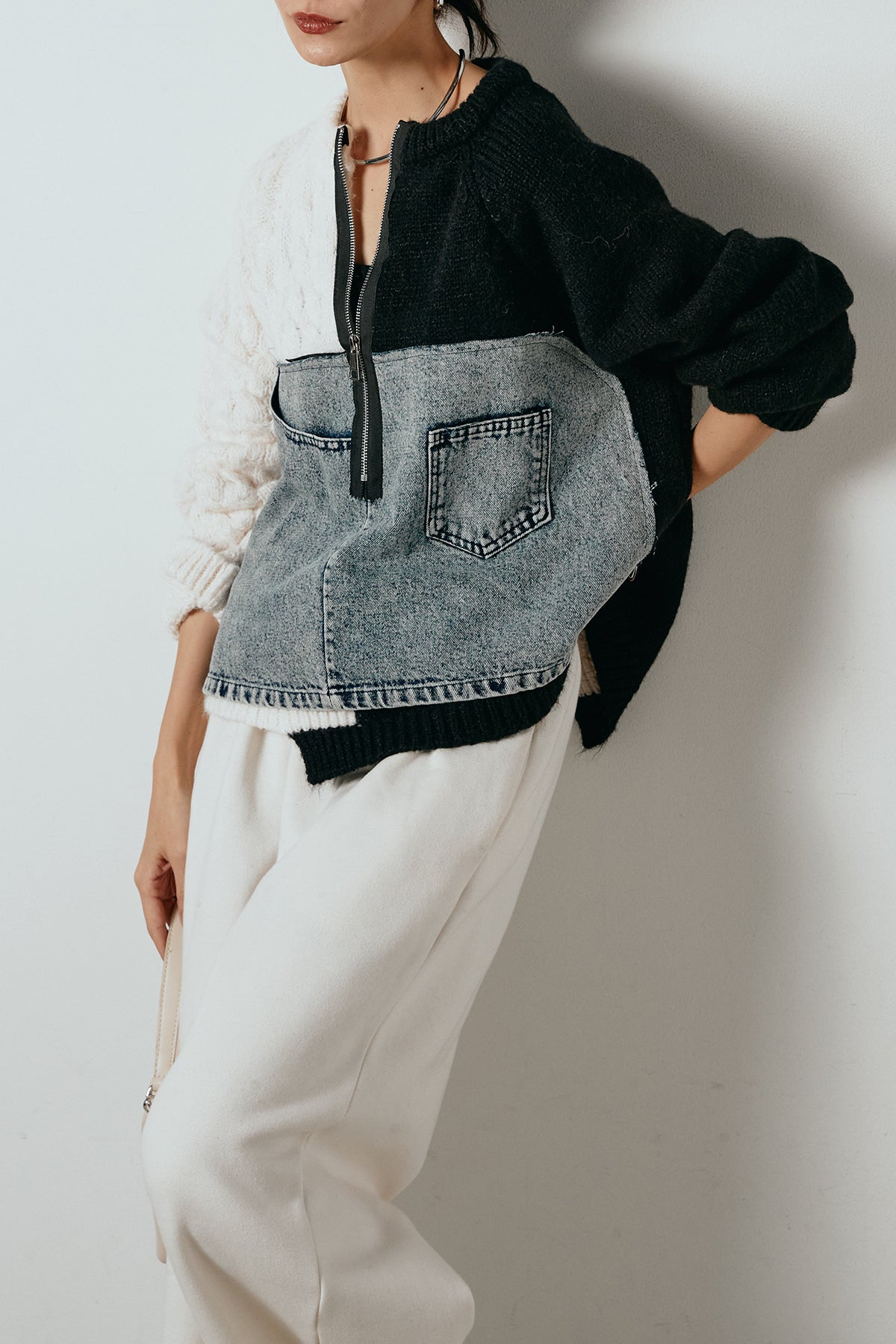 異素材を組み合わせた存在感のあるドッキングデザイン。ざっくりとしたニットにデニムパネルをミックスし、ラフさとモード感をバランスよく取り入れたトップスです。ハーフジップ仕様で抜け感の調整がしやすく、レイヤードやアクセ合わせも楽しめるデザイン。ゆるめのシルエットがこなれた印象をつくり、デニムやワイドパンツと合わせるだけで印象的なスタイリングに仕上がります。