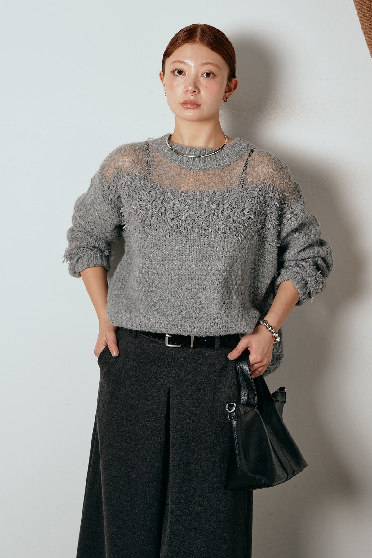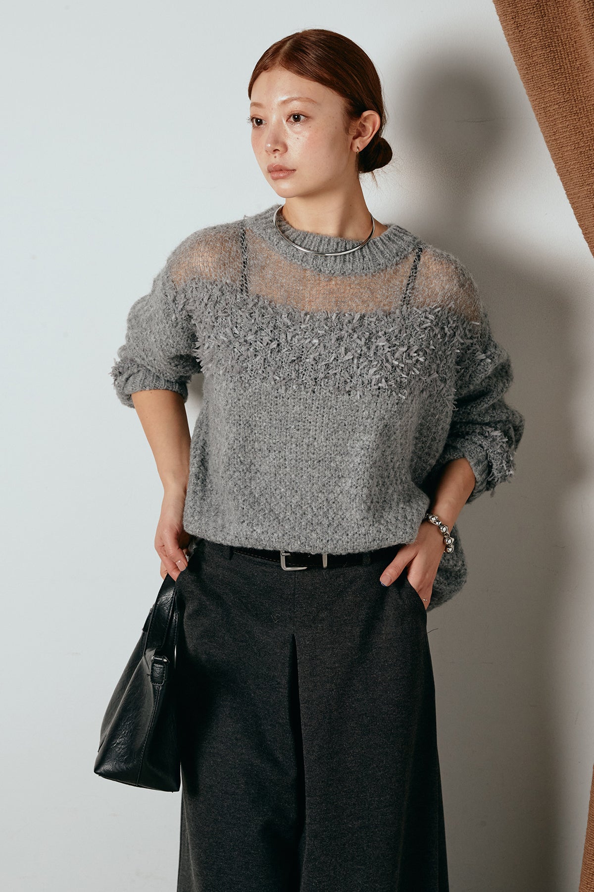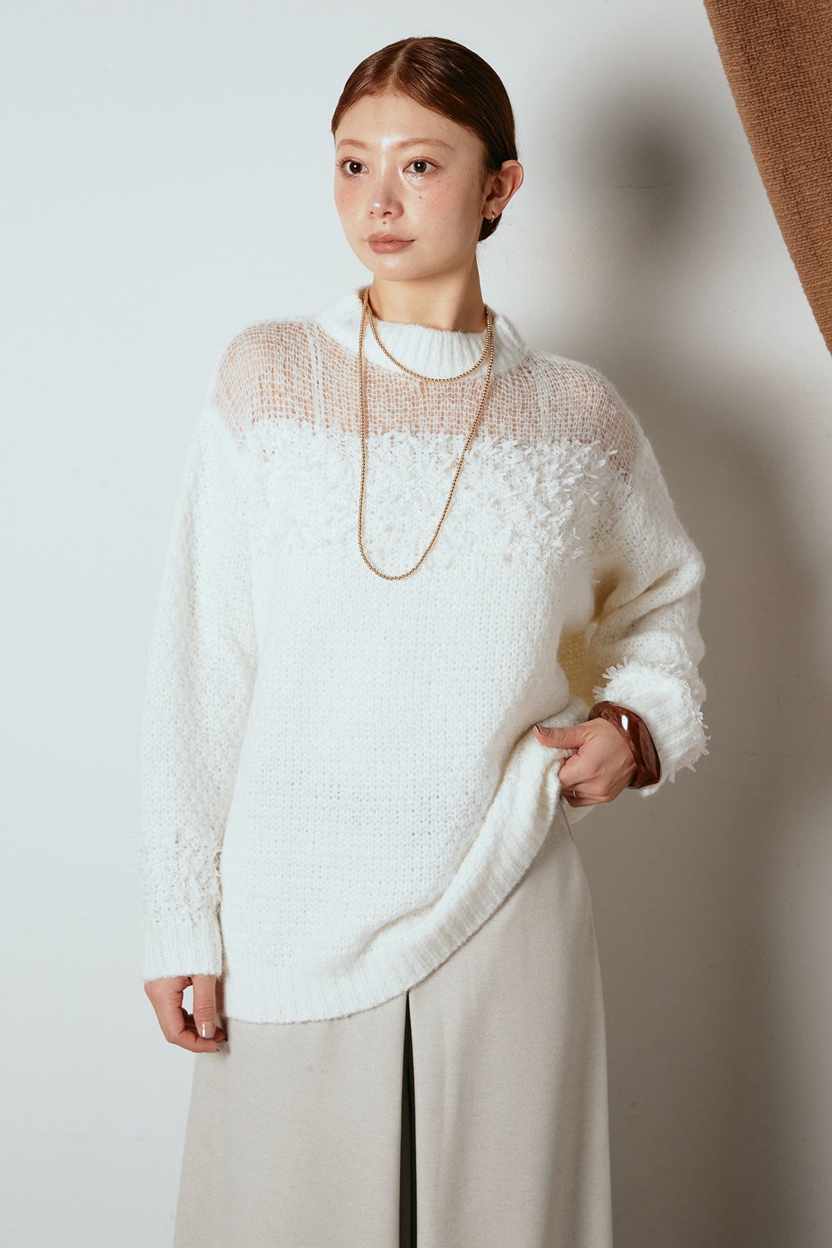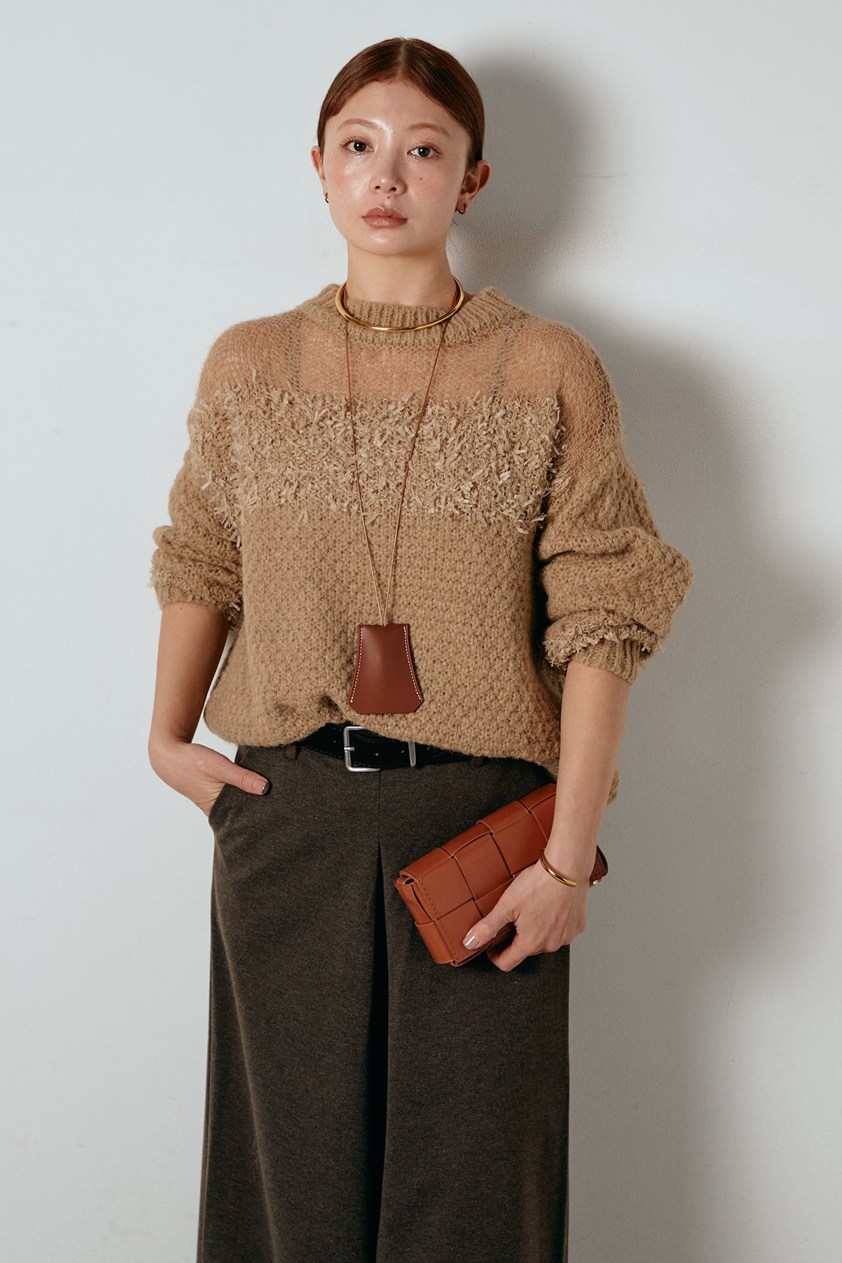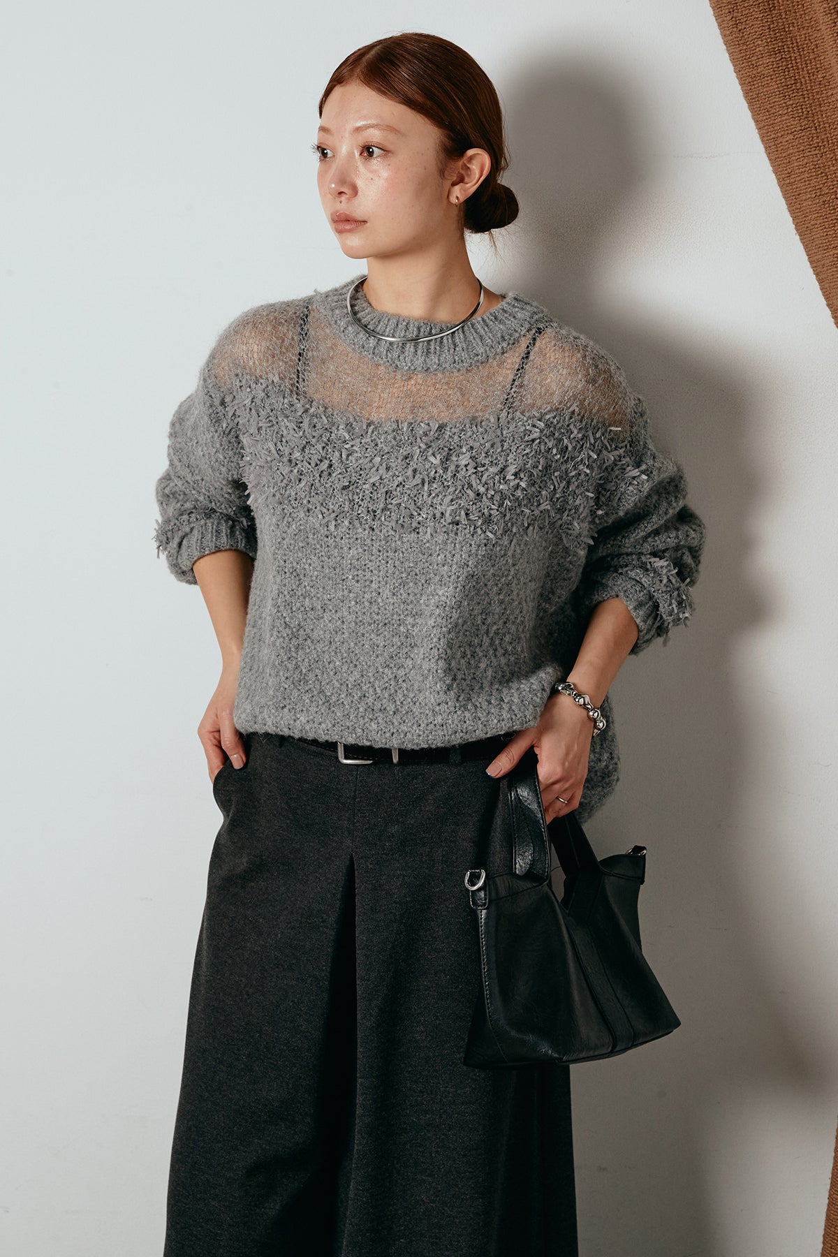 ランダムな編地切り替えを合わせたニットトップス。肩から胸元にかけての透け感と、ふわっとした立体的な編み表情がアクセントになり、シンプルながら印象のあるバランスに。身頃はすっきりした編地でまとめているので、ゆったりしたフォルムでも重たく見えにくく、パンツやスカートなど幅広く合わせやすいアイテムです。