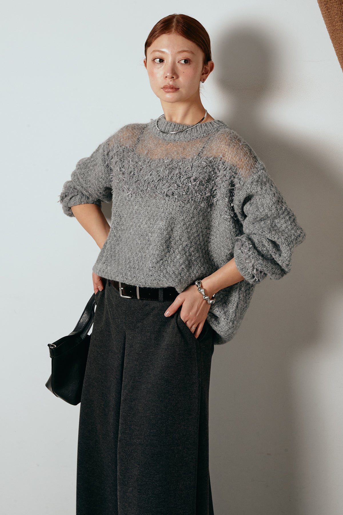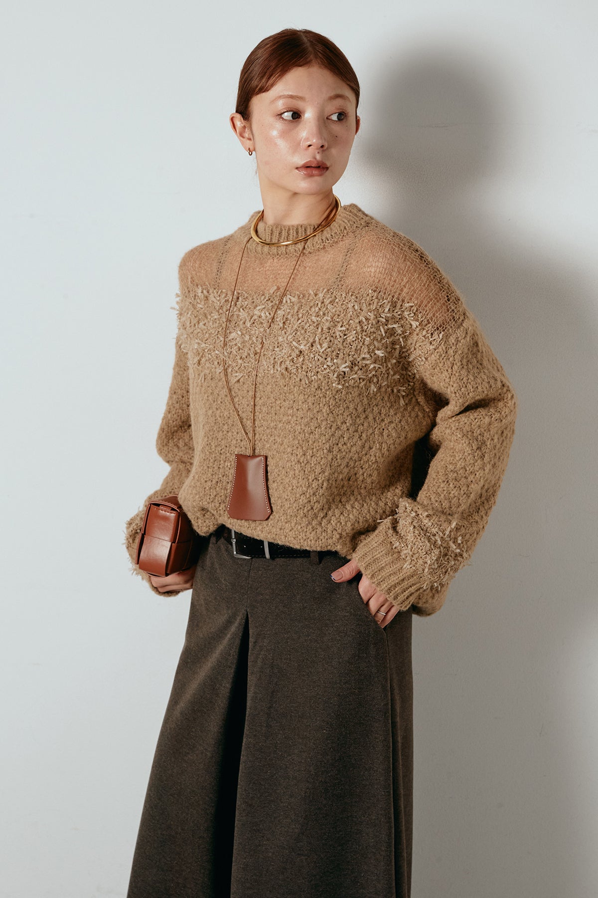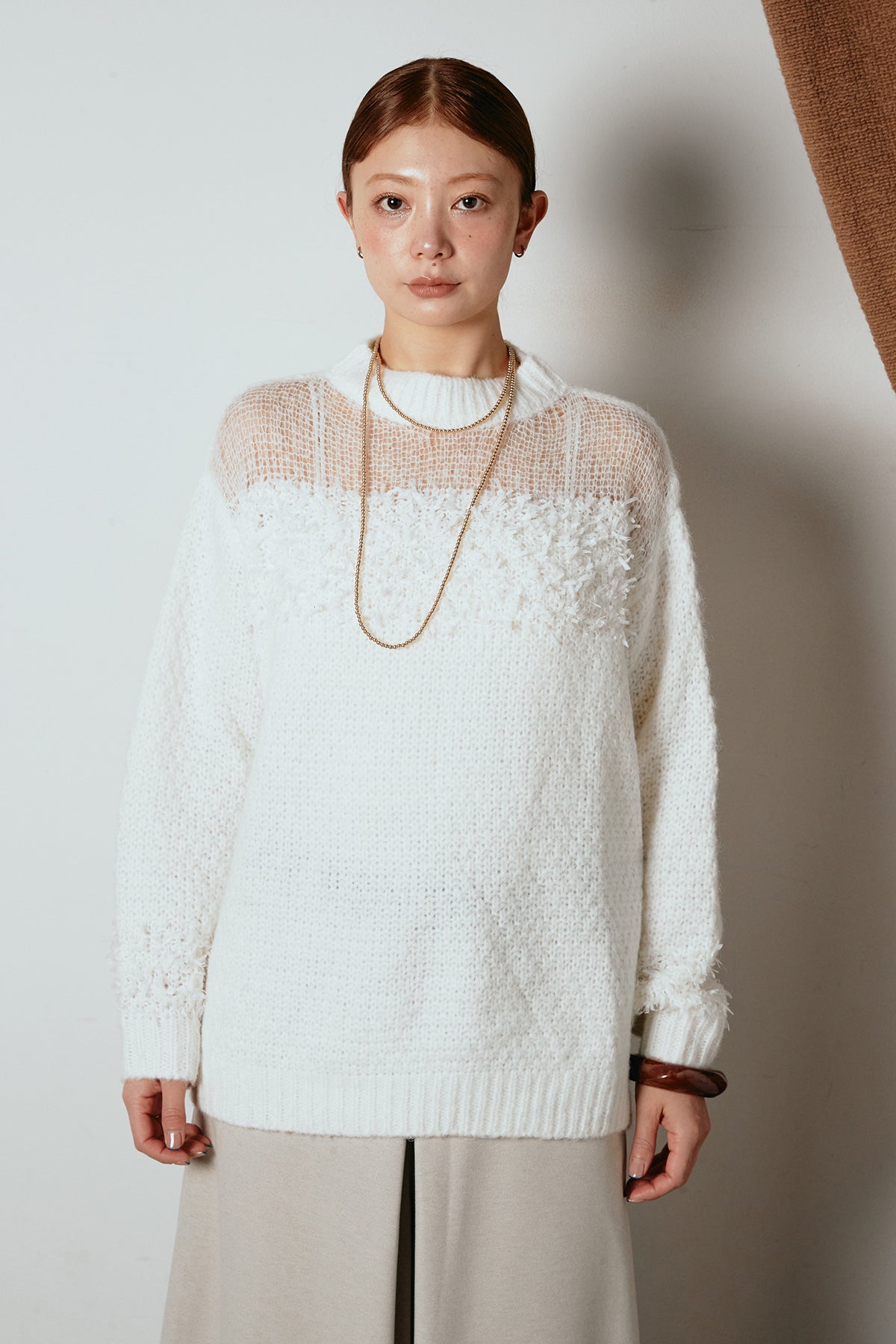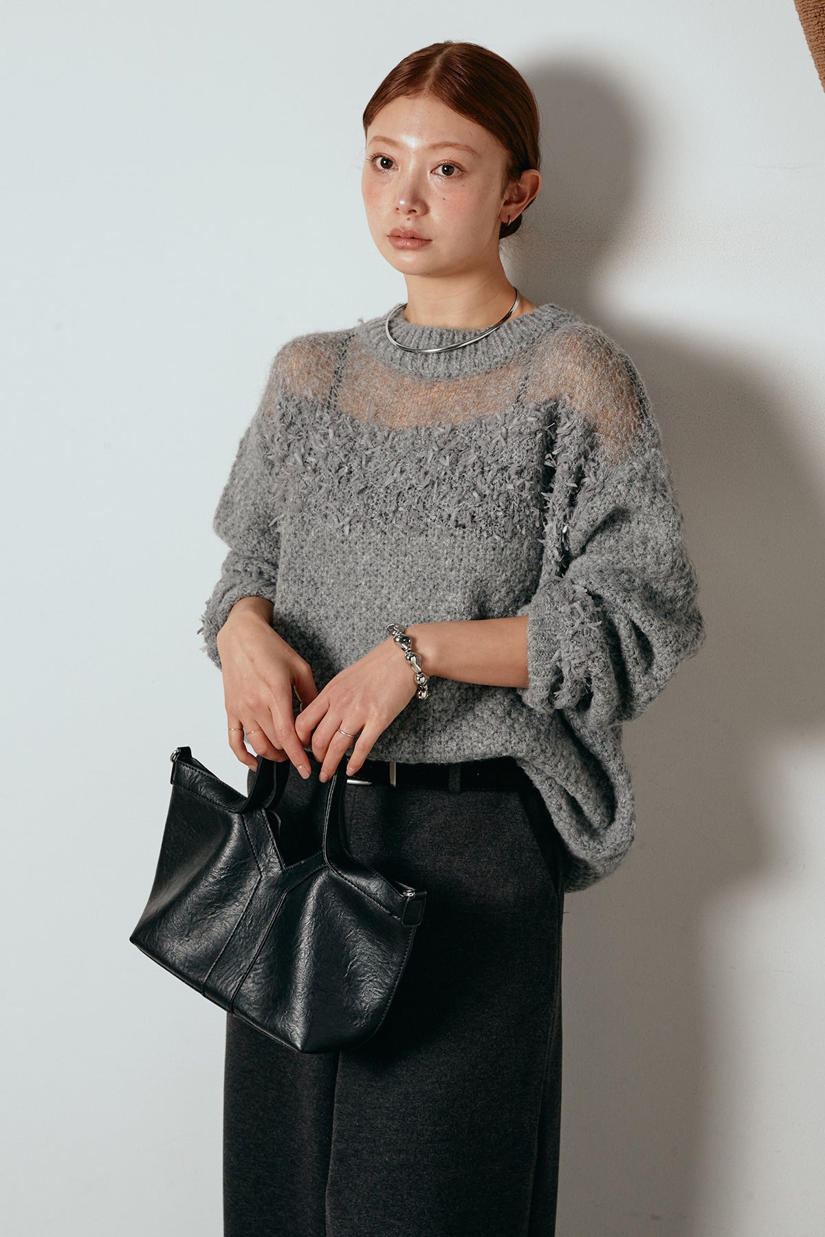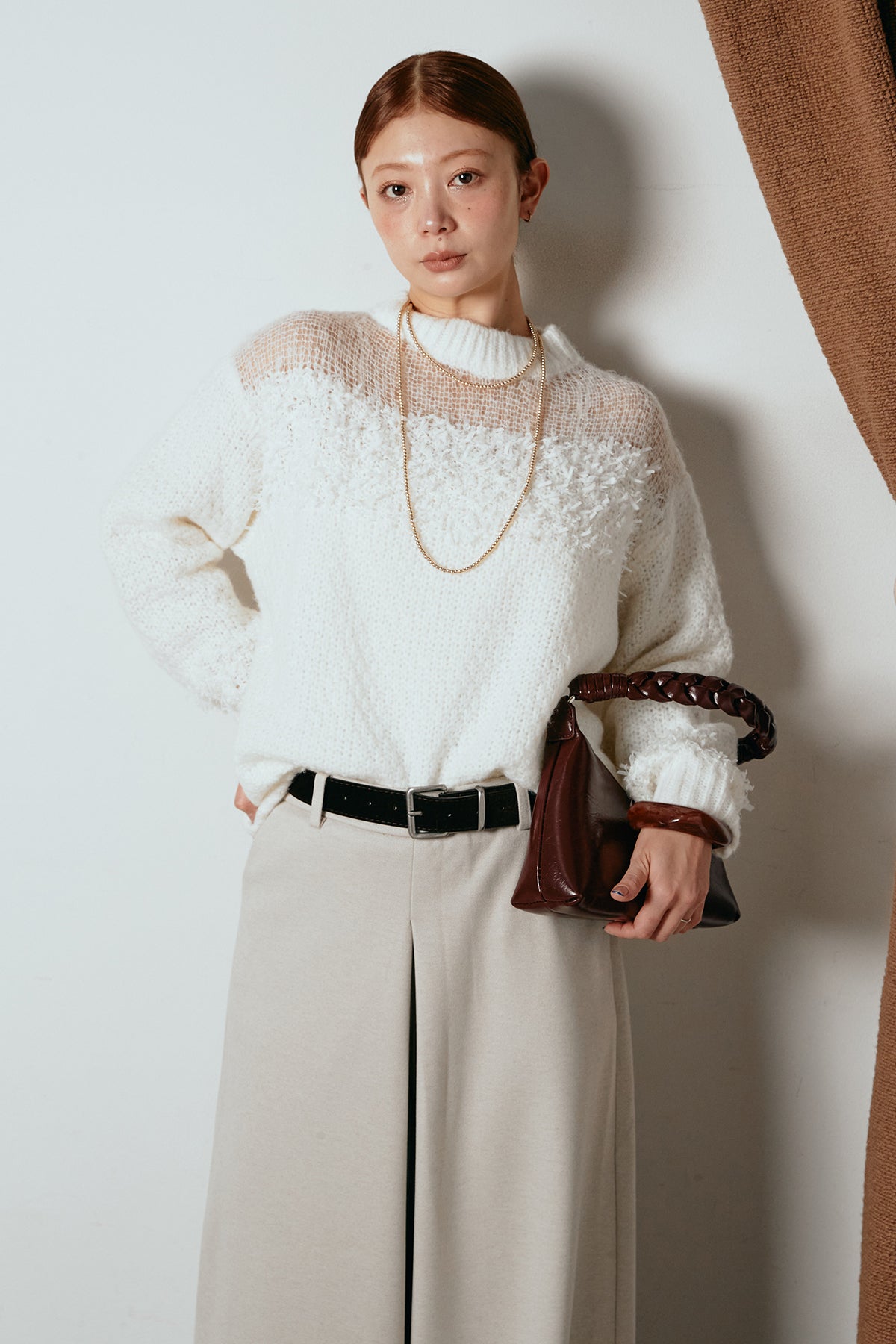 ランダムな編地切り替えを合わせたニットトップス。肩から胸元にかけての透け感と、ふわっとした立体的な編み表情がアクセントになり、シンプルながら印象のあるバランスに。身頃はすっきりした編地でまとめているので、ゆったりしたフォルムでも重たく見えにくく、パンツやスカートなど幅広く合わせやすいアイテムです。