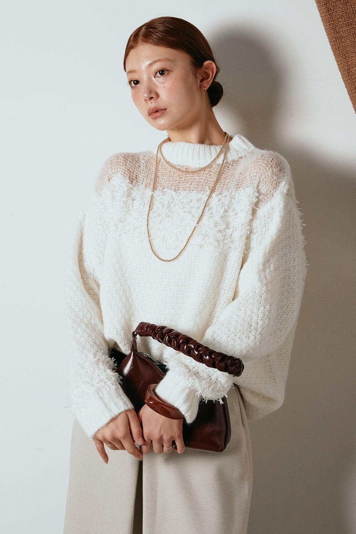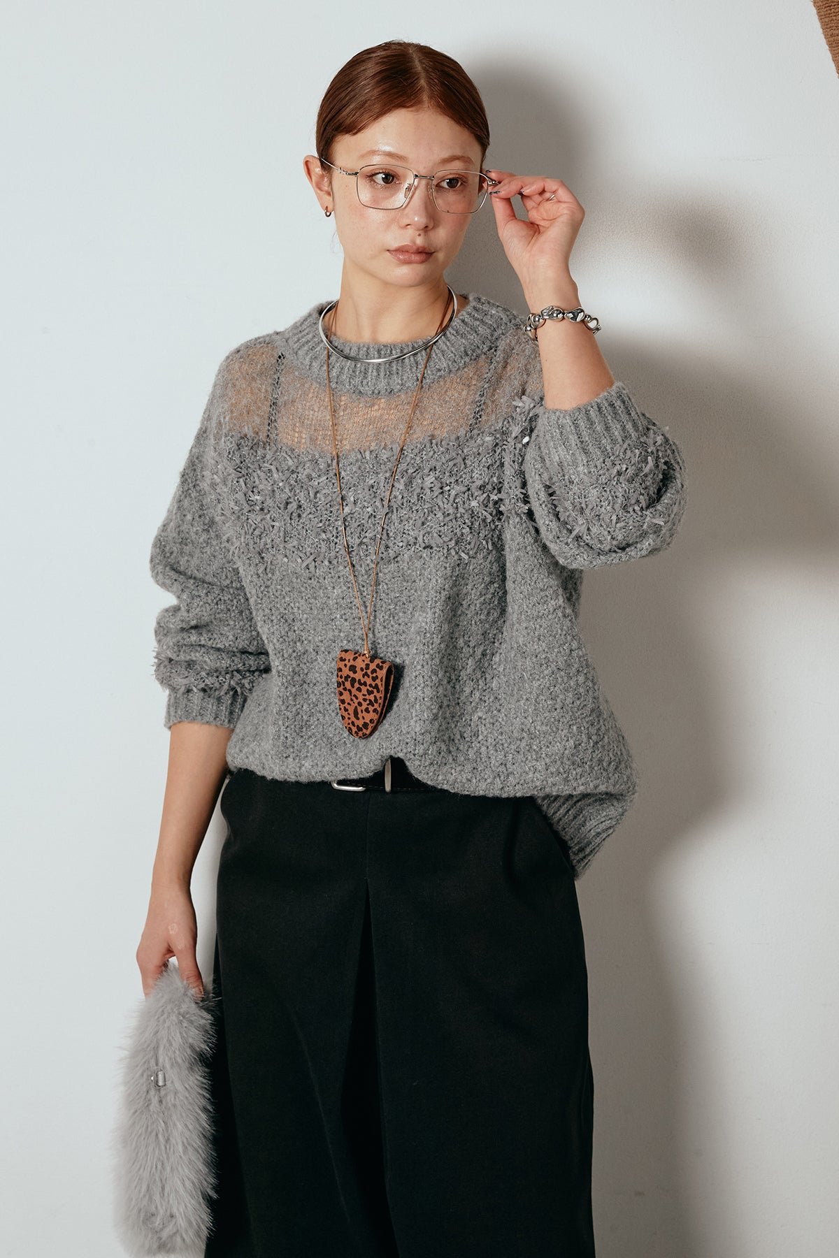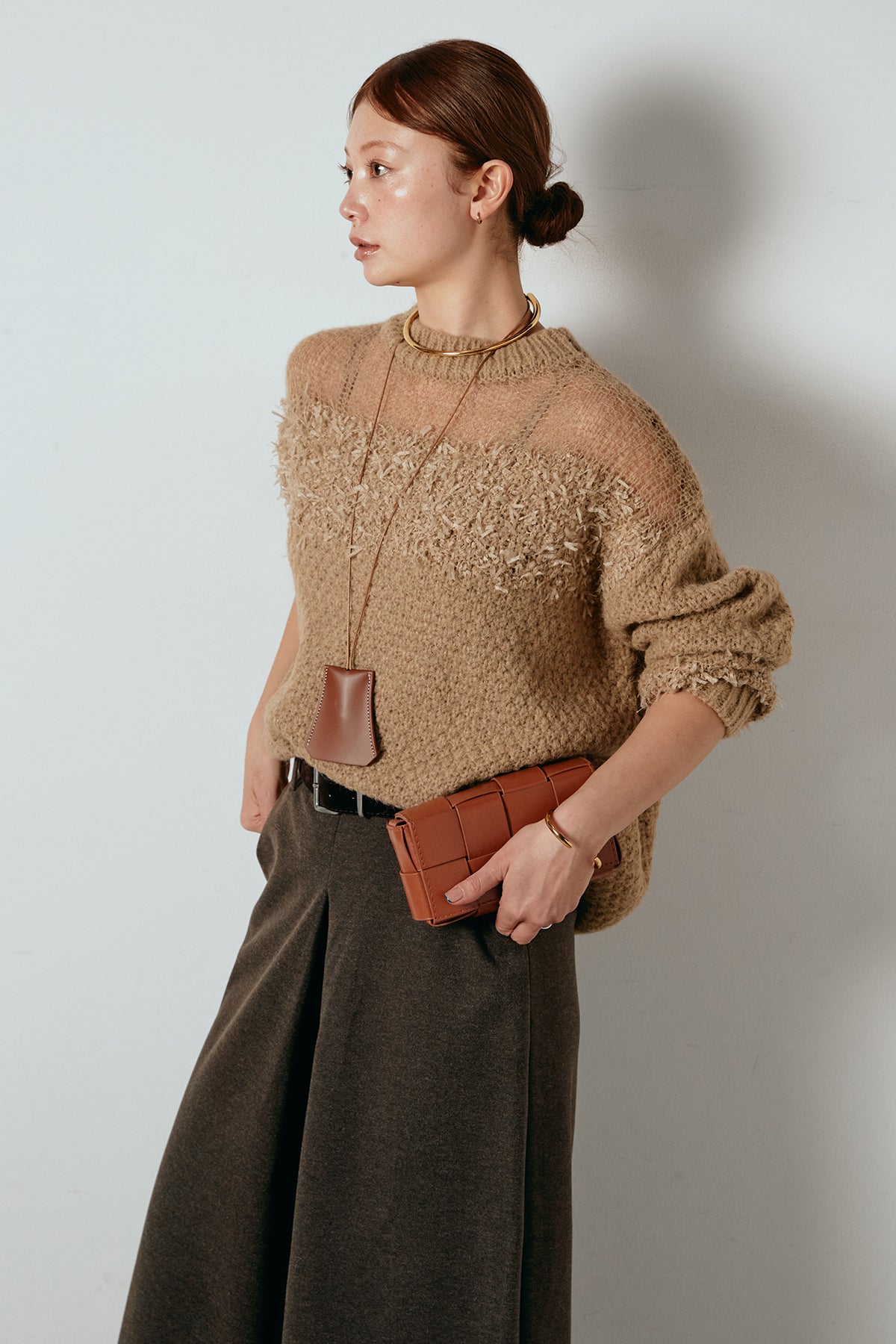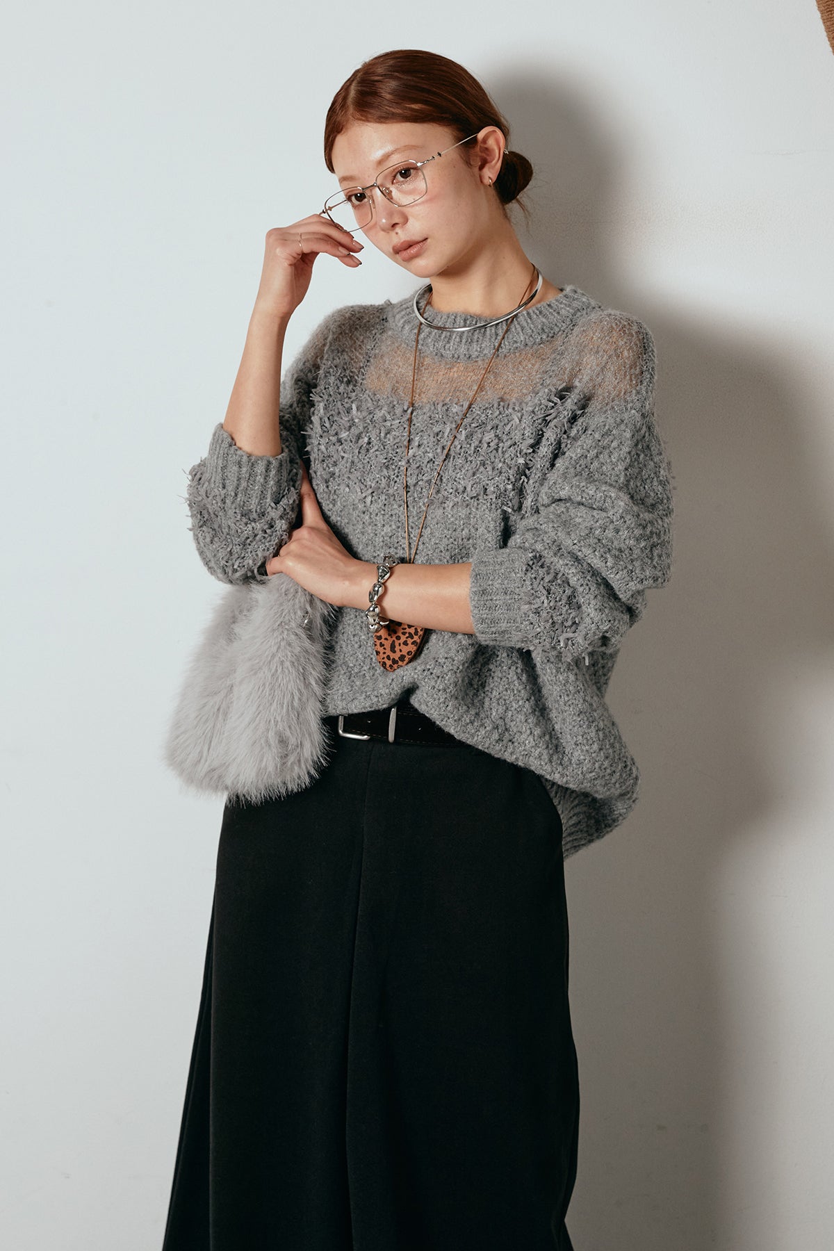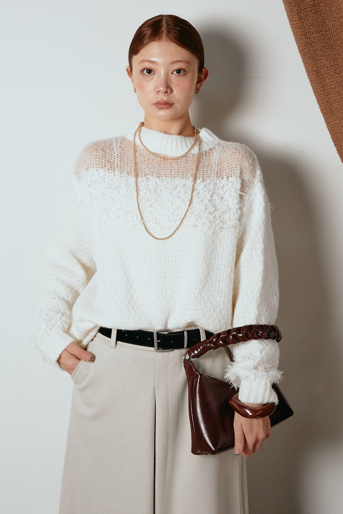 ランダムな編地切り替えを合わせたニットトップス。肩から胸元にかけての透け感と、ふわっとした立体的な編み表情がアクセントになり、シンプルながら印象のあるバランスに。身頃はすっきりした編地でまとめているので、ゆったりしたフォルムでも重たく見えにくく、パンツやスカートなど幅広く合わせやすいアイテムです。