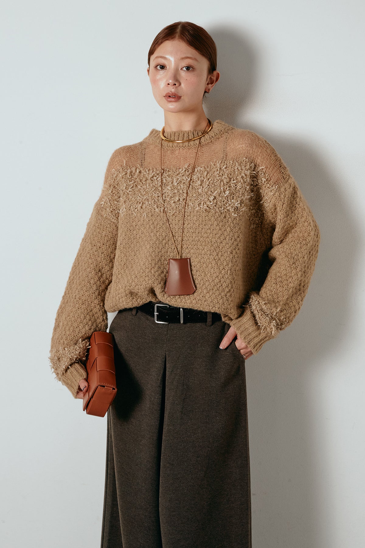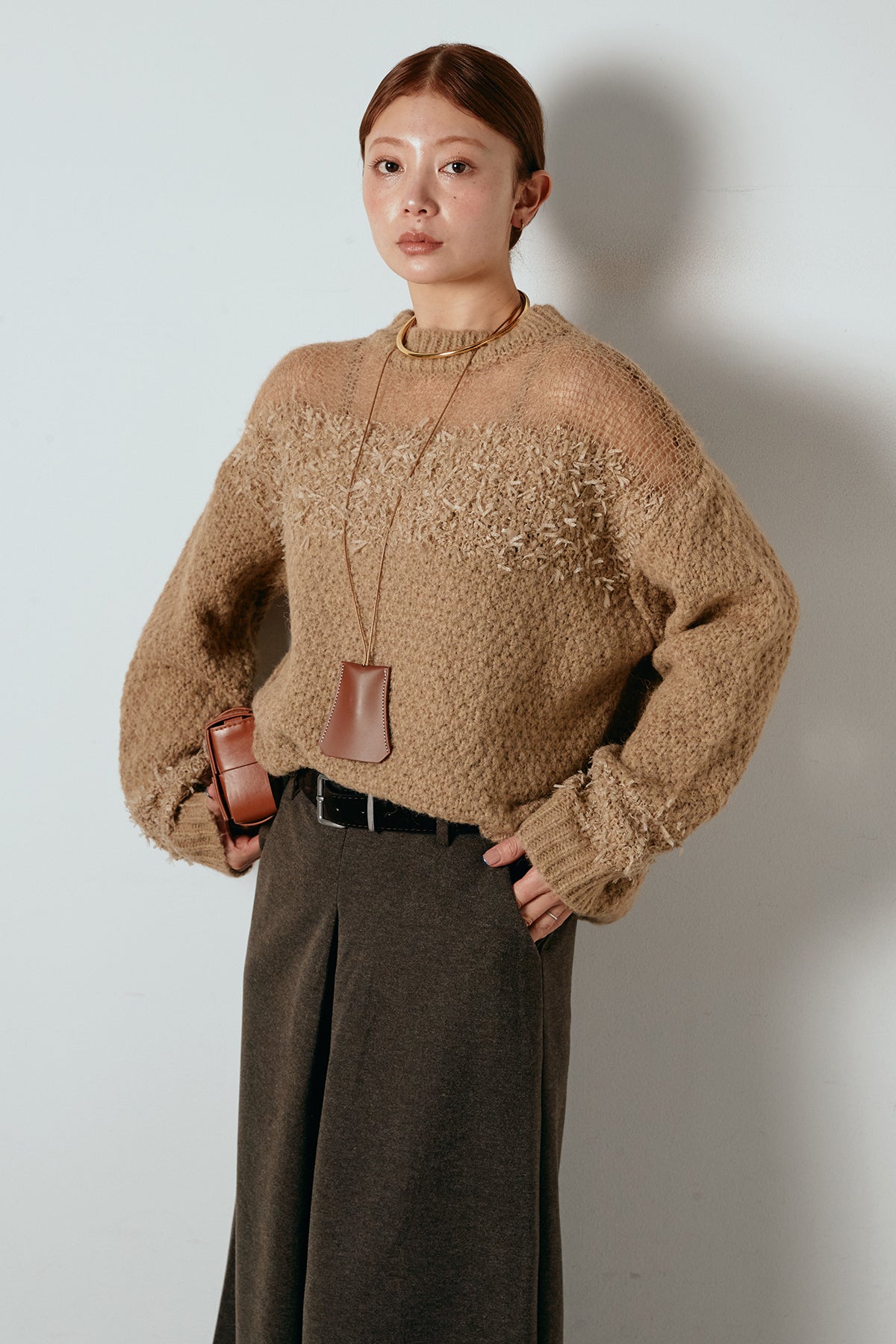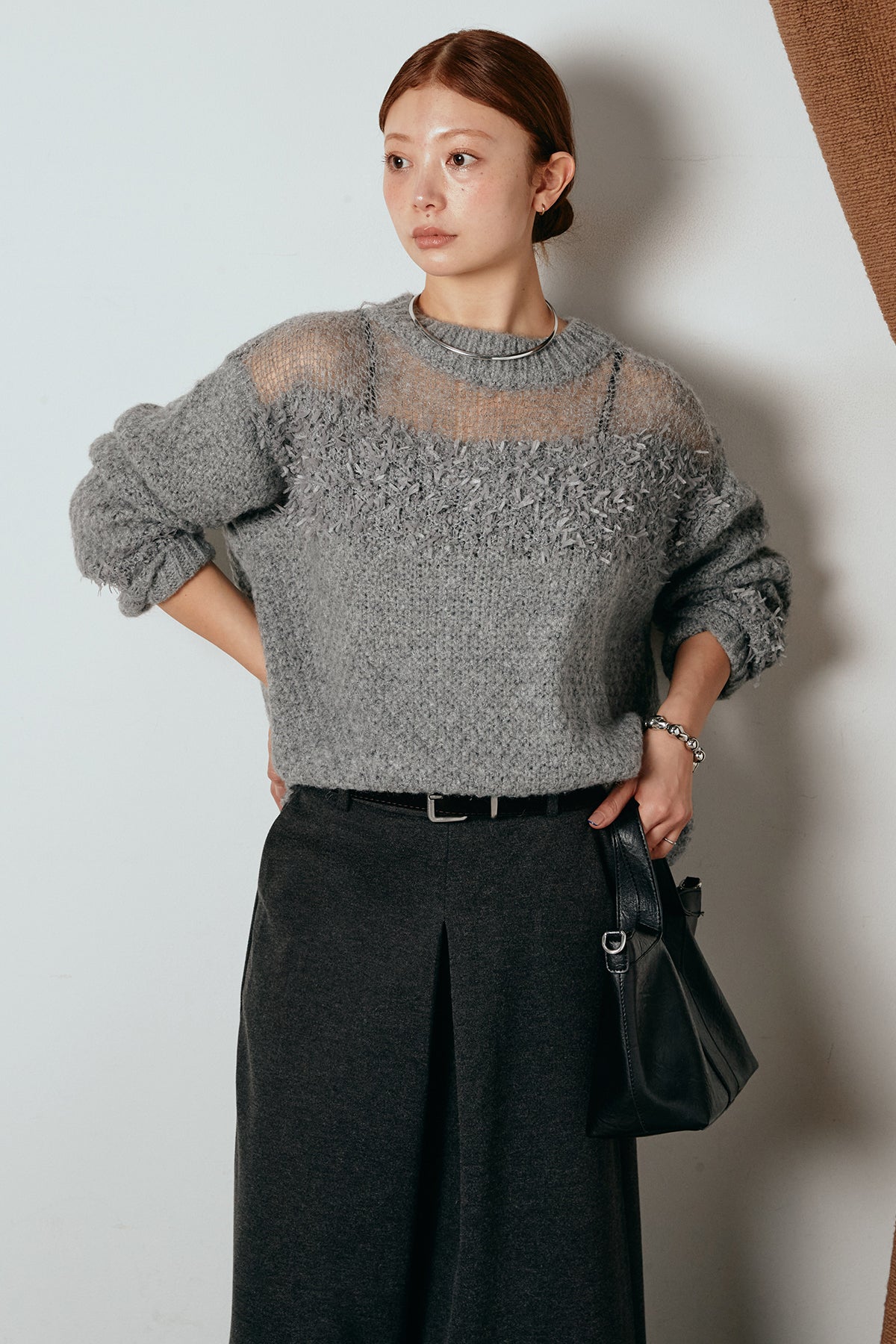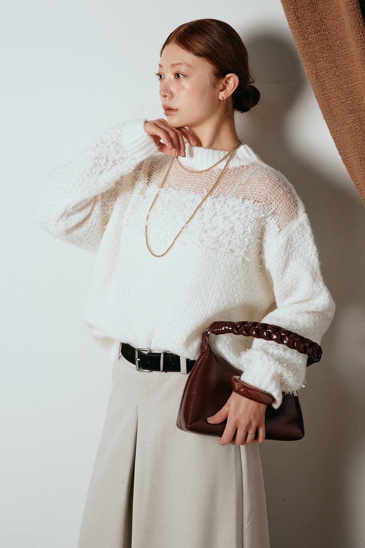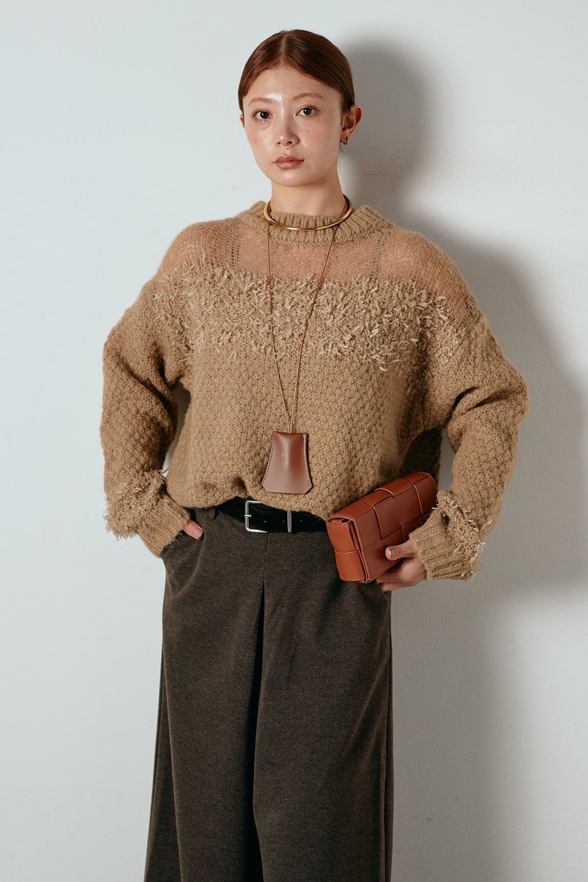ランダムな編地切り替えを合わせたニットトップス。肩から胸元にかけての透け感と、ふわっとした立体的な編み表情がアクセントになり、シンプルながら印象のあるバランスに。身頃はすっきりした編地でまとめているので、ゆったりしたフォルムでも重たく見えにくく、パンツやスカートなど幅広く合わせやすいアイテムです。