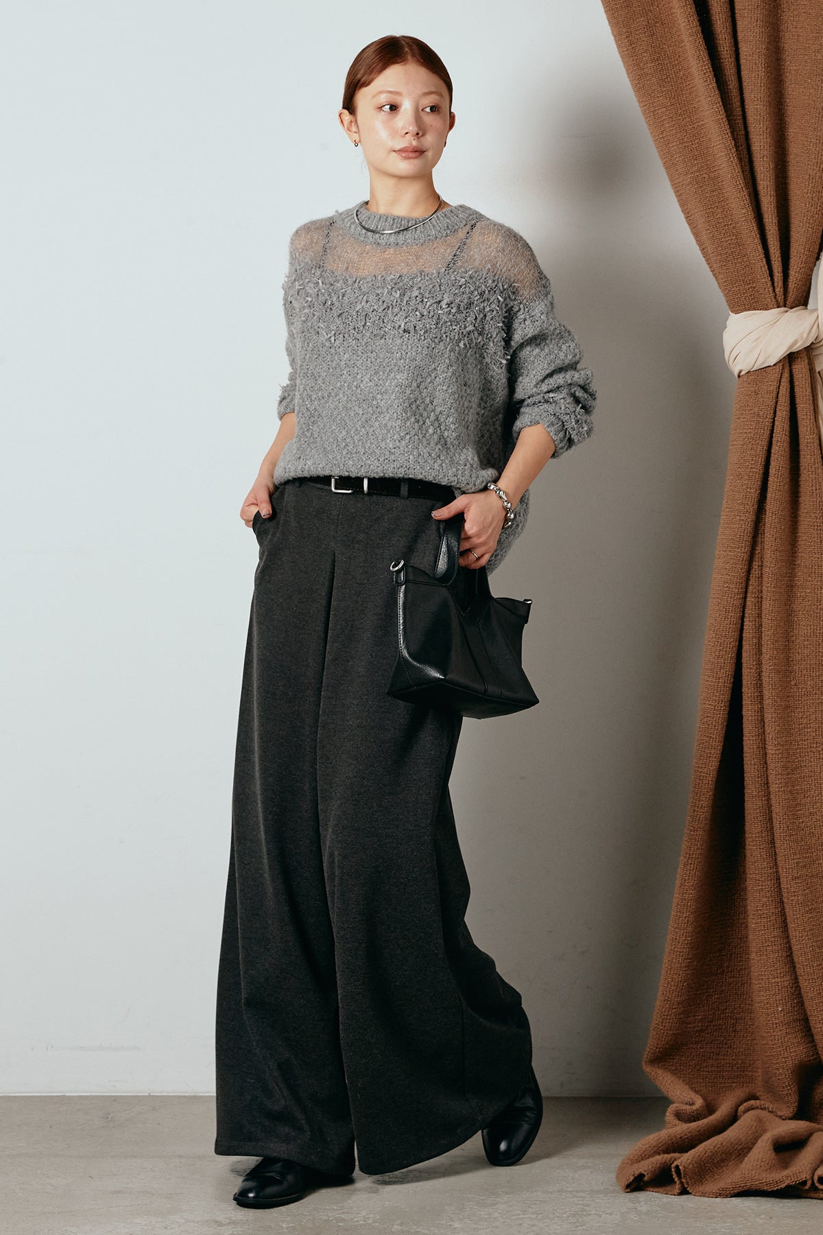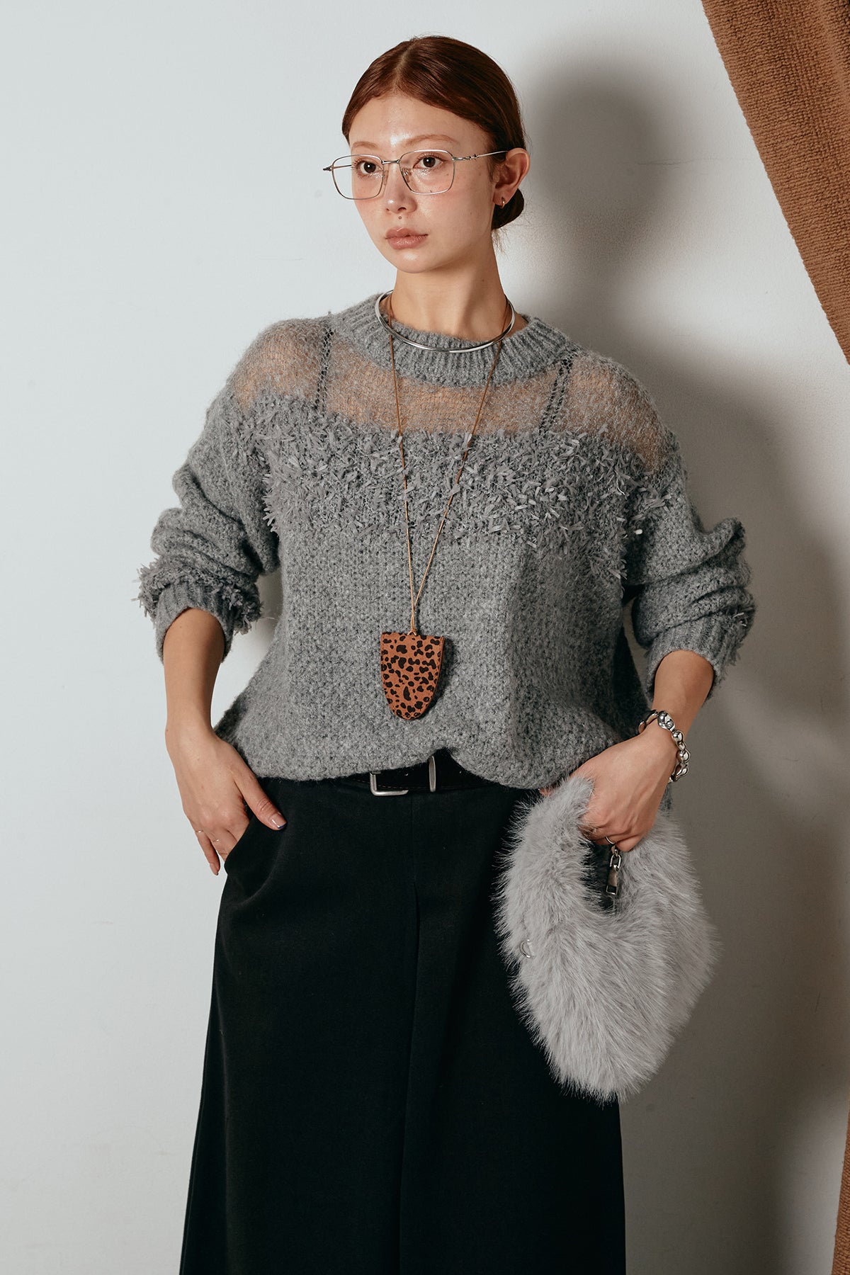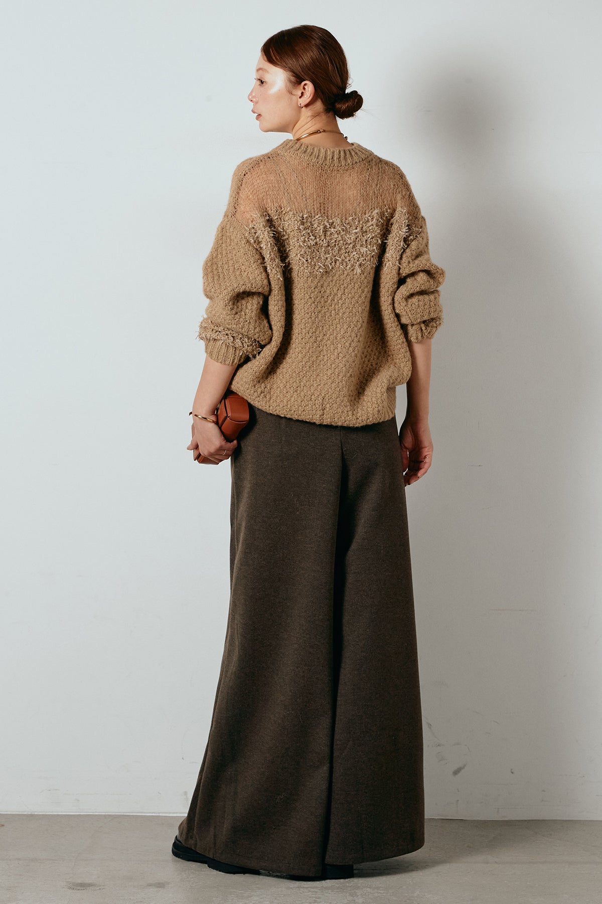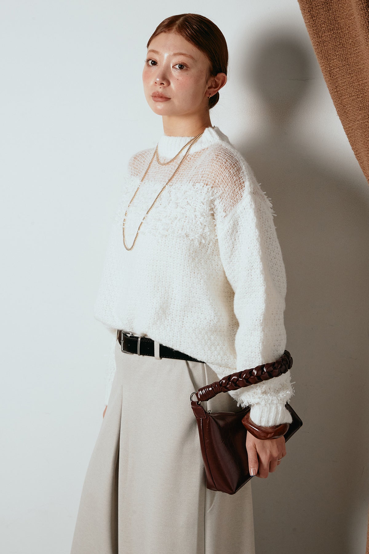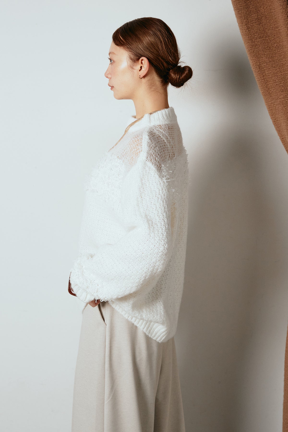 ランダムな編地切り替えを合わせたニットトップス。肩から胸元にかけての透け感と、ふわっとした立体的な編み表情がアクセントになり、シンプルながら印象のあるバランスに。身頃はすっきりした編地でまとめているので、ゆったりしたフォルムでも重たく見えにくく、パンツやスカートなど幅広く合わせやすいアイテムです。