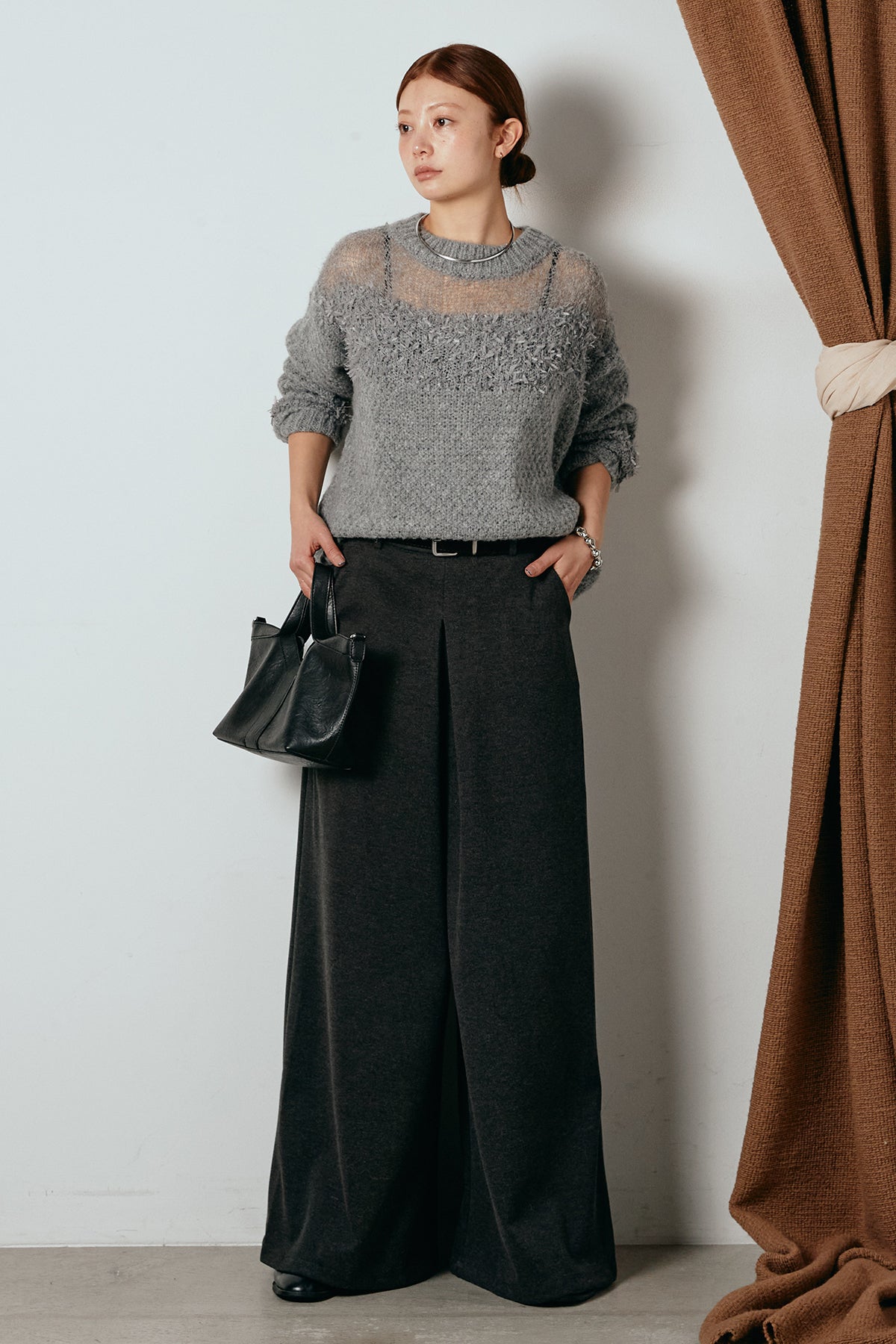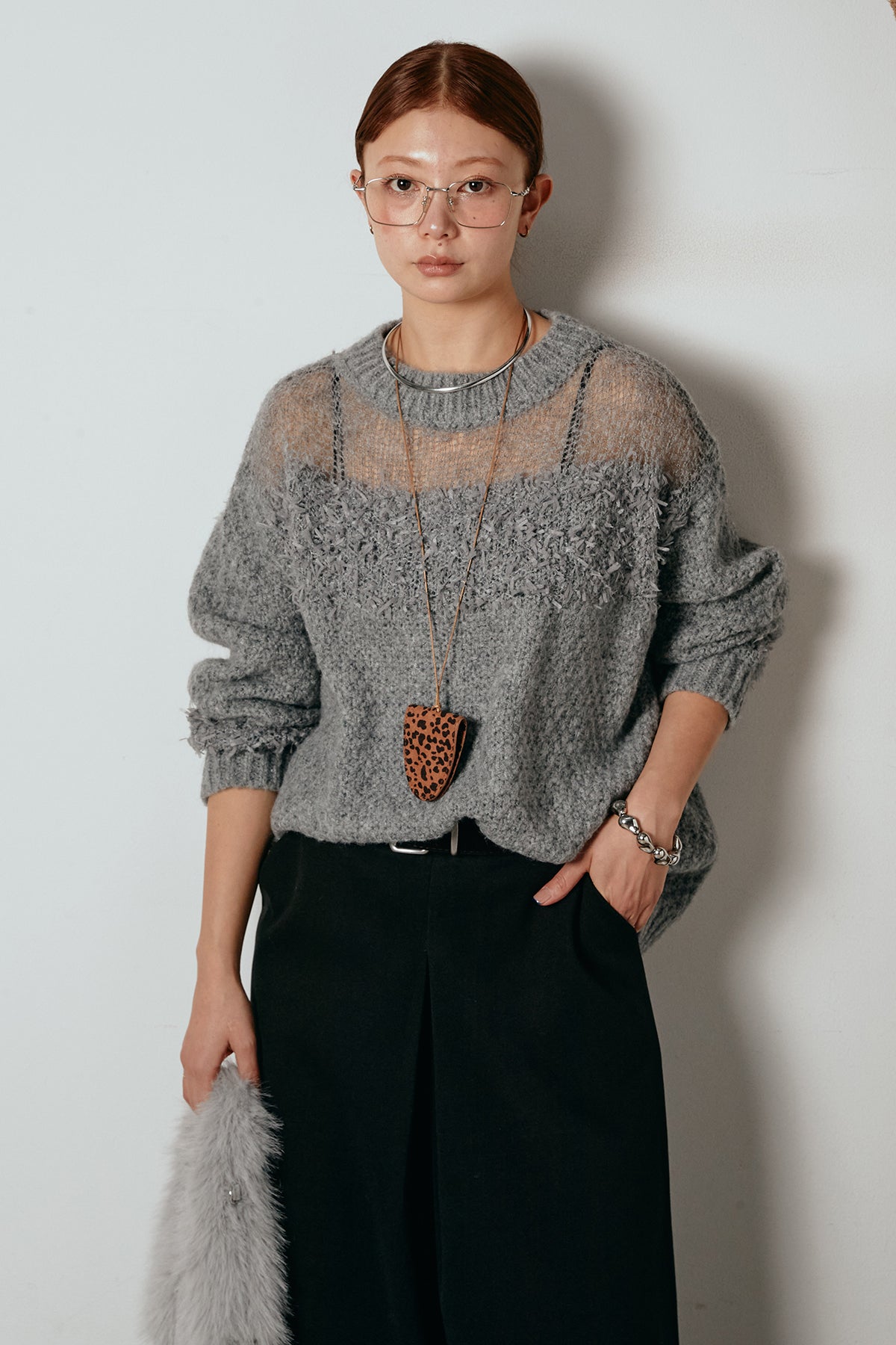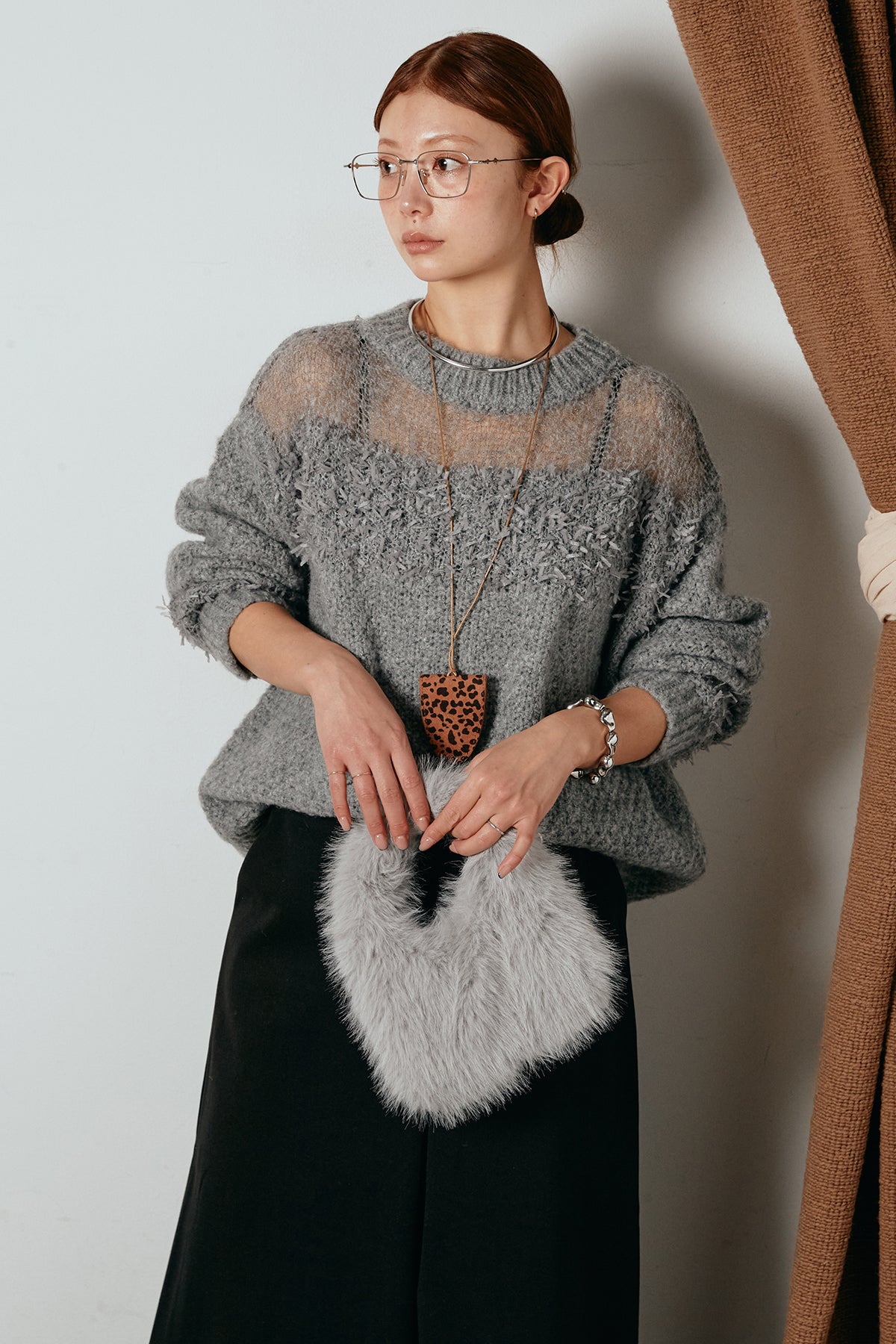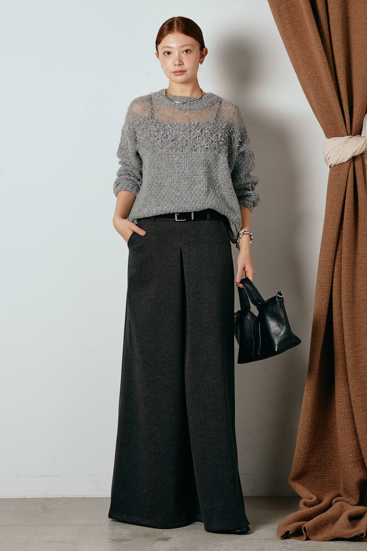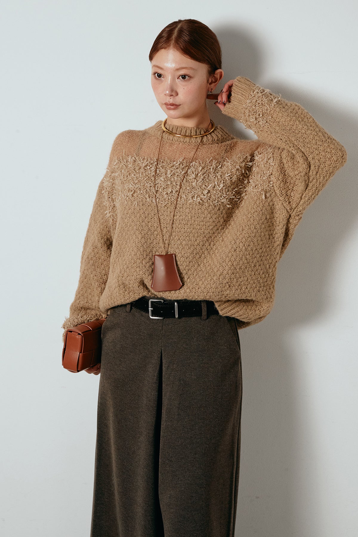 ランダムな編地切り替えを合わせたニットトップス。肩から胸元にかけての透け感と、ふわっとした立体的な編み表情がアクセントになり、シンプルながら印象のあるバランスに。身頃はすっきりした編地でまとめているので、ゆったりしたフォルムでも重たく見えにくく、パンツやスカートなど幅広く合わせやすいアイテムです。