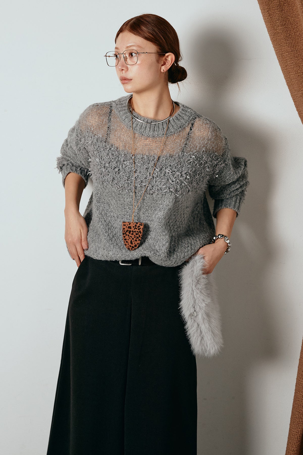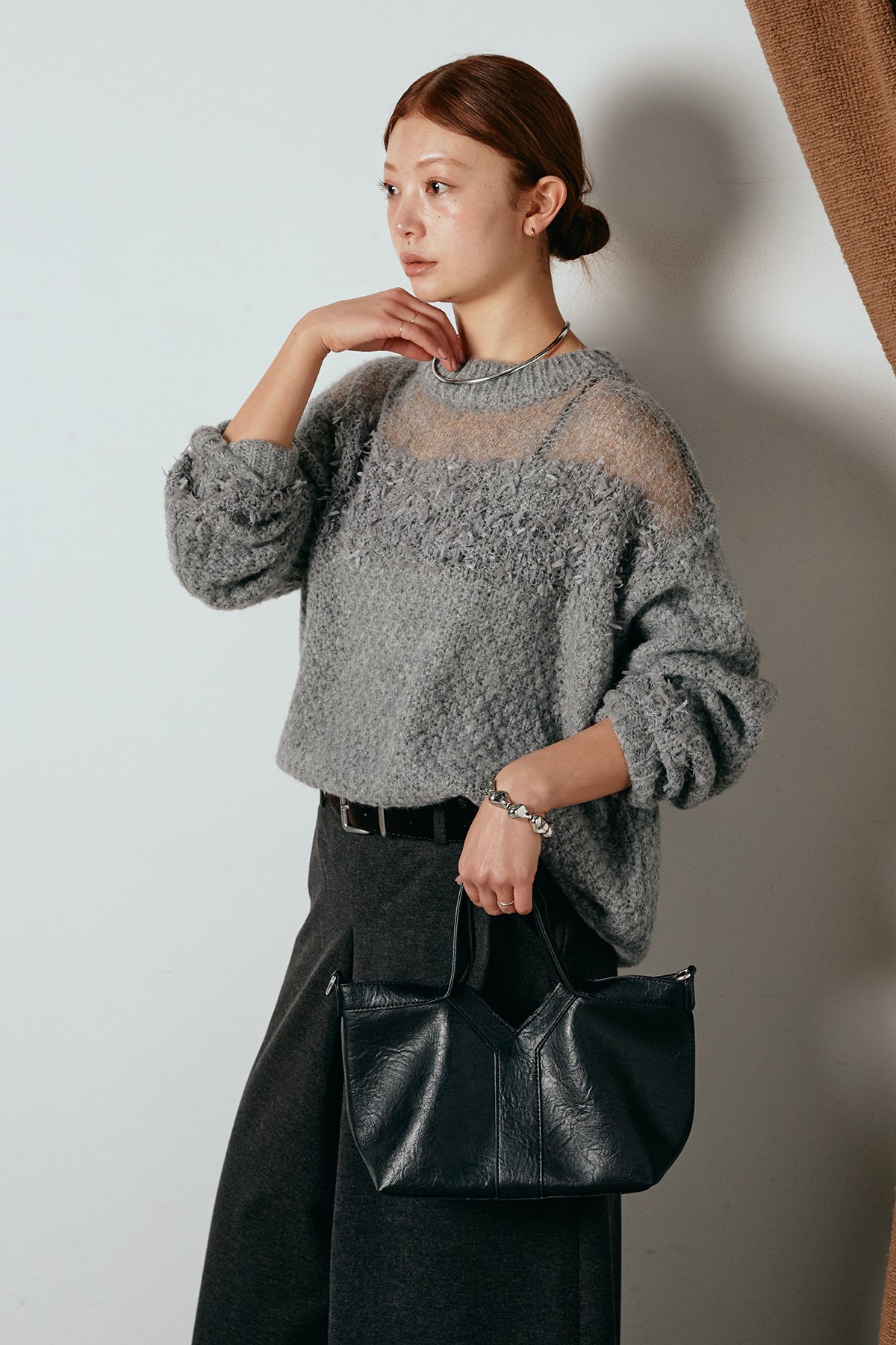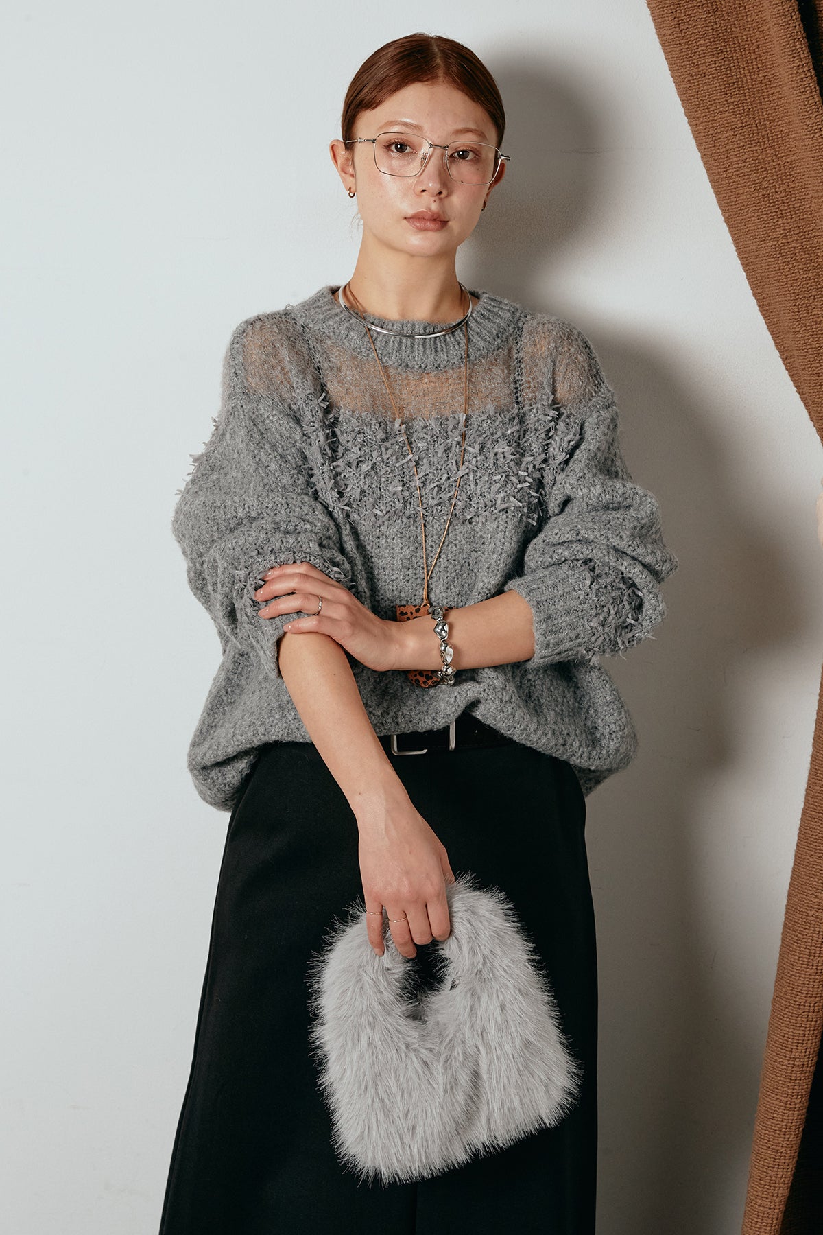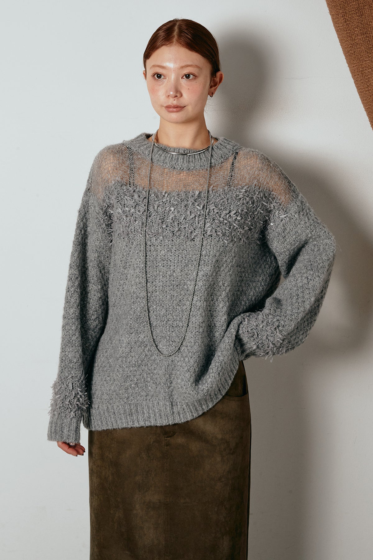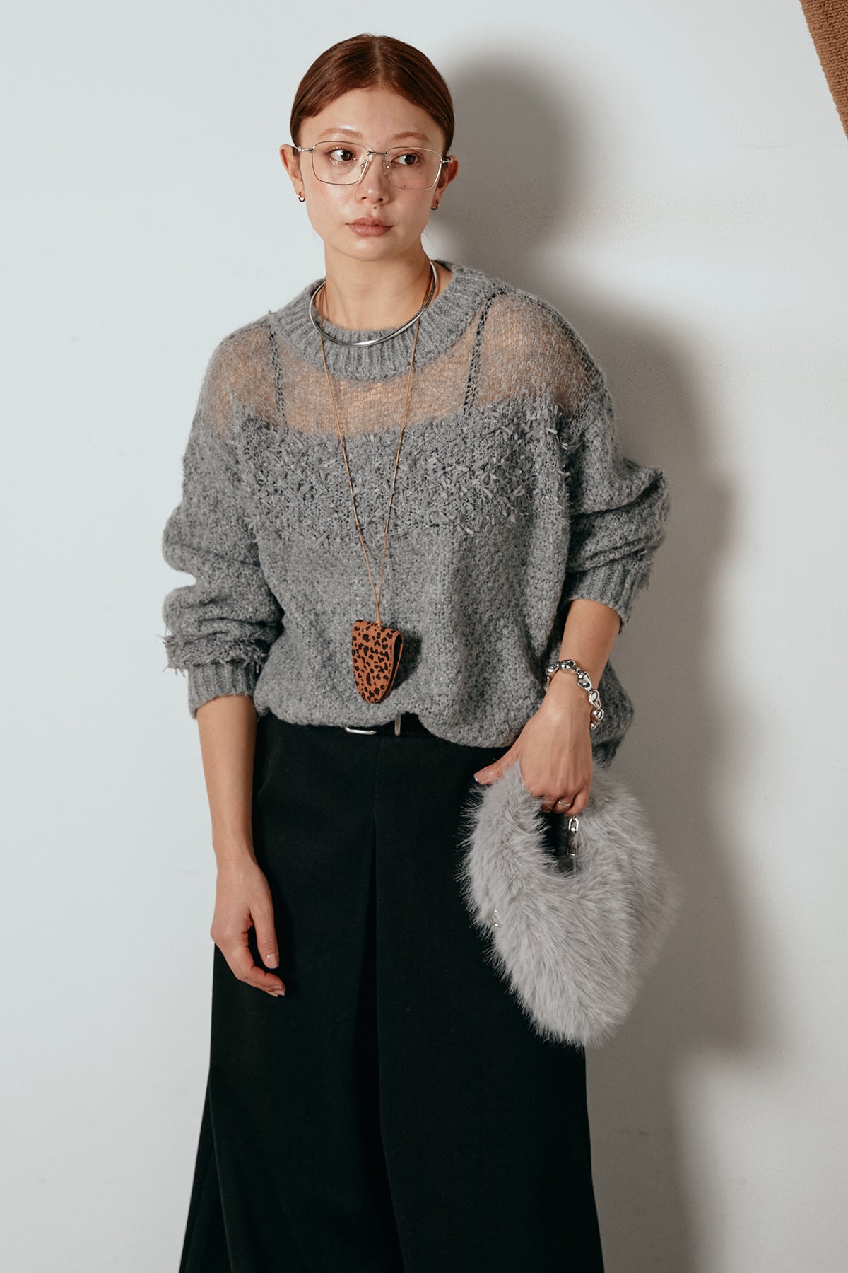 ランダムな編地切り替えを合わせたニットトップス。肩から胸元にかけての透け感と、ふわっとした立体的な編み表情がアクセントになり、シンプルながら印象のあるバランスに。身頃はすっきりした編地でまとめているので、ゆったりしたフォルムでも重たく見えにくく、パンツやスカートなど幅広く合わせやすいアイテムです。