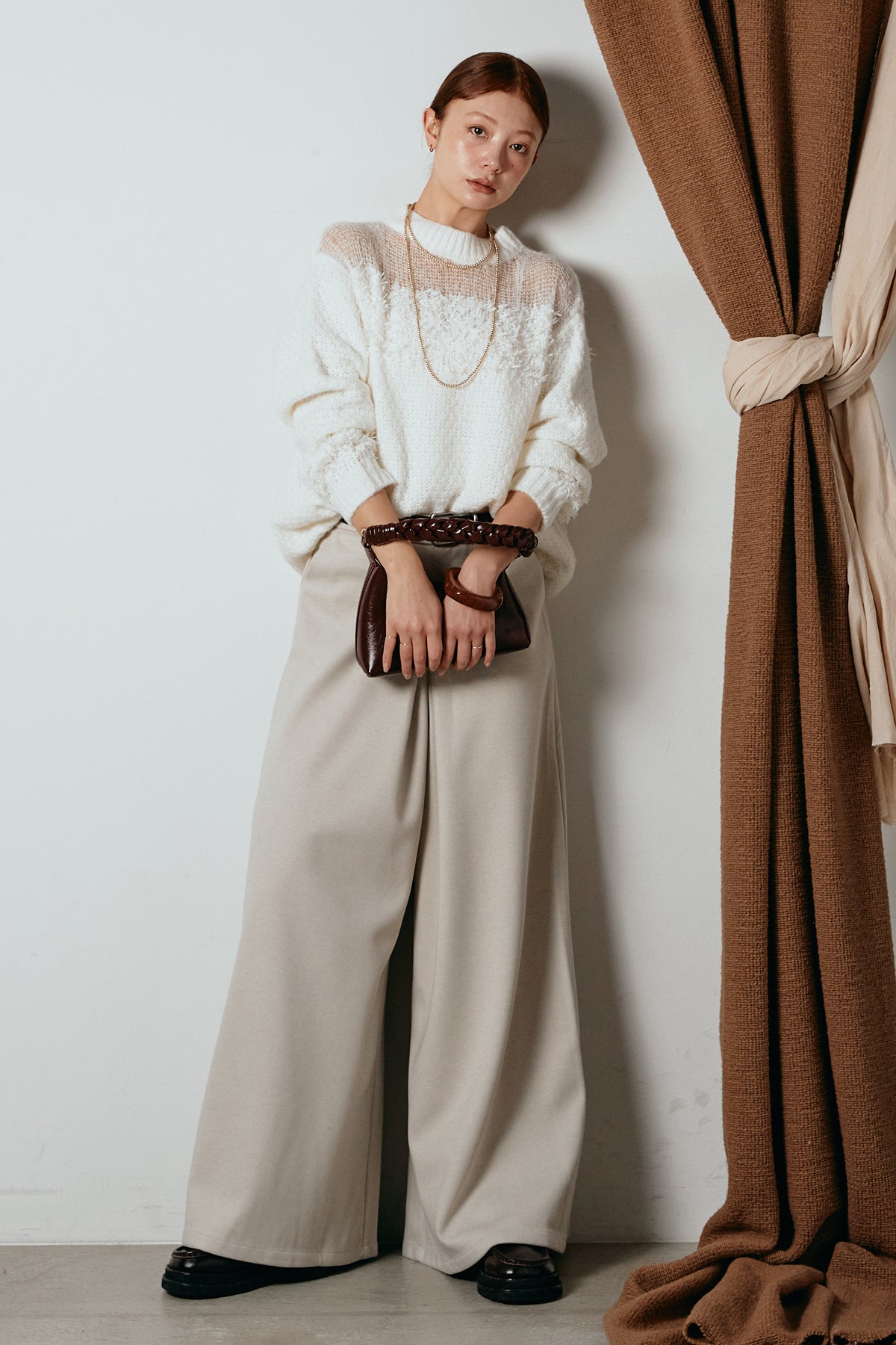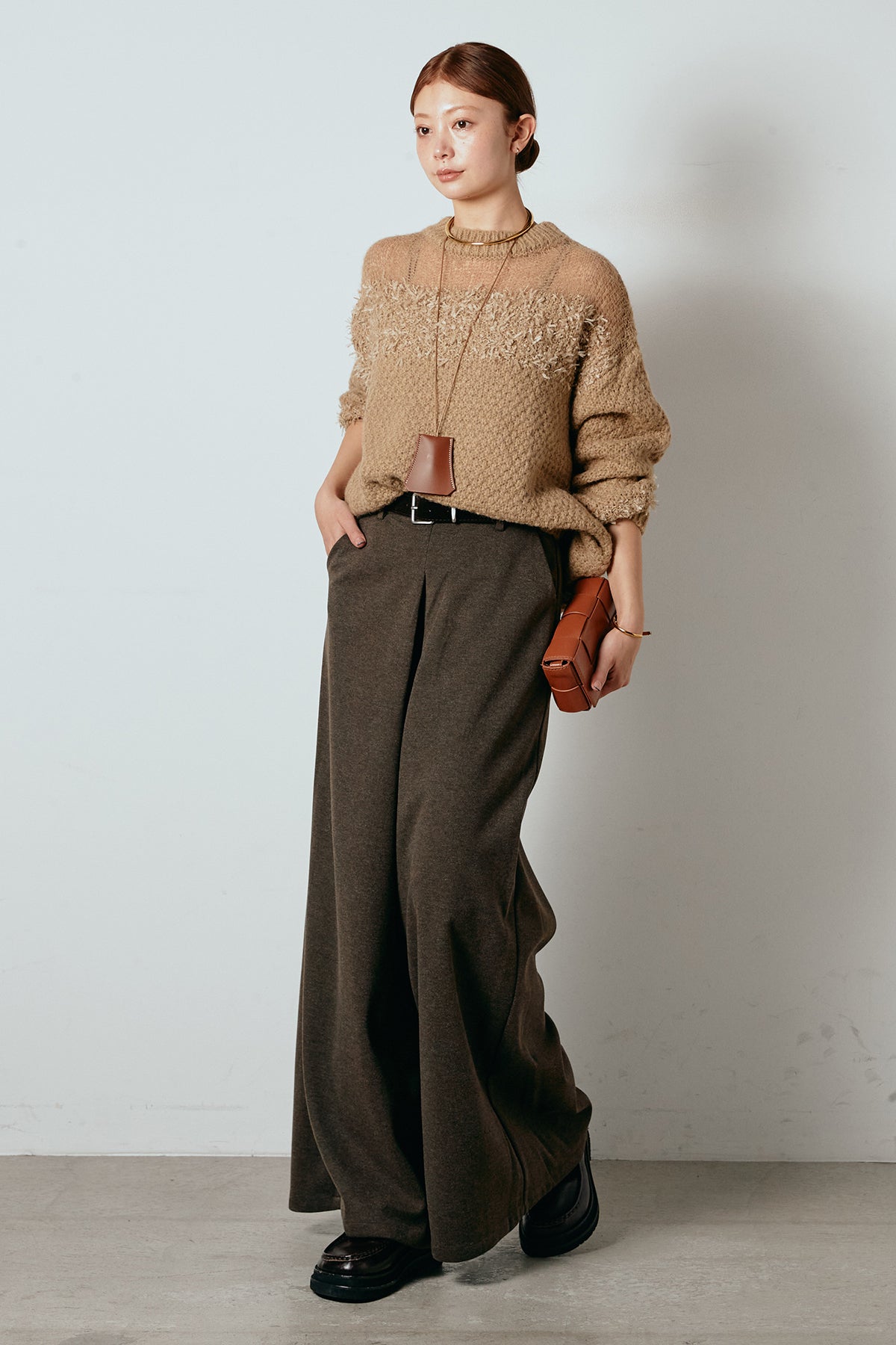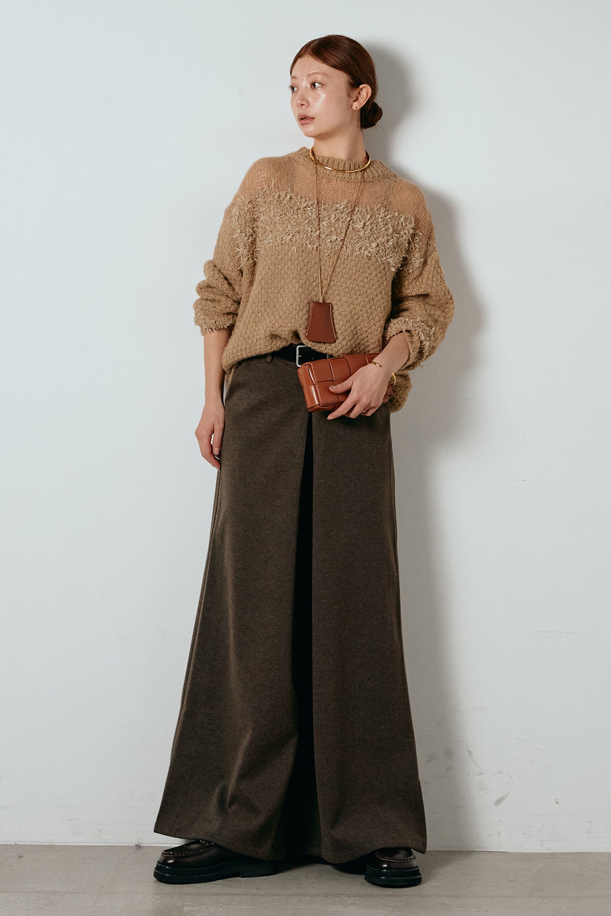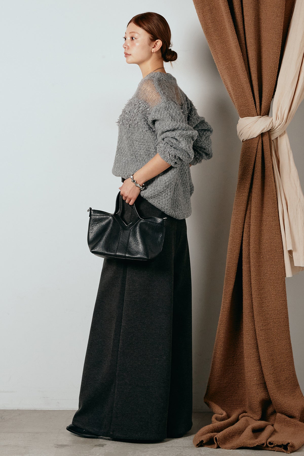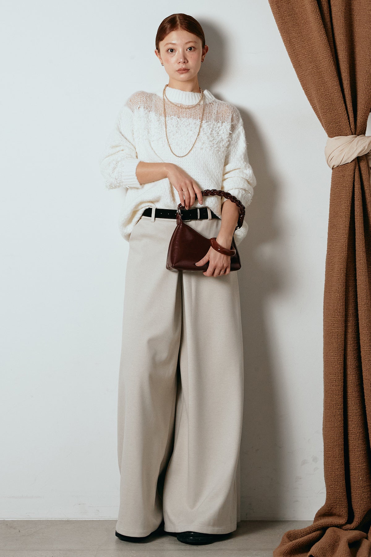 ランダムな編地切り替えを合わせたニットトップス。肩から胸元にかけての透け感と、ふわっとした立体的な編み表情がアクセントになり、シンプルながら印象のあるバランスに。身頃はすっきりした編地でまとめているので、ゆったりしたフォルムでも重たく見えにくく、パンツやスカートなど幅広く合わせやすいアイテムです。