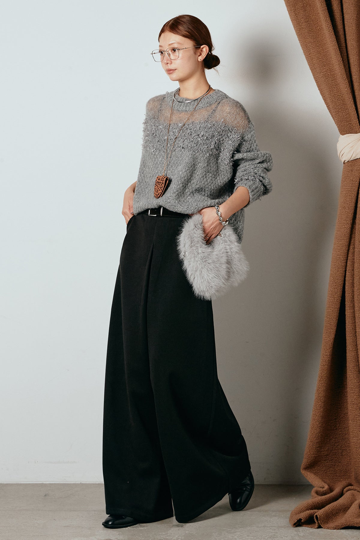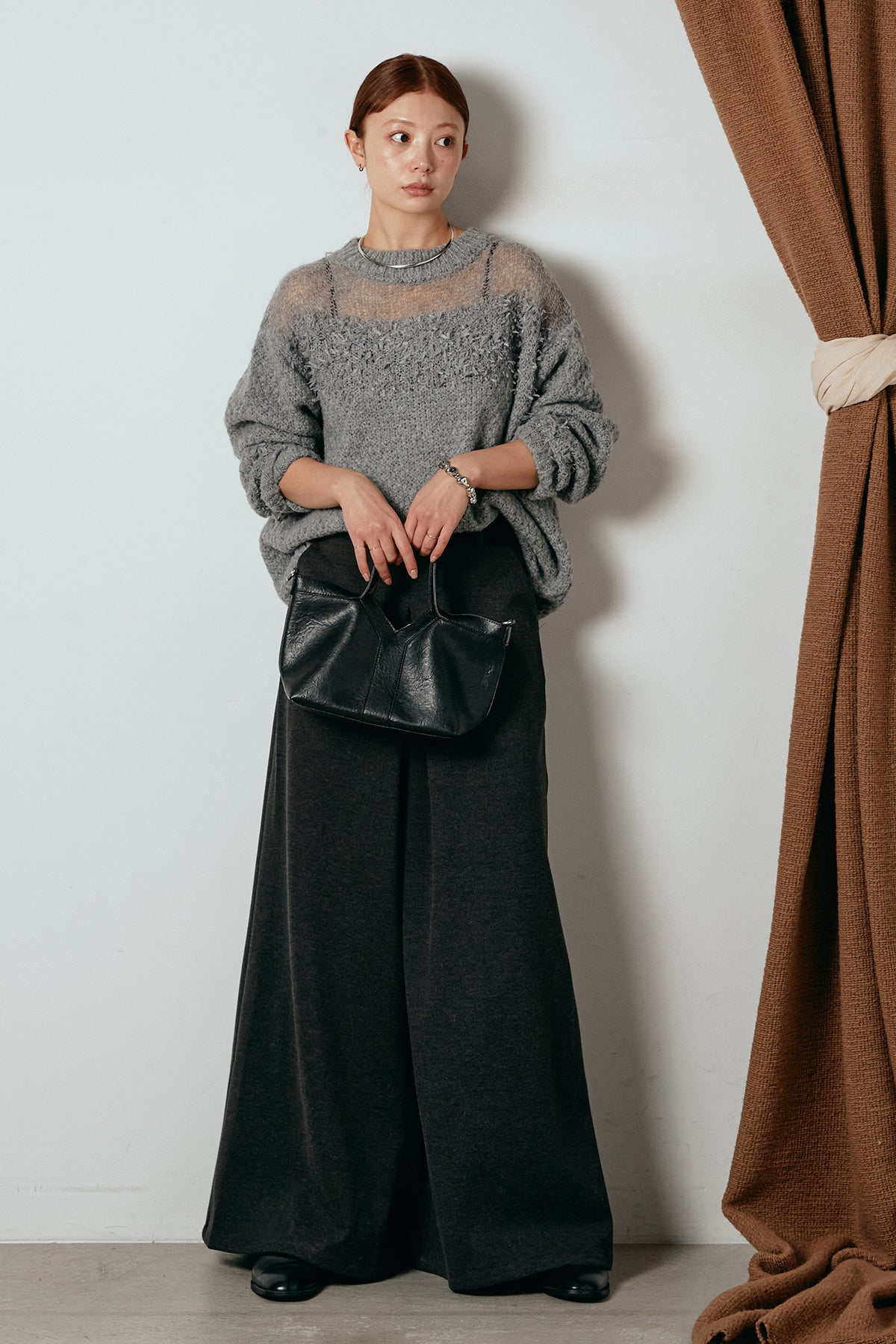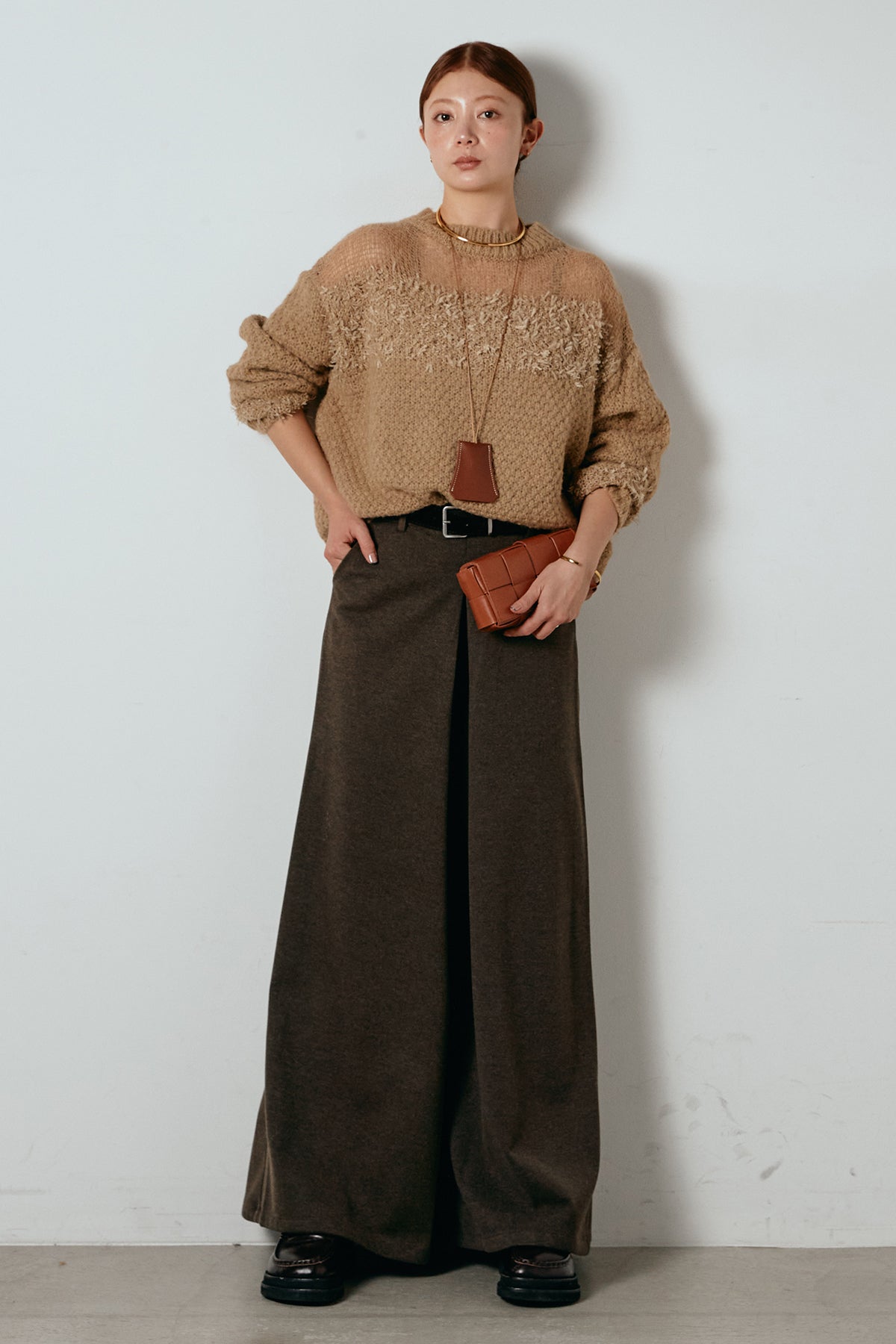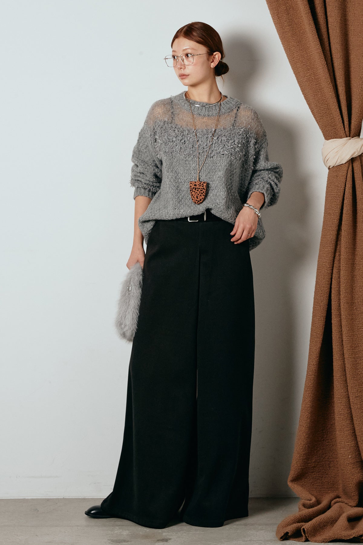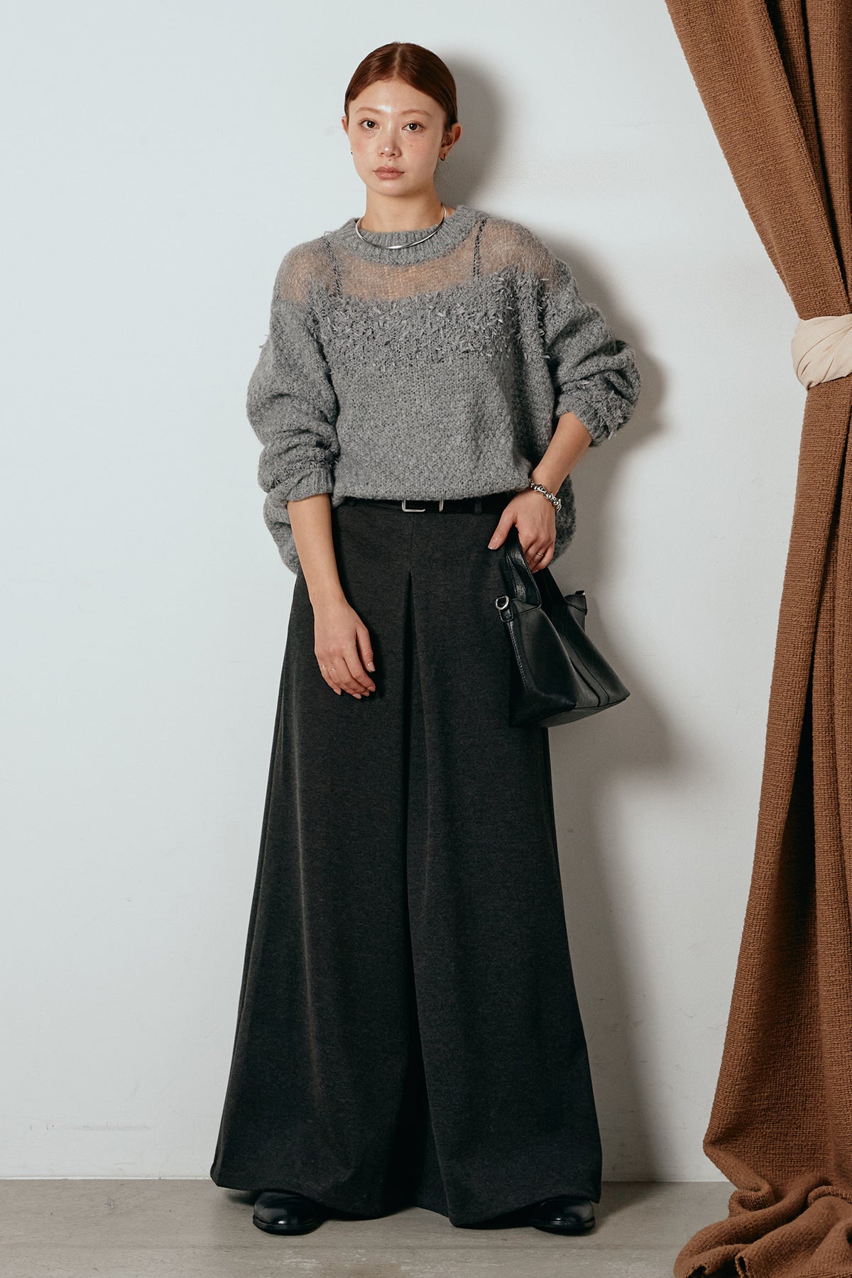 ランダムな編地切り替えを合わせたニットトップス。肩から胸元にかけての透け感と、ふわっとした立体的な編み表情がアクセントになり、シンプルながら印象のあるバランスに。身頃はすっきりした編地でまとめているので、ゆったりしたフォルムでも重たく見えにくく、パンツやスカートなど幅広く合わせやすいアイテムです。