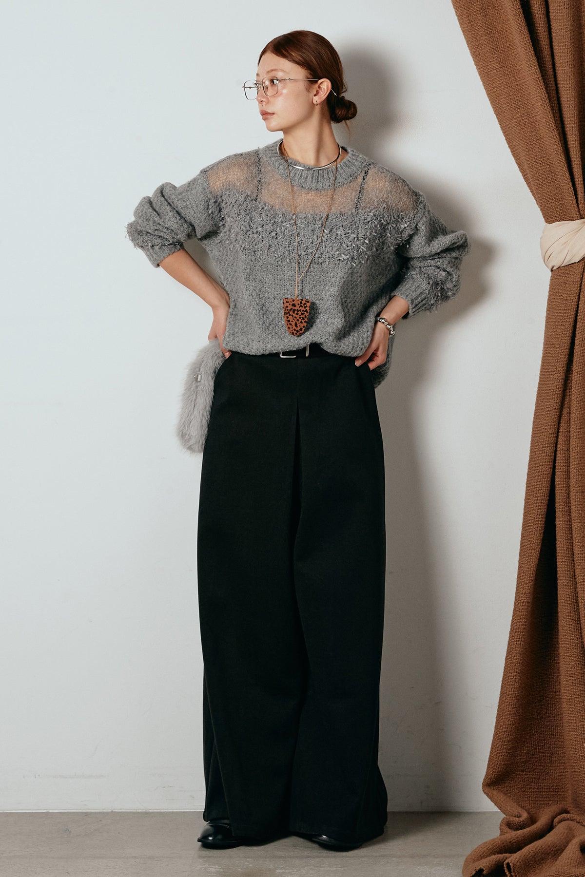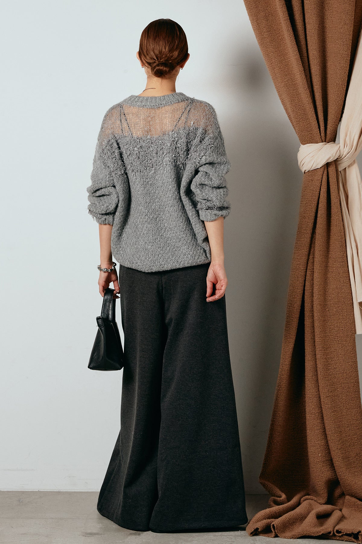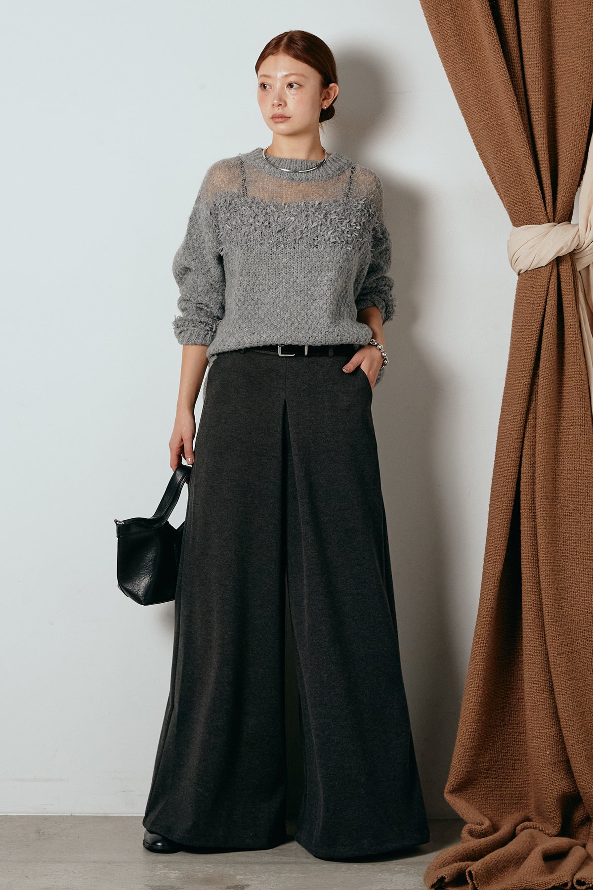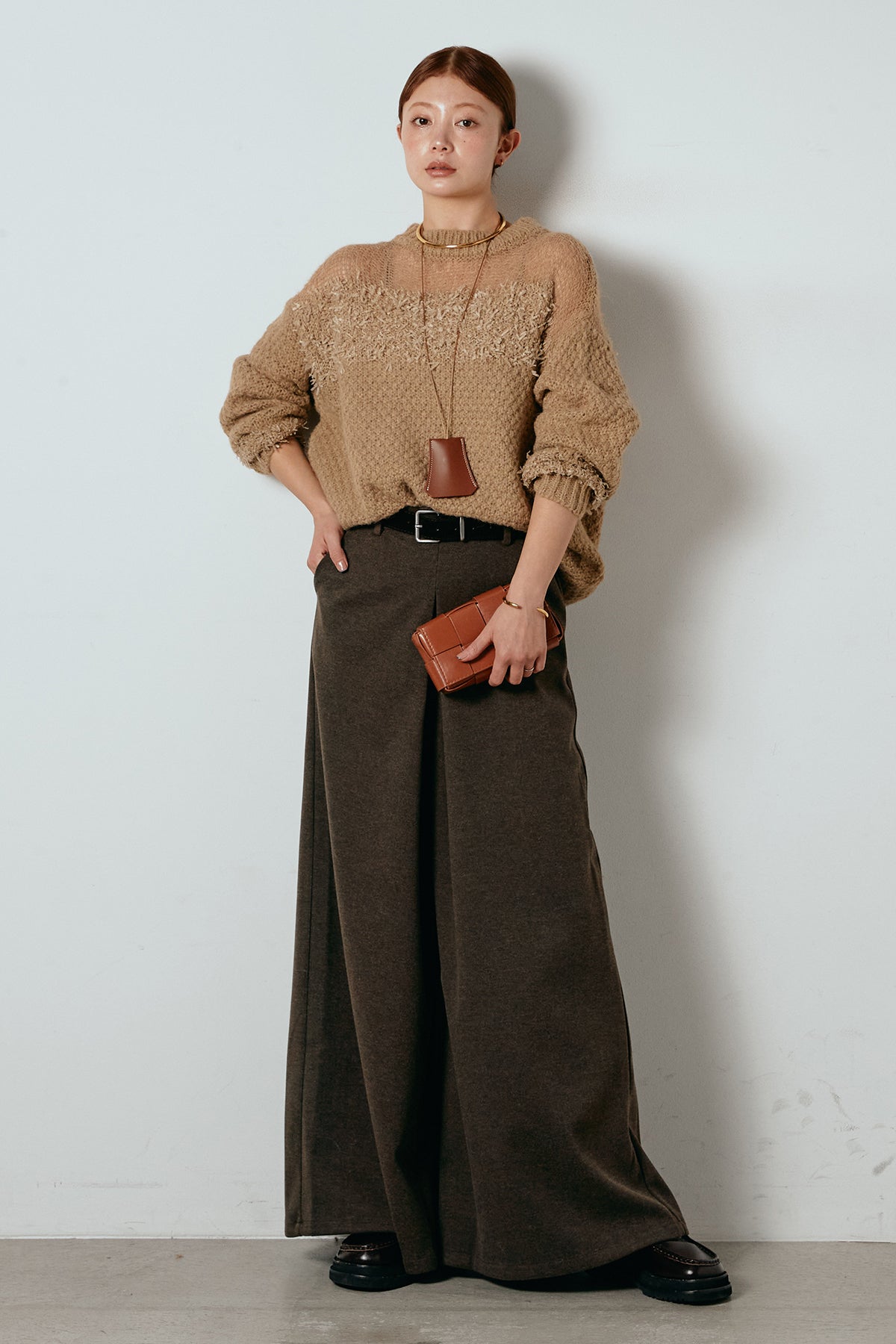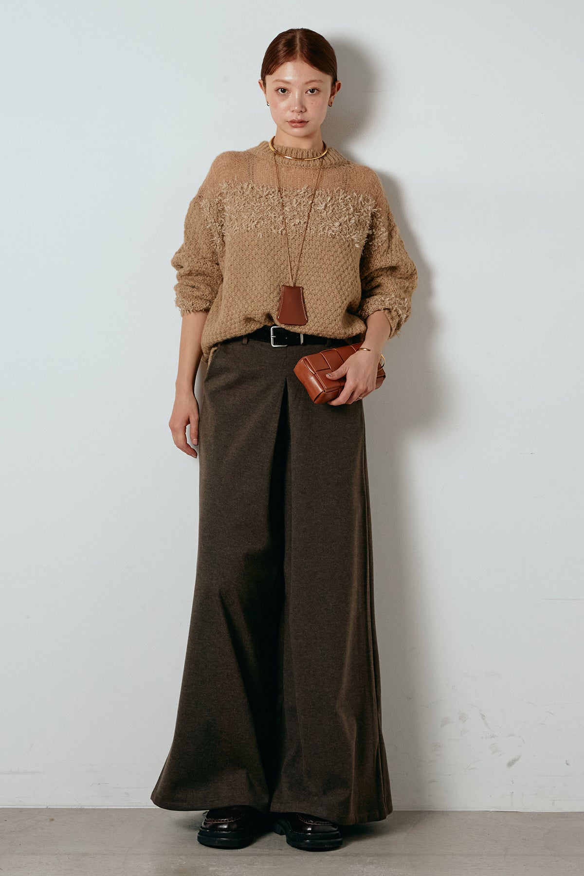 ランダムな編地切り替えを合わせたニットトップス。肩から胸元にかけての透け感と、ふわっとした立体的な編み表情がアクセントになり、シンプルながら印象のあるバランスに。身頃はすっきりした編地でまとめているので、ゆったりしたフォルムでも重たく見えにくく、パンツやスカートなど幅広く合わせやすいアイテムです。