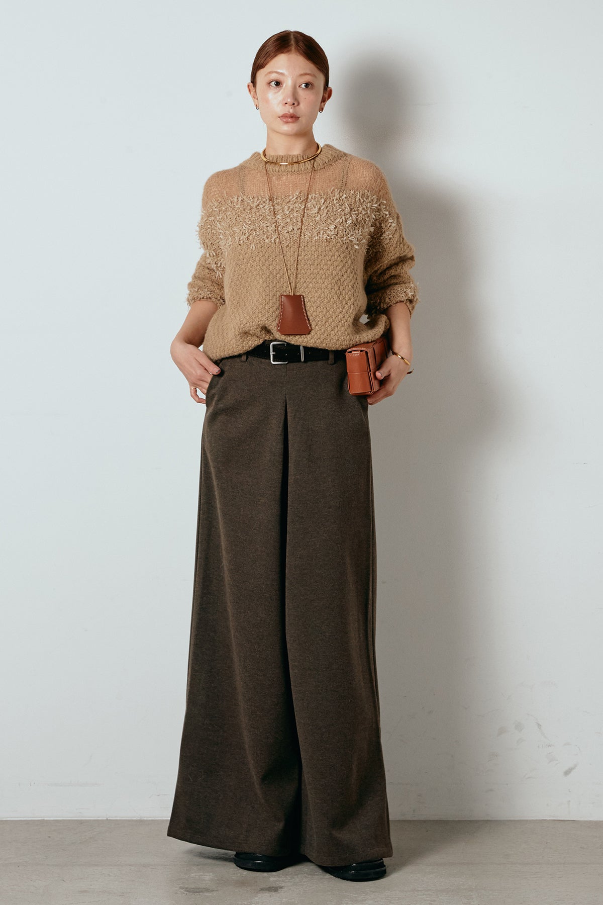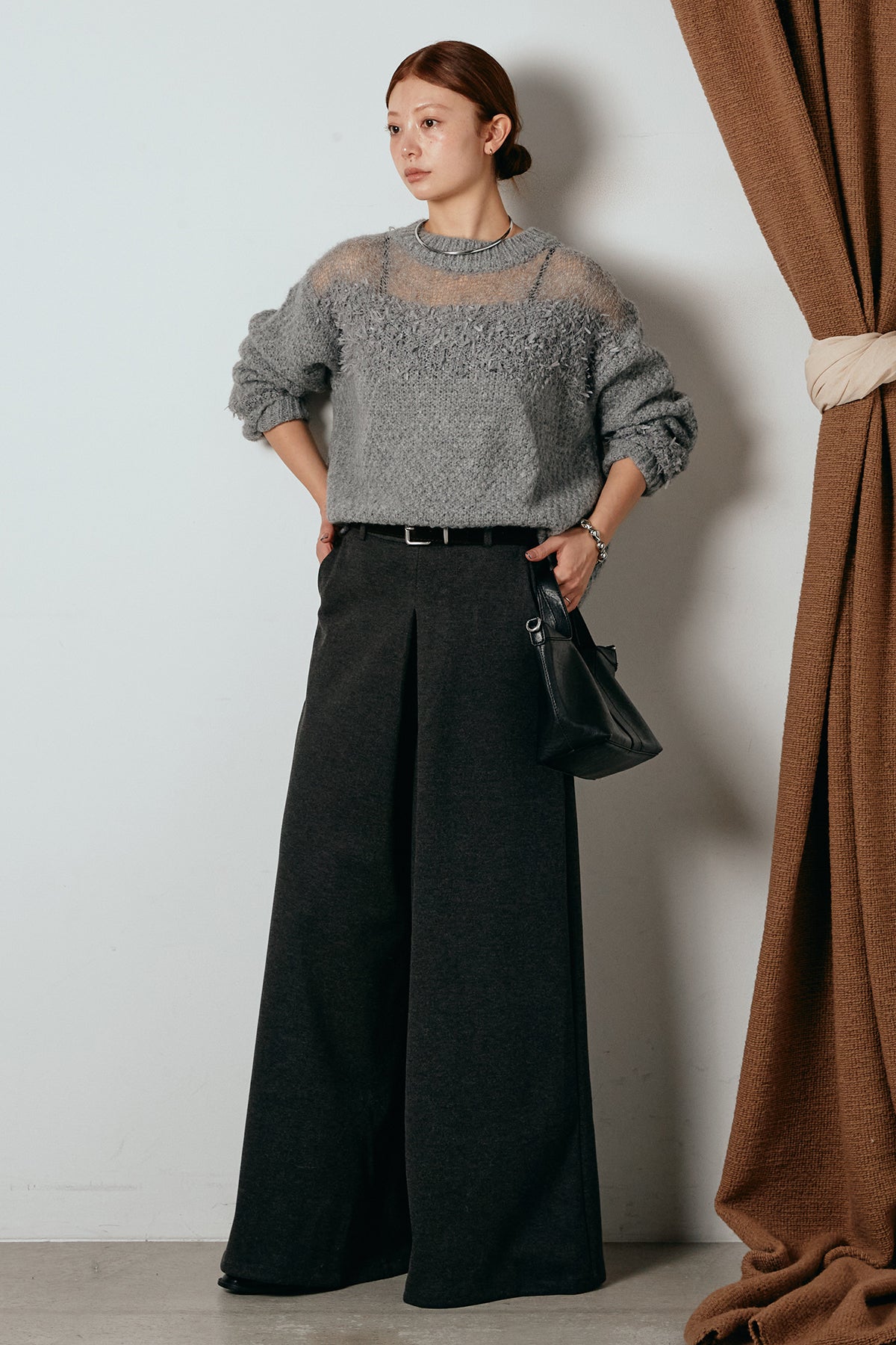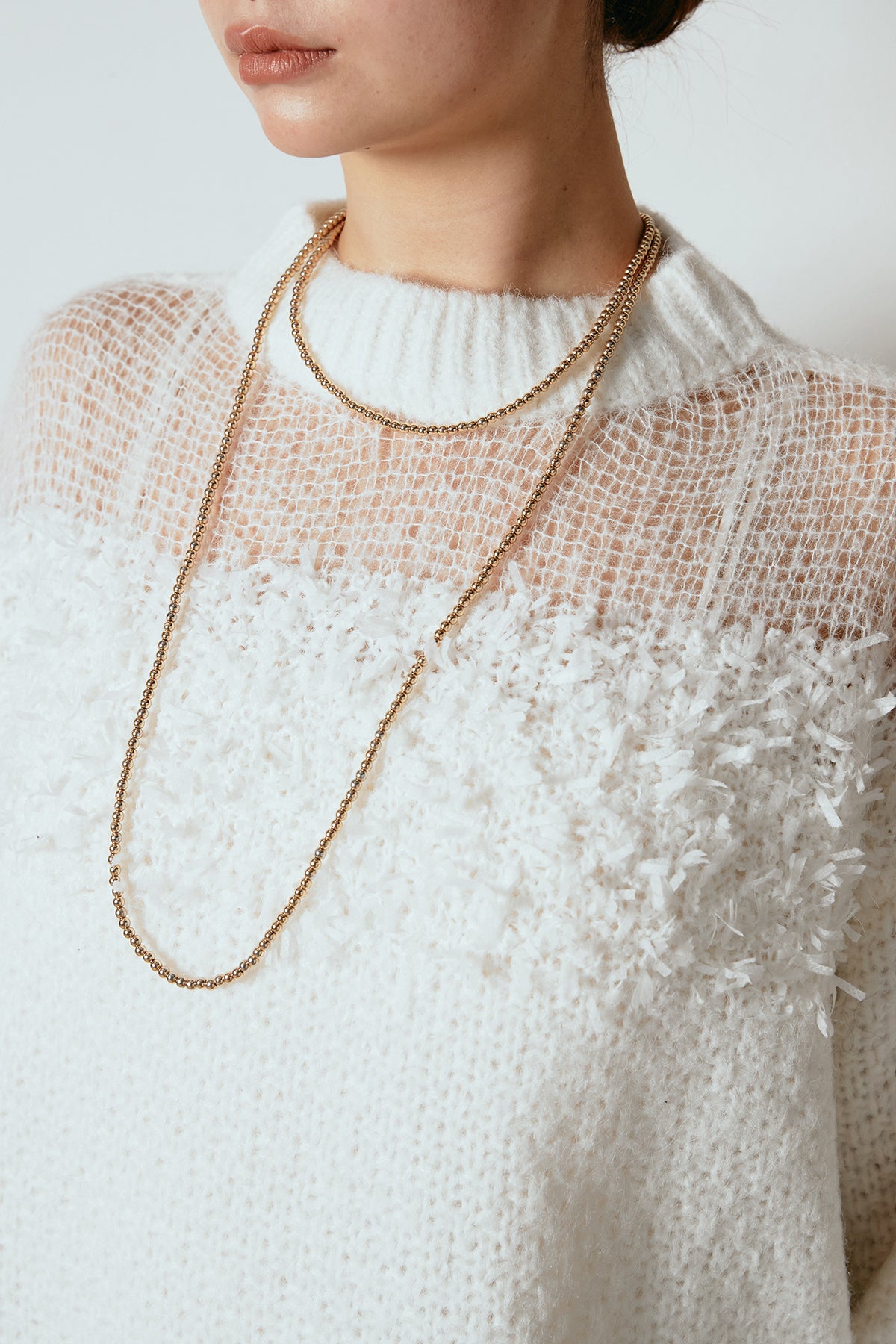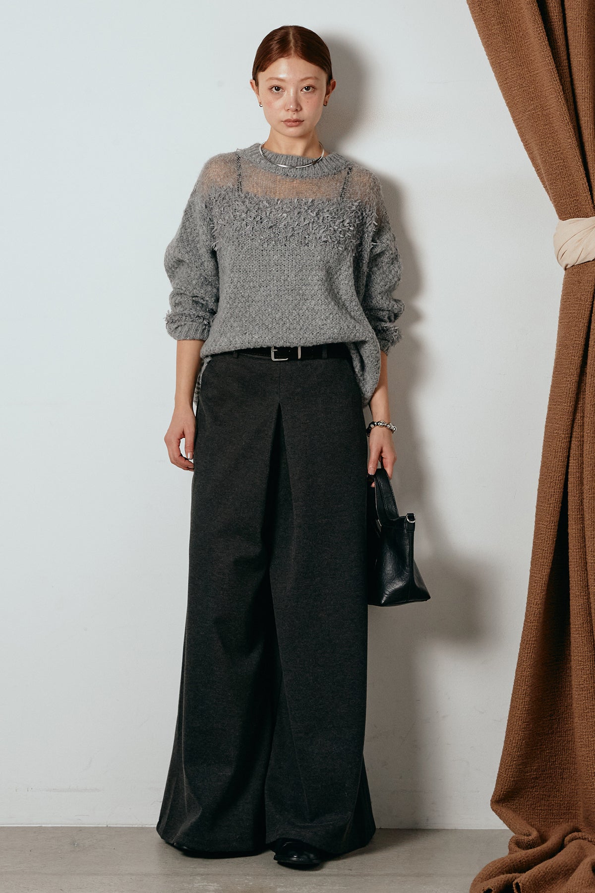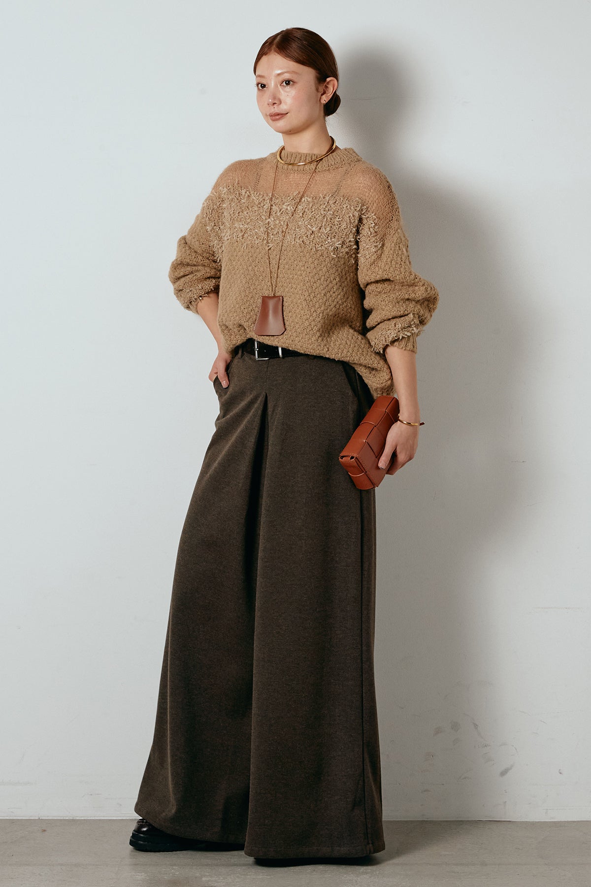 ランダムな編地切り替えを合わせたニットトップス。肩から胸元にかけての透け感と、ふわっとした立体的な編み表情がアクセントになり、シンプルながら印象のあるバランスに。身頃はすっきりした編地でまとめているので、ゆったりしたフォルムでも重たく見えにくく、パンツやスカートなど幅広く合わせやすいアイテムです。