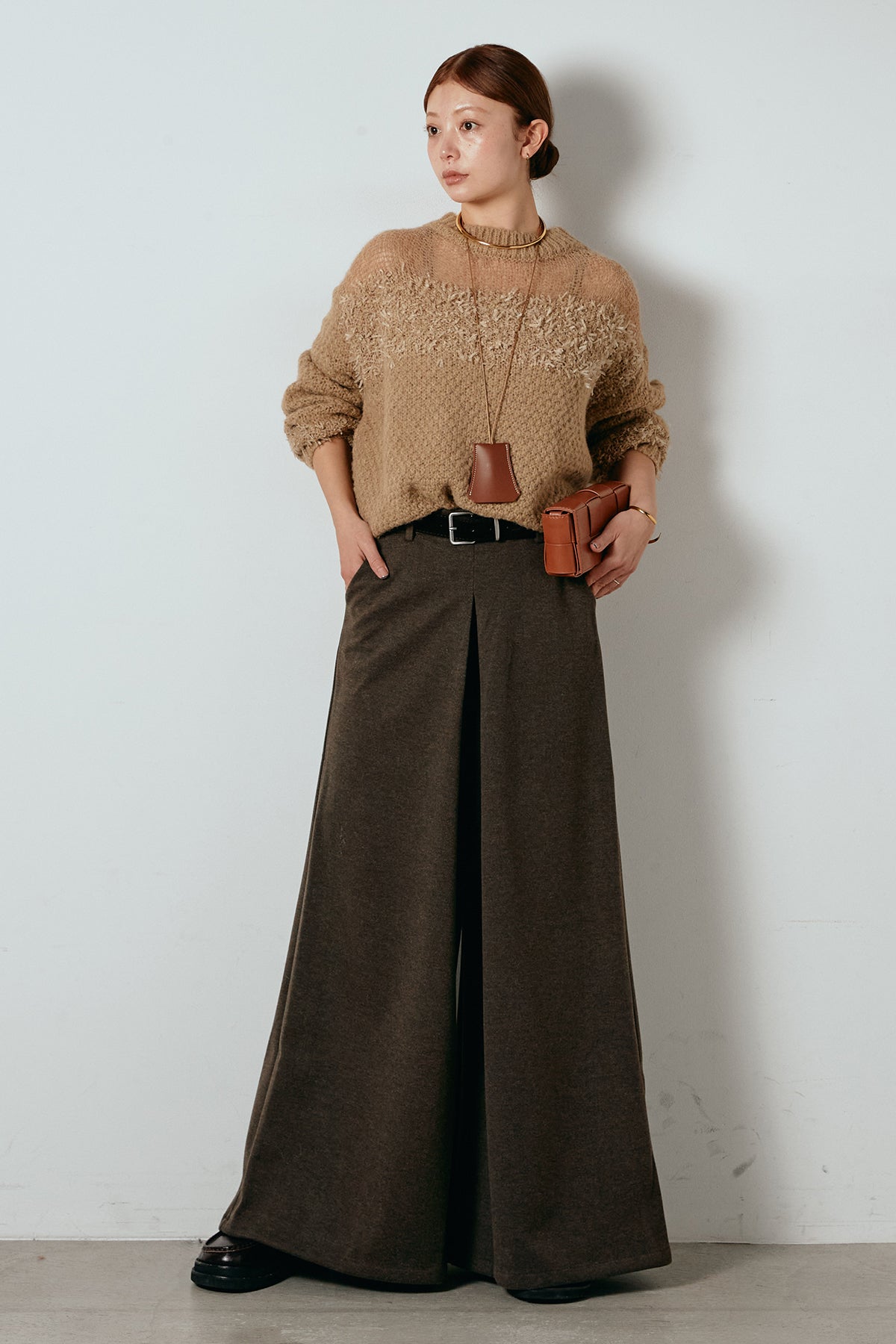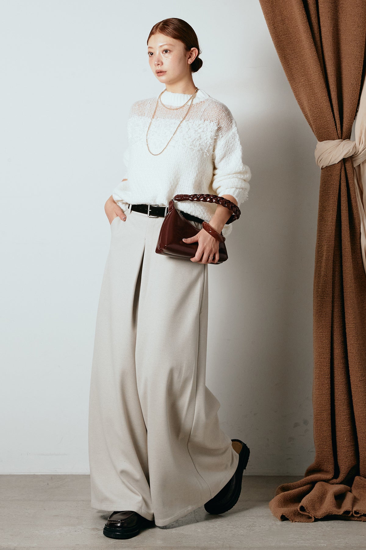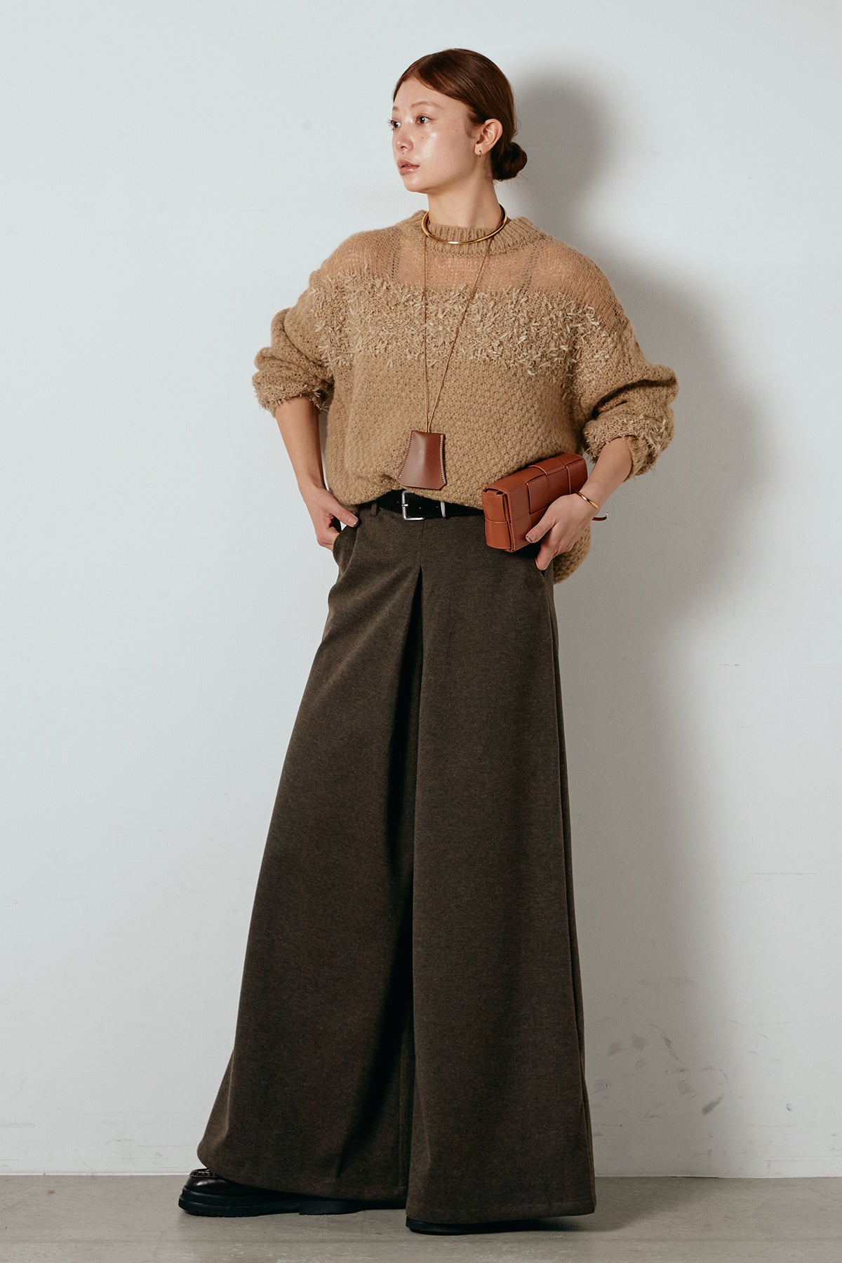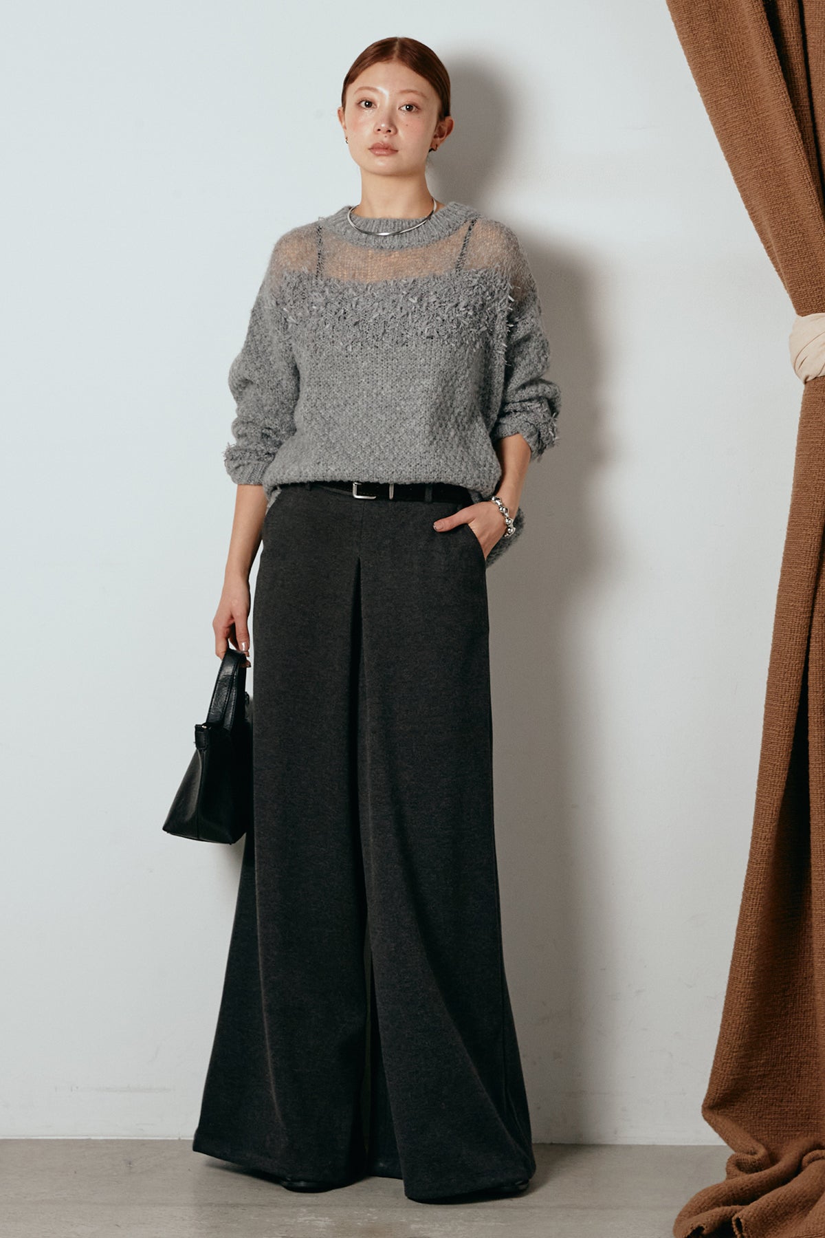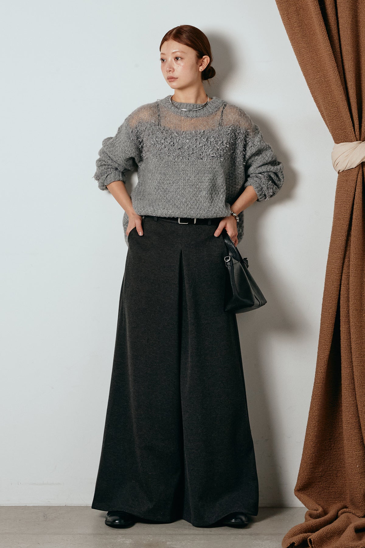 ランダムな編地切り替えを合わせたニットトップス。肩から胸元にかけての透け感と、ふわっとした立体的な編み表情がアクセントになり、シンプルながら印象のあるバランスに。身頃はすっきりした編地でまとめているので、ゆったりしたフォルムでも重たく見えにくく、パンツやスカートなど幅広く合わせやすいアイテムです。