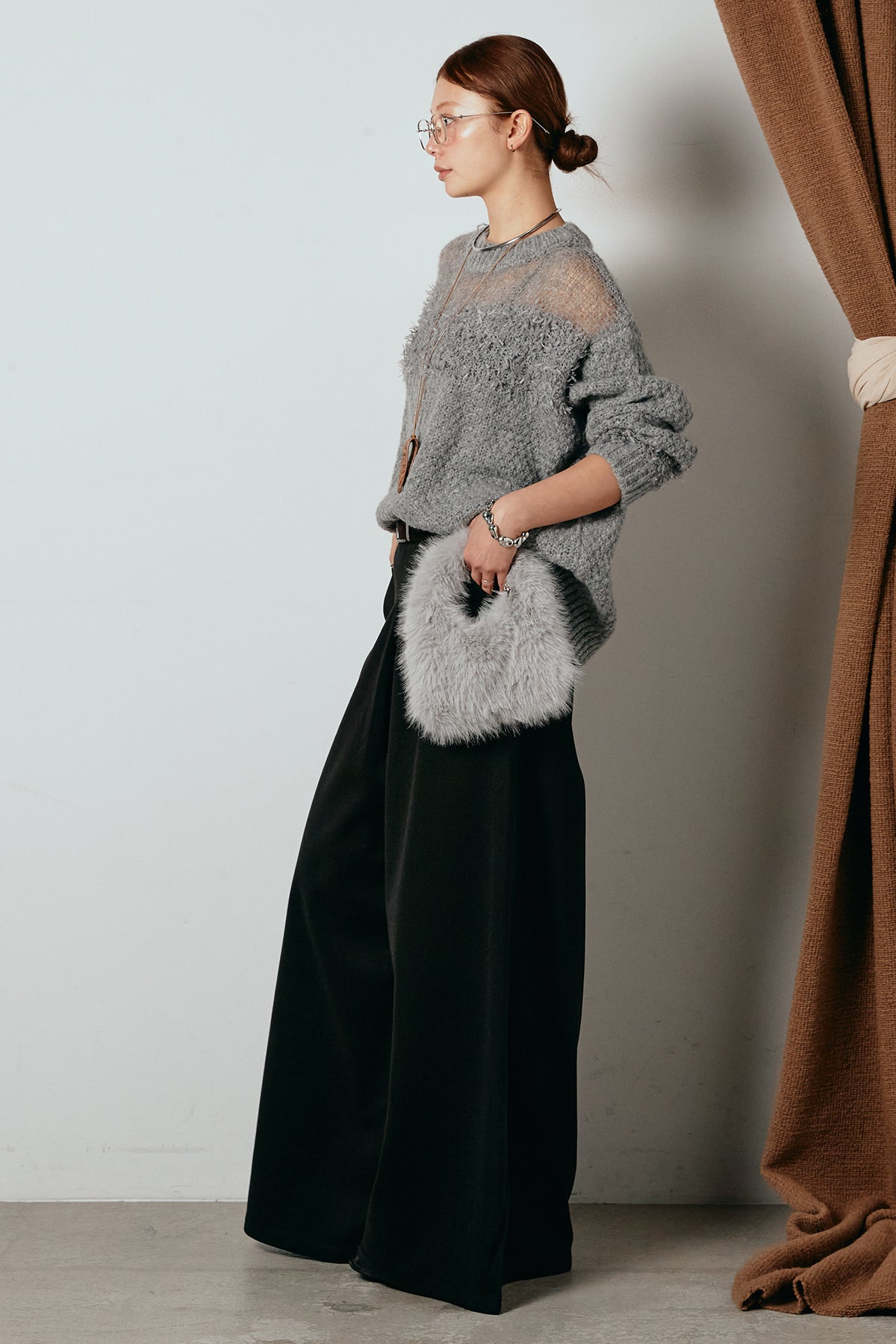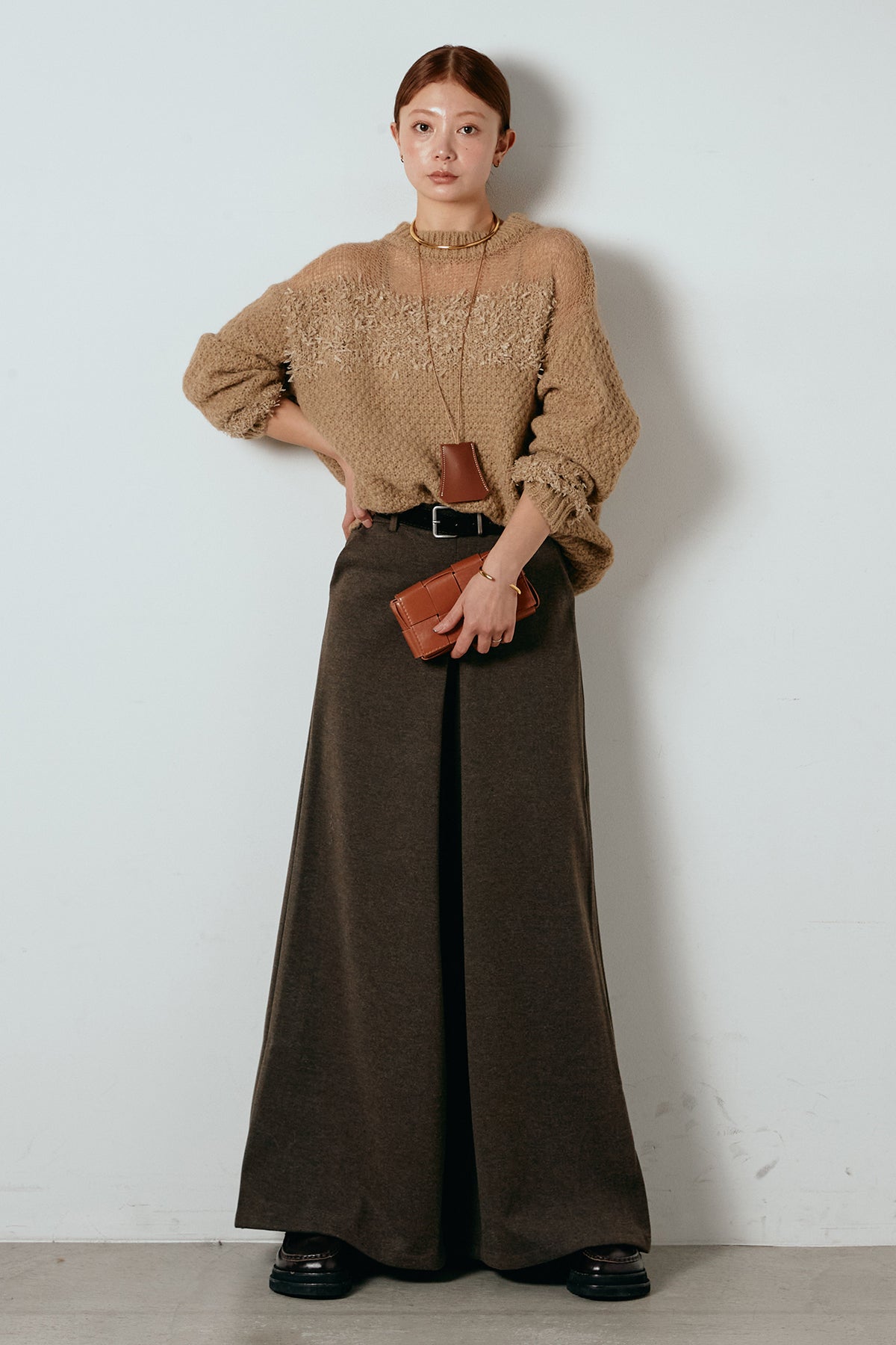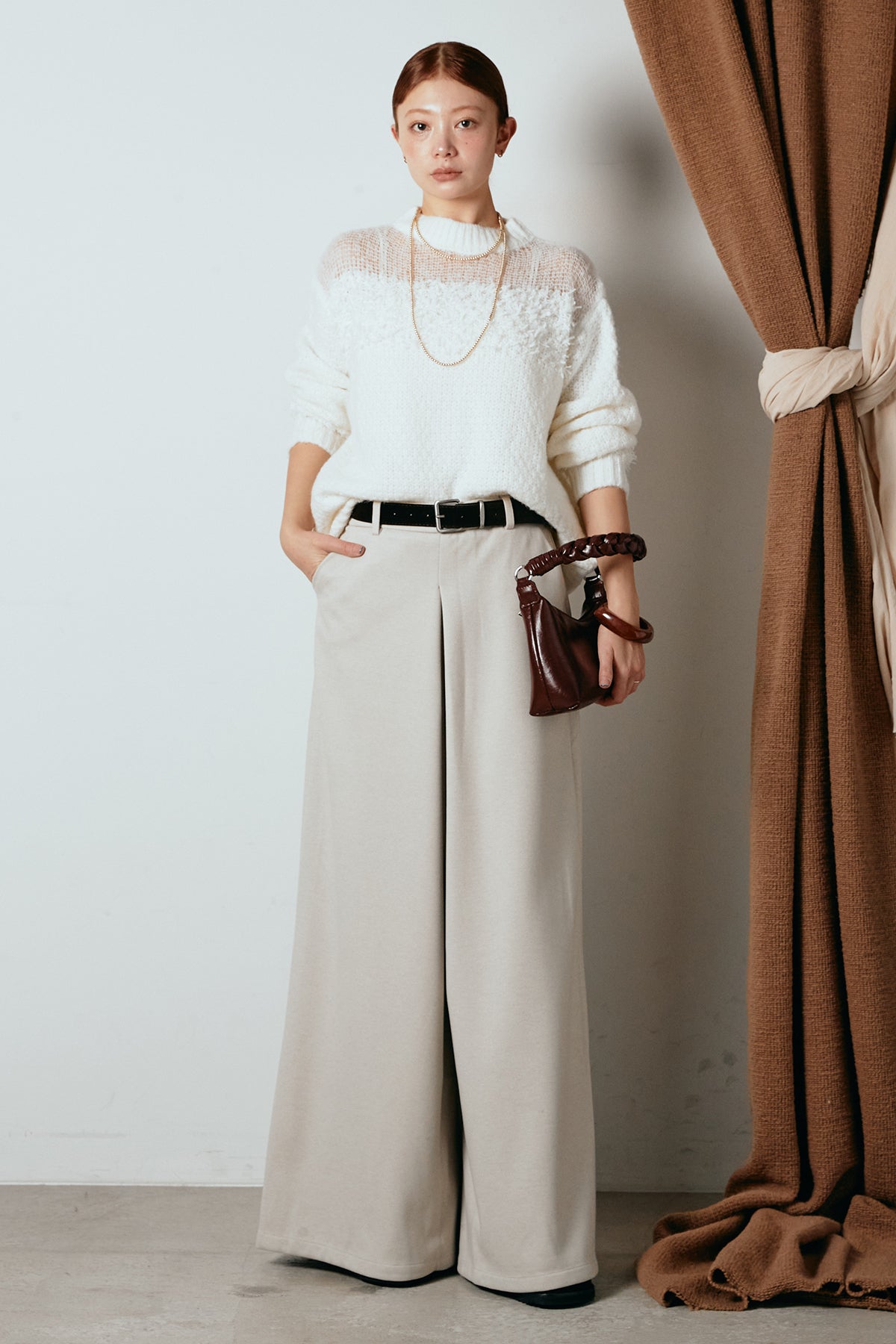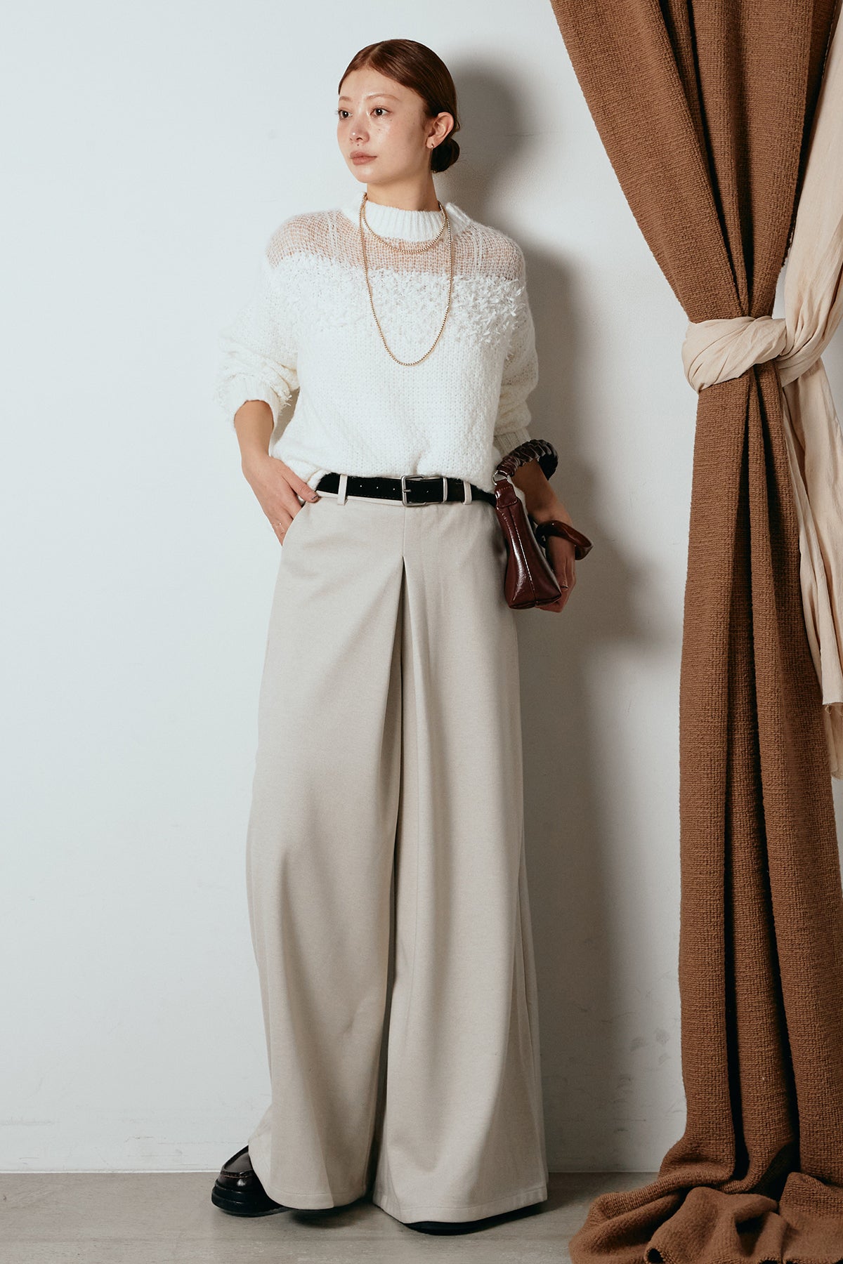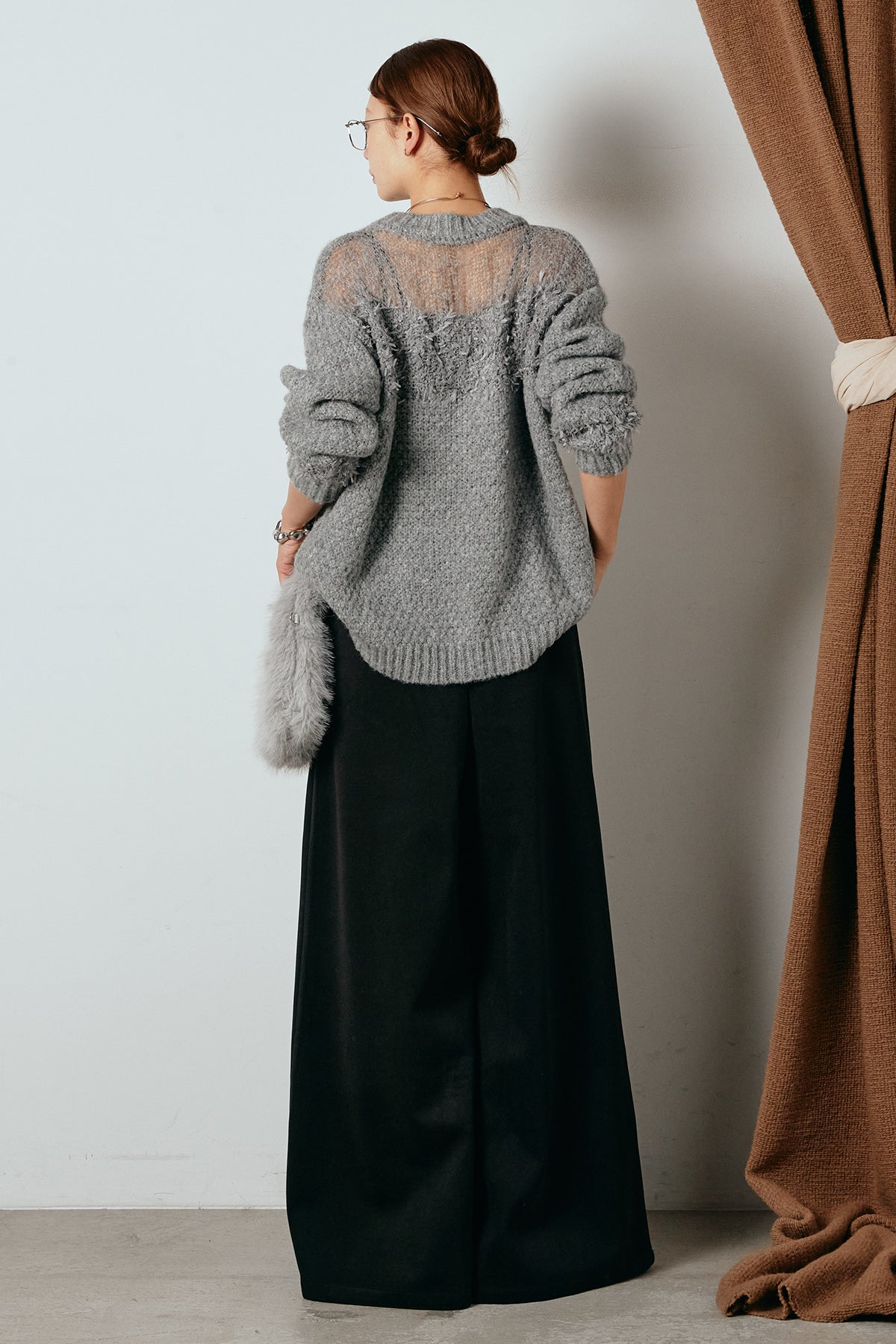 ランダムな編地切り替えを合わせたニットトップス。肩から胸元にかけての透け感と、ふわっとした立体的な編み表情がアクセントになり、シンプルながら印象のあるバランスに。身頃はすっきりした編地でまとめているので、ゆったりしたフォルムでも重たく見えにくく、パンツやスカートなど幅広く合わせやすいアイテムです。