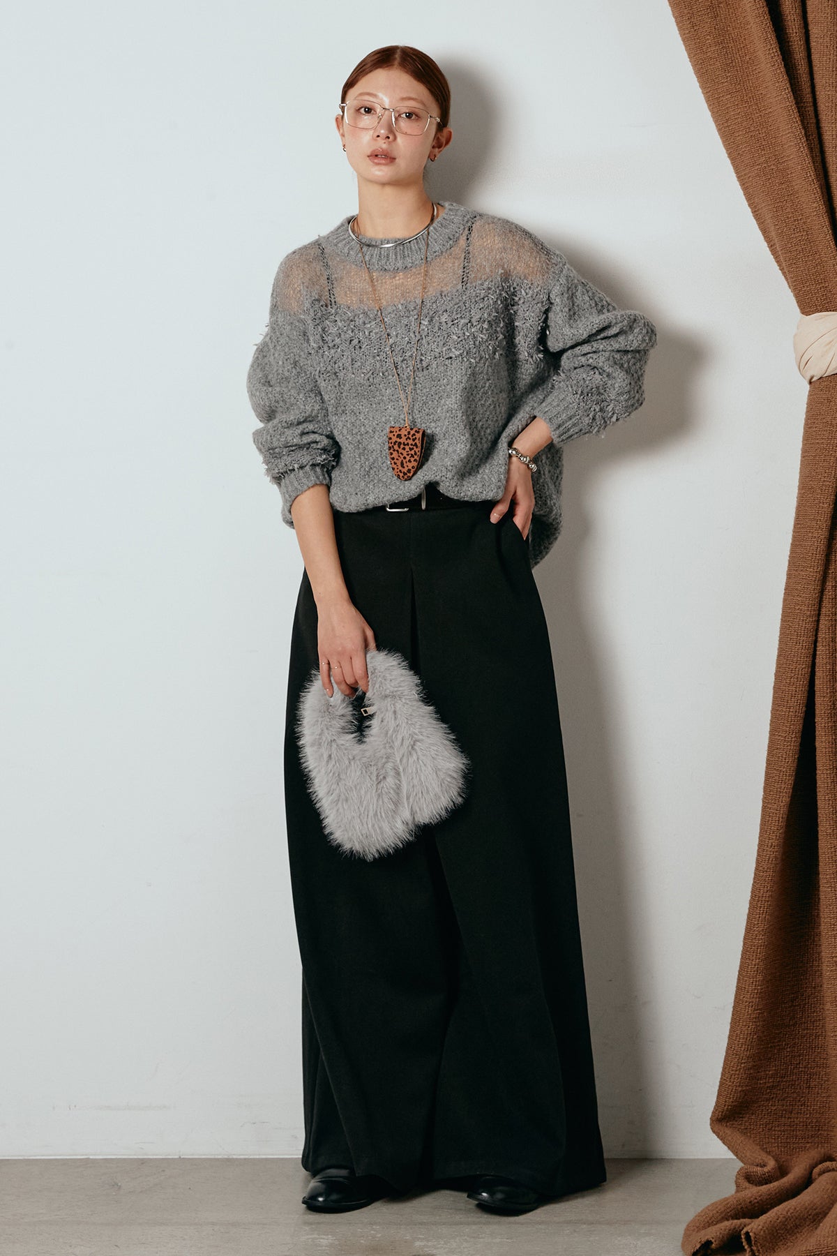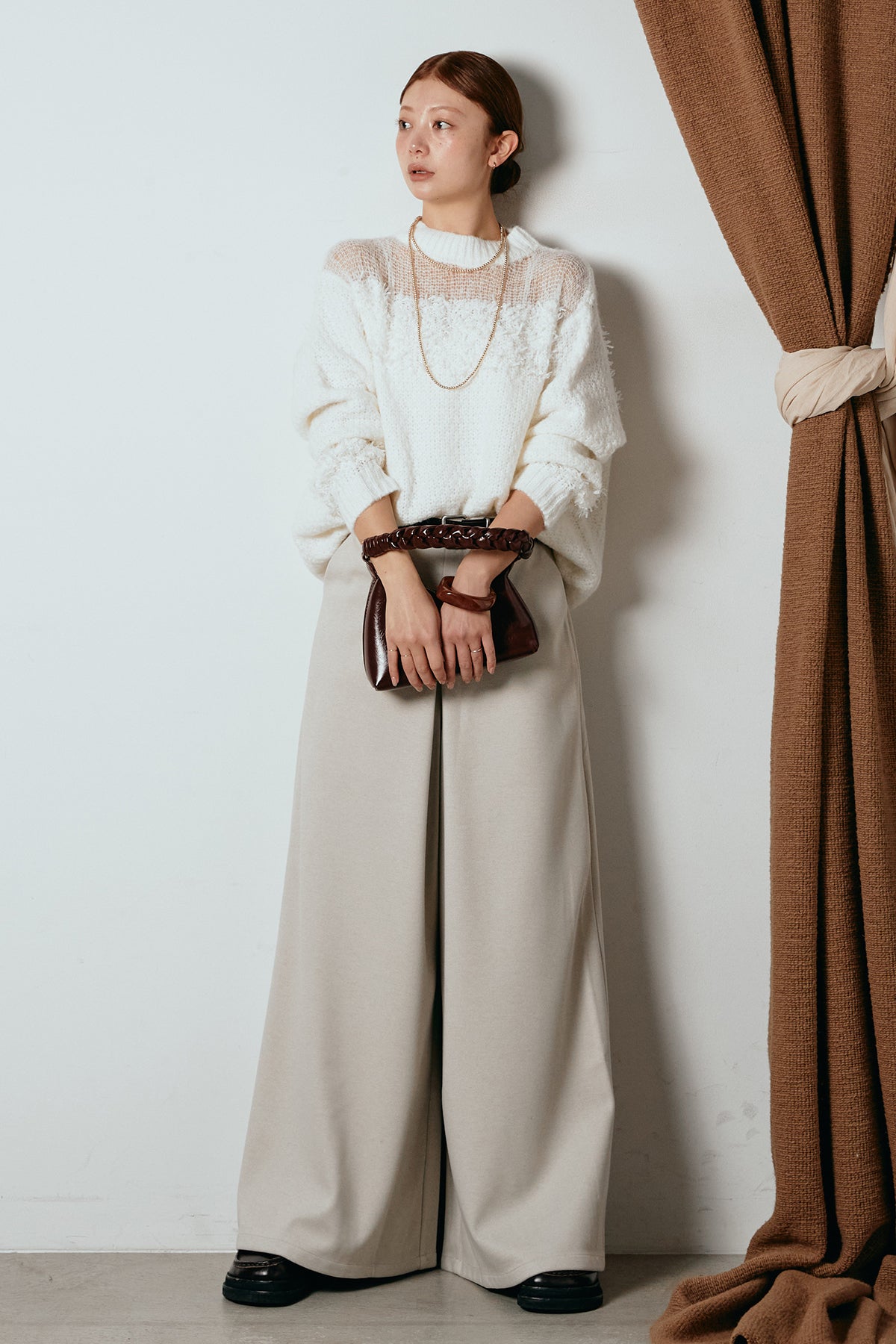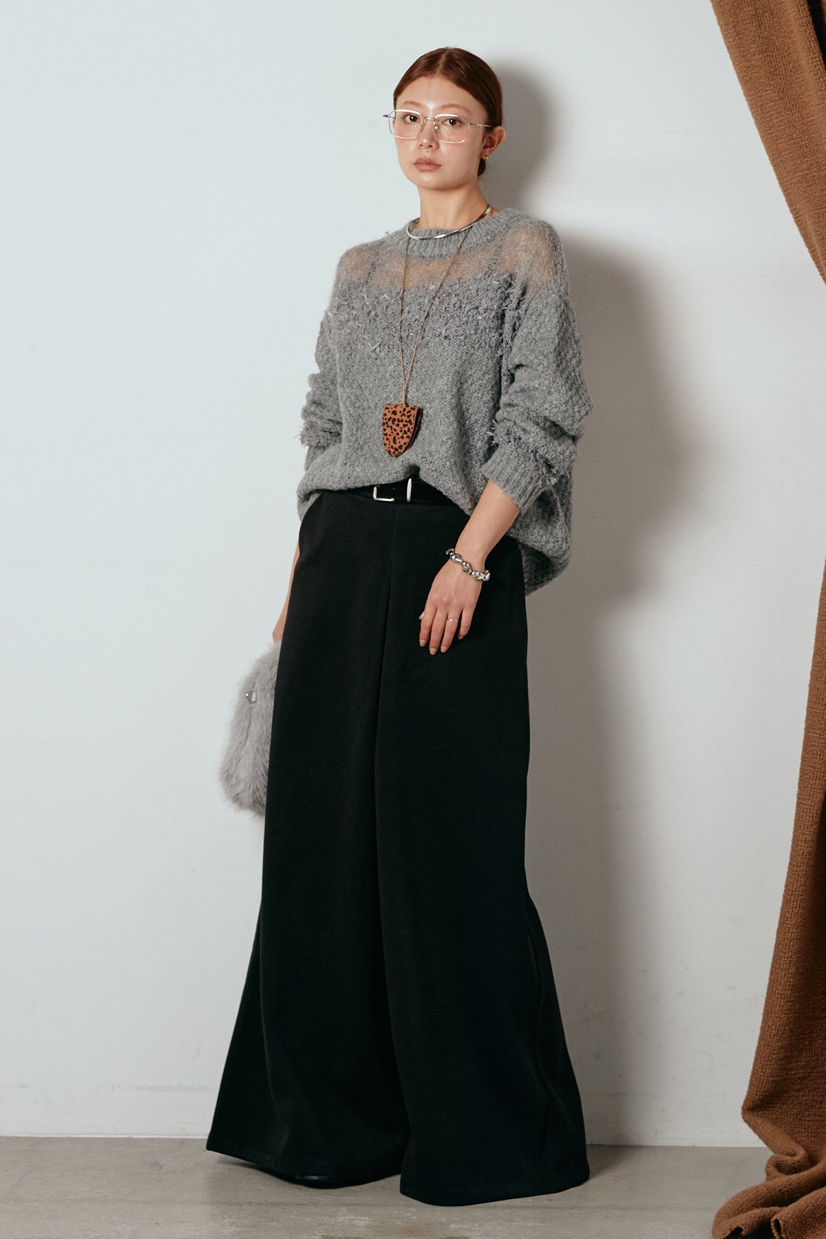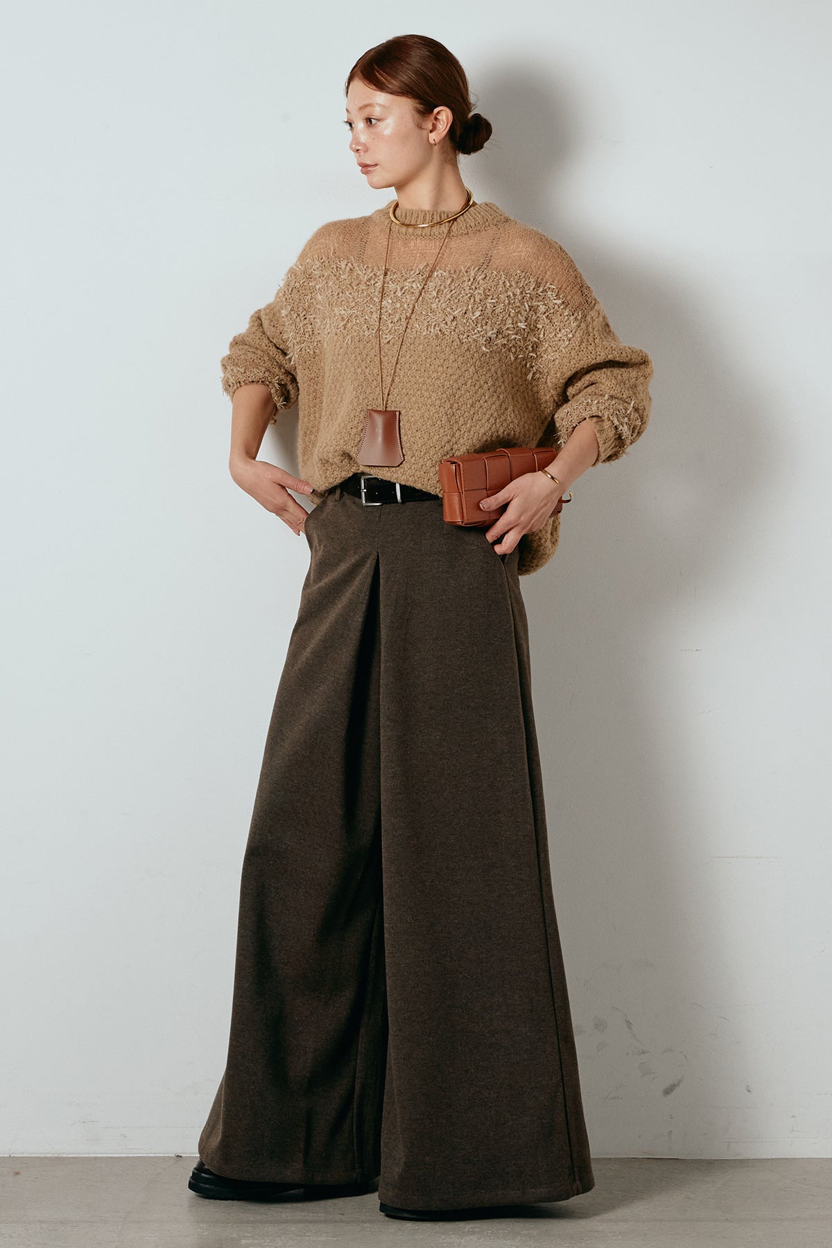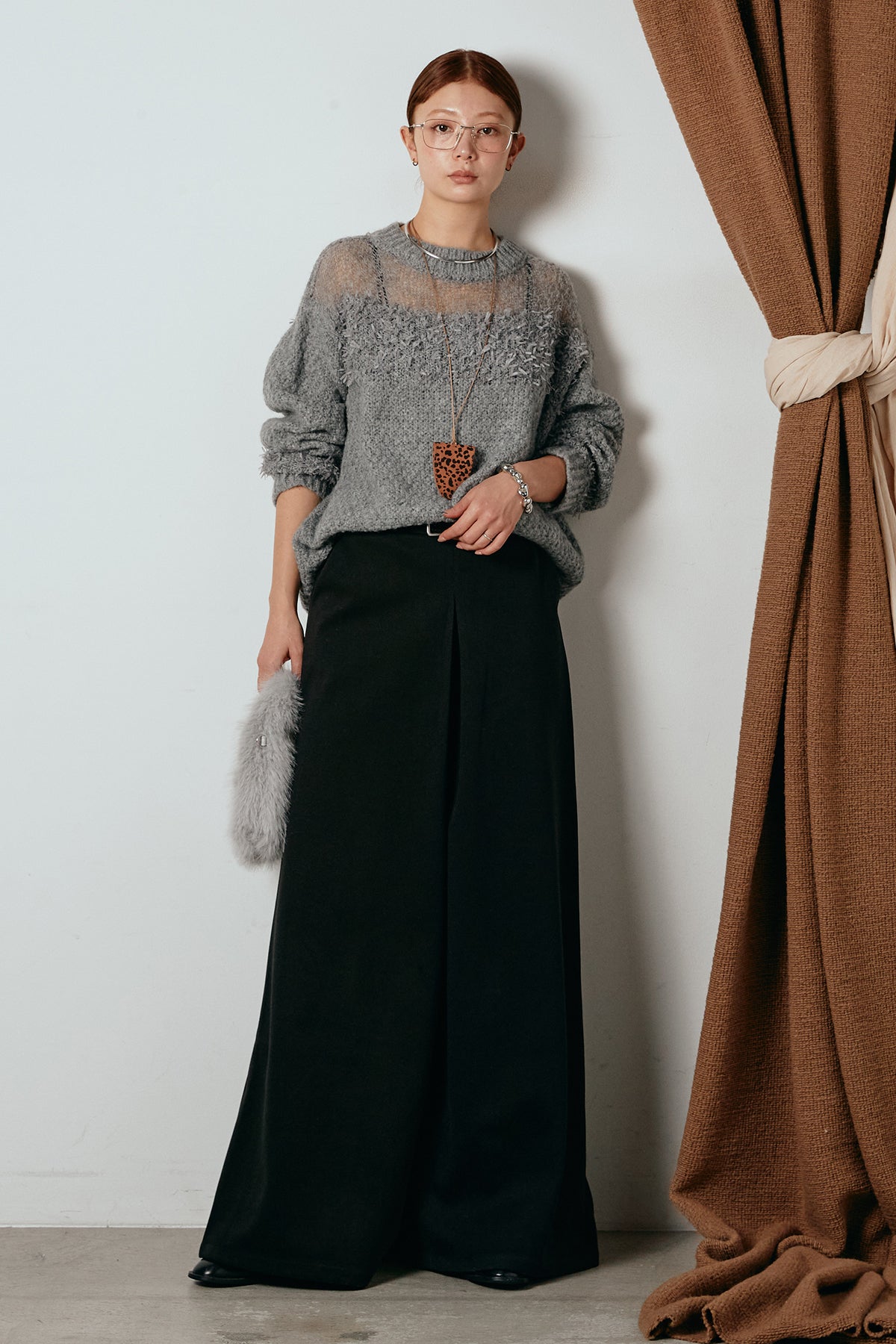 ランダムな編地切り替えを合わせたニットトップス。肩から胸元にかけての透け感と、ふわっとした立体的な編み表情がアクセントになり、シンプルながら印象のあるバランスに。身頃はすっきりした編地でまとめているので、ゆったりしたフォルムでも重たく見えにくく、パンツやスカートなど幅広く合わせやすいアイテムです。