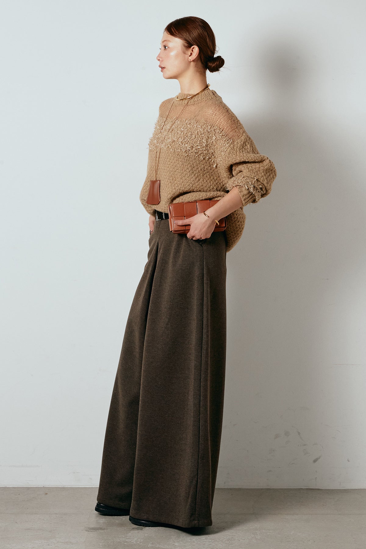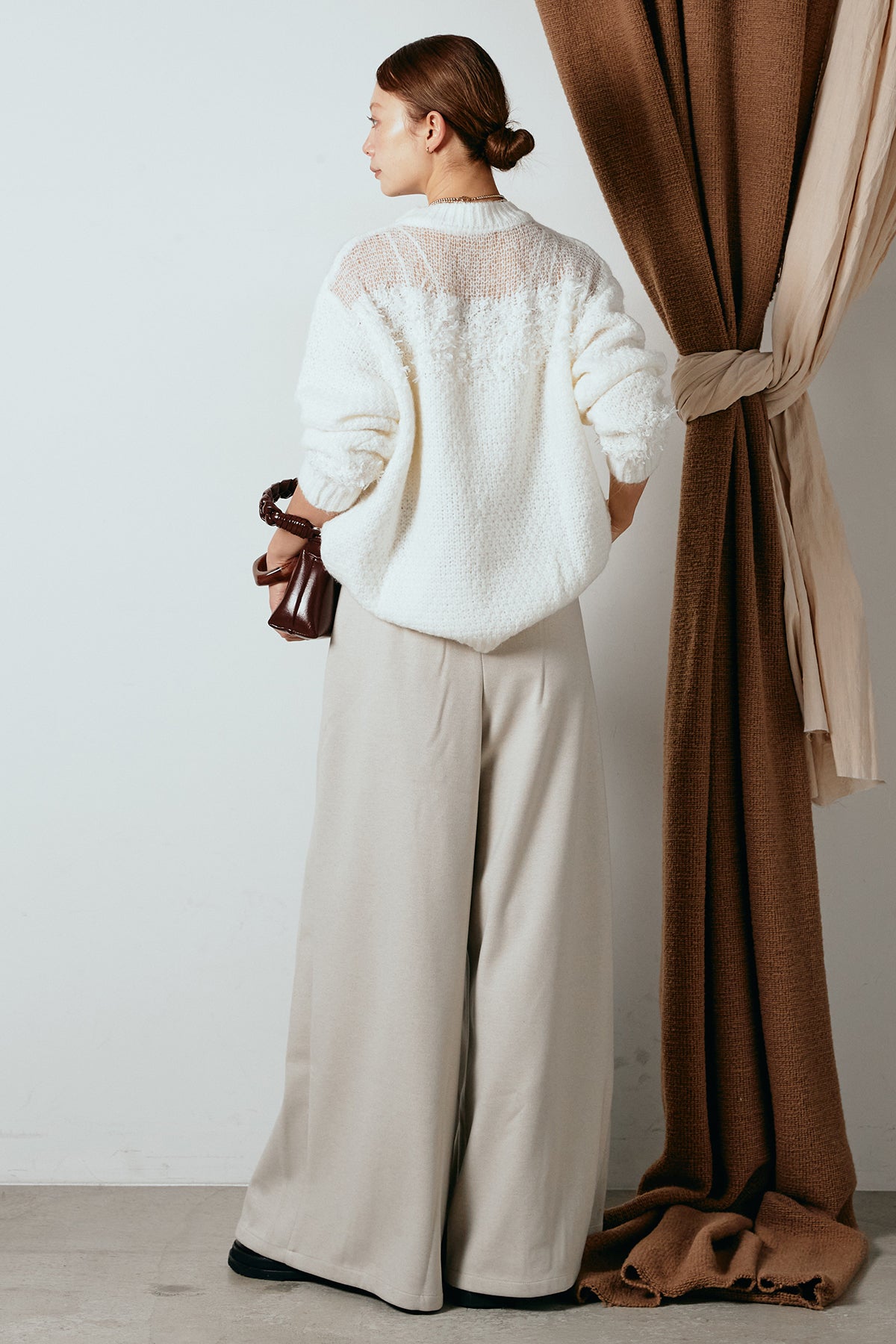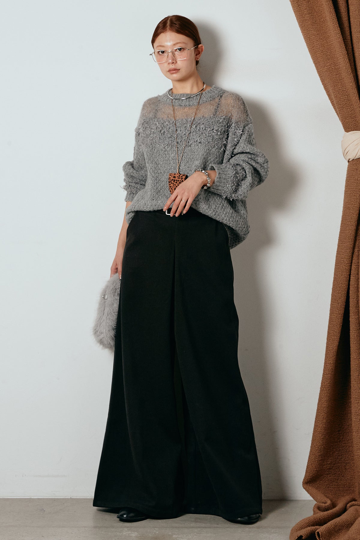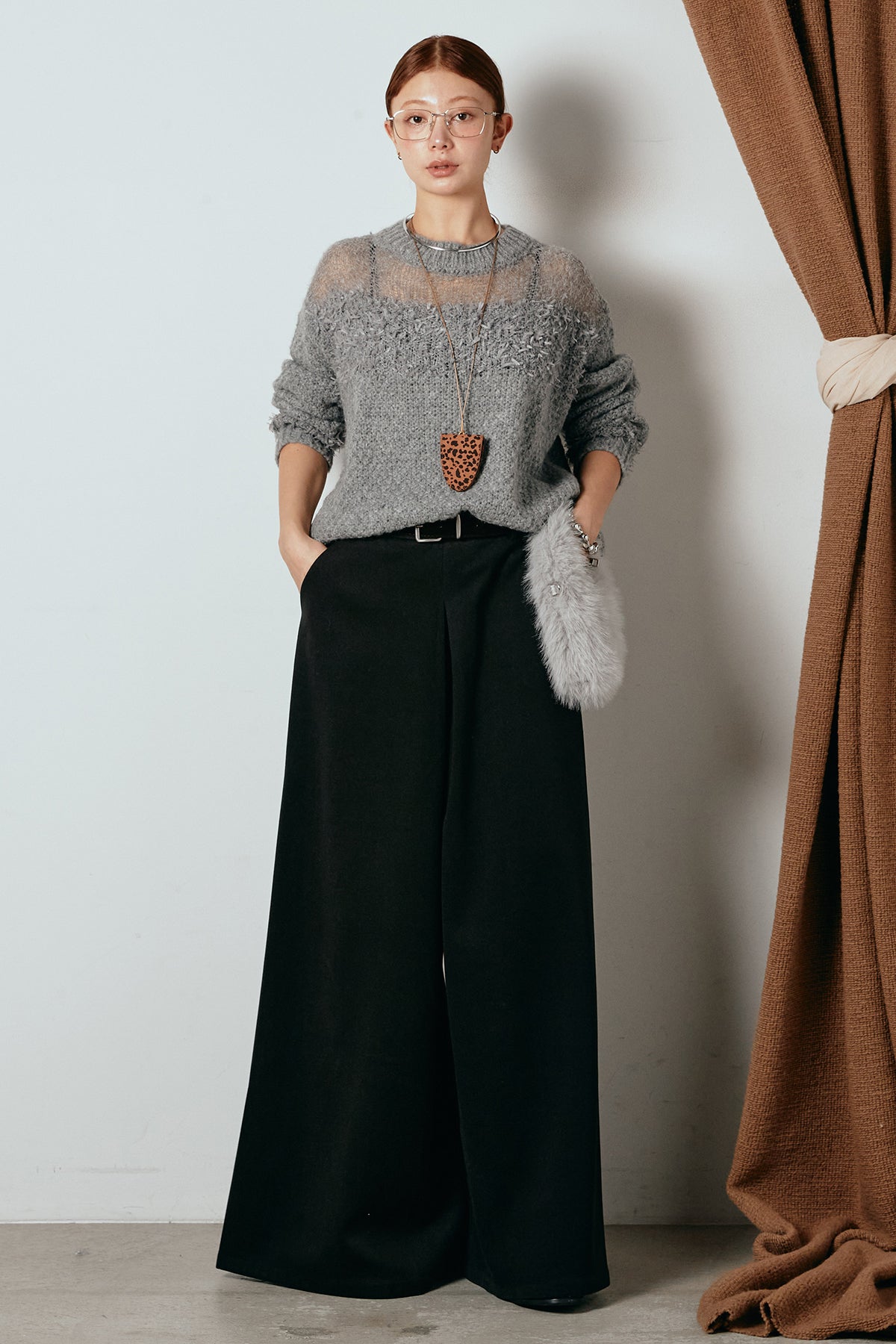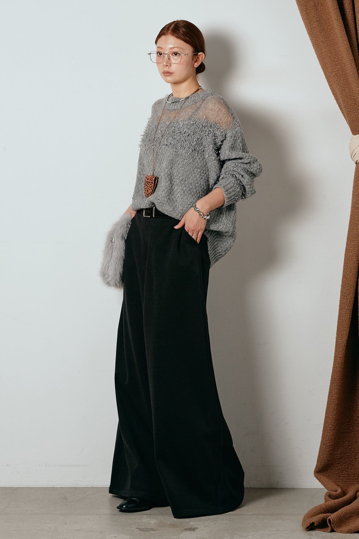 ランダムな編地切り替えを合わせたニットトップス。肩から胸元にかけての透け感と、ふわっとした立体的な編み表情がアクセントになり、シンプルながら印象のあるバランスに。身頃はすっきりした編地でまとめているので、ゆったりしたフォルムでも重たく見えにくく、パンツやスカートなど幅広く合わせやすいアイテムです。