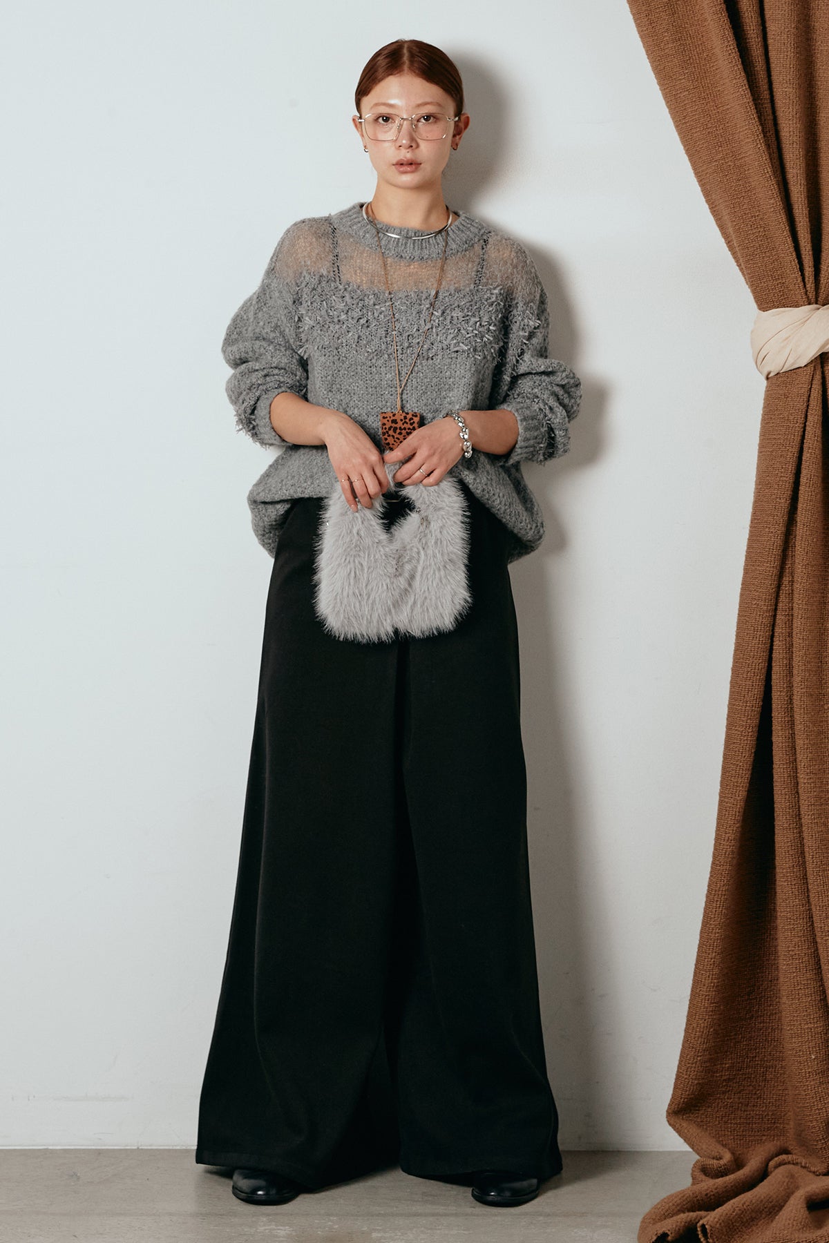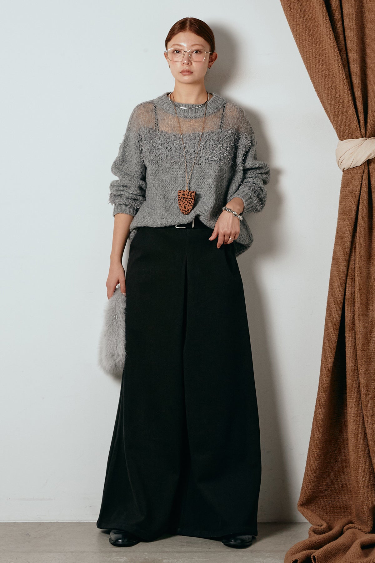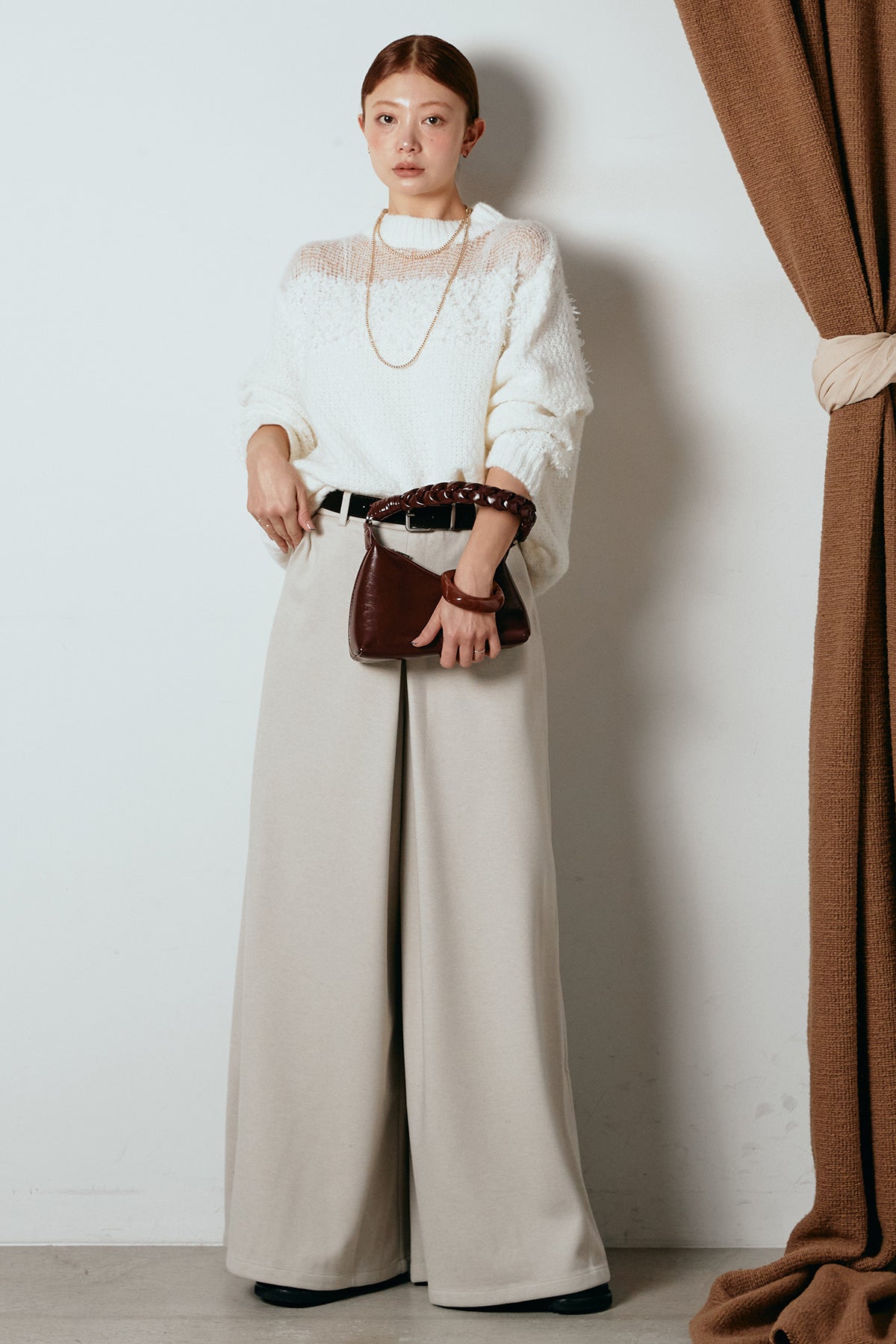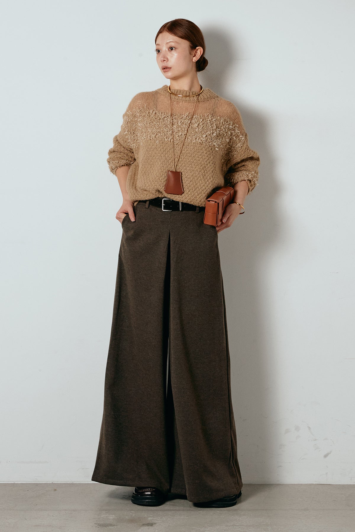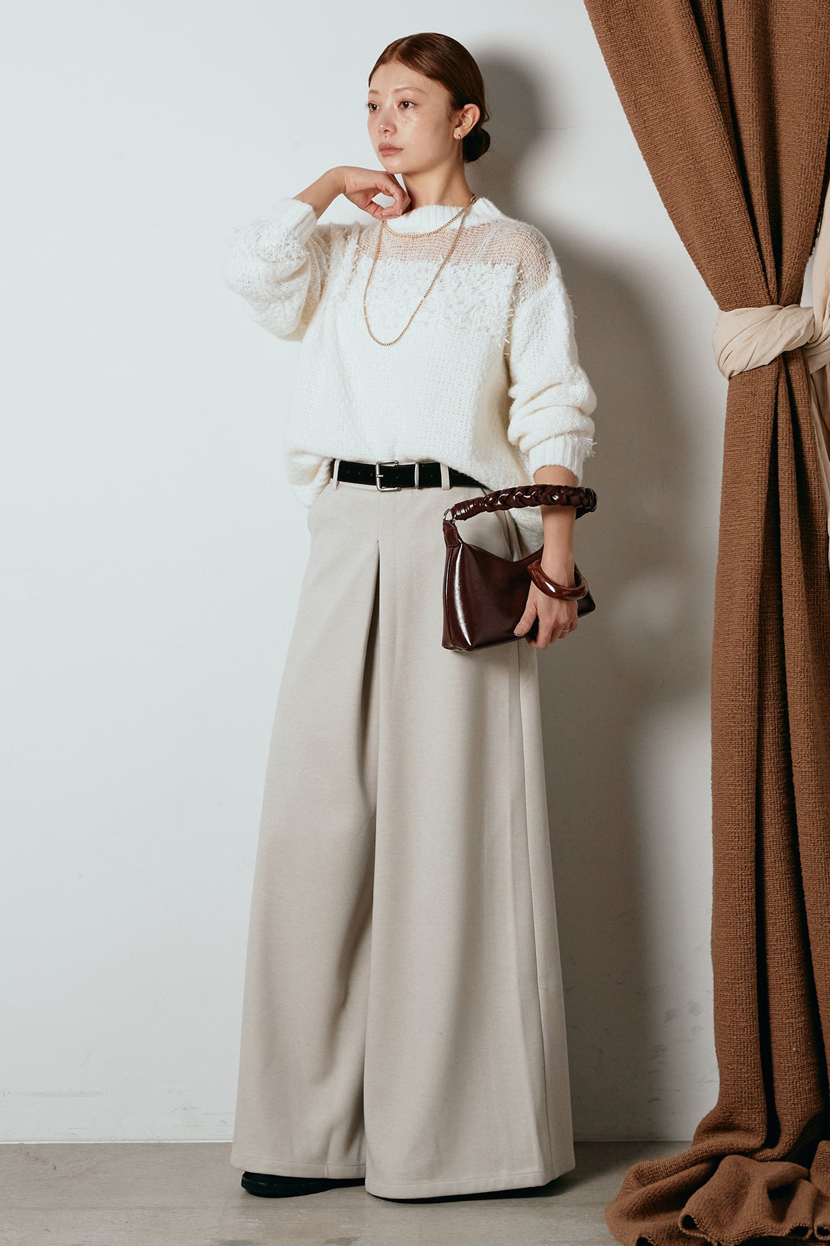 ランダムな編地切り替えを合わせたニットトップス。肩から胸元にかけての透け感と、ふわっとした立体的な編み表情がアクセントになり、シンプルながら印象のあるバランスに。身頃はすっきりした編地でまとめているので、ゆったりしたフォルムでも重たく見えにくく、パンツやスカートなど幅広く合わせやすいアイテムです。