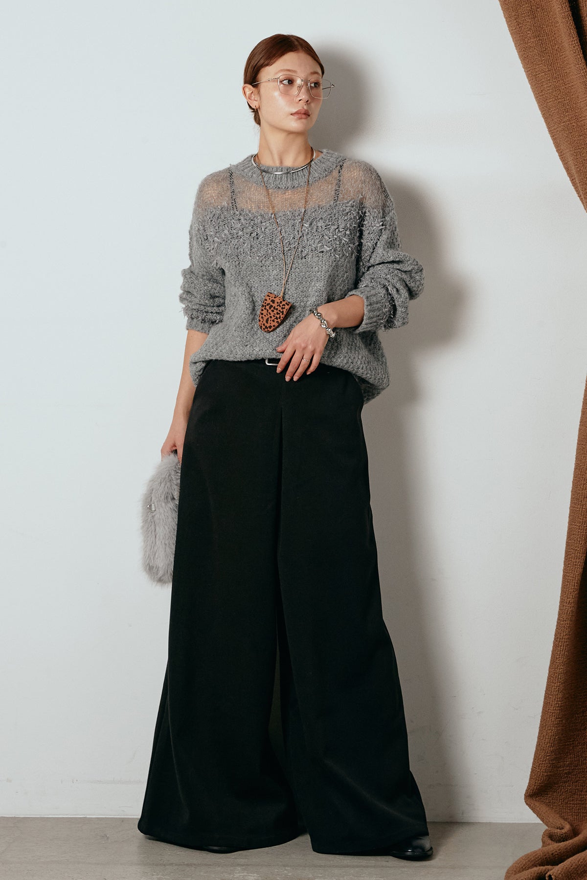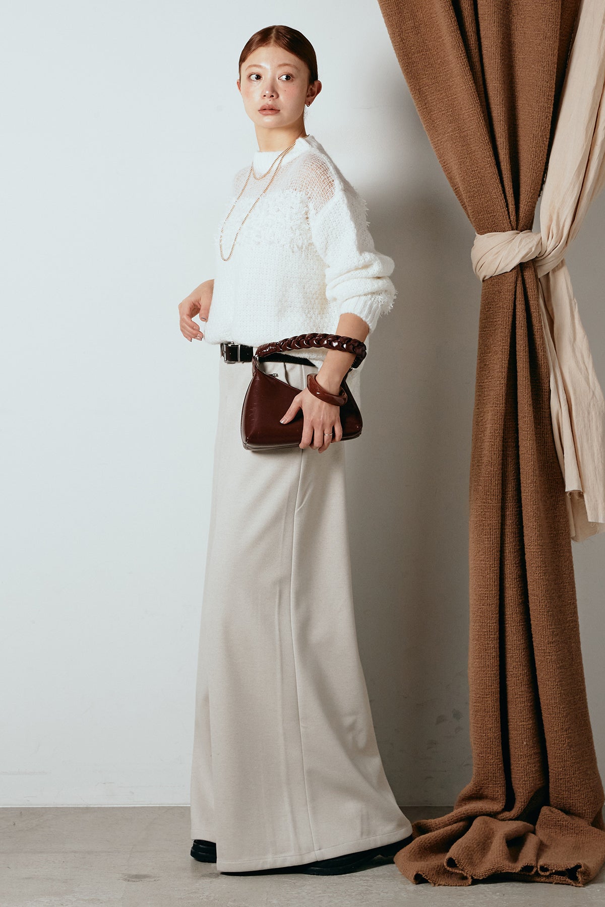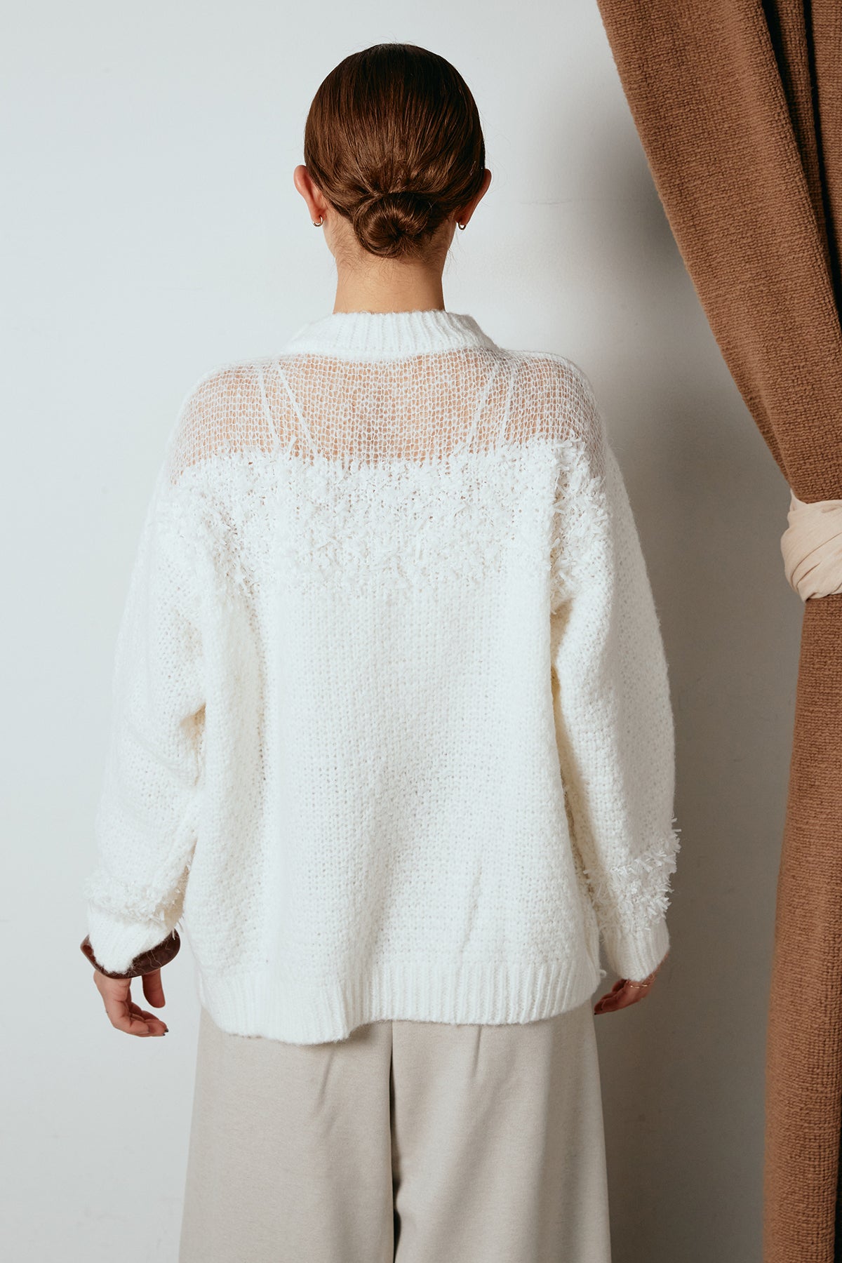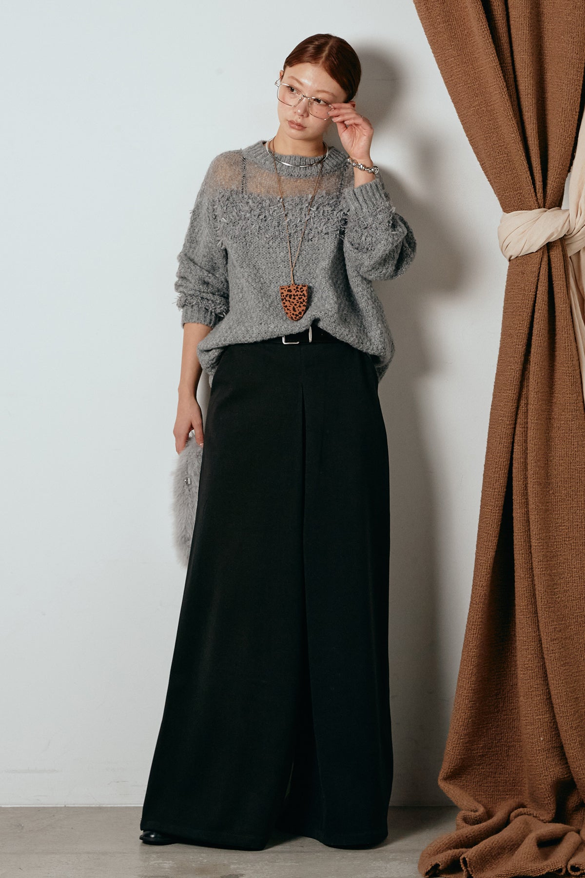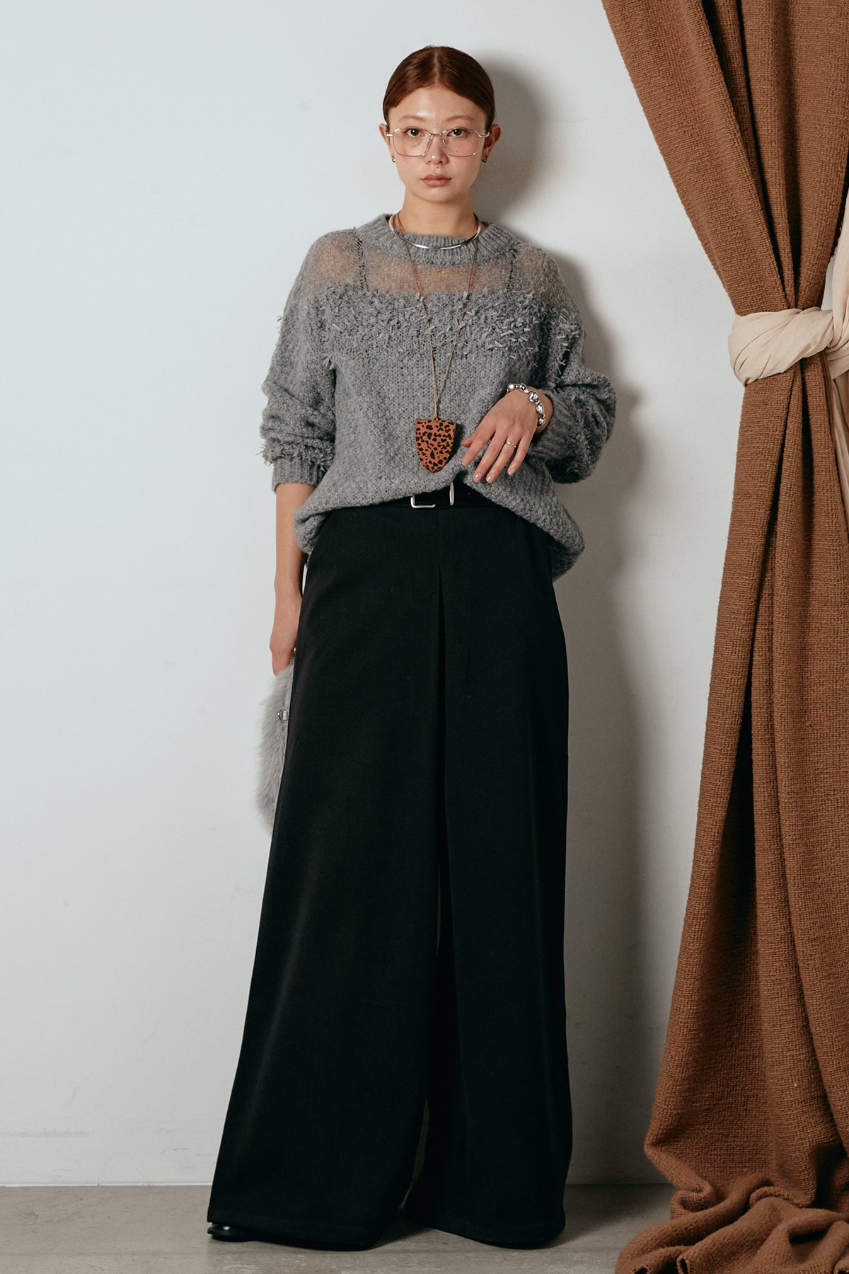 ランダムな編地切り替えを合わせたニットトップス。肩から胸元にかけての透け感と、ふわっとした立体的な編み表情がアクセントになり、シンプルながら印象のあるバランスに。身頃はすっきりした編地でまとめているので、ゆったりしたフォルムでも重たく見えにくく、パンツやスカートなど幅広く合わせやすいアイテムです。