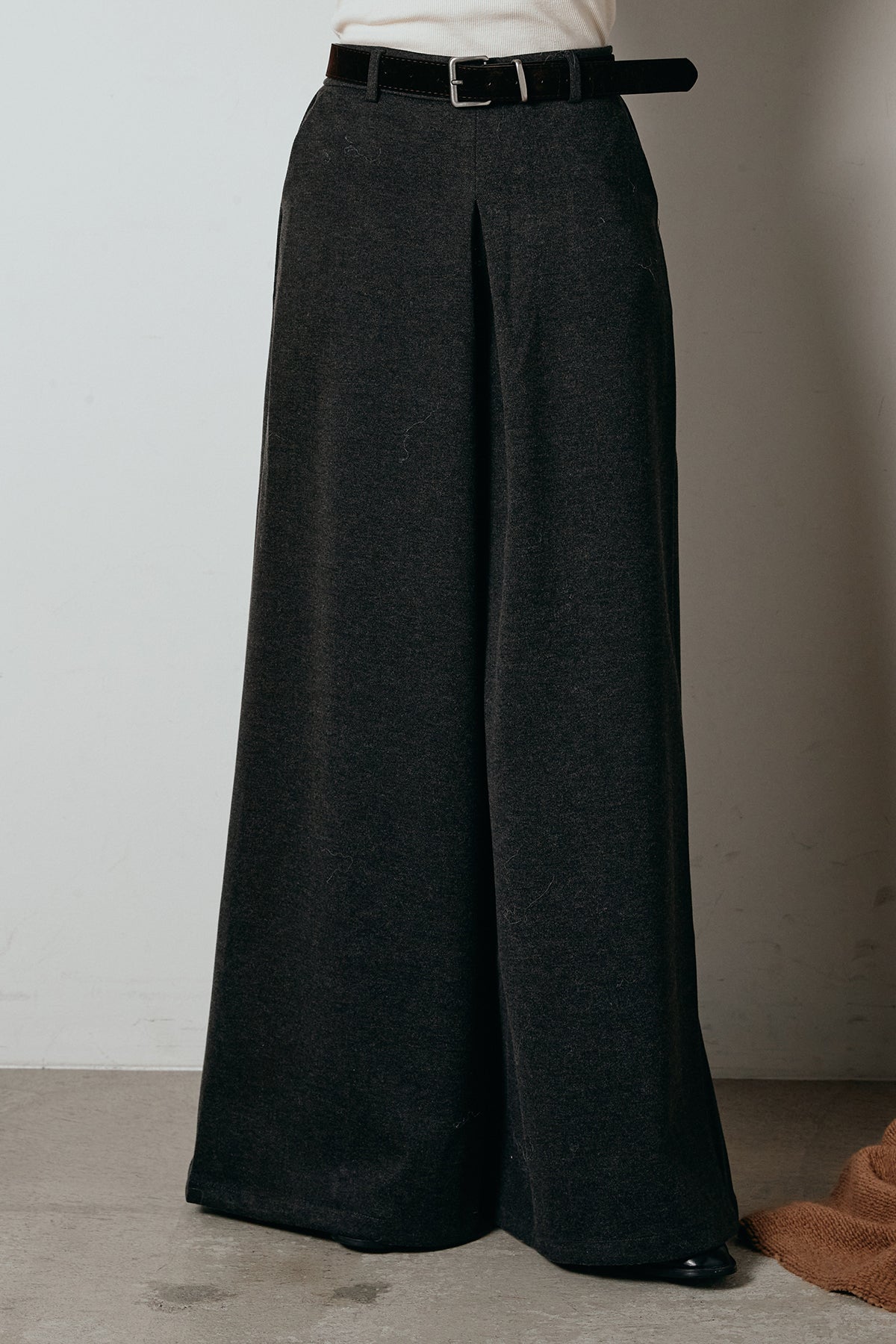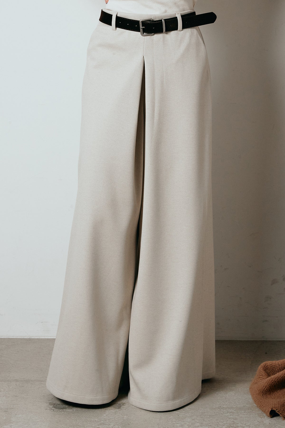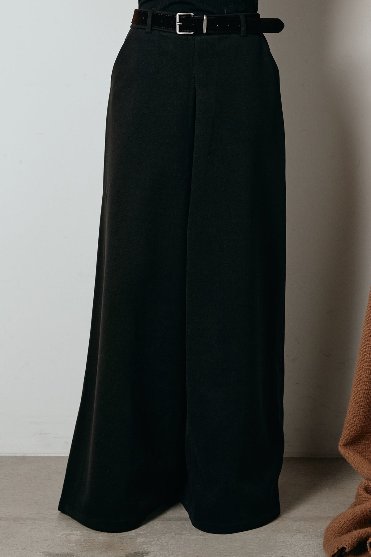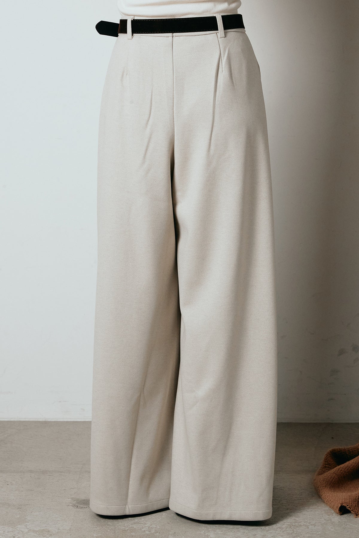 フロントに深めのタックを施し、縦に落ちるきれいなラインを際立たせたワイドパンツ。動くたびにゆるやかに広がるシルエットが、さりげなくメリハリのあるバランスに導きます。付属のベルトがウエスト位置を引き締め、トップスをインするだけでまとまりのある装いに。ニットやシャツなど幅広く合わせやすく、デイリーに取り入れやすいアイテムです。