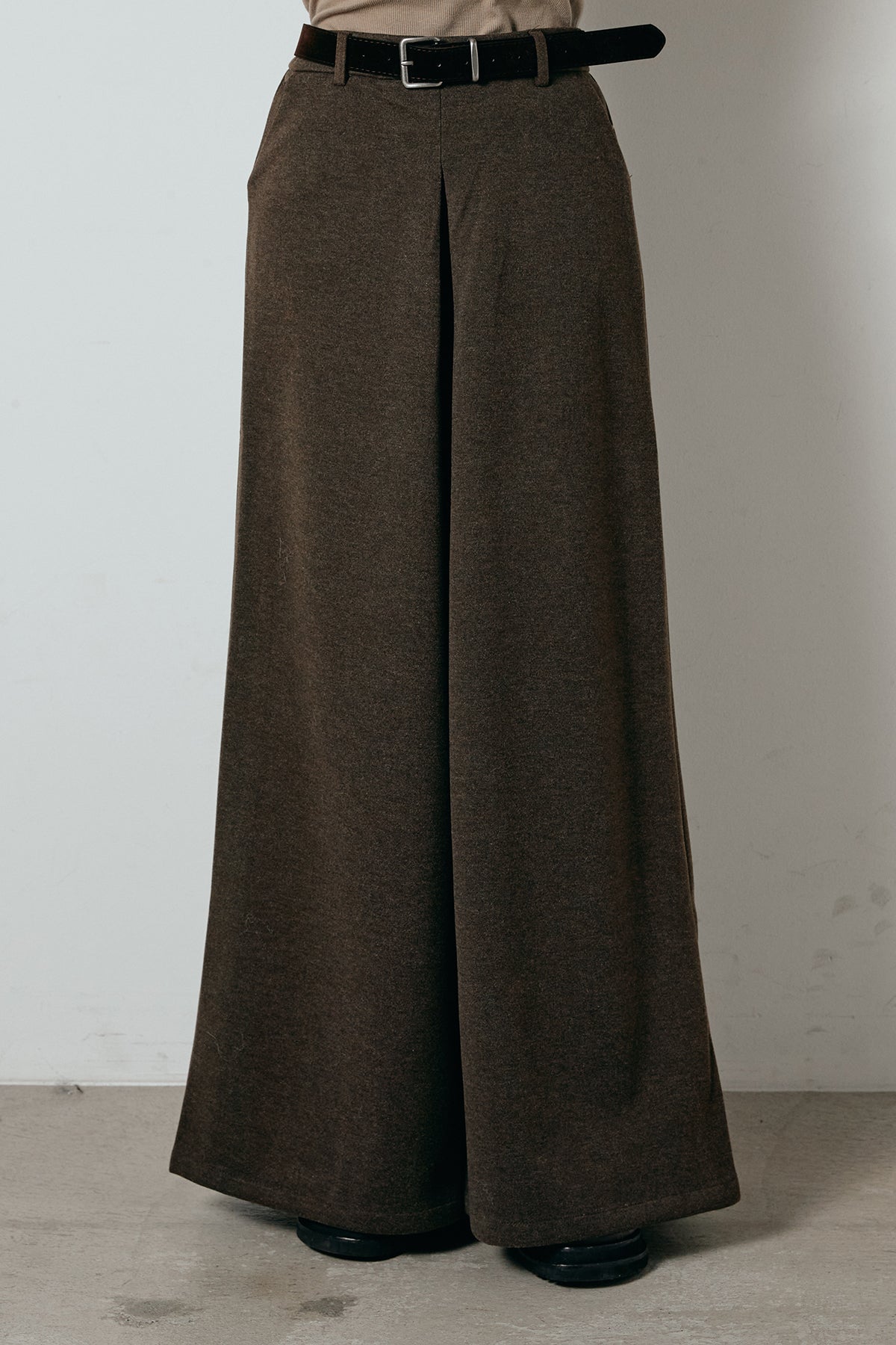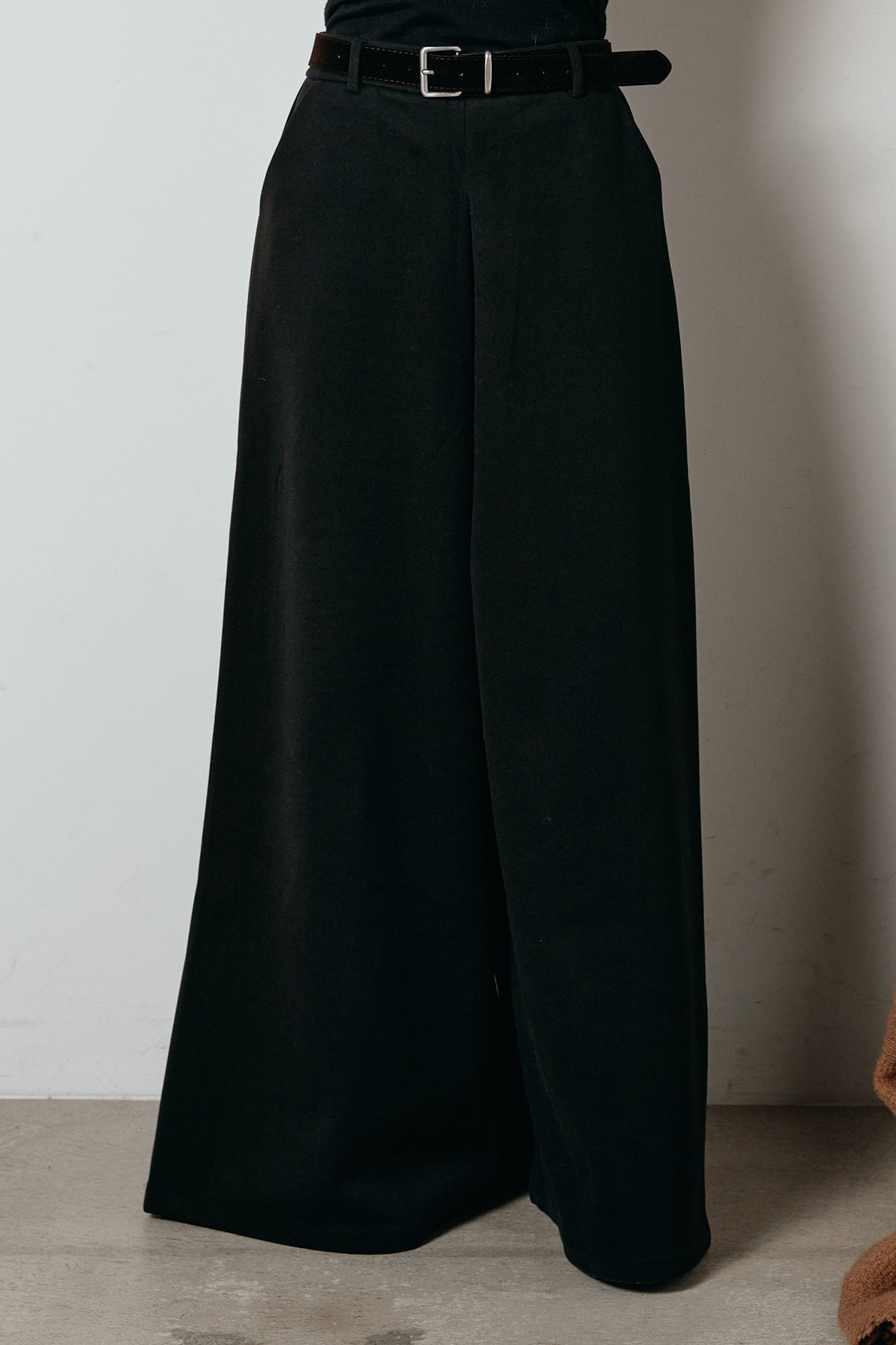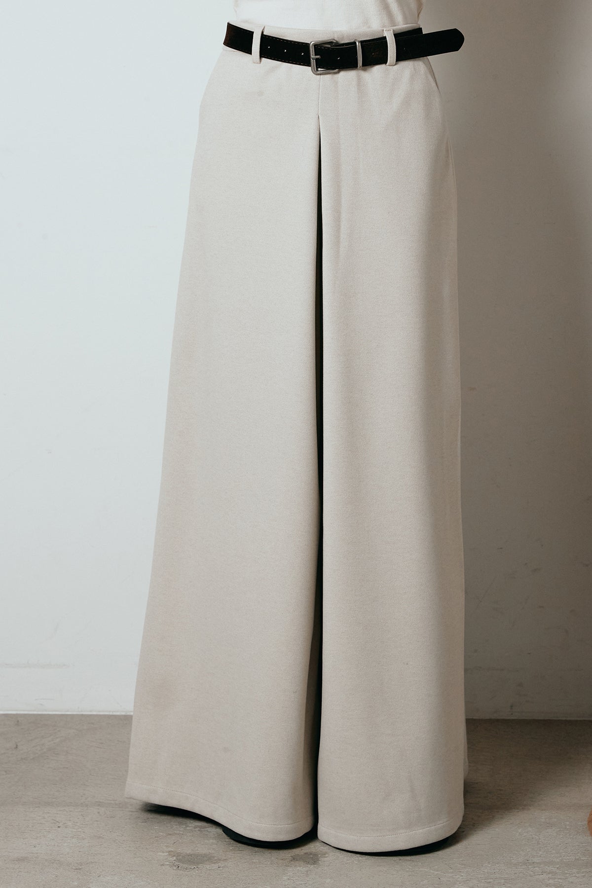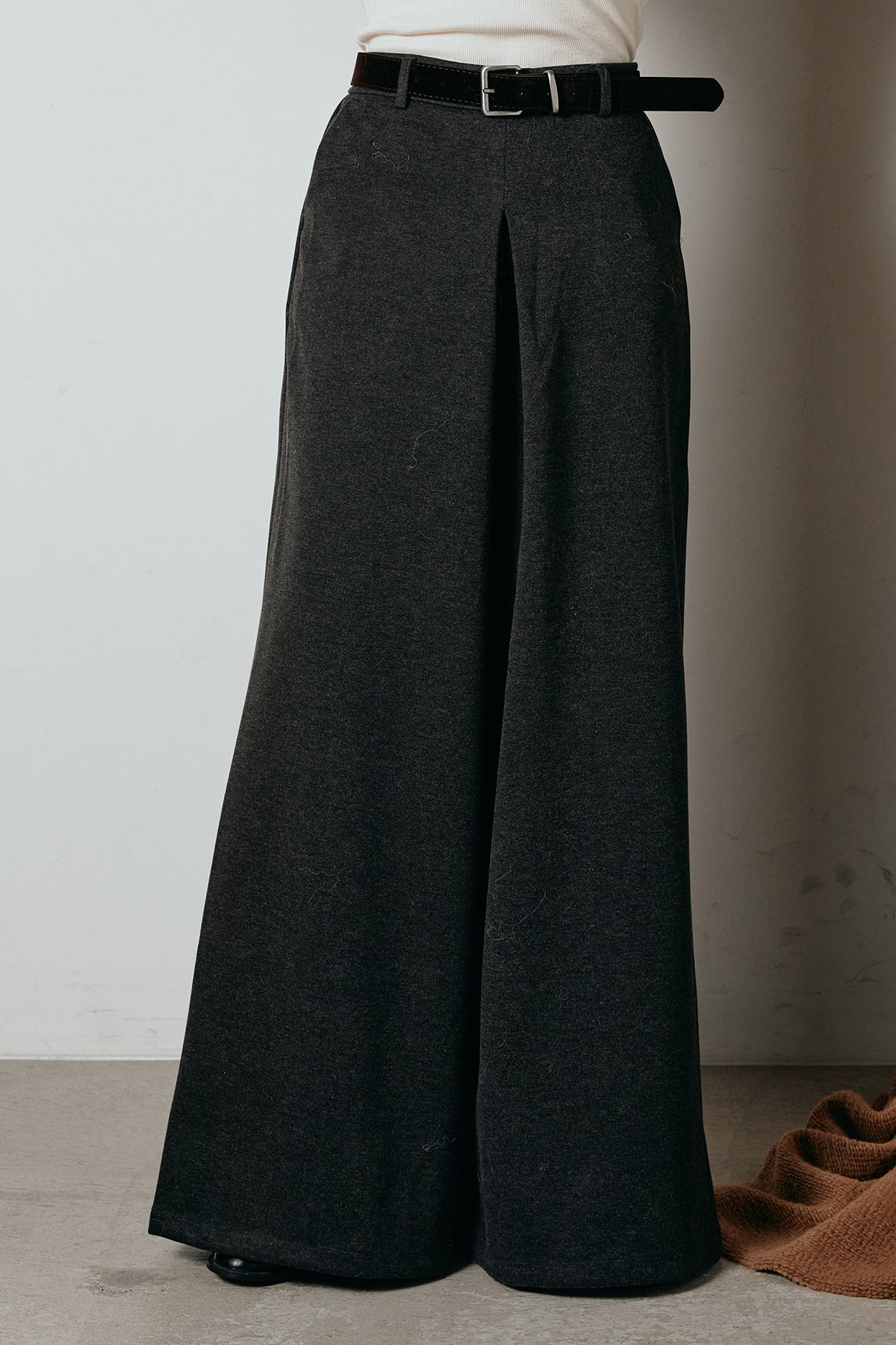 フロントに深めのタックを施し、縦に落ちるきれいなラインを際立たせたワイドパンツ。動くたびにゆるやかに広がるシルエットが、さりげなくメリハリのあるバランスに導きます。付属のベルトがウエスト位置を引き締め、トップスをインするだけでまとまりのある装いに。ニットやシャツなど幅広く合わせやすく、デイリーに取り入れやすいアイテムです。