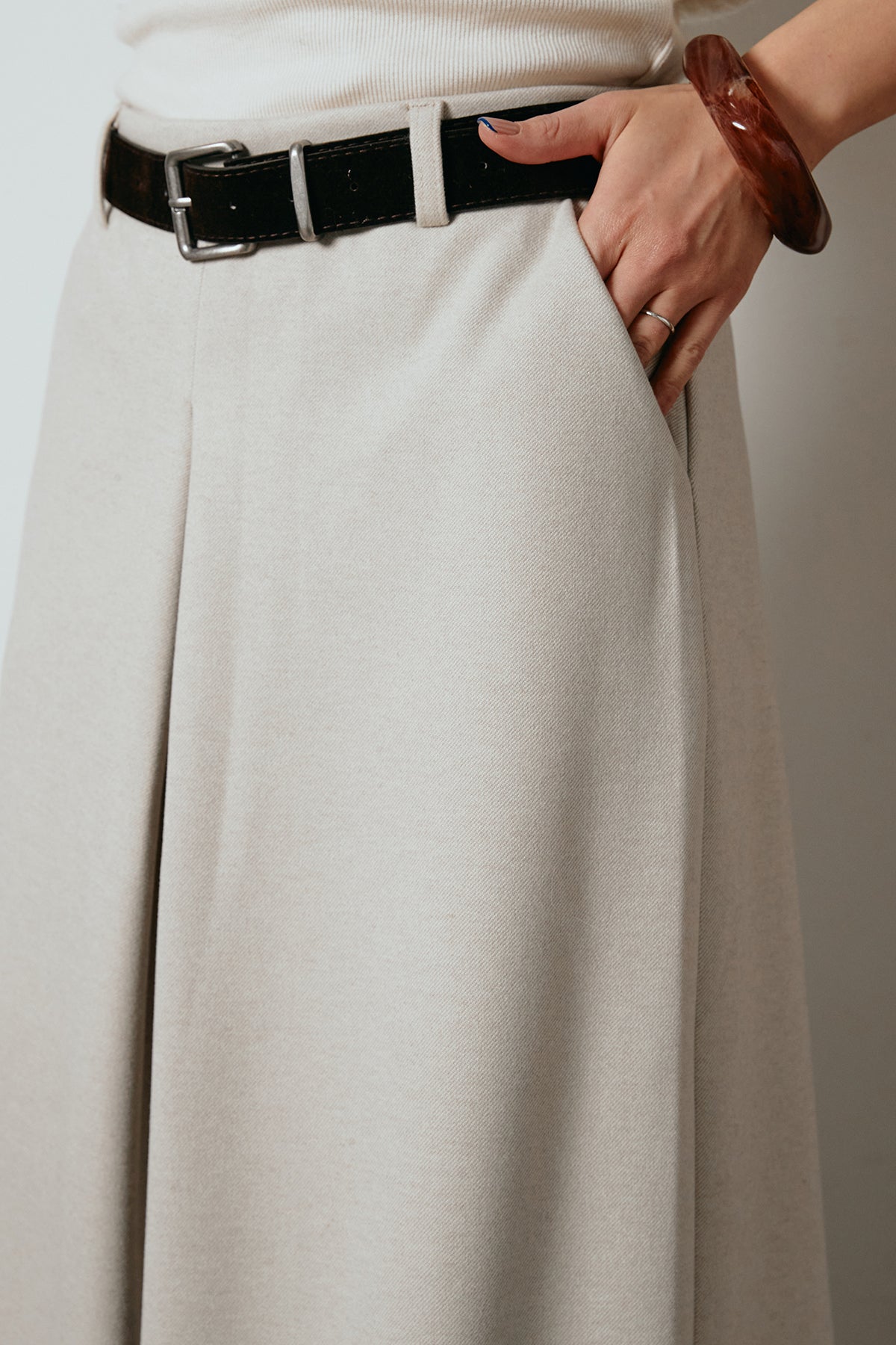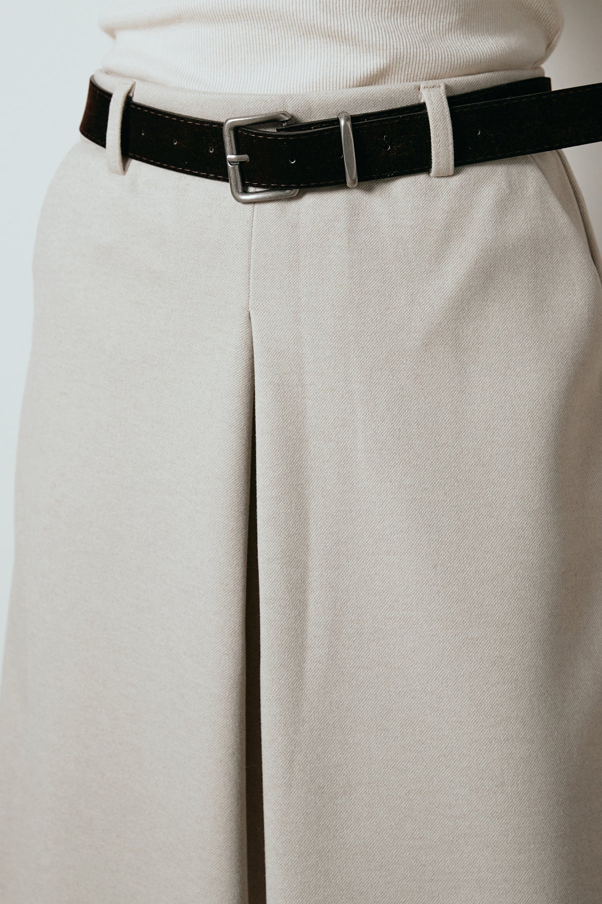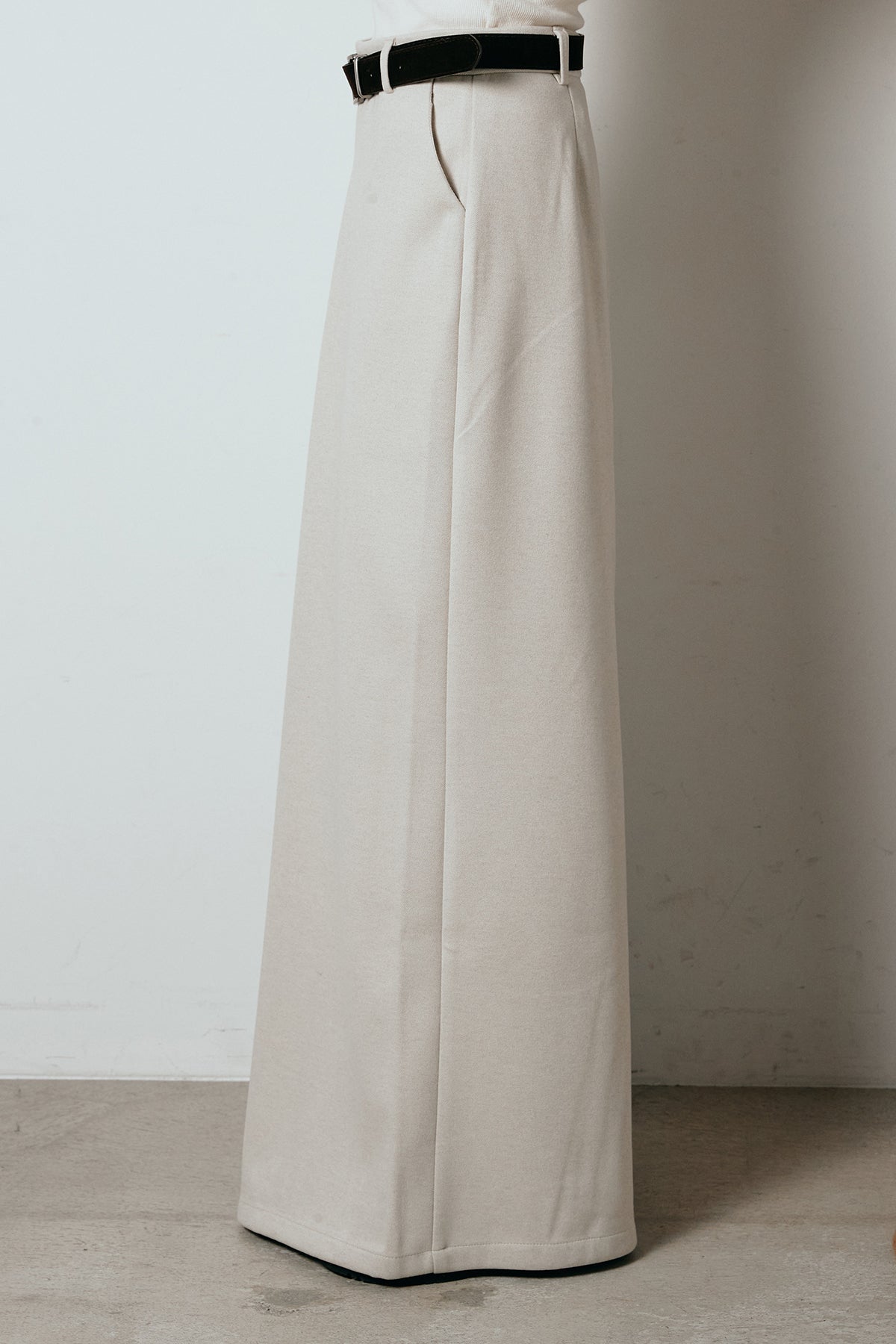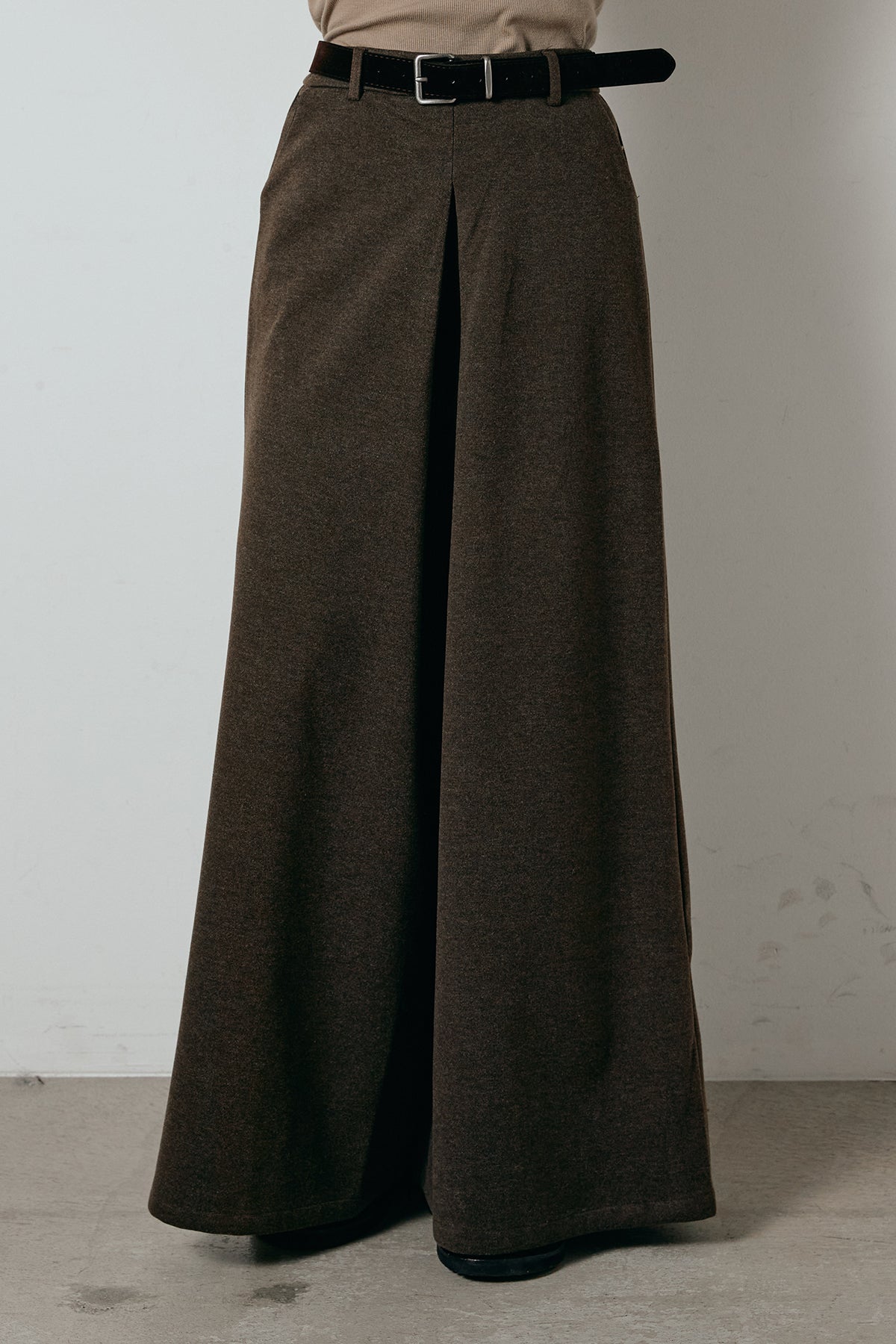 フロントに深めのタックを施し、縦に落ちるきれいなラインを際立たせたワイドパンツ。動くたびにゆるやかに広がるシルエットが、さりげなくメリハリのあるバランスに導きます。付属のベルトがウエスト位置を引き締め、トップスをインするだけでまとまりのある装いに。ニットやシャツなど幅広く合わせやすく、デイリーに取り入れやすいアイテムです。