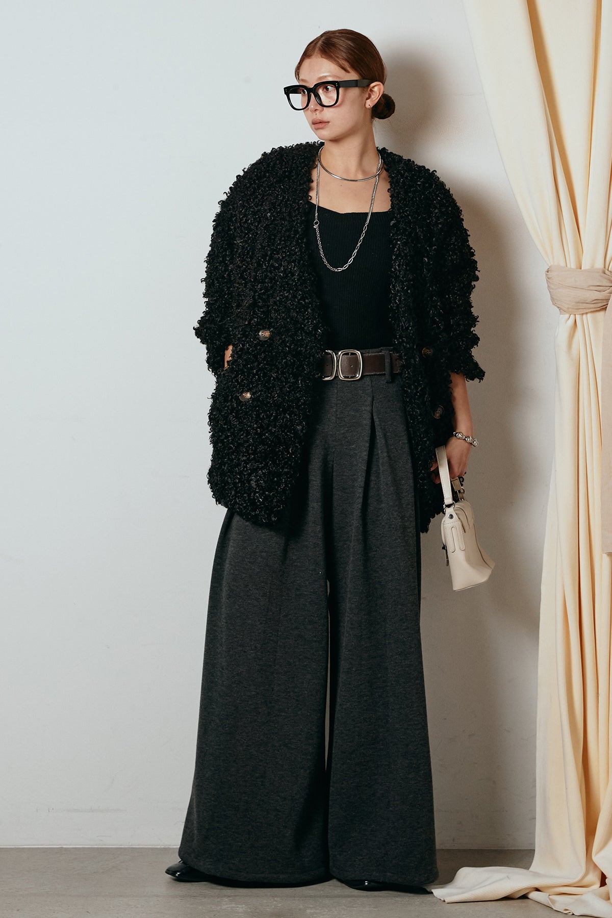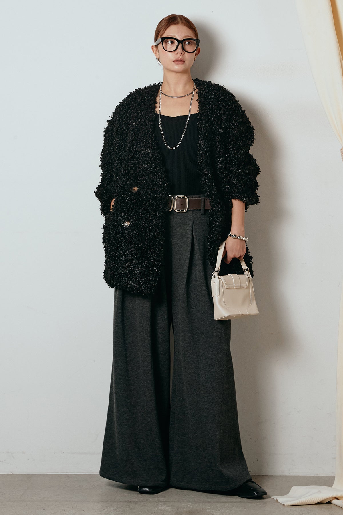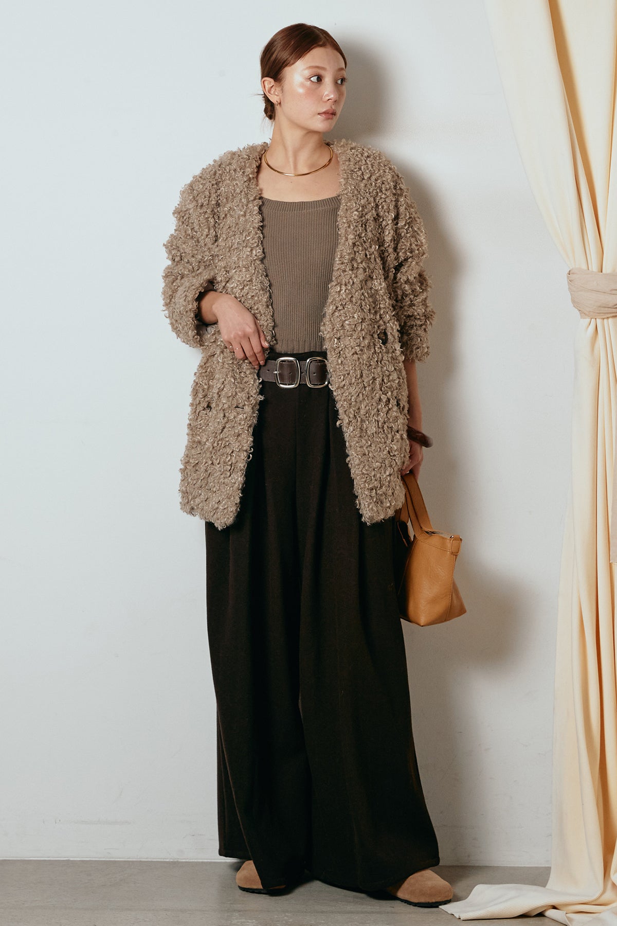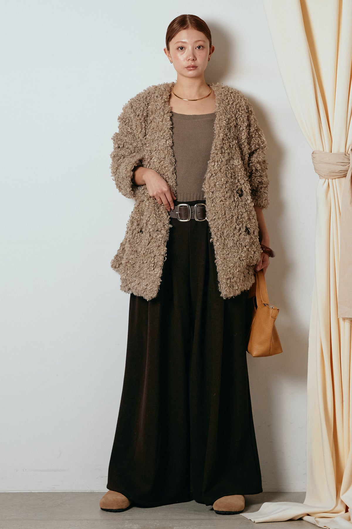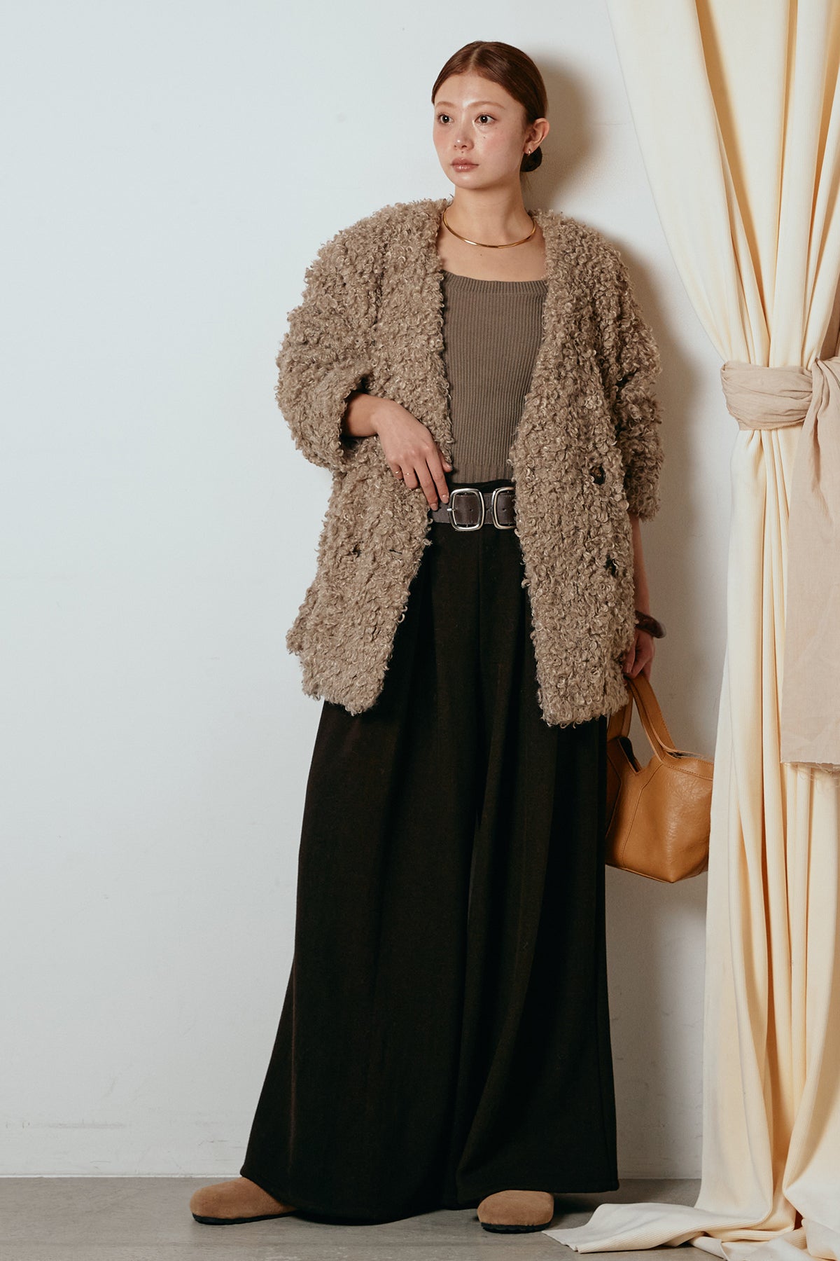 [SET]シープライクファージャケット+フェイクレザー太ベルト付きタックワイドパンツ(2set)