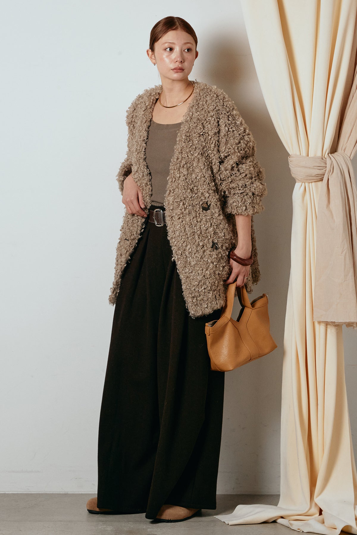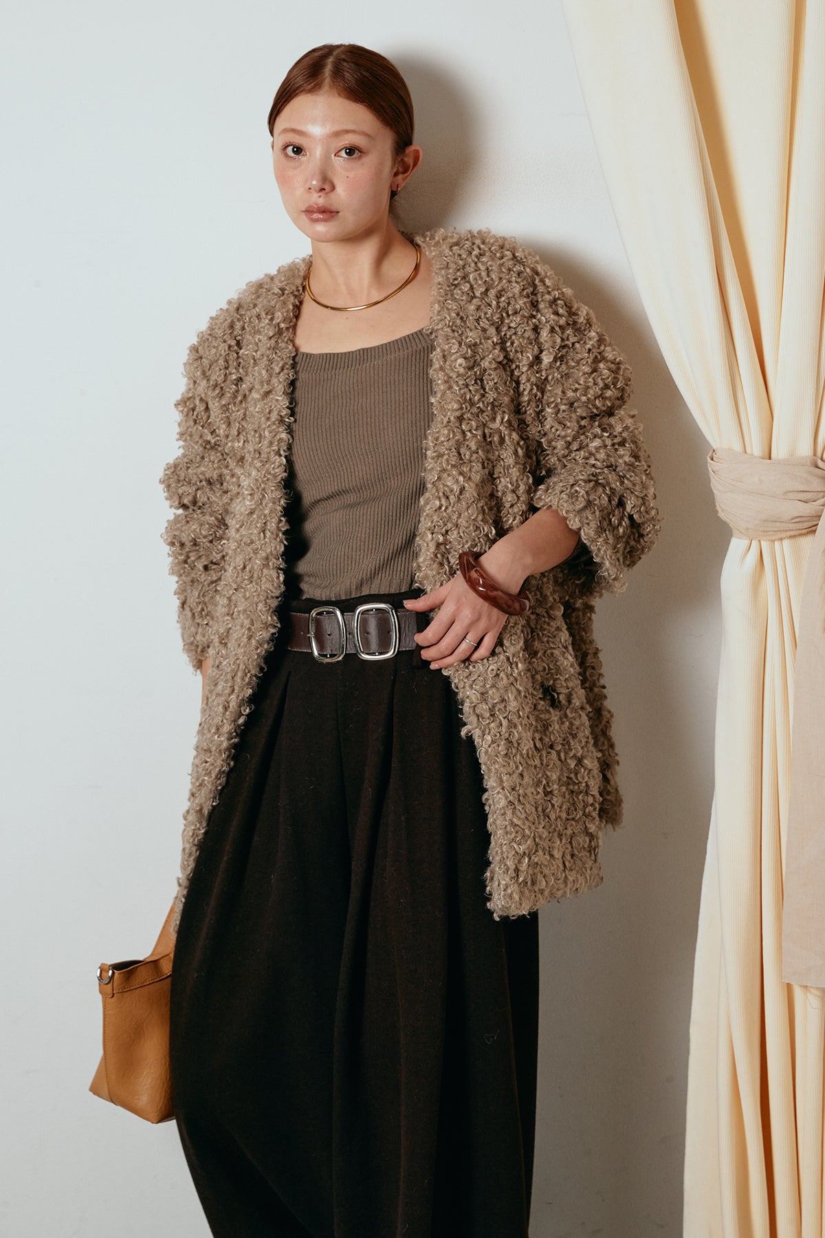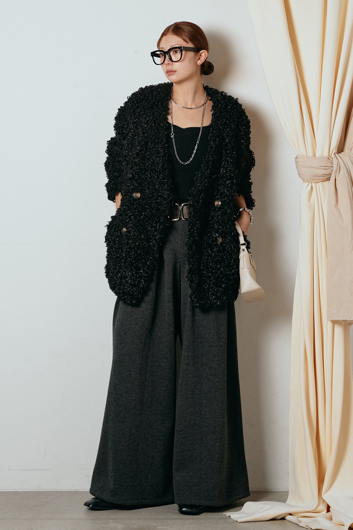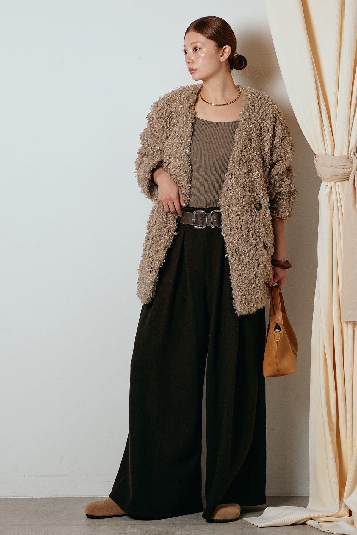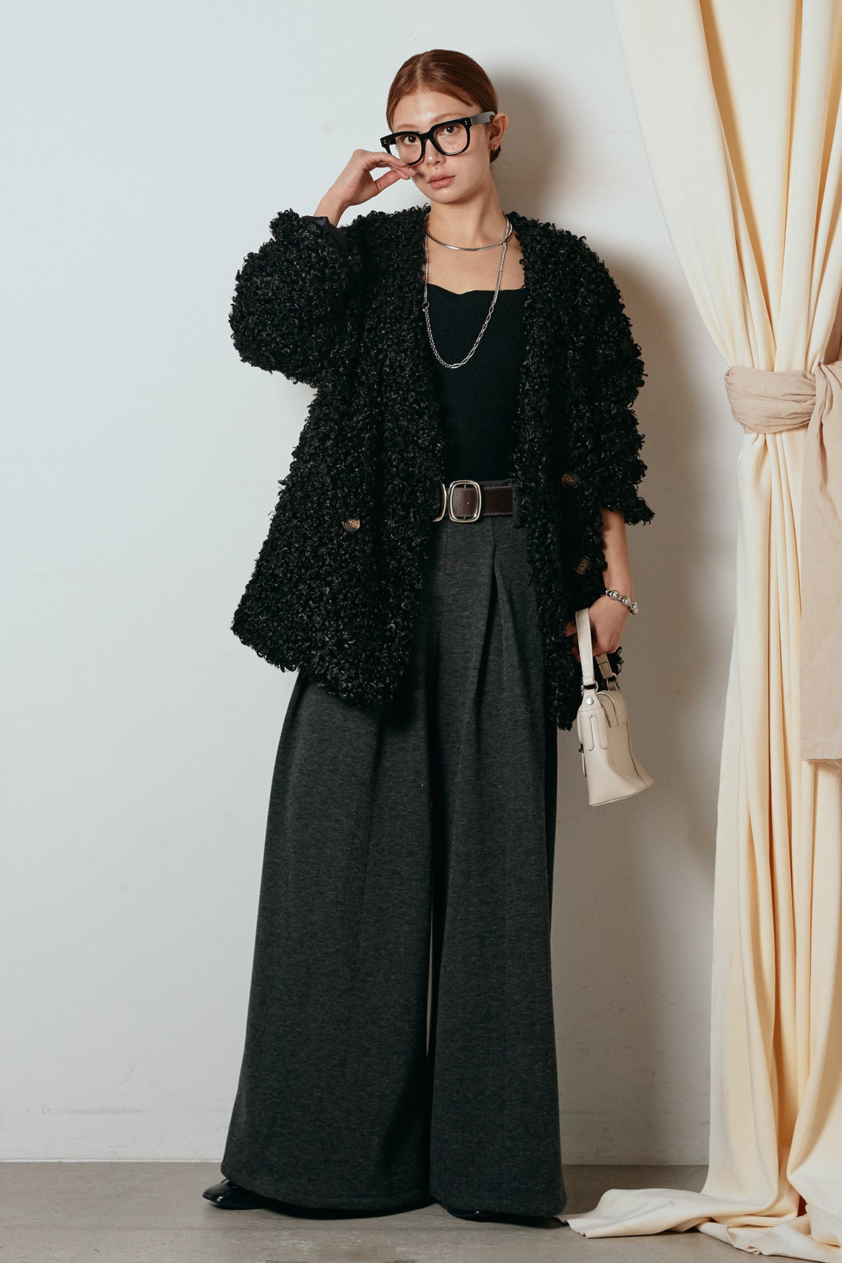 [SET]シープライクファージャケット+フェイクレザー太ベルト付きタックワイドパンツ(2set)