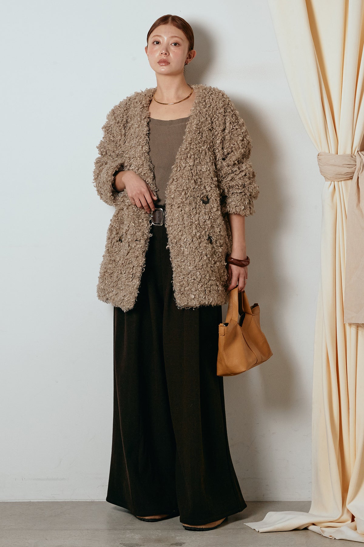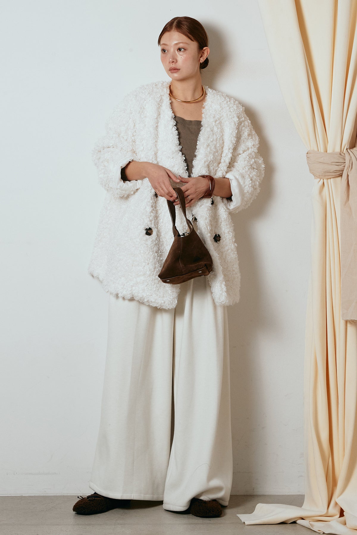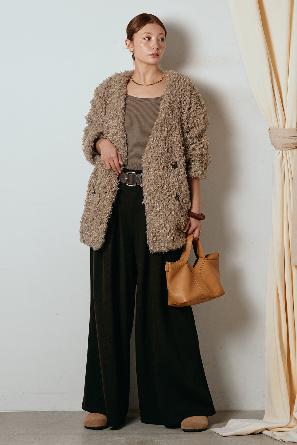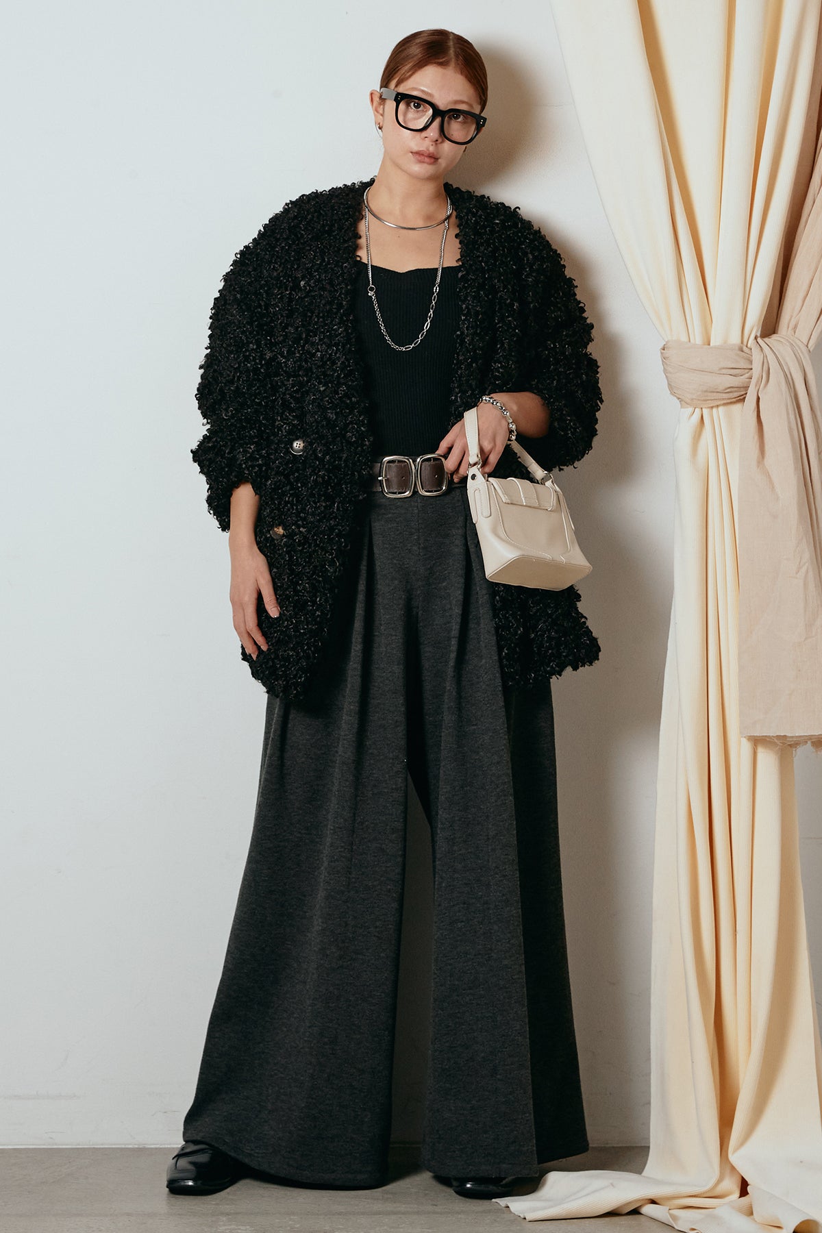 [SET]シープライクファージャケット+フェイクレザー太ベルト付きタックワイドパンツ(2set)