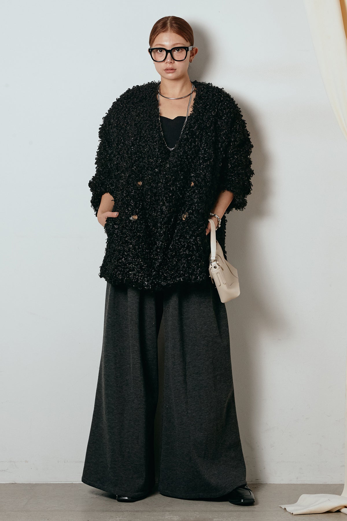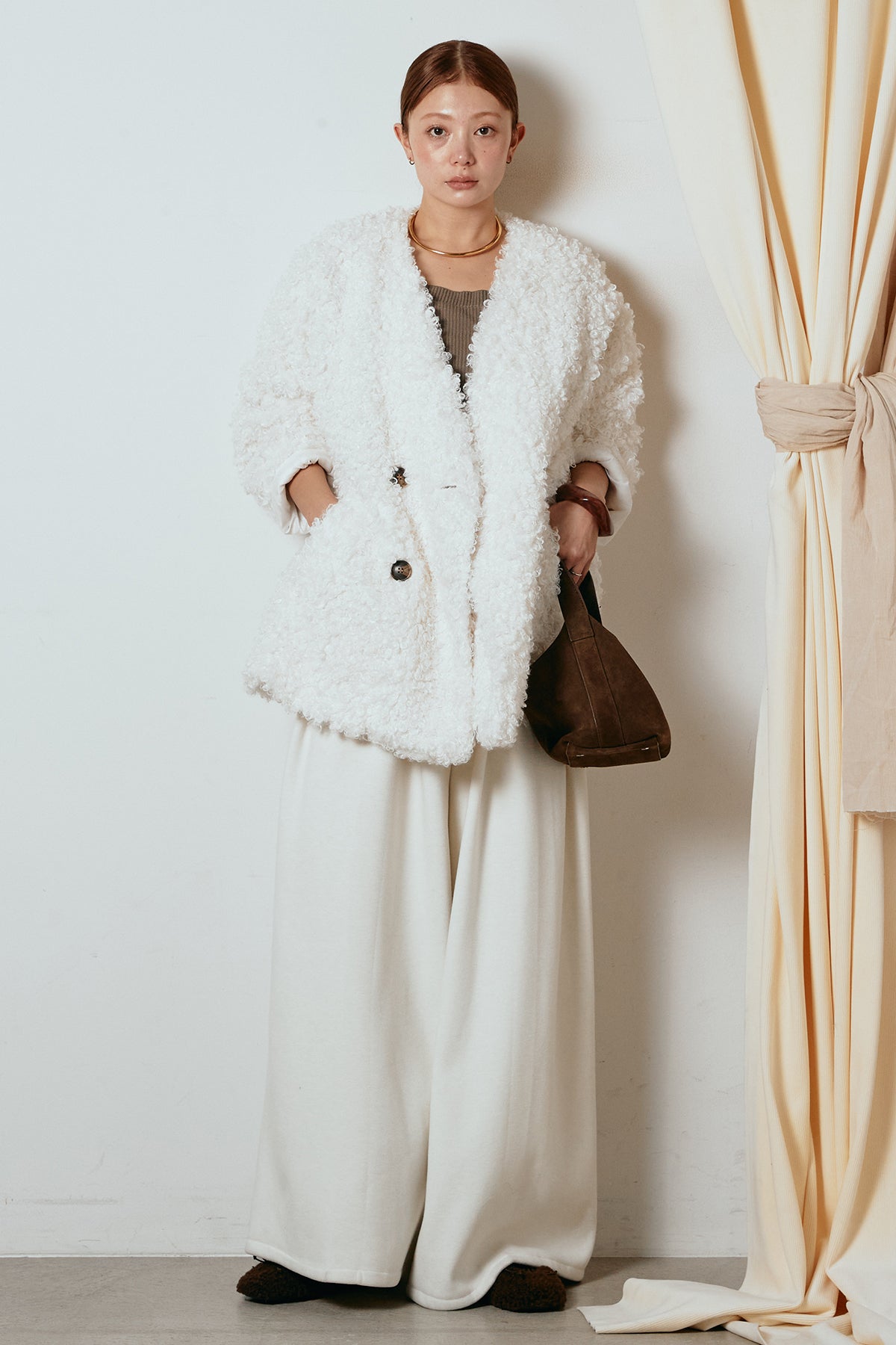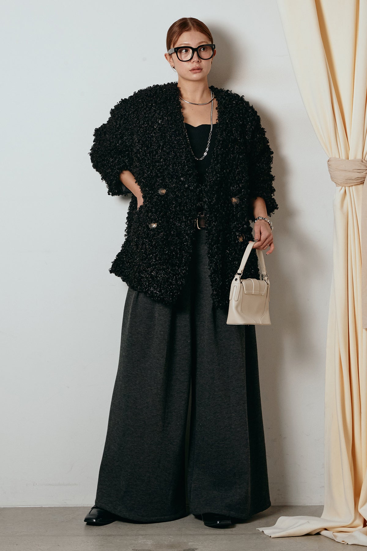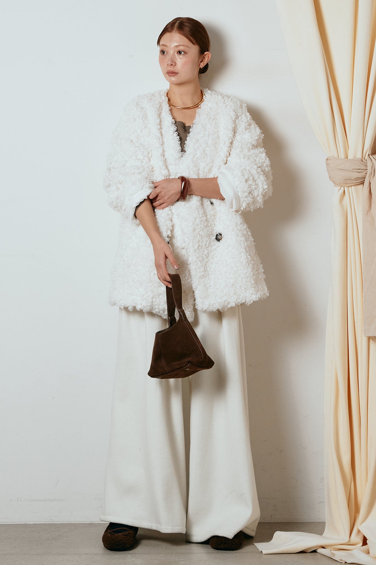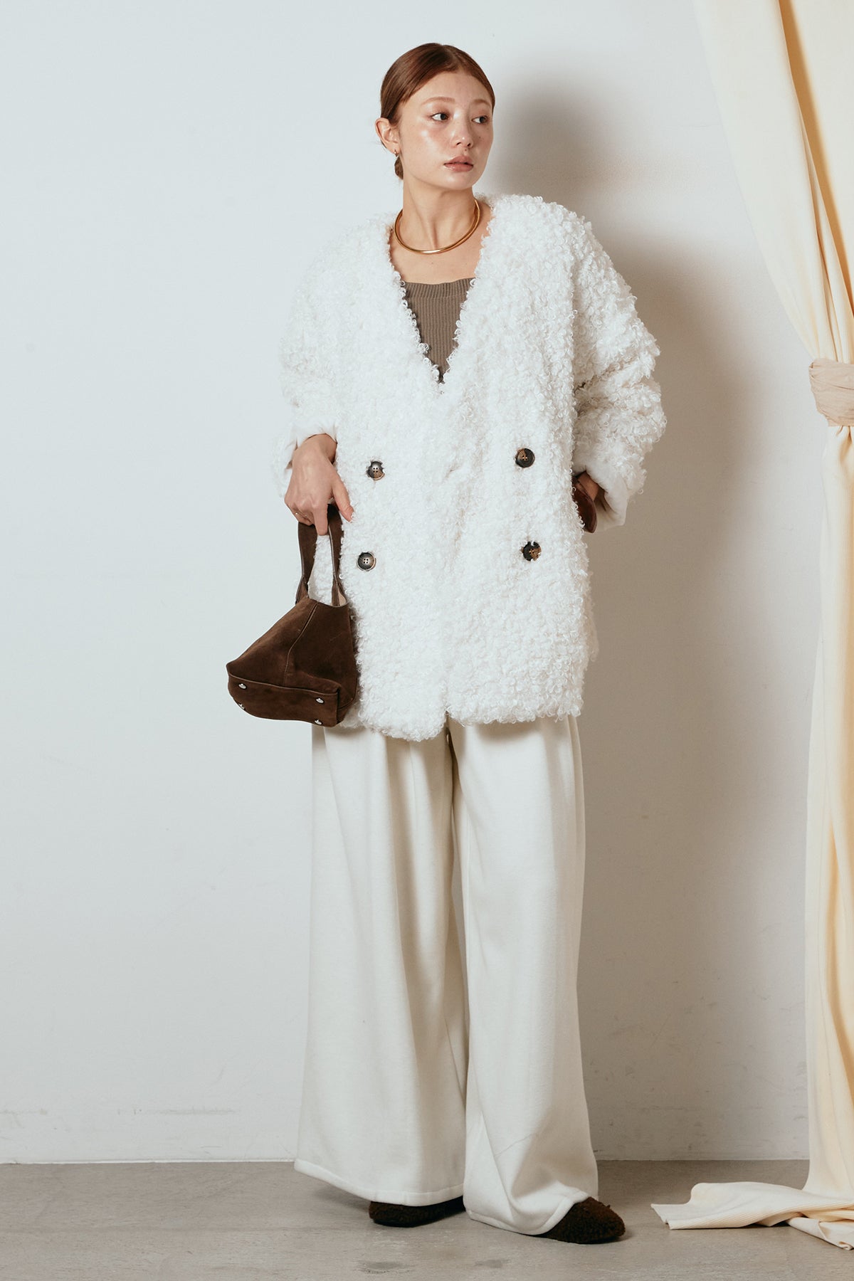 [SET]シープライクファージャケット+フェイクレザー太ベルト付きタックワイドパンツ(2set)