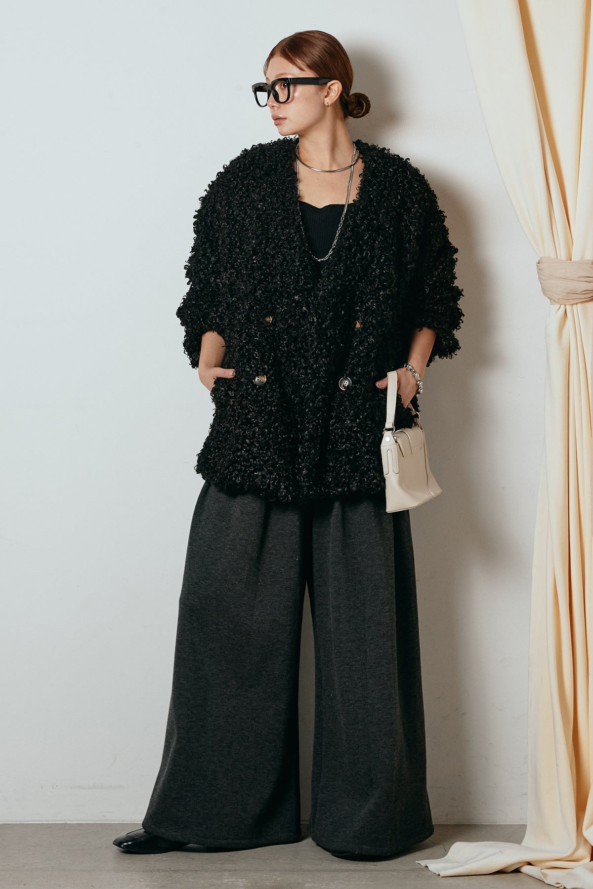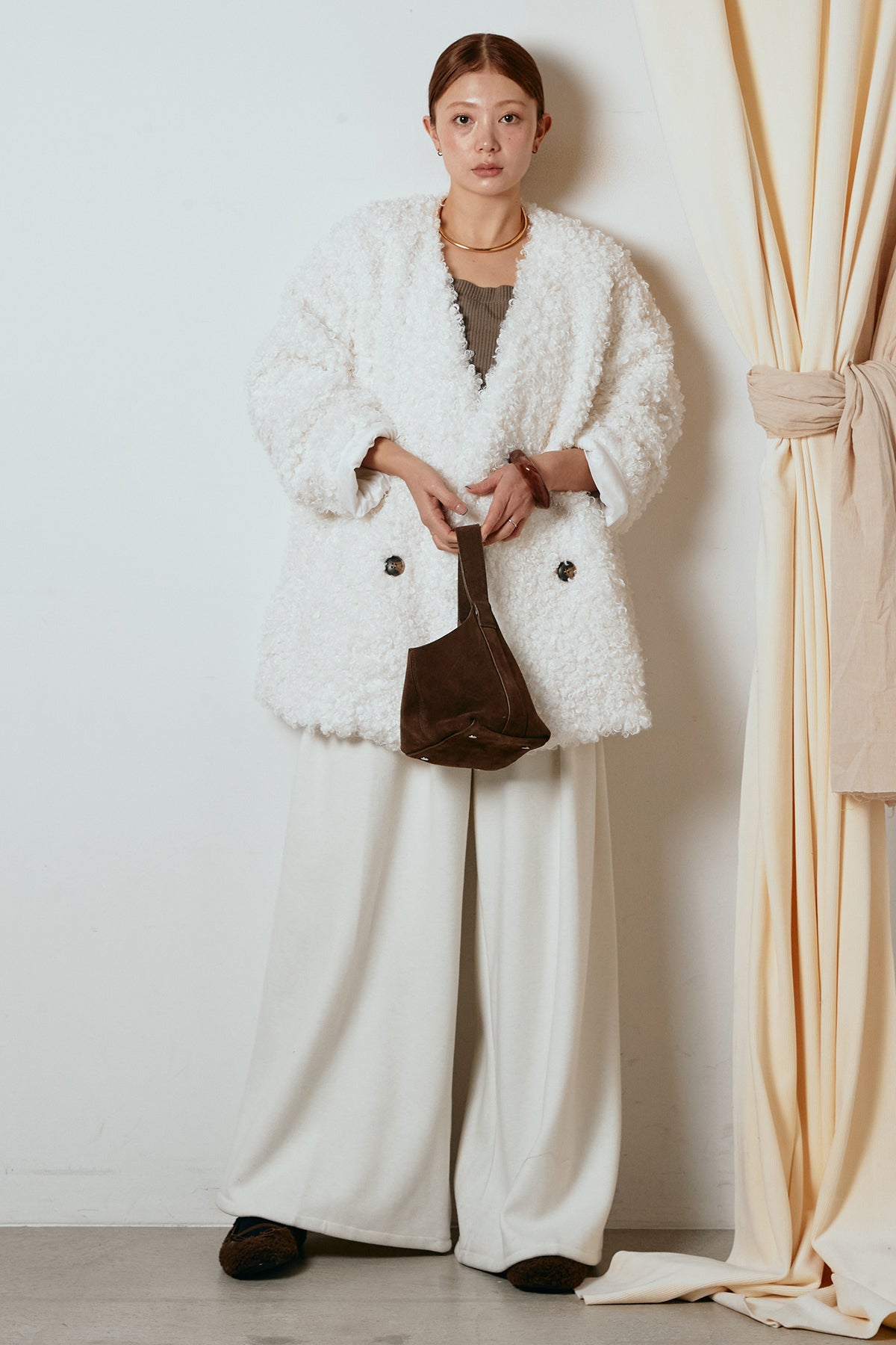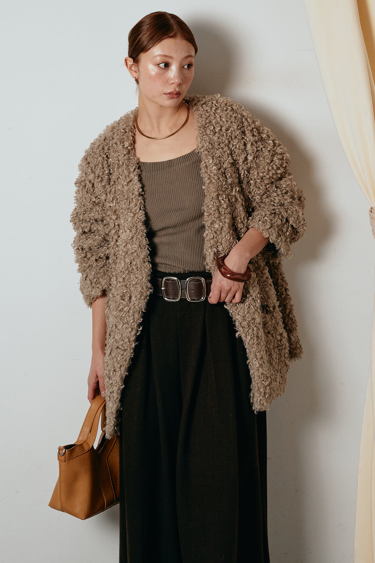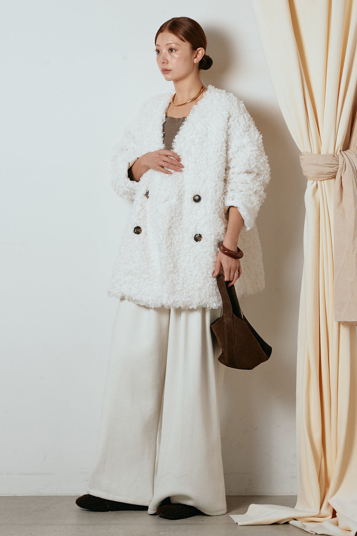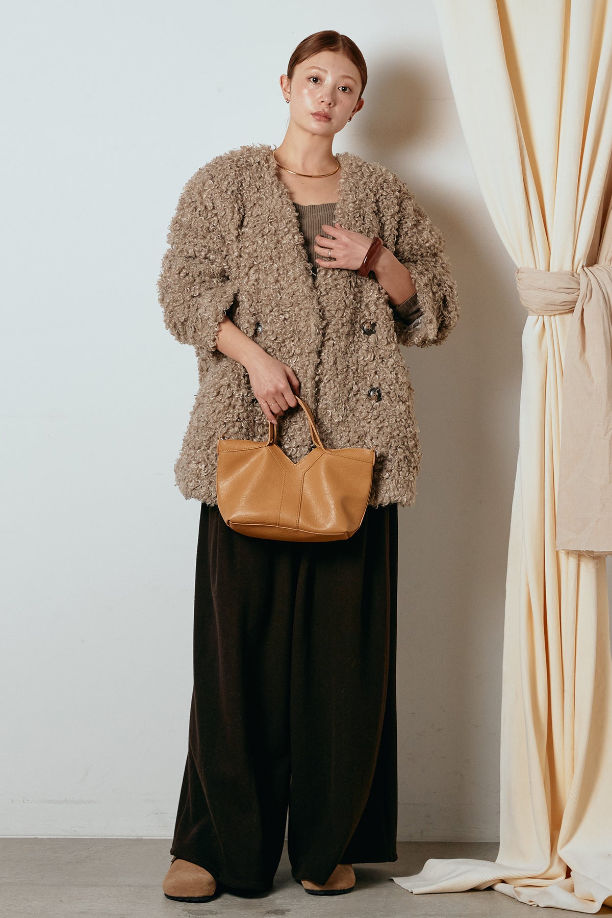 [SET]シープライクファージャケット+フェイクレザー太ベルト付きタックワイドパンツ(2set)