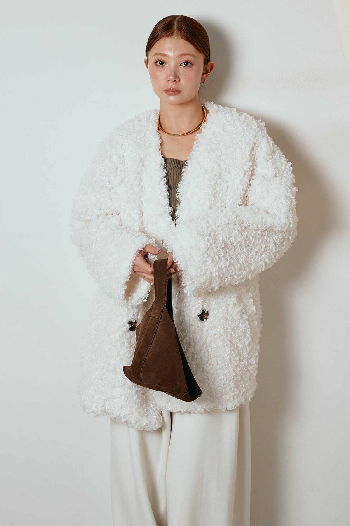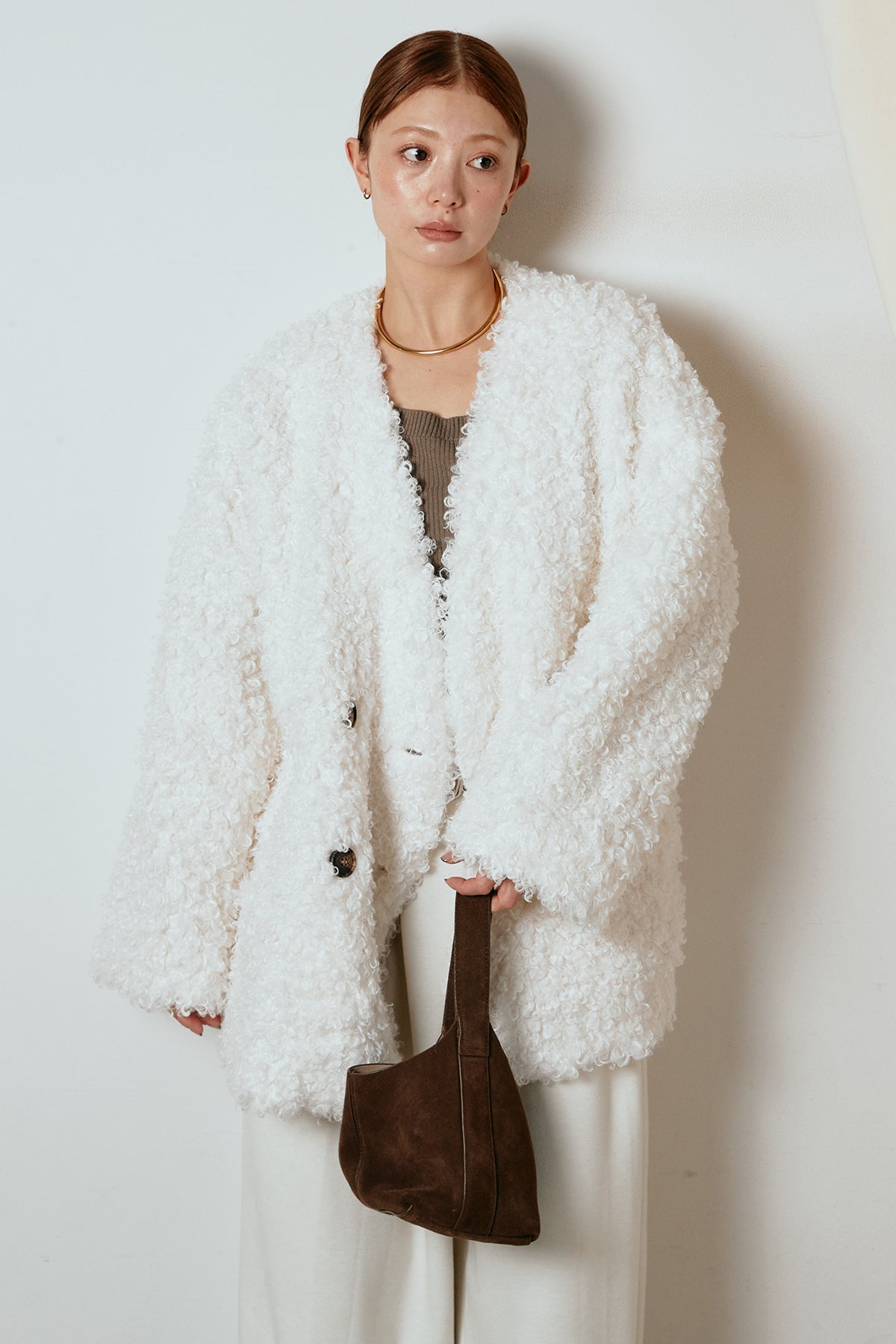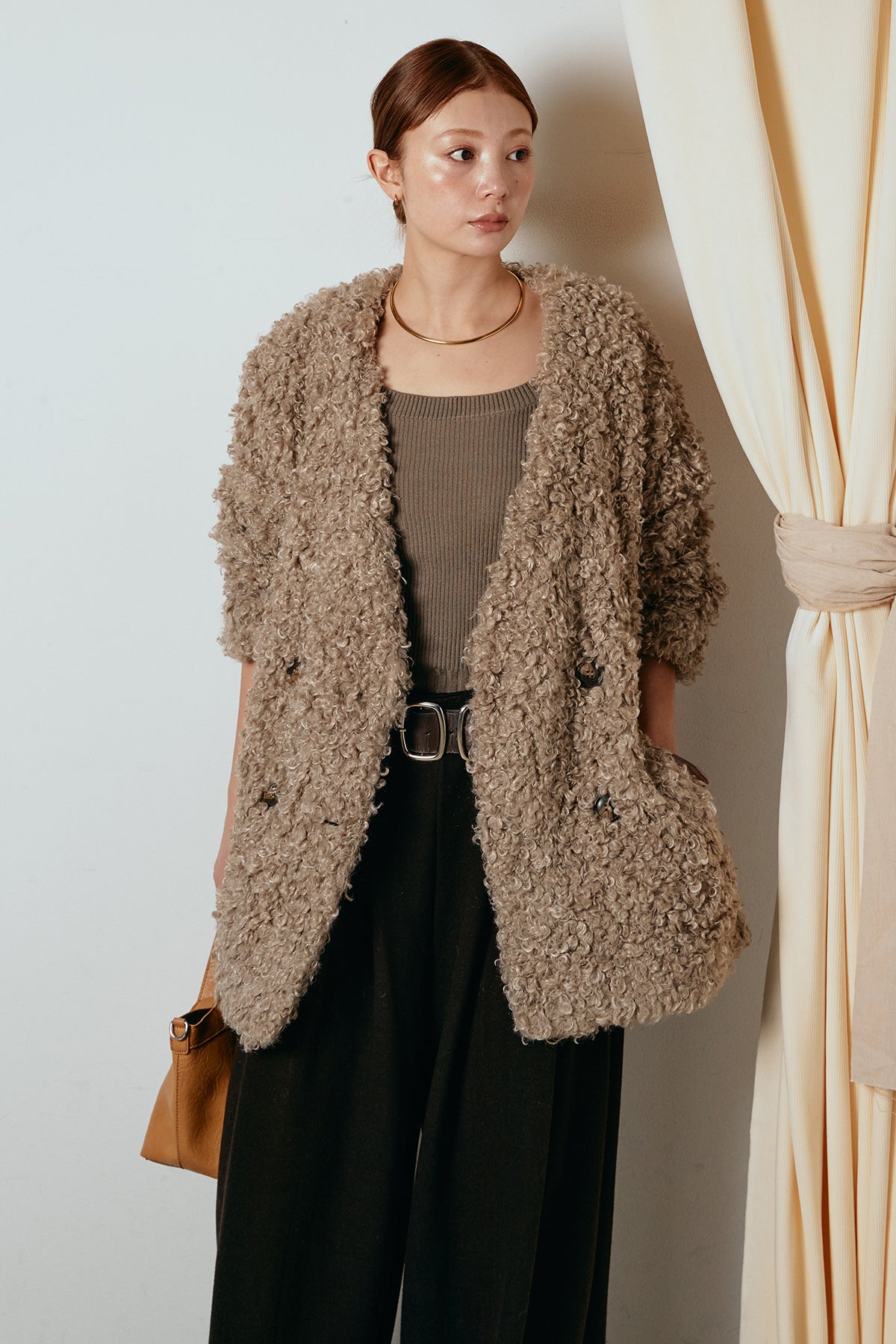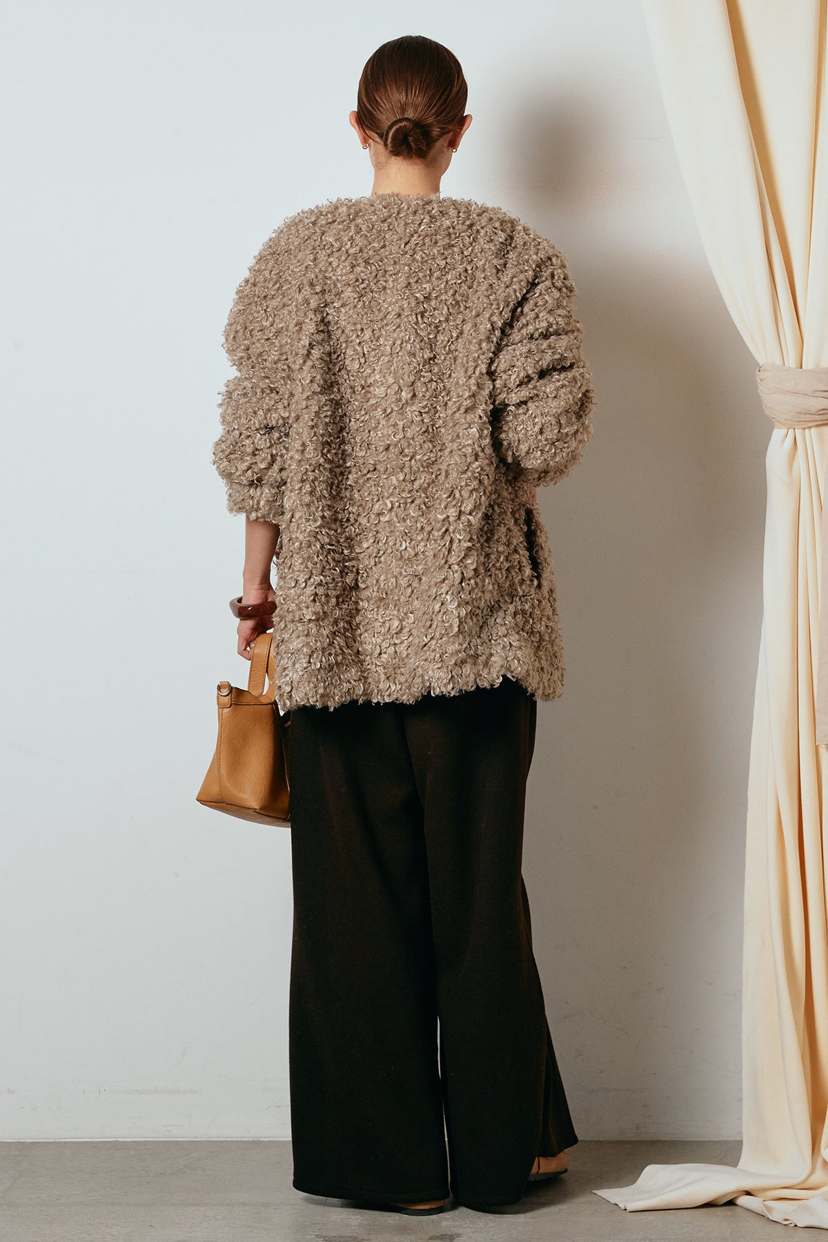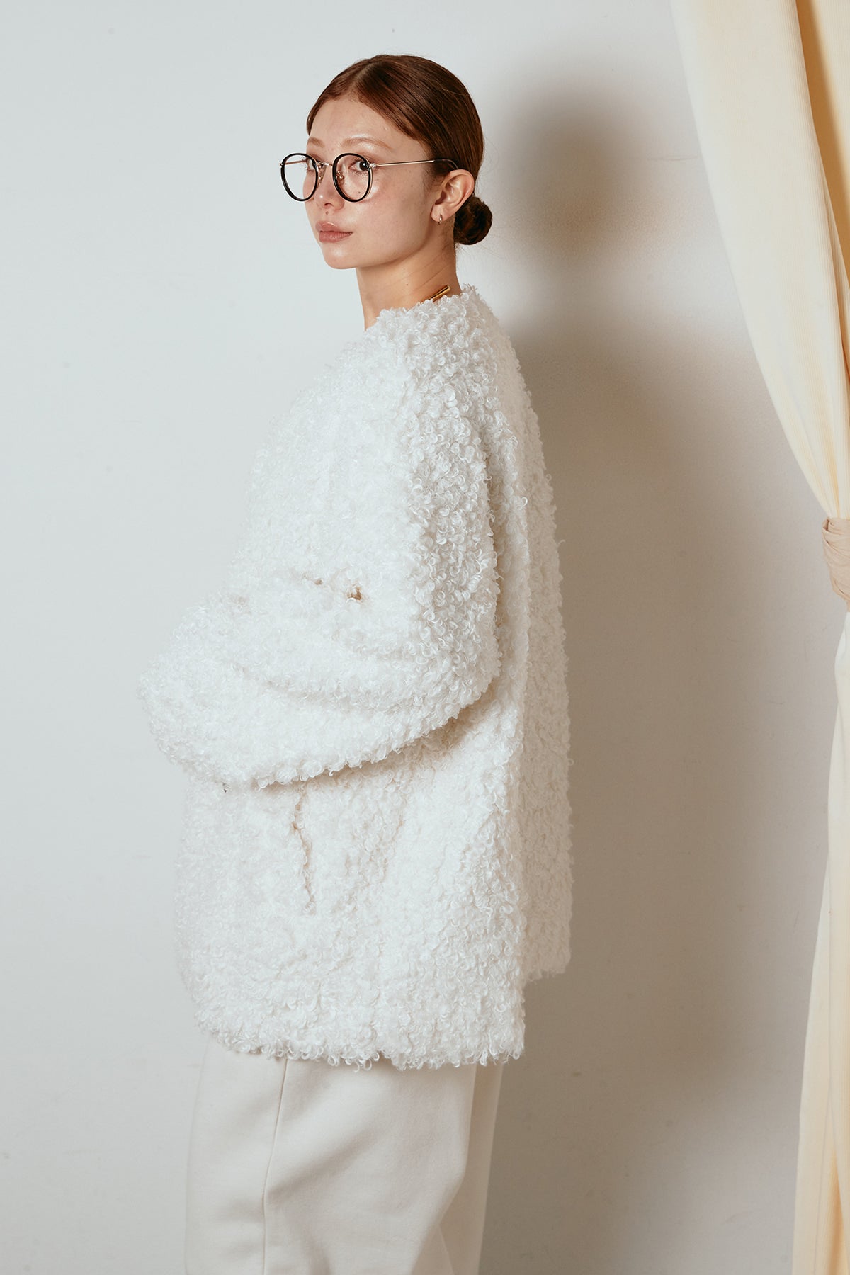 ふんわりとしたシープ調のファーが、優しいボリューム感とあたたかなムードを演出するファージャケット。柔らかな毛足が立体的な表情をつくり、シンプルなスタイリングにも存在感を添えます。前立てはすっきりとしたV開きで、インナーを問わず合わせやすいバランスに。軽やかな着心地ながらもしっかりと暖かく、デイリーからお出かけまで幅広く活躍。羽織るだけで季節感のあるスタイルが完成する一枚です。