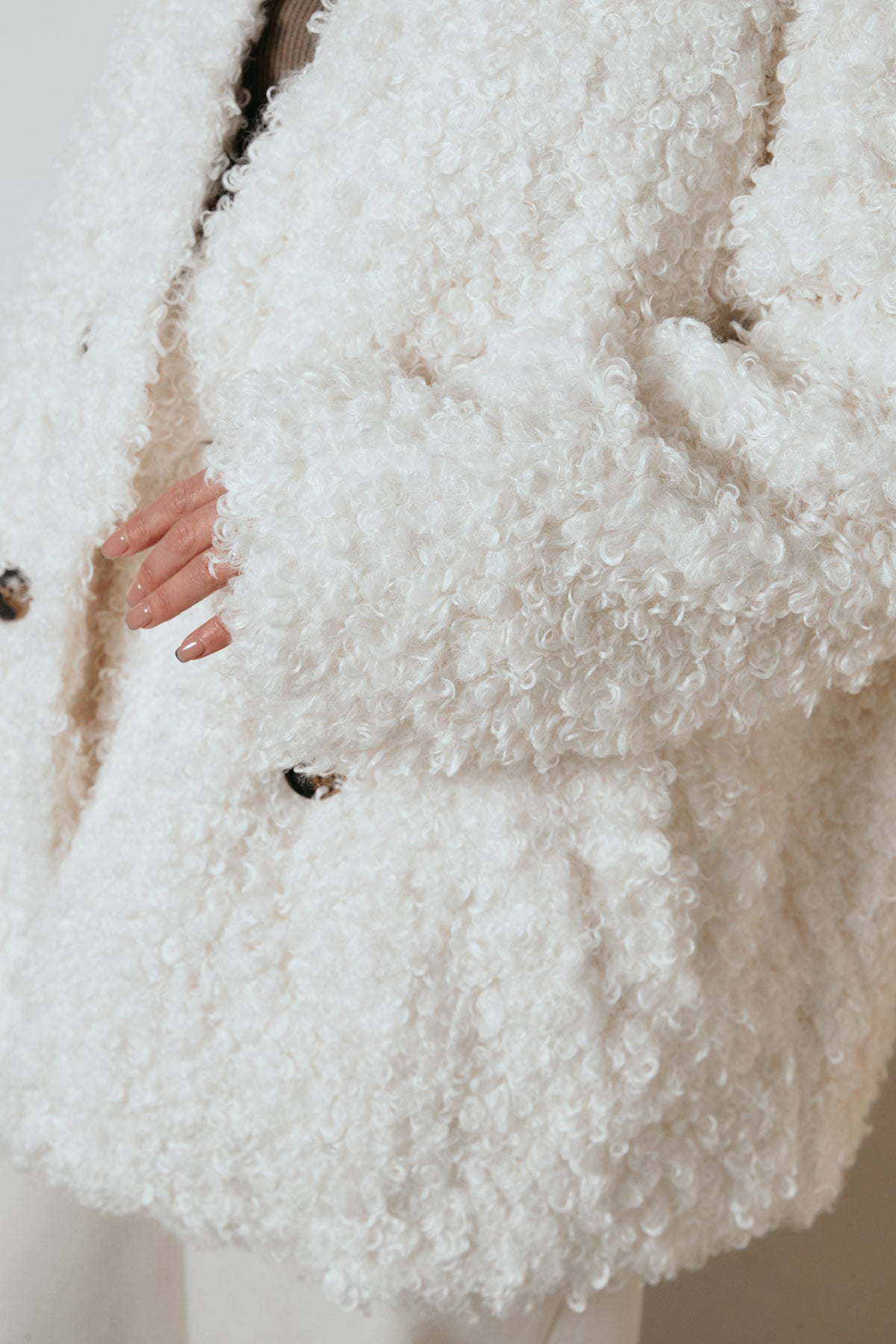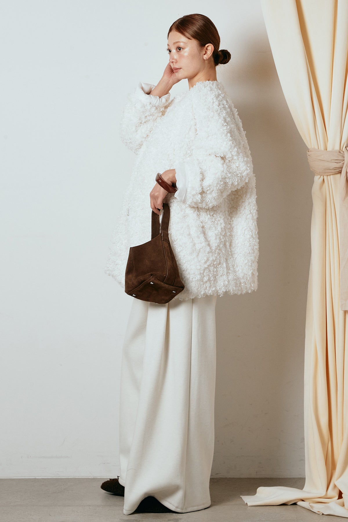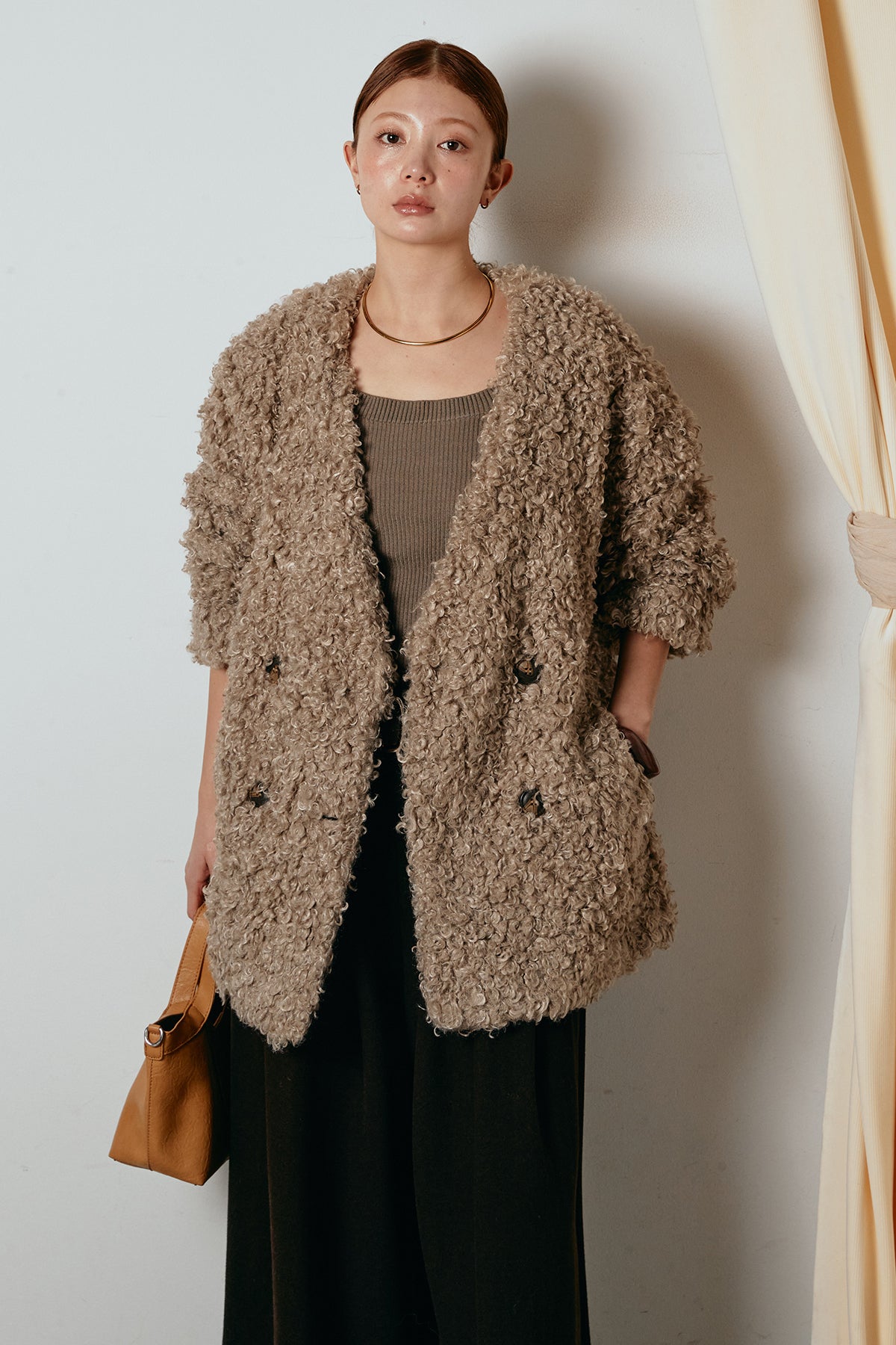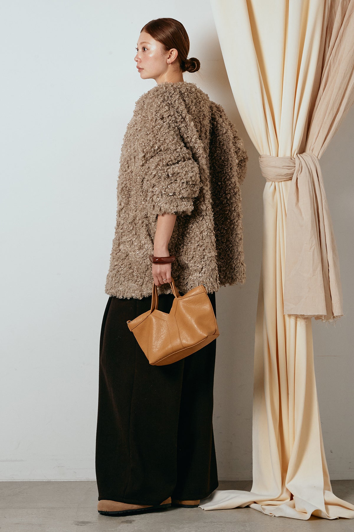 ふんわりとしたシープ調のファーが、優しいボリューム感とあたたかなムードを演出するファージャケット。柔らかな毛足が立体的な表情をつくり、シンプルなスタイリングにも存在感を添えます。前立てはすっきりとしたV開きで、インナーを問わず合わせやすいバランスに。軽やかな着心地ながらもしっかりと暖かく、デイリーからお出かけまで幅広く活躍。羽織るだけで季節感のあるスタイルが完成する一枚です。