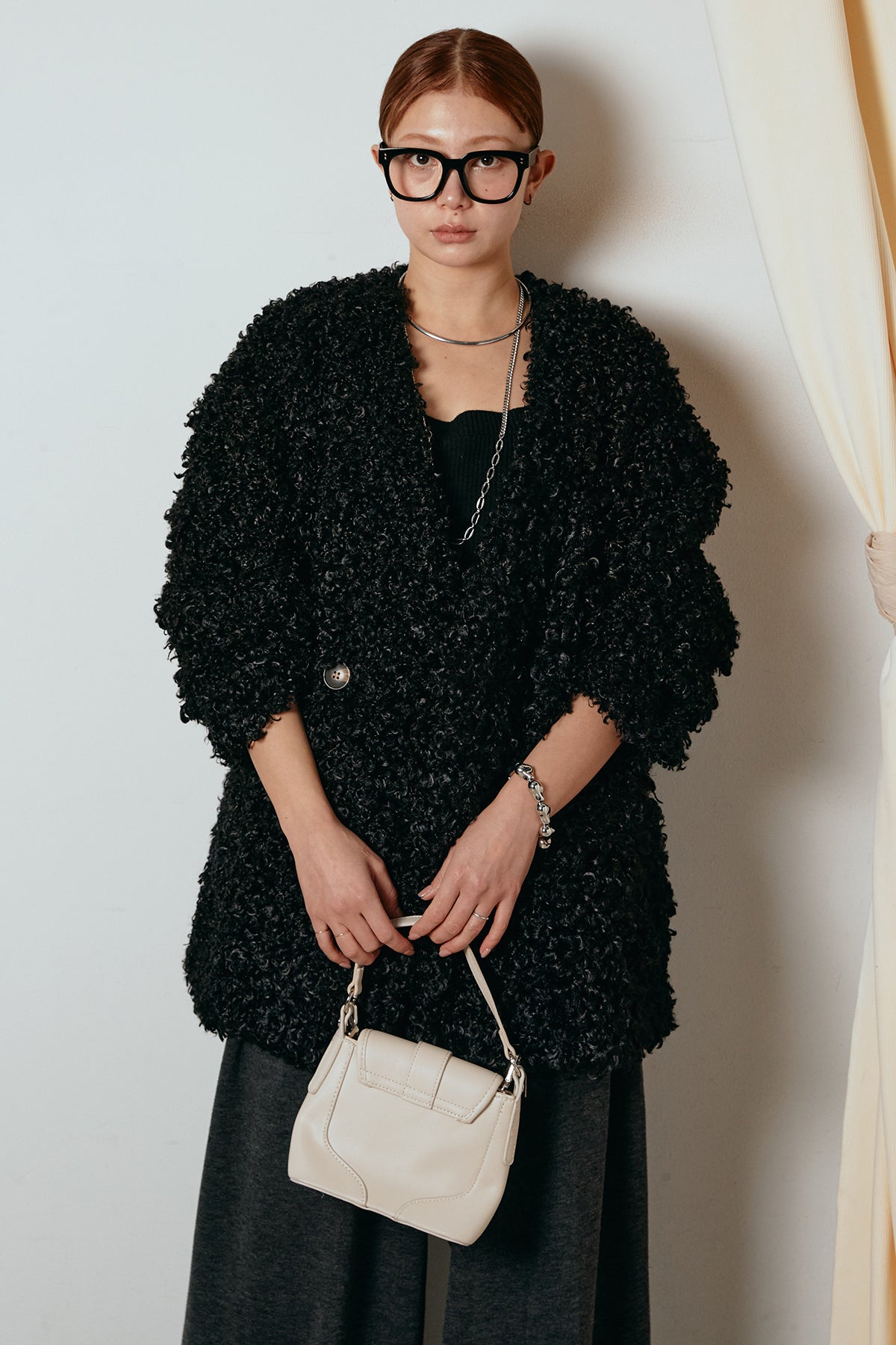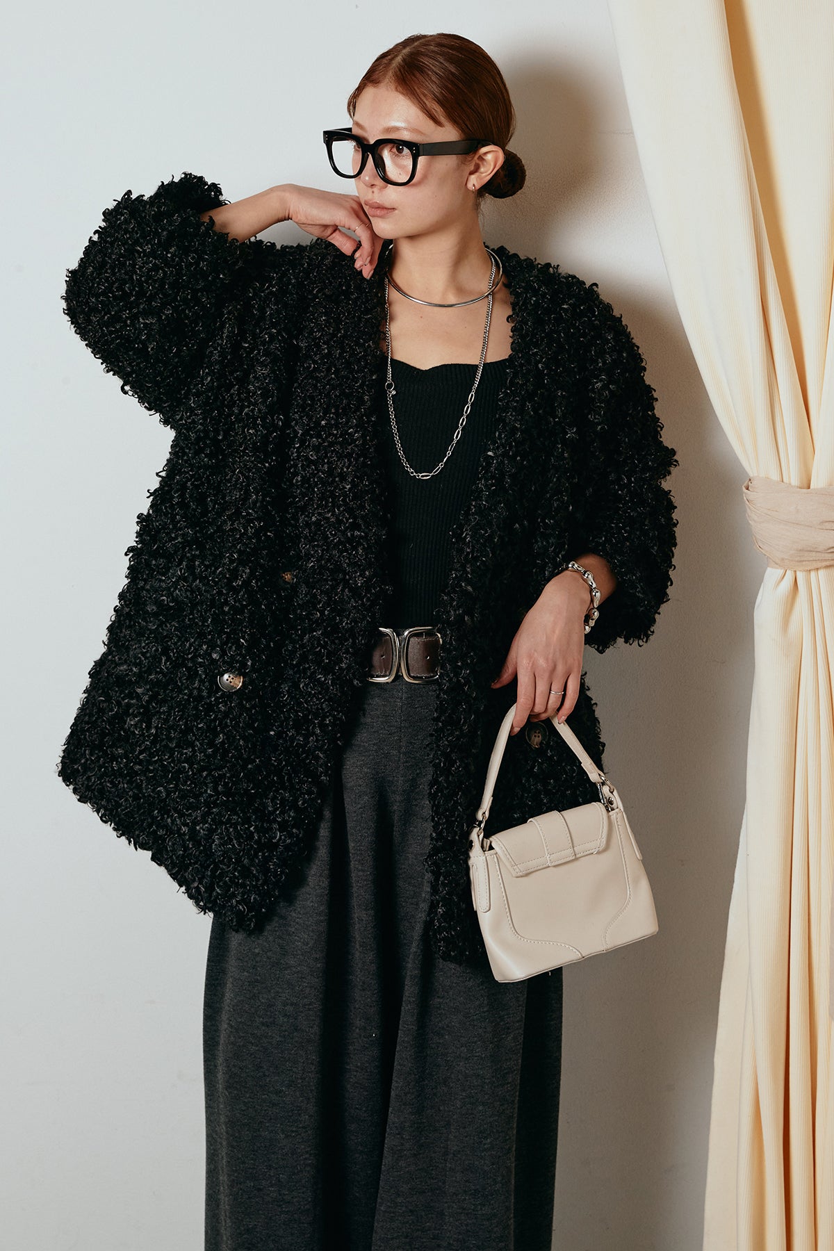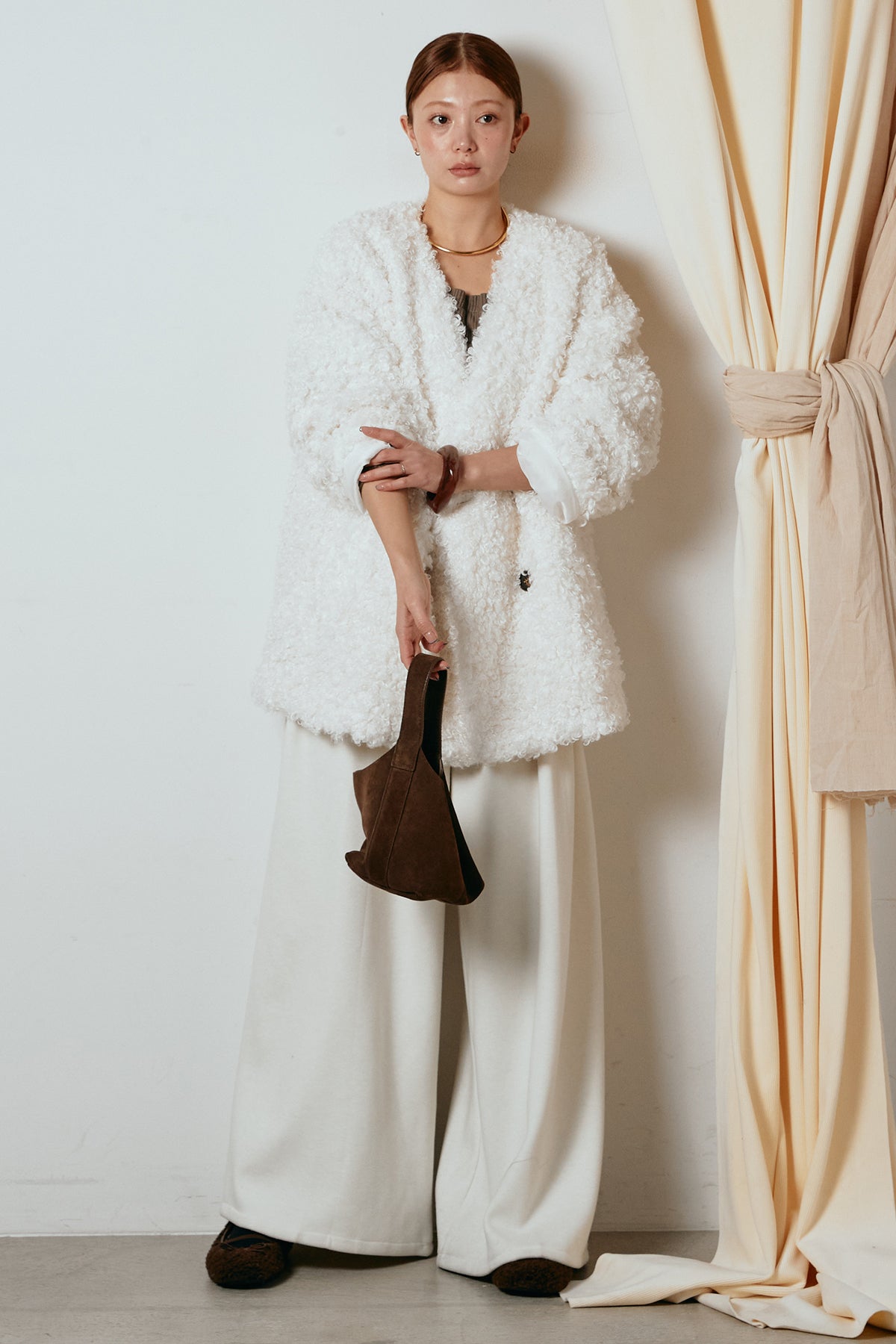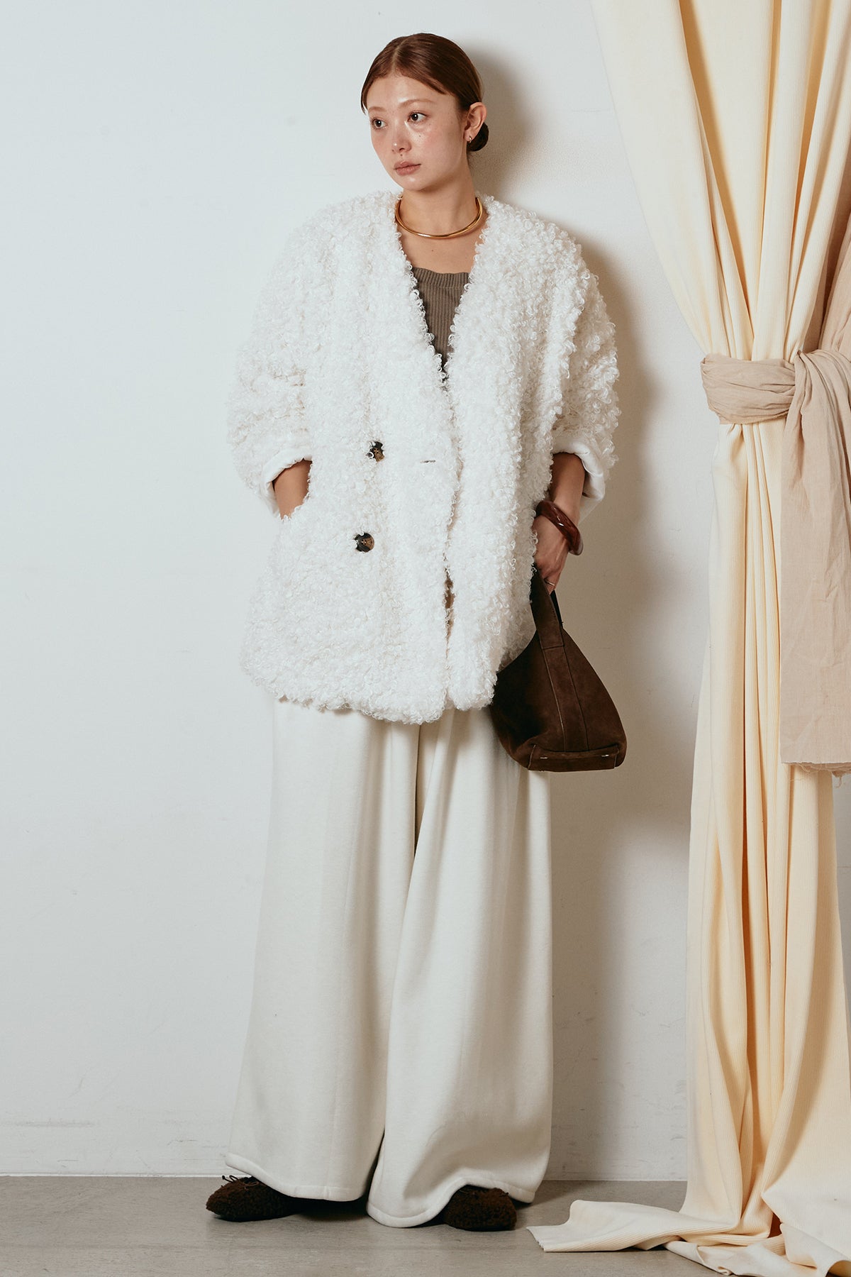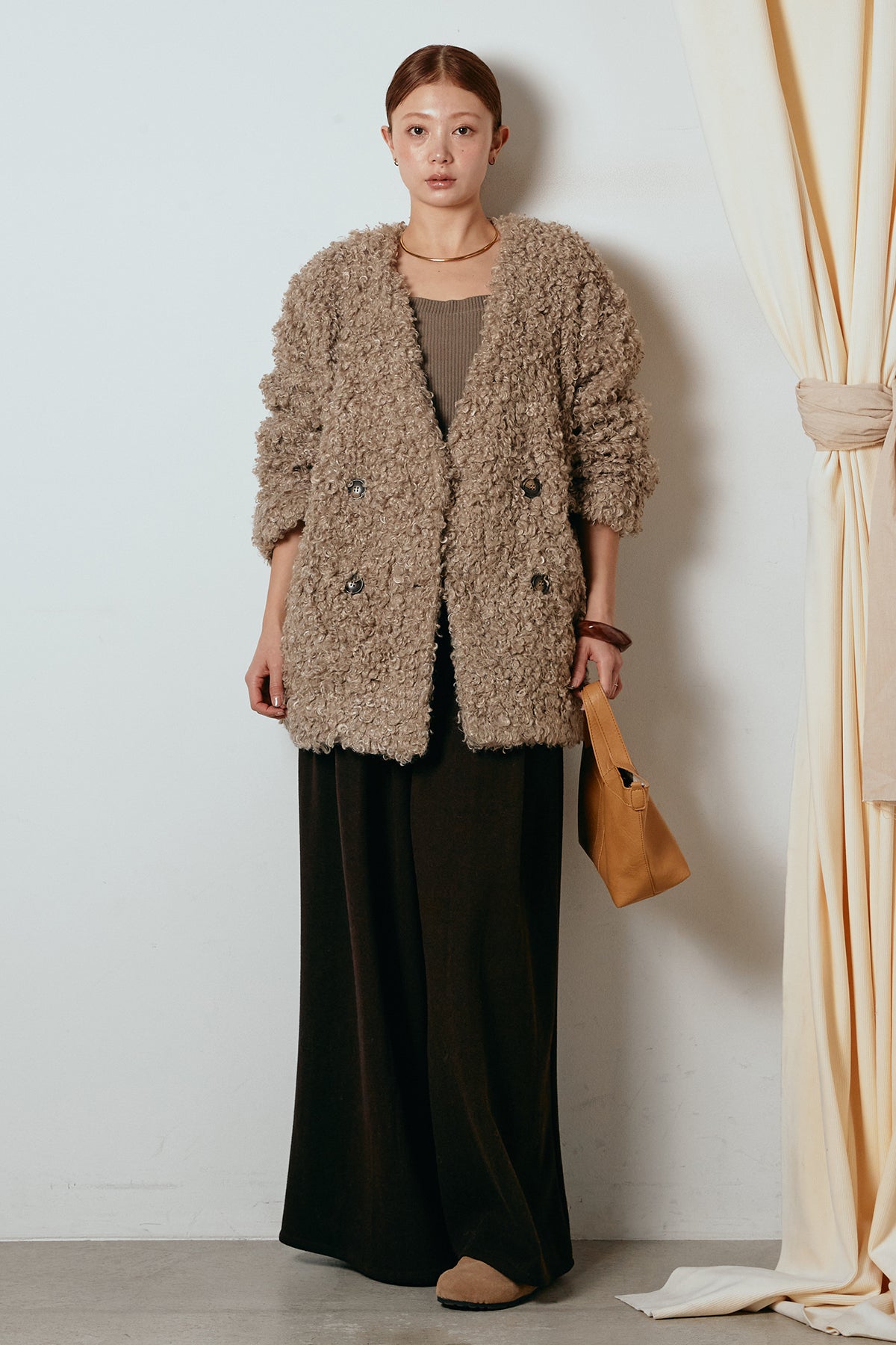 ふんわりとしたシープ調のファーが、優しいボリューム感とあたたかなムードを演出するファージャケット。柔らかな毛足が立体的な表情をつくり、シンプルなスタイリングにも存在感を添えます。前立てはすっきりとしたV開きで、インナーを問わず合わせやすいバランスに。軽やかな着心地ながらもしっかりと暖かく、デイリーからお出かけまで幅広く活躍。羽織るだけで季節感のあるスタイルが完成する一枚です。