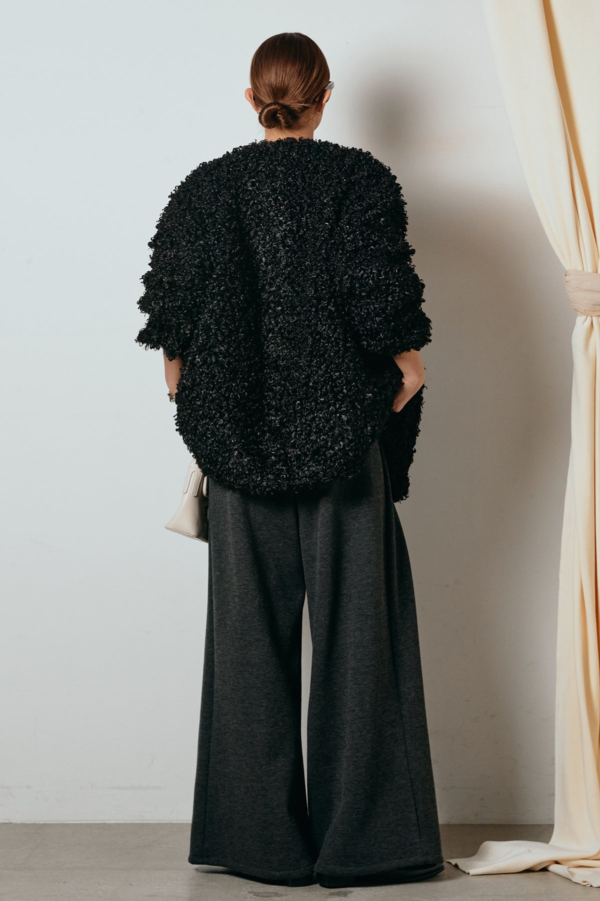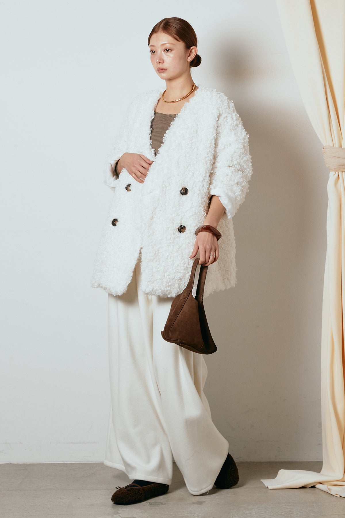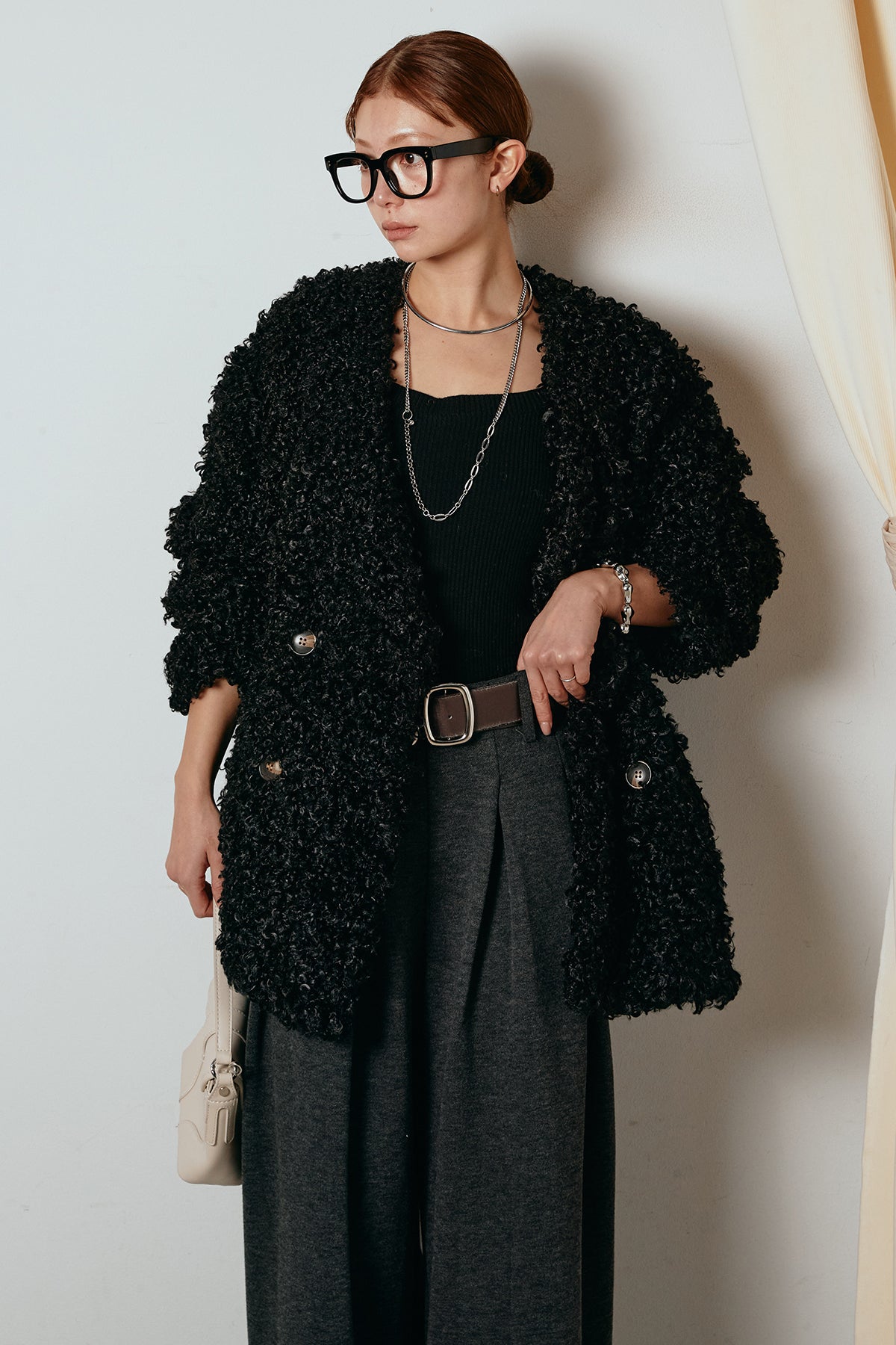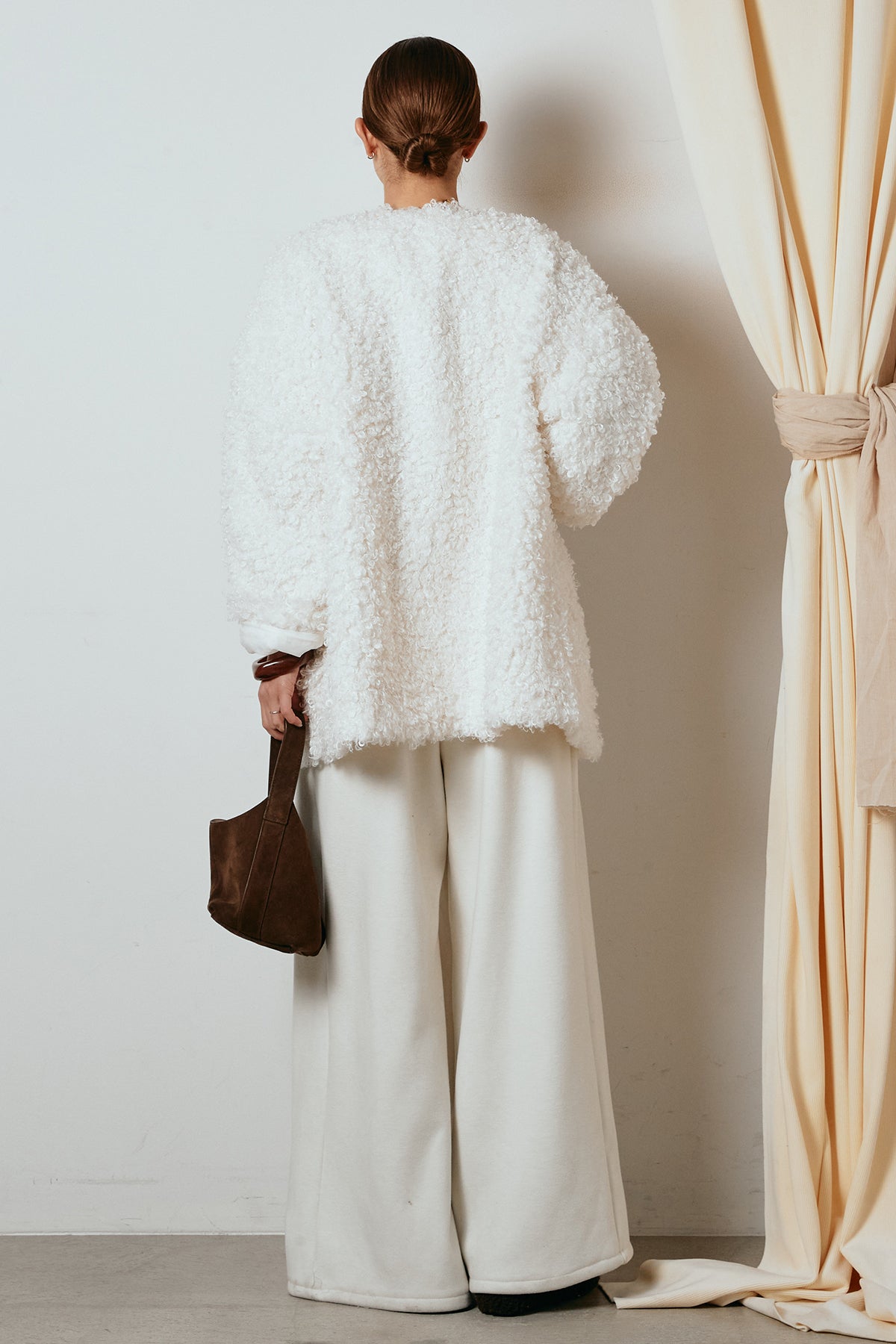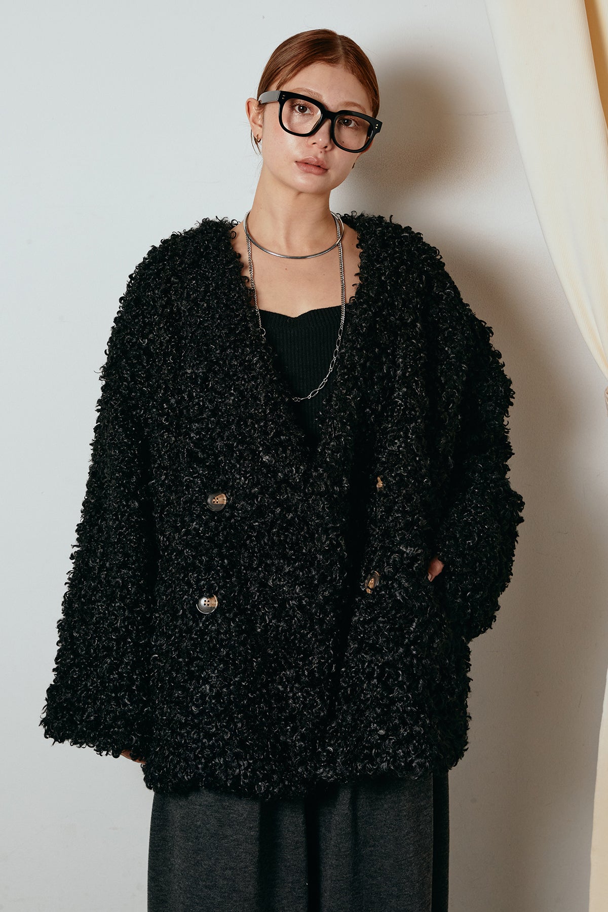ふんわりとしたシープ調のファーが、優しいボリューム感とあたたかなムードを演出するファージャケット。柔らかな毛足が立体的な表情をつくり、シンプルなスタイリングにも存在感を添えます。前立てはすっきりとしたV開きで、インナーを問わず合わせやすいバランスに。軽やかな着心地ながらもしっかりと暖かく、デイリーからお出かけまで幅広く活躍。羽織るだけで季節感のあるスタイルが完成する一枚です。