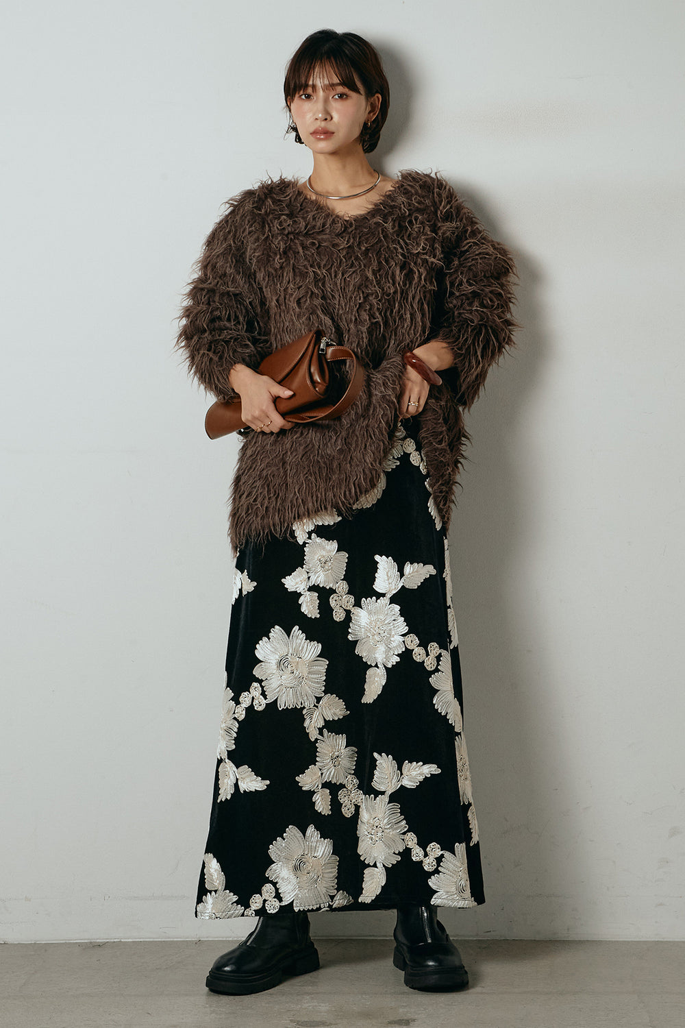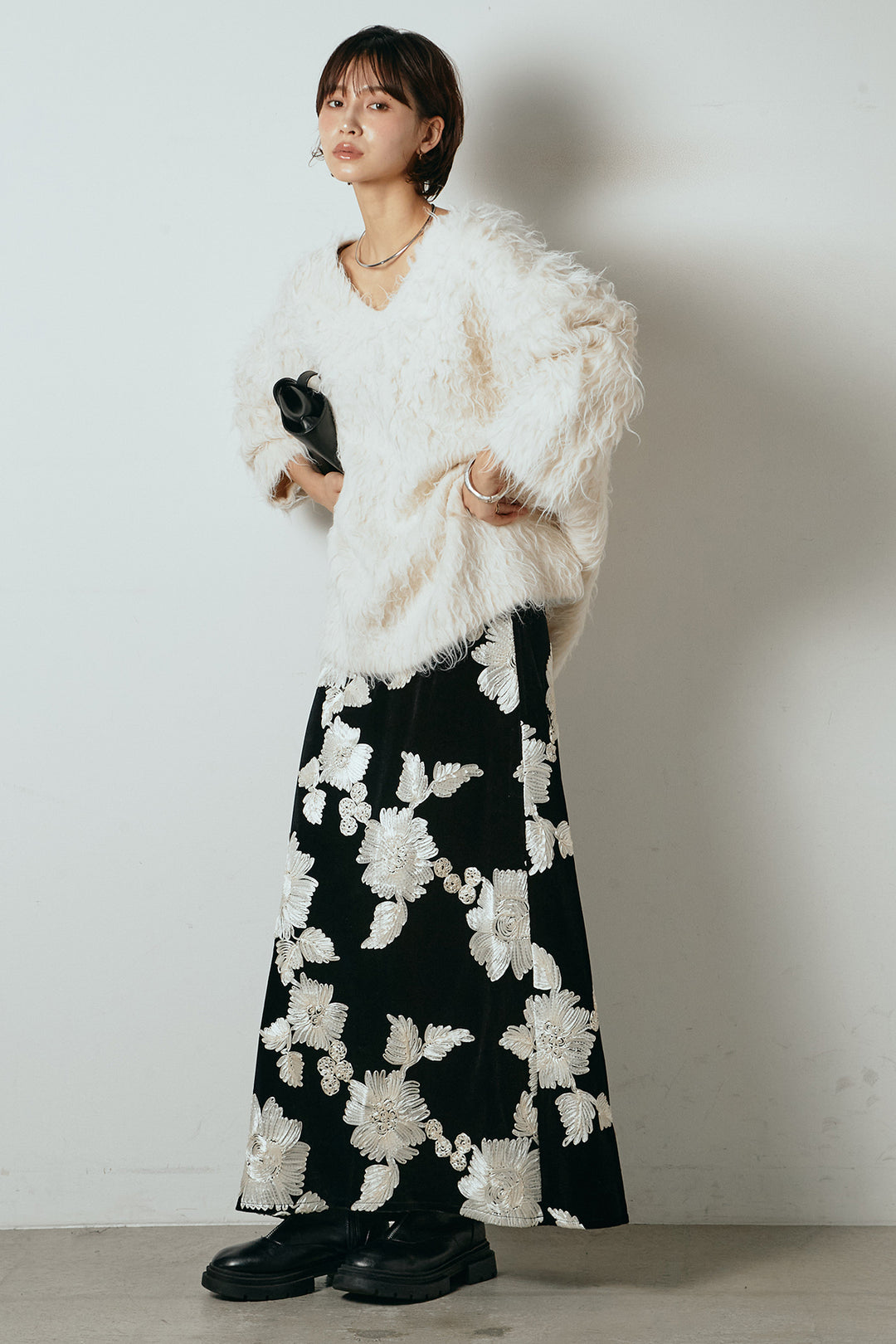 [SET]深Vネックシャギーニットトップス+フラワー刺繍ワイドスカート(2set)