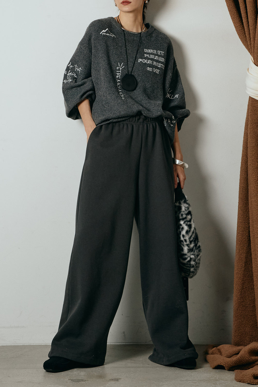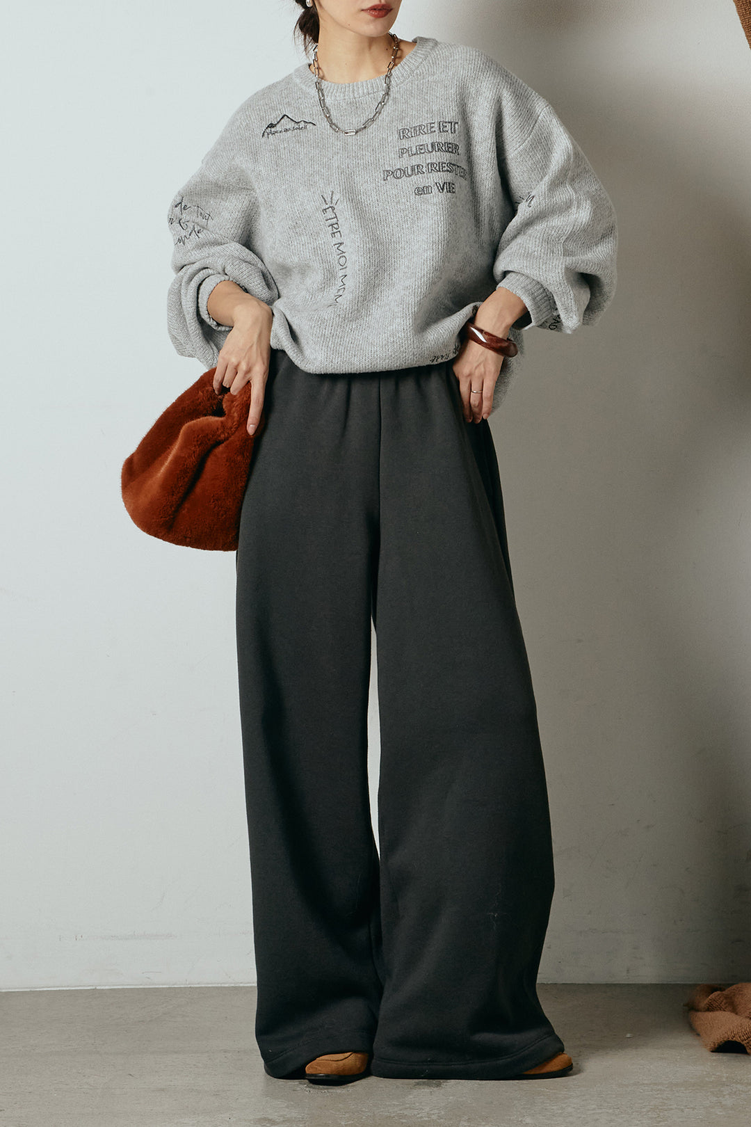 [SET]刺繍ロゴランダムデザインニットトップス+裏起毛スウェットワイドパンツ(2set)