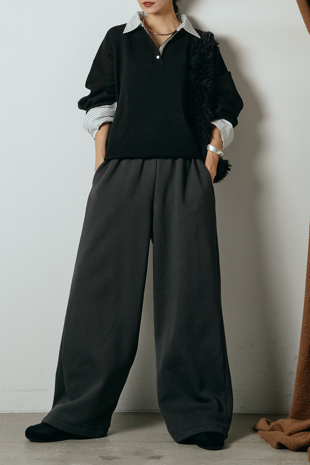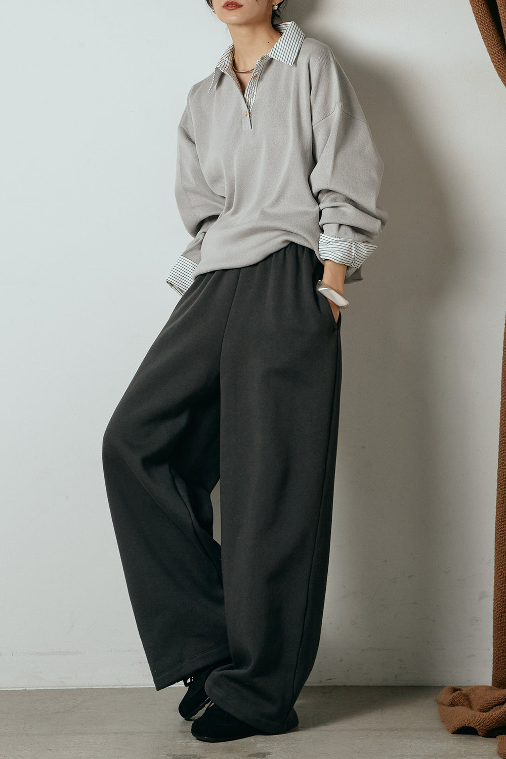 [SET]ストライプシャツドッキングポロトップス+裏起毛スウェットワイドパンツ(2set)