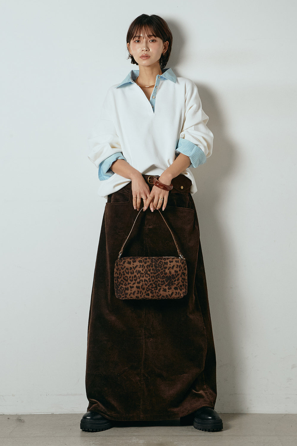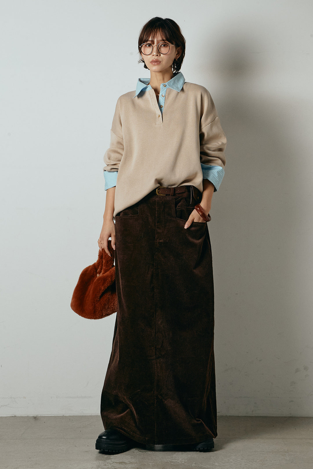 [SET]ストライプシャツドッキングポロトップス+ポーチベルト付きコーデュロイワイドスカート(2set)