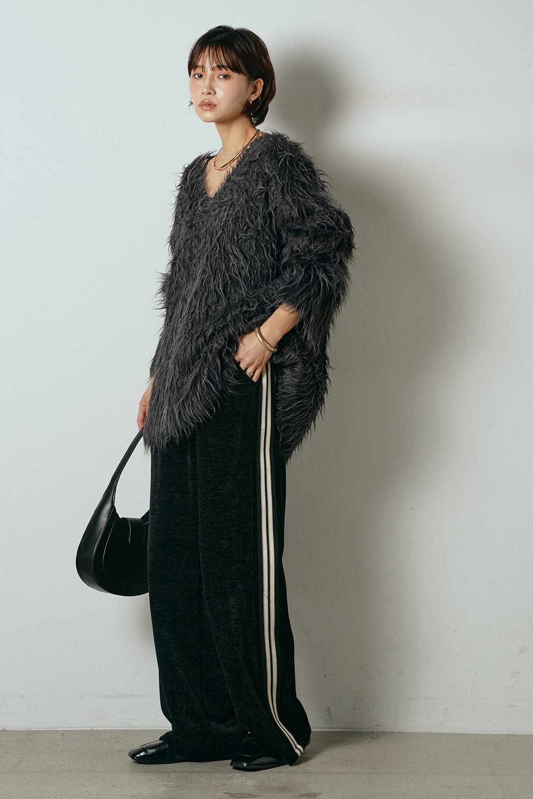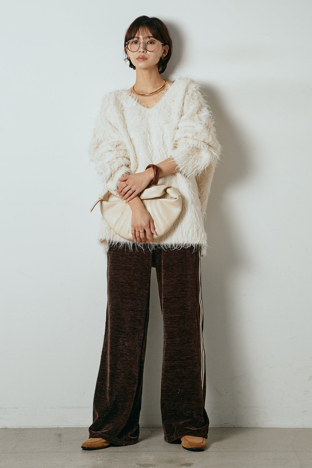 [SET]深Vネックシャギーニットトップス+リラックスサイドラインベロアワイドパンツ(2set)