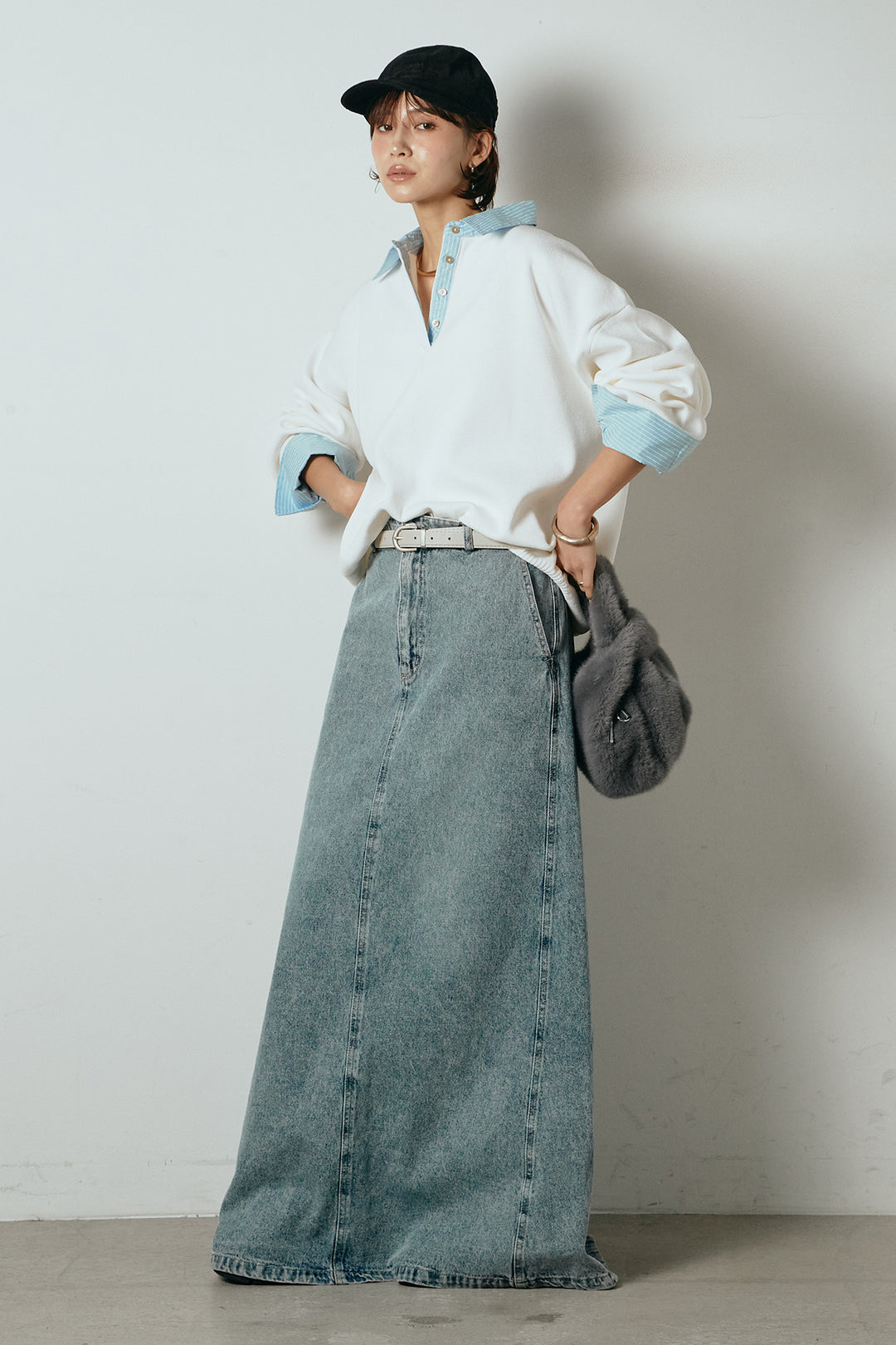 [SET]ストライプシャツドッキングポロトップス+デニムロングフレアスカート(2set)