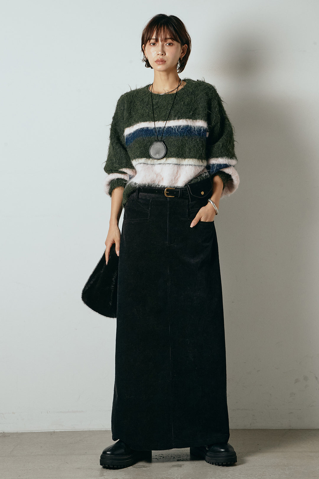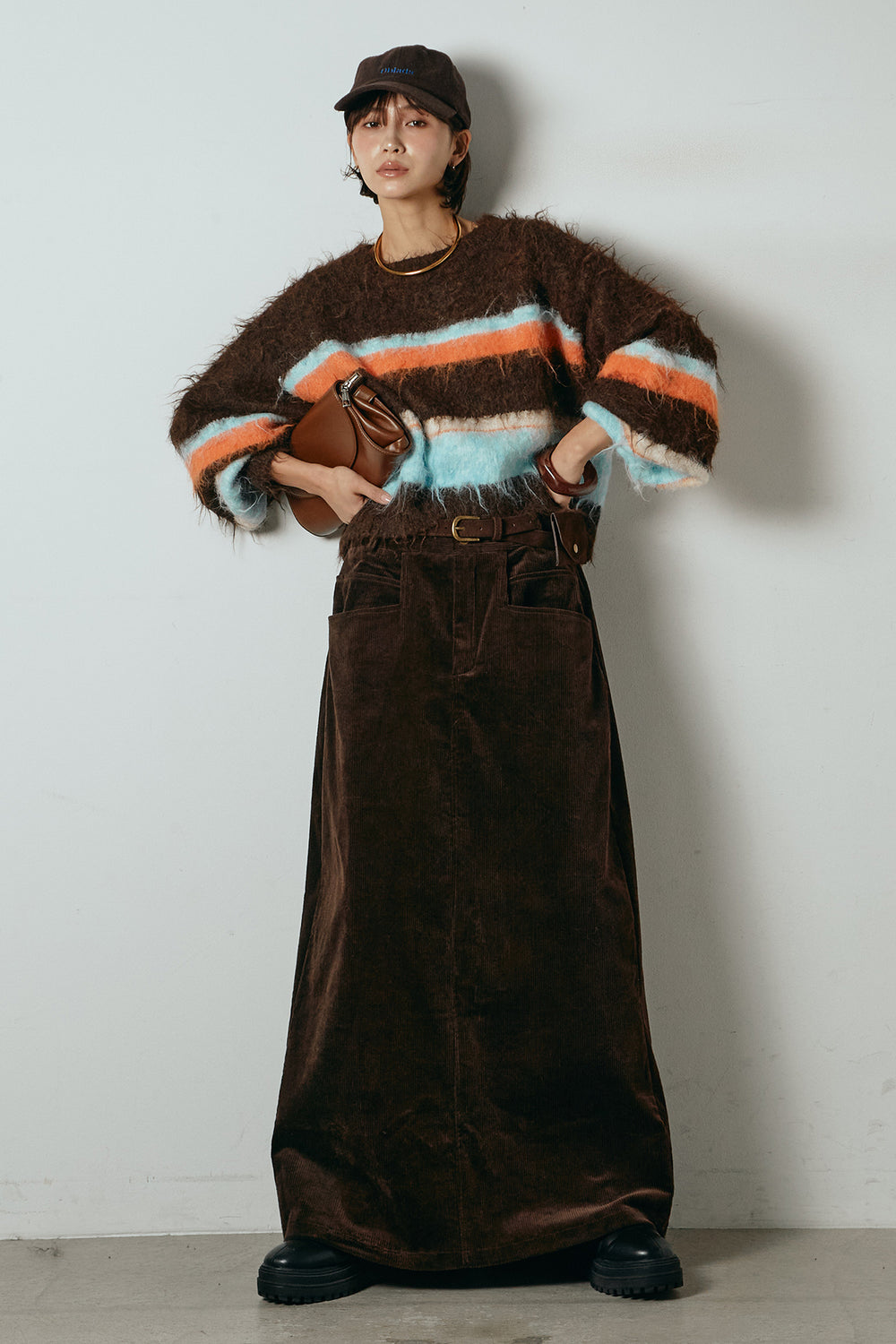 [SET]起毛配色マルチボーダーニットトップス+ポーチベルト付きコーデュロイワイドスカート(2set)