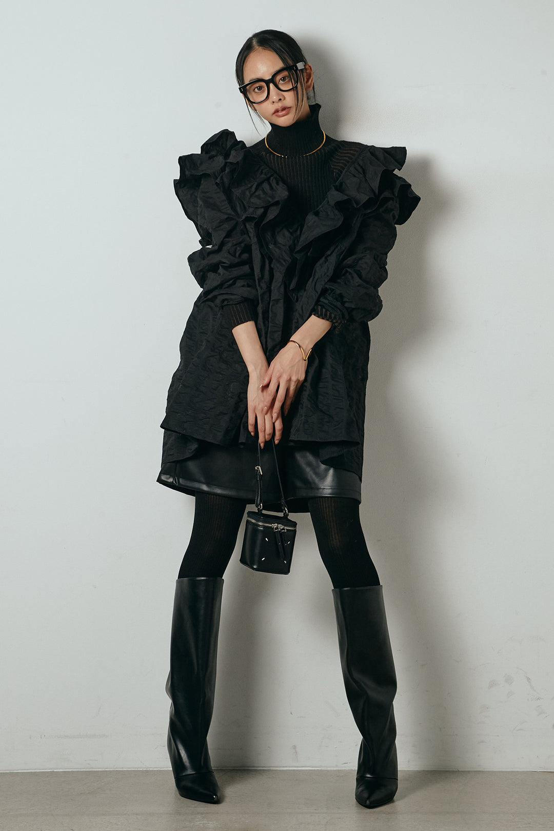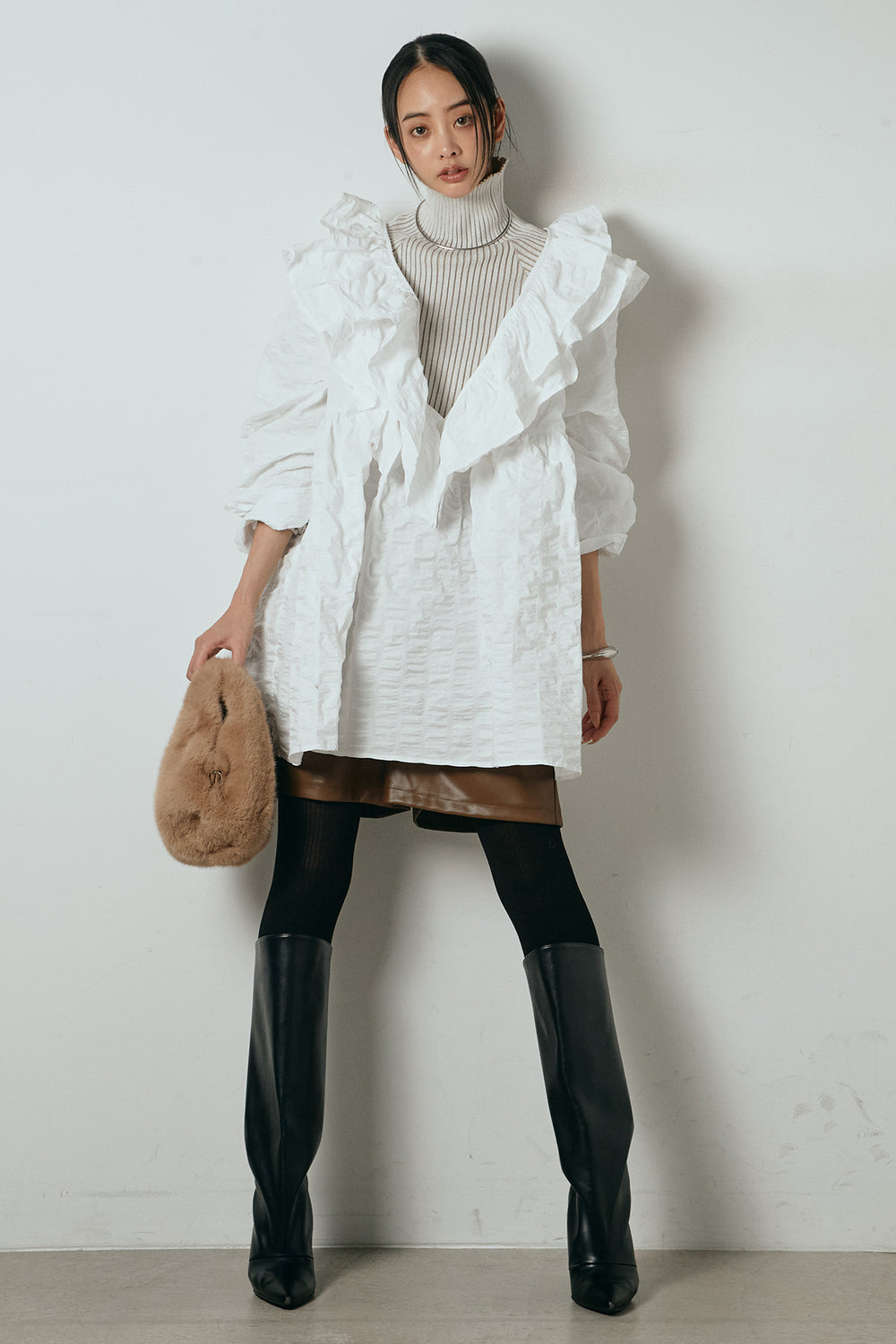 [SET]Vネックフリルカラーブラウス+リブニットシームレスタートルプルオーバー+ストレッチエコレザーバミューダパンツ(3set)