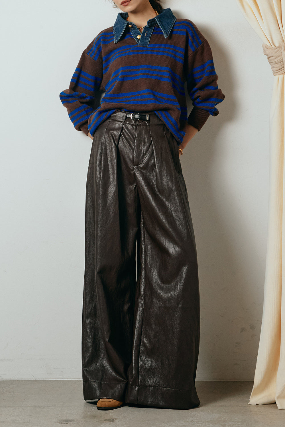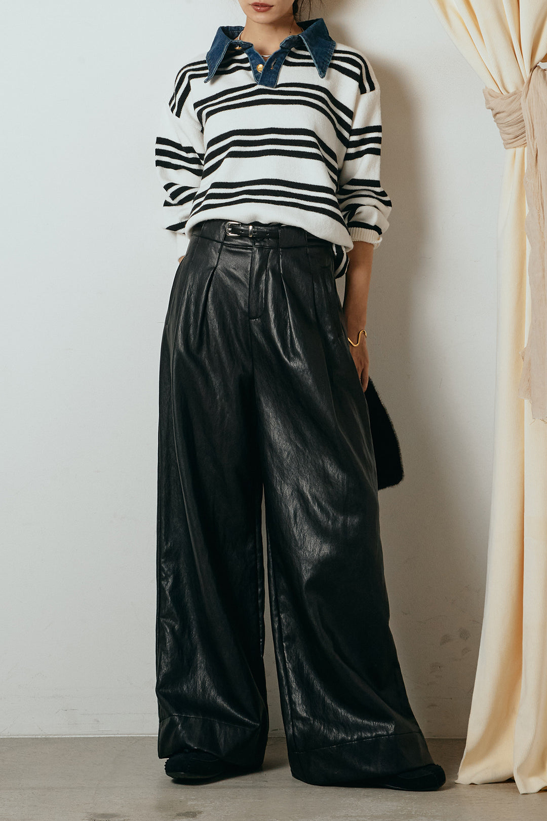[SET]デニムレイヤード風ランダムボーダーニットプルオーバー+ベルト付きレザーライクタックパンツ(2set)